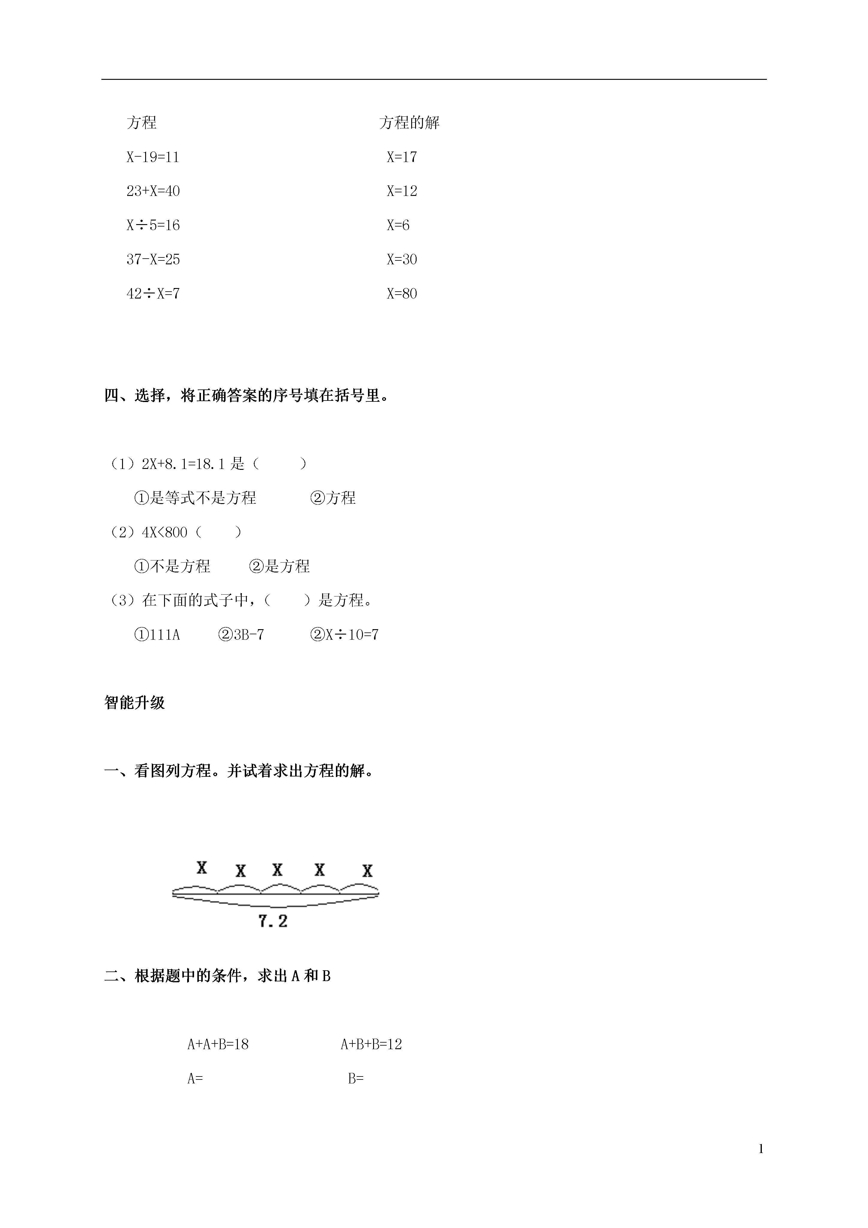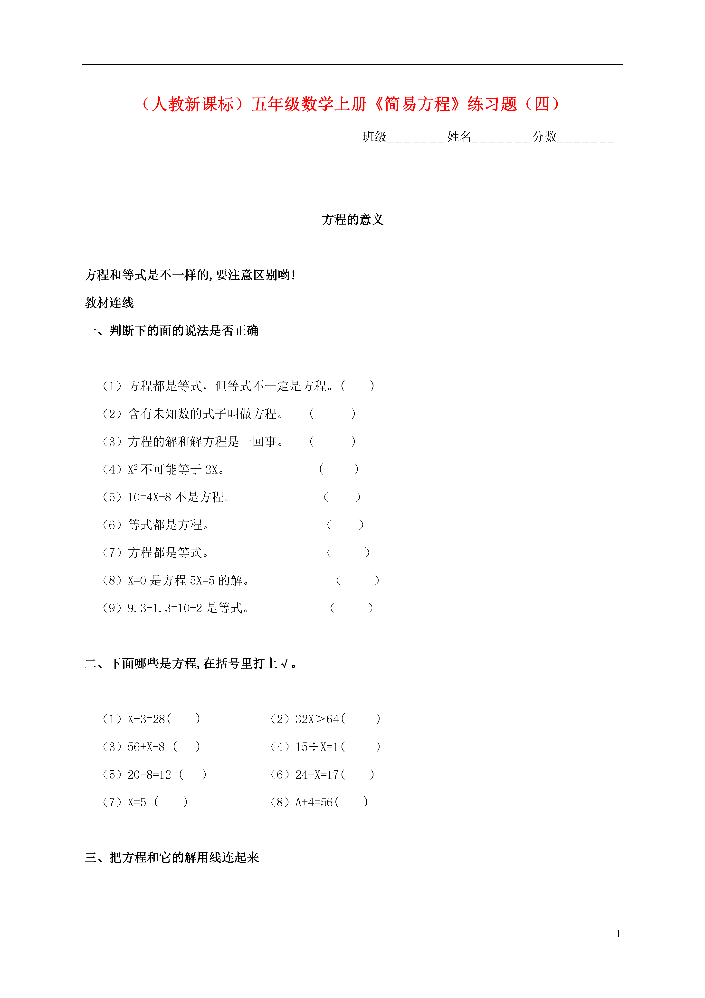 1(人教新课标)五年级数学上册《简易方程》练习题(四)班级_______姓名_______分数_______方程的意义方程和等式是不一样的,要注意区别哟!教材连线一、判断下的面的说法是否正确(1)方程都是等式,但等式不一定是方程。()(2)含有未知数的式子叫做方程。()(3)方程的解和解方程是一回事。()(4)X2不可能等于2X。()(5)10=4X-8不是方程。()(6)等式都是方程。()(7)方程都是等式。()(8)X=0是方程5X=5的解。()(9)9.3-1.3=10-2是等式。()二、下面哪些是方程,在括号里打上√。(1)X+3=28()(2)32X>64()(3)56+X-8()(4)15÷X=1()(5)20-8=12()(6)24-X=17()(7)X=5()(8)A+4=56()三、把方程和它的解用线连起来方程方程的解X-19=11X=1723+X=40X=12X÷5=16X=637-X=25X=3042÷X=7X=80四、选择,将正确答案的序号填在括号里。(1)2X+8.1=18.1是()①是等式不是方程②方程(2)4X<800()①不是方程②是方程(3)在下面的式子中,()是方程。①111A②3B-7②X÷10=7智能升级一、看图列方程。并试着求出方程的解。二、根据题中的条件,求出A和BA+A+B=18A+B+B=12A=B=