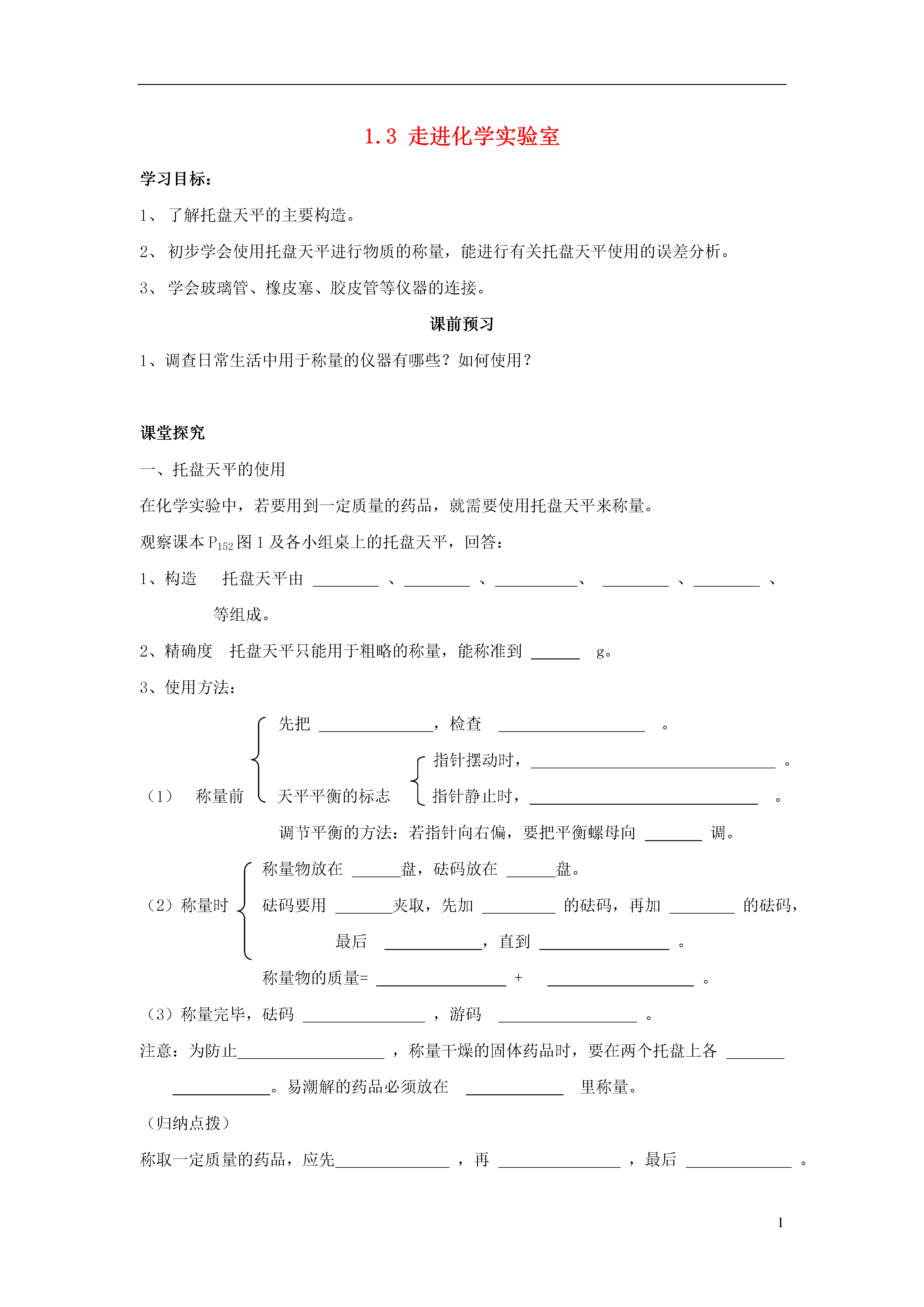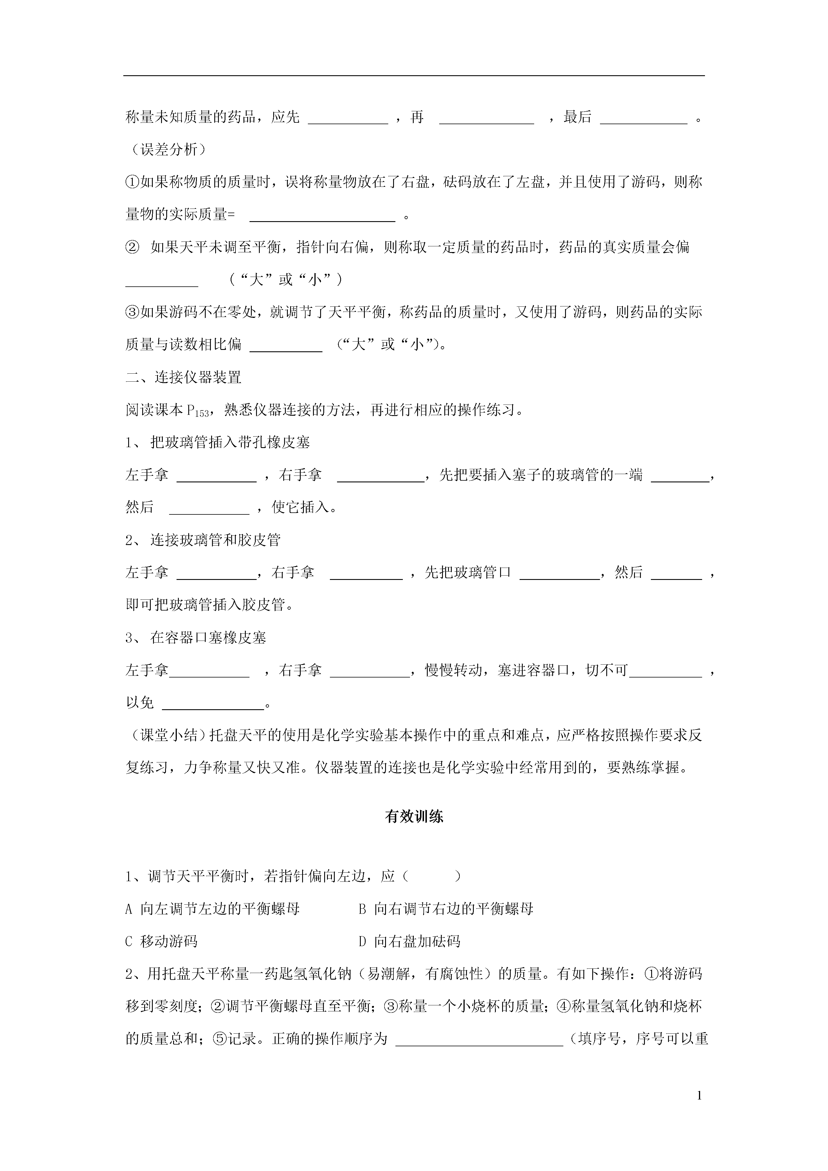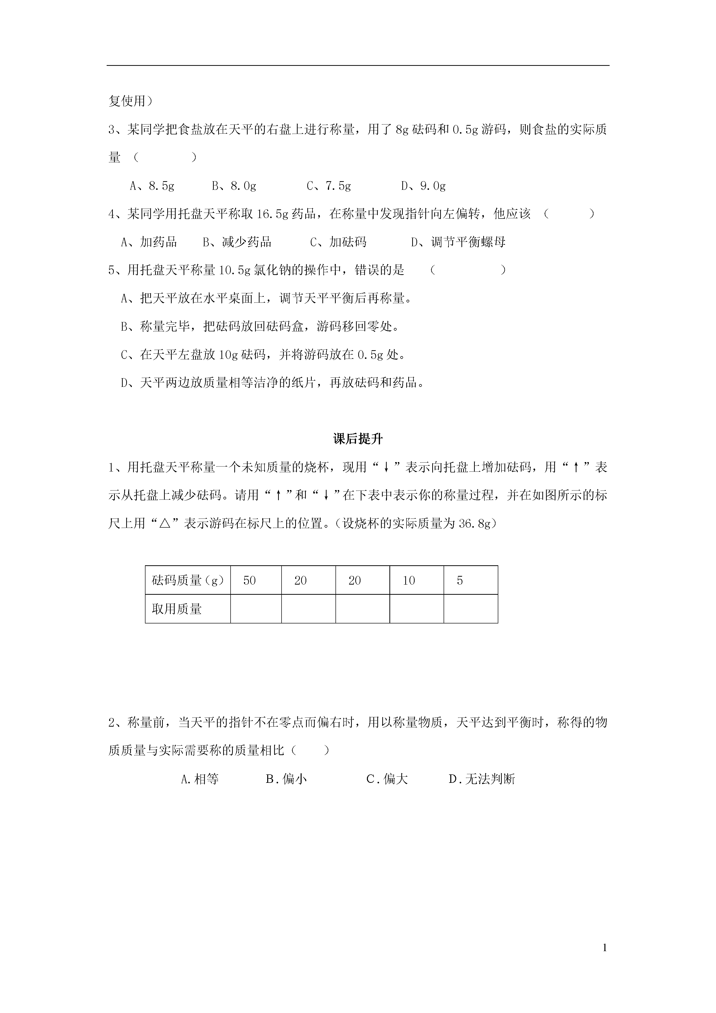 11.3走进化学实验室学习目标:了解托盘天平的主要构造。初步学会使用托盘天平进行物质的称量,能进行有关托盘天平使用的误差分析。学会玻璃管、橡皮塞、胶皮管等仪器的连接。课前预习1、调查日常生活中用于称量的仪器有哪些?如何使用?课堂探究托盘天平的使用在化学实验中,若要用到一定质量的药品,就需要使用托盘天平来称量。观察课本P152图1及各小组桌上的托盘天平,回答:1、构造托盘天平由、、、、、等组成。2、精确度托盘天平只能用于粗略的称量,能称准到g。3、使用方法:先把,检查。指针摆动时,。称量前天平平衡的标志指针静止时,。调节平衡的方法:若指针向右偏,要把平衡螺母向调。称量物放在盘,砝码放在盘。(2)称量时砝码要用夹取,先加的砝码,再加的砝码,最后,直到。称量物的质量=+。(3)称量完毕,砝码,游码。注意:为防止,称量干燥的固体药品时,要在两个托盘上各。易潮解的药品必须放在里称量。(归纳点拨)称取一定质量的药品,应先,再,最后。称量未知质量的药品,应先,再,最后。(误差分析)①如果称物质的质量时,误将称量物放在了右盘,砝码放在了左盘,并且使用了游码,则称量物的实际质量=。如果天平未调至平衡,指针向右偏,则称取一定质量的药品时,药品的真实质量会偏(“大”或“小”)③如果游码不在零处,就调节了天平平衡,称药品的质量时,又使用了游码,则药品的实际质量与读数相比偏(“大”或“小”)。二、连接仪器装置阅读课本P153,熟悉仪器连接的方法,再进行相应的操作练习。把玻璃管插入带孔橡皮塞左手拿,右手拿,先把要插入塞子的玻璃管的一端,然后,使它插入。连接玻璃管和胶皮管左手拿,右手拿,先把玻璃管口,然后,即可把玻璃管插入胶皮管。在容器口塞橡皮塞左手拿,右手拿,慢慢转动,塞进容器口,切不可,以免。(课堂小结)托盘天平的使用是化学实验基本操作中的重点和难点,应严格按照操作要求反复练习,力争称量又快又准。仪器装置的连接也是化学实验中经常用到的,要熟练掌握。有效训练1、调节天平平衡时,若指针偏向左边,应()A向左调节左边的平衡螺母B向右调节右边的平衡螺母C移动游码D向右盘加砝码2、用托盘天平称量一药匙氢氧化钠(易潮解,有腐蚀性)的质量。有如下操作:①将游码移到零刻度;②调节平衡螺母直至平衡;③称量一个小烧杯的质量;④称量氢氧化钠和烧杯的质量总和;⑤记录。正确的操作顺序为(填序号,序号可以重复使用)3、某同学把食盐放在天平的右盘上进行称量,用了8g砝码和0.5g游码,则食盐的实际质量()A、8.5gB、8.0gC、7.5gD、9.0g4、某同学用托盘天平称取16.5g药品,在称量中发现指针向左偏转,他应该()A、加药品B、减少药品C、加砝码D、调节平衡螺母5、用托盘天平称量10.5g氯化钠的操作中,错误的是()A、把天平放在水平桌面上,调节天平平衡后再称量。B、称量完毕,把砝码放回砝码盒,游码移回零处。C、在天平左盘放10g砝码,并将游码放在0.5g处。D、天平两边放质量相等洁净的纸片,再放砝码和药品。课后提升1、用托盘天平称量一个未知质量的烧杯,现用“↓”表示向托盘上增加砝码,用“↑”表示从托盘上减少砝码。请用“↑”和“↓”在下表中表示你的称量过程,并在如图所示的标尺上用“△”表示游码在标尺上的位置。(设烧杯的实际质量为36.8g)砝码质量(g)502020105取用质量2、称量前,当天平的指针不在零点而偏右时,用以称量物质,天平达到平衡时,称得的物质质量与实际需要称的质量相比()A.相等B.偏小C.偏大D.无法判断
