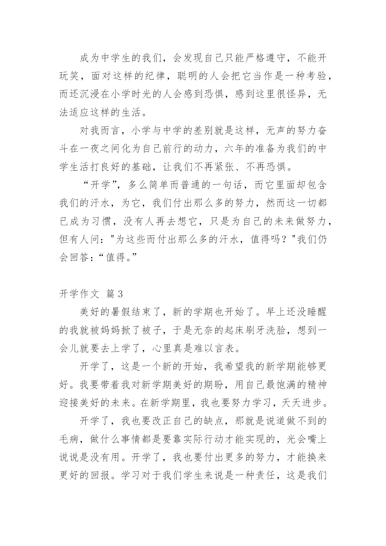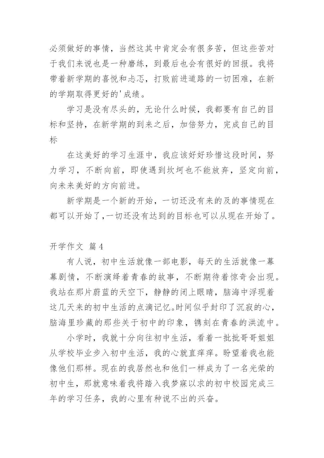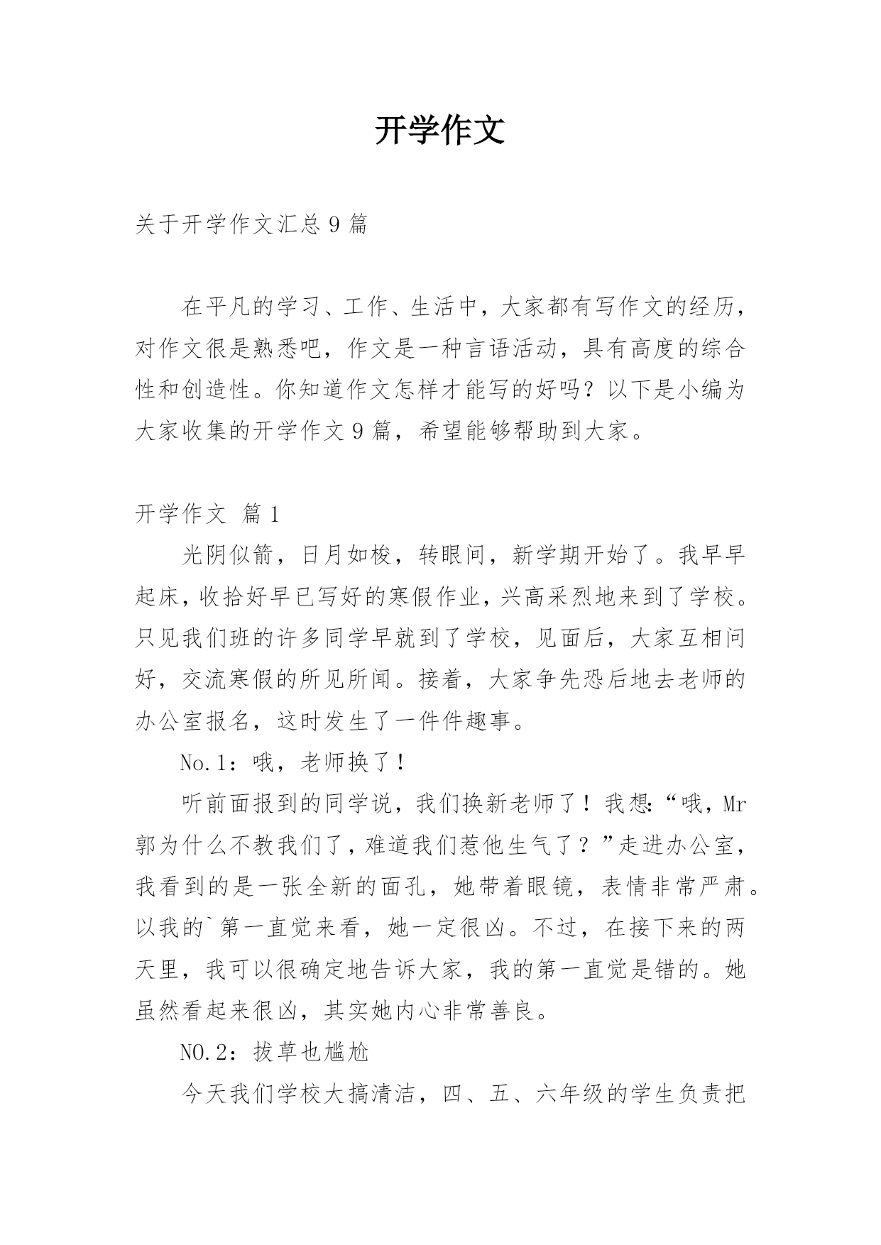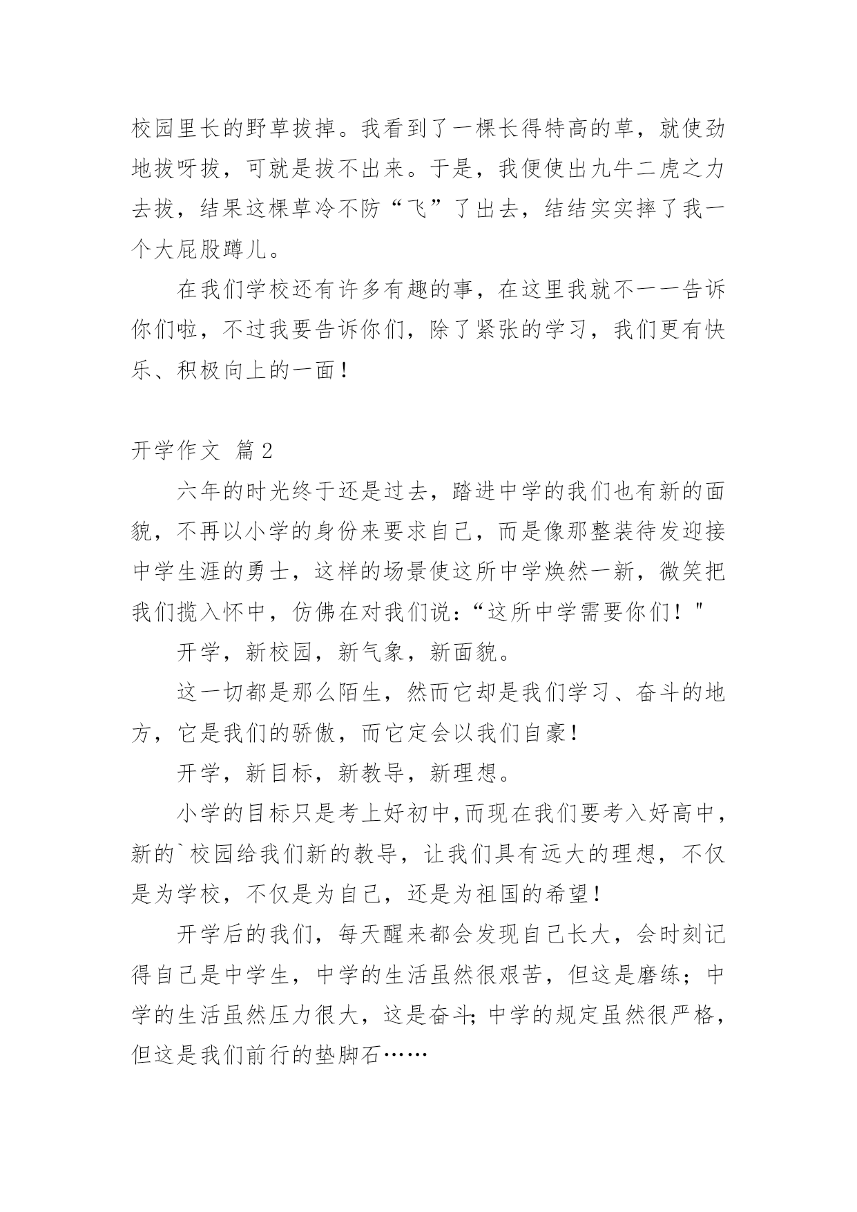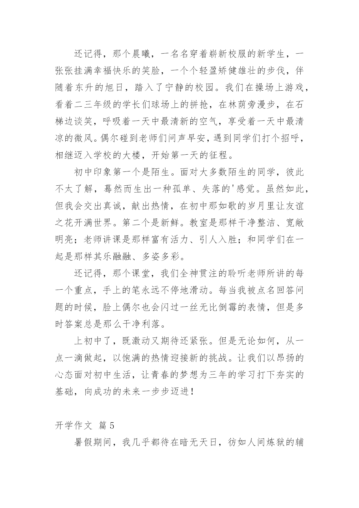 开学作文 关于开学作文汇总9篇在平凡的学习、工作、生活中,大家都有写作文的经历,对作文很是熟悉吧,作文是一种言语活动,具有高度的综合性和创造性。你知道作文怎样才能写的好吗?以下是小编为大家收集的开学作文9篇,希望能够帮助到大家。开学作文篇1光阴似箭,日月如梭,转眼间,新学期开始了。我早早起床,收拾好早已写好的寒假作业,兴高采烈地来到了学校。只见我们班的许多同学早就到了学校,见面后,大家互相问好,交流寒假的所见所闻。接着,大家争先恐后地去老师的办公室报名,这时发生了一件件趣事。No.1:哦,老师换了!听前面报到的同学说,我们换新老师了!我想:“哦,Mr郭为什么不教我们了,难道我们惹他生气了?”走进办公室,我看到的是一张全新的面孔,她带着眼镜,表情非常严肃。以我的`第一直觉来看,她一定很凶。不过,在接下来的两天里,我可以很确定地告诉大家,我的第一直觉是错的。她虽然看起来很凶,其实她内心非常善良。NO.2:拔草也尴尬今天我们学校大搞清洁,四、五、六年级的学生负责把校园里长的野草拔掉。我看到了一棵长得特高的草,就使劲地拔呀拔,可就是拔不出来。于是,我便使出九牛二虎之力去拔,结果这棵草冷不防“飞”了出去,结结实实摔了我一个大屁股蹲儿。在我们学校还有许多有趣的事,在这里我就不一一告诉你们啦,不过我要告诉你们,除了紧张的学习,我们更有快乐、积极向上的一面!开学作文篇2六年的时光终于还是过去,踏进中学的我们也有新的面貌,不再以小学的身份来要求自己,而是像那整装待发迎接中学生涯的勇士,这样的场景使这所中学焕然一新,微笑把我们揽入怀中,仿佛在对我们说:“这所中学需要你们!"开学,新校园,新气象,新面貌。这一切都是那么陌生,然而它却是我们学习、奋斗的地方,它是我们的骄傲,而它定会以我们自豪!开学,新目标,新教导,新理想。小学的目标只是考上好初中,而现在我们要考入好高中,新的`校园给我们新的教导,让我们具有远大的理想,不仅是为学校,不仅是为自己,还是为祖国的希望!开学后的我们,每天醒来都会发现自己长大,会时刻记得自己是中学生,中学的生活虽然很艰苦,但这是磨练;中学的生活虽然压力很大,这是奋斗;中学的规定虽然很严格,但这是我们前行的垫脚石……成为中学生的我们,会发现自己只能严格遵守,不能开玩笑,面对这样的纪律,聪明的人会把它当作是一种考验,而还沉浸在小学时光的人会感到恐惧,感到这里很怪异,无法适应这样的生活。对我而言,小学与中学的差别就是这样,无声的努力奋斗在一夜之间化为自己前行的动力,六年的准备为我们的中学生活打良好的基础,让我们不再紧张、不再恐惧。“开学”,多么简单而普通的一句话,而它里面却包含我们的汗水,为它,我们付出那么多的努力,然而这一切都已成为习惯,没有人再去想它,只是为自己的未来做努力,但有人问:"为这些而付出那么多的汗水,值得吗?"我们仍会回答:“值得。”开学作文篇3美好的暑假结束了,新的学期也开始了。早上还没睡醒的我就被妈妈掀了被子,于是无奈的起床刷牙洗脸,想到一会儿就要去上学了,心里真是难以言表。开学了,这是一个新的开始,我希望我的新学期能够更好。我要带着我对新学期美好的期盼,用自己最饱满的精神迎接美好的未来。在新学期里,我也要努力学习,天天进步。开学了,我也要改正自己的缺点,那就是说道做不到的毛病,做什么事情都是要靠实际行动才能实现的,光会嘴上说说是没有用。开学了,我也要付出更多的努力,才能换来更好的回报。学习对于我们学生来说是一种责任,这是我们必须做好的事情,当然这其中肯定会有很多苦,但这些苦对于我们来说也是一种磨练,到最后也会有很好的回报。我将带着新学期的喜悦和忐忑,打败前进道路的一切困难,在新的学期取得更好的'成绩。学习是没有尽头的,无论什么时候,我都要有自己的目标和坚持,在新学期的到来之后,加倍努力,完成自己的目标在这美好的学习生涯中,我应该好好珍惜这段时间,努力学习,不断向前,即使遇到坎坷也不能放弃,坚定向前,向未来美好的方向前进。新学期是一个新的开始,一切还没有来的及的事情现在都可以开始了,一切还没有达到的目标也可以从现在开始了。开学作文篇4有人说,初中生活就像一部电影,每天的生活就像一幕幕剧情,不断演绎着青春的故事,不断期待着惊奇会出现。我站在那片蔚蓝的天空下,静静的闭上眼睛,脑海中浮现着这几天来的初中生活的点滴记忆。时间似乎封印了沉寂的心,脑海里珍藏的那些关于初中的印象,镌刻在青春的洪流中。小学时,我就十分向往初中生活,看着一批批哥哥姐姐从学校毕业步入初中生活,我的心就直痒痒。盼望着我也能像他们那样。现在的我居然也和他们一样成为了一名光荣的初中生,那就意味着我将踏入我梦寐以求的初中校园完成三年的学习任务,我的心里有种说不出的兴奋。还记得,那个晨曦,一名名穿着崭新校服的新学生,一张张挂满幸福快乐的笑脸,一个个轻盈矫