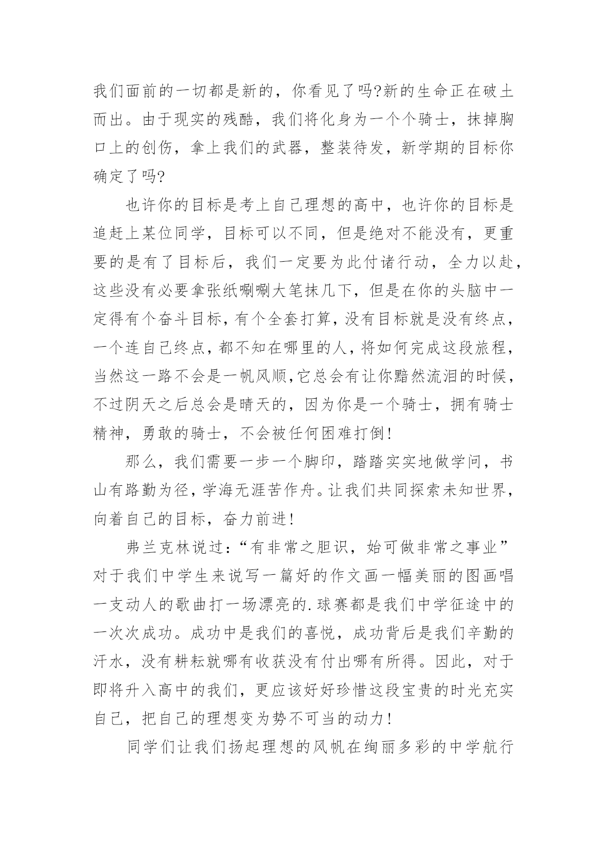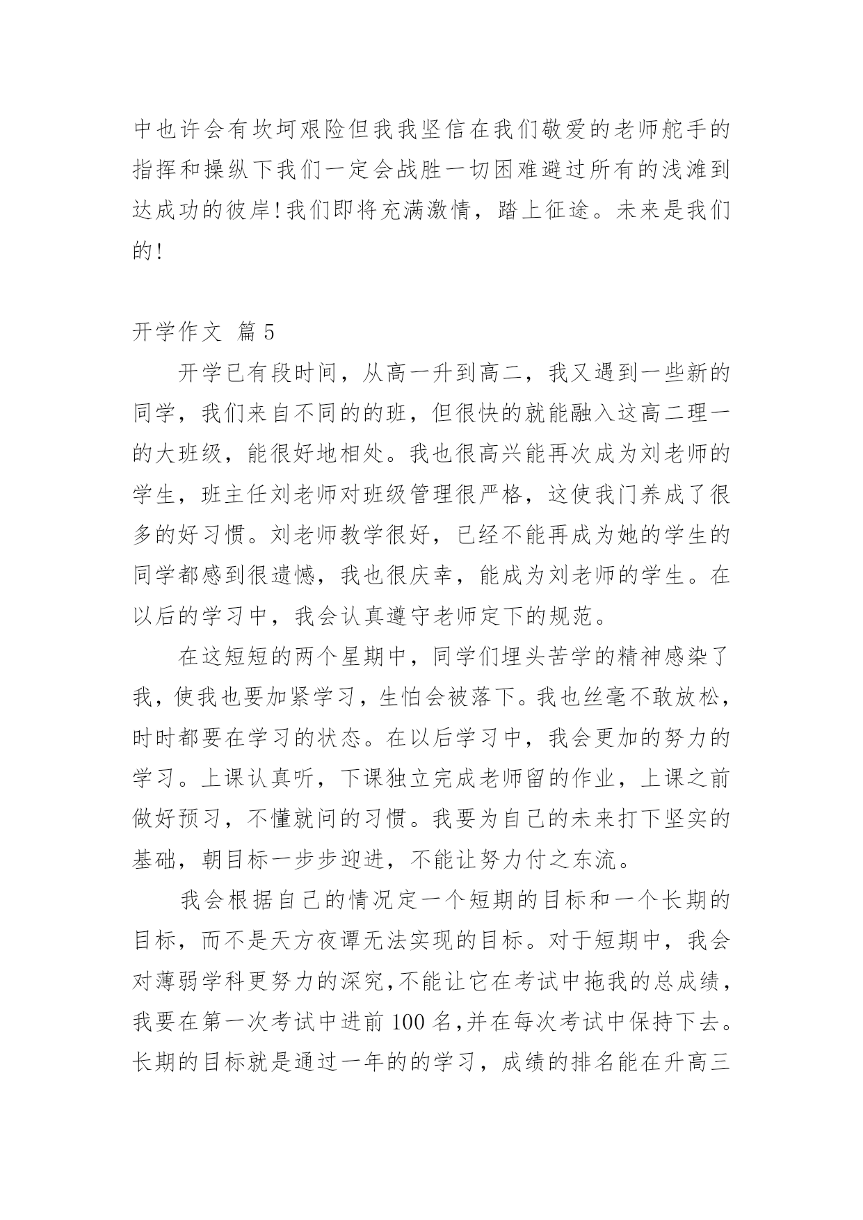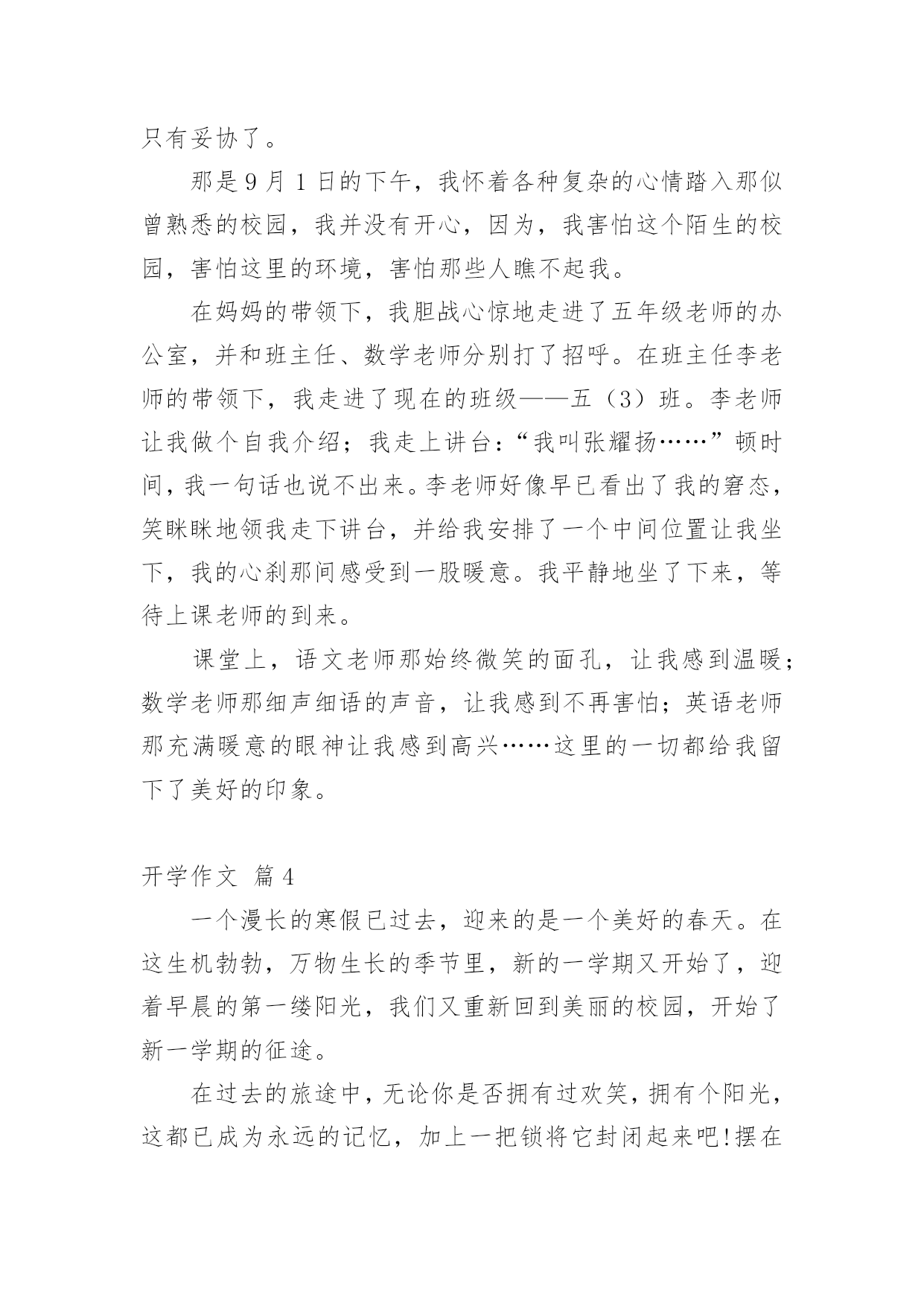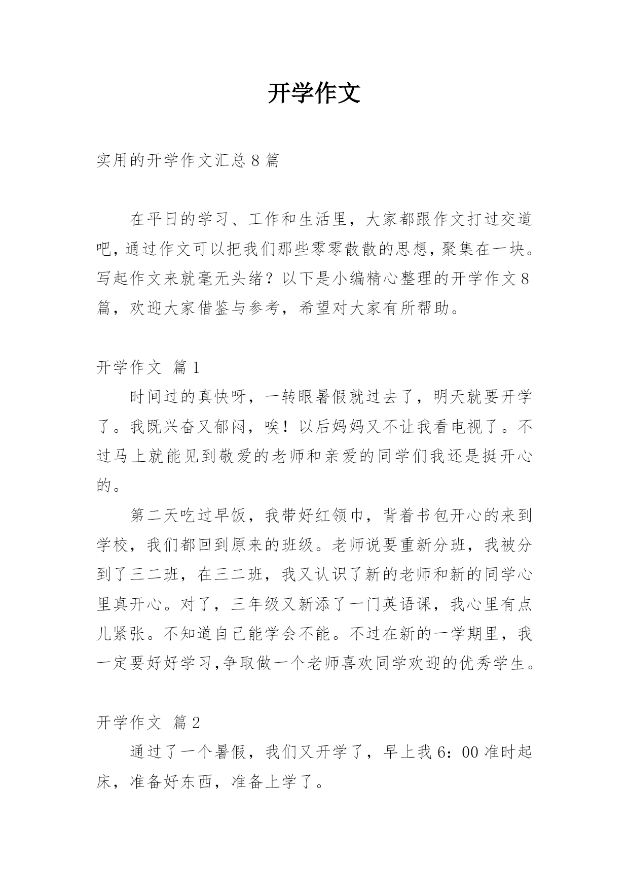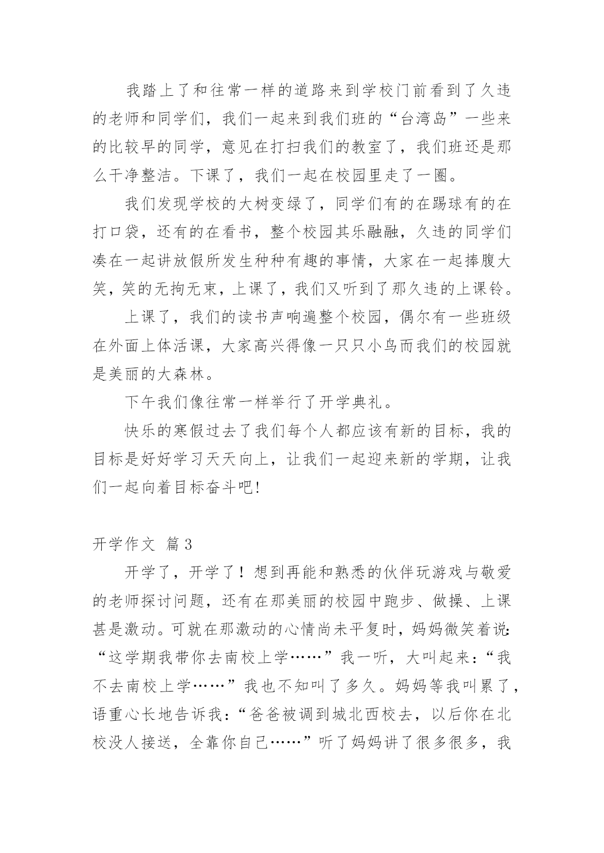 开学作文 实用的开学作文汇总8篇在平日的学习、工作和生活里,大家都跟作文打过交道吧,通过作文可以把我们那些零零散散的思想,聚集在一块。写起作文来就毫无头绪?以下是小编精心整理的开学作文8篇,欢迎大家借鉴与参考,希望对大家有所帮助。开学作文篇1时间过的真快呀,一转眼暑假就过去了,明天就要开学了。我既兴奋又郁闷,唉!以后妈妈又不让我看电视了。不过马上就能见到敬爱的老师和亲爱的同学们我还是挺开心的。第二天吃过早饭,我带好红领巾,背着书包开心的来到学校,我们都回到原来的班级。老师说要重新分班,我被分到了三二班,在三二班,我又认识了新的老师和新的同学心里真开心。对了,三年级又新添了一门英语课,我心里有点儿紧张。不知道自己能学会不能。不过在新的一学期里,我一定要好好学习,争取做一个老师喜欢同学欢迎的优秀学生。开学作文篇2通过了一个暑假,我们又开学了,早上我6:00准时起床,准备好东西,准备上学了。我踏上了和往常一样的道路来到学校门前看到了久违的老师和同学们,我们一起来到我们班的“台湾岛”一些来的比较早的同学,意见在打扫我们的教室了,我们班还是那么干净整洁。下课了,我们一起在校园里走了一圈。我们发现学校的大树变绿了,同学们有的在踢球有的在打口袋,还有的在看书,整个校园其乐融融,久违的同学们凑在一起讲放假所发生种种有趣的事情,大家在一起捧腹大笑,笑的无拘无束,上课了,我们又听到了那久违的上课铃。上课了,我们的读书声响遍整个校园,偶尔有一些班级在外面上体活课,大家高兴得像一只只小鸟而我们的校园就是美丽的大森林。下午我们像往常一样举行了开学典礼。快乐的寒假过去了我们每个人都应该有新的目标,我的目标是好好学习天天向上,让我们一起迎来新的学期,让我们一起向着目标奋斗吧!开学作文篇3开学了,开学了!想到再能和熟悉的伙伴玩游戏与敬爱的老师探讨问题,还有在那美丽的校园中跑步、做操、上课甚是激动。可就在那激动的心情尚未平复时,妈妈微笑着说:“这学期我带你去南校上学……”我一听,大叫起来:“我不去南校上学……”我也不知叫了多久。妈妈等我叫累了,语重心长地告诉我:“爸爸被调到城北西校去,以后你在北校没人接送,全靠你自己……”听了妈妈讲了很多很多,我只有妥协了。那是9月1日的下午,我怀着各种复杂的心情踏入那似曾熟悉的校园,我并没有开心,因为,我害怕这个陌生的校园,害怕这里的环境,害怕那些人瞧不起我。在妈妈的带领下,我胆战心惊地走进了五年级老师的办公室,并和班主任、数学老师分别打了招呼。在班主任李老师的带领下,我走进了现在的班级——五(3)班。李老师让我做个自我介绍;我走上讲台:“我叫张耀扬……”顿时间,我一句话也说不出来。李老师好像早已看出了我的窘态,笑眯眯地领我走下讲台,并给我安排了一个中间位置让我坐下,我的心刹那间感受到一股暖意。我平静地坐了下来,等待上课老师的到来。课堂上,语文老师那始终微笑的面孔,让我感到温暖;数学老师那细声细语的声音,让我感到不再害怕;英语老师那充满暖意的眼神让我感到高兴……这里的一切都给我留下了美好的印象。开学作文篇4一个漫长的寒假已过去,迎来的是一个美好的春天。在这生机勃勃,万物生长的季节里,新的一学期又开始了,迎着早晨的第一缕阳光,我们又重新回到美丽的校园,开始了新一学期的征途。在过去的旅途中,无论你是否拥有过欢笑,拥有个阳光,这都已成为永远的记忆,加上一把锁将它封闭起来吧!摆在我们面前的一切都是新的,你看见了吗?新的生命正在破土而出。由于现实的残酷,我们将化身为一个个骑士,抹掉胸口上的创伤,拿上我们的武器,整装待发,新学期的目标你确定了吗?也许你的目标是考上自己理想的高中,也许你的目标是追赶上某位同学,目标可以不同,但是绝对不能没有,更重要的是有了目标后,我们一定要为此付诸行动,全力以赴,这些没有必要拿张纸唰唰大笔抹几下,但是在你的头脑中一定得有个奋斗目标,有个全套打算,没有目标就是没有终点,一个连自己终点,都不知在哪里的人,将如何完成这段旅程,当然这一路不会是一帆风顺,它总会有让你黯然流泪的时候,不过阴天之后总会是晴天的,因为你是一个骑士,拥有骑士精神,勇敢的骑士,不会被任何困难打倒!那么,我们需要一步一个脚印,踏踏实实地做学问,书山有路勤为径,学海无涯苦作舟。让我们共同探索未知世界,向着自己的目标,奋力前进!弗兰克林说过:“有非常之胆识,始可做非常之事业”对于我们中学生来说写一篇好的作文画一幅美丽的图画唱一支动人的歌曲打一场漂亮的.球赛都是我们中学征途中的一次次成功。成功中是我们的喜悦,成功背后是我们辛勤的汗水,没有耕耘就哪有收获没有付出哪有所得。因此,对于即将升入高中的我们,更应该好好珍惜这段宝贵的时光充实自己,把自己的理想变为势不可当的动力!同学们让我们扬起理想的风帆在绚丽多彩的中学航行中也许会有坎坷艰险但我我坚信在我们