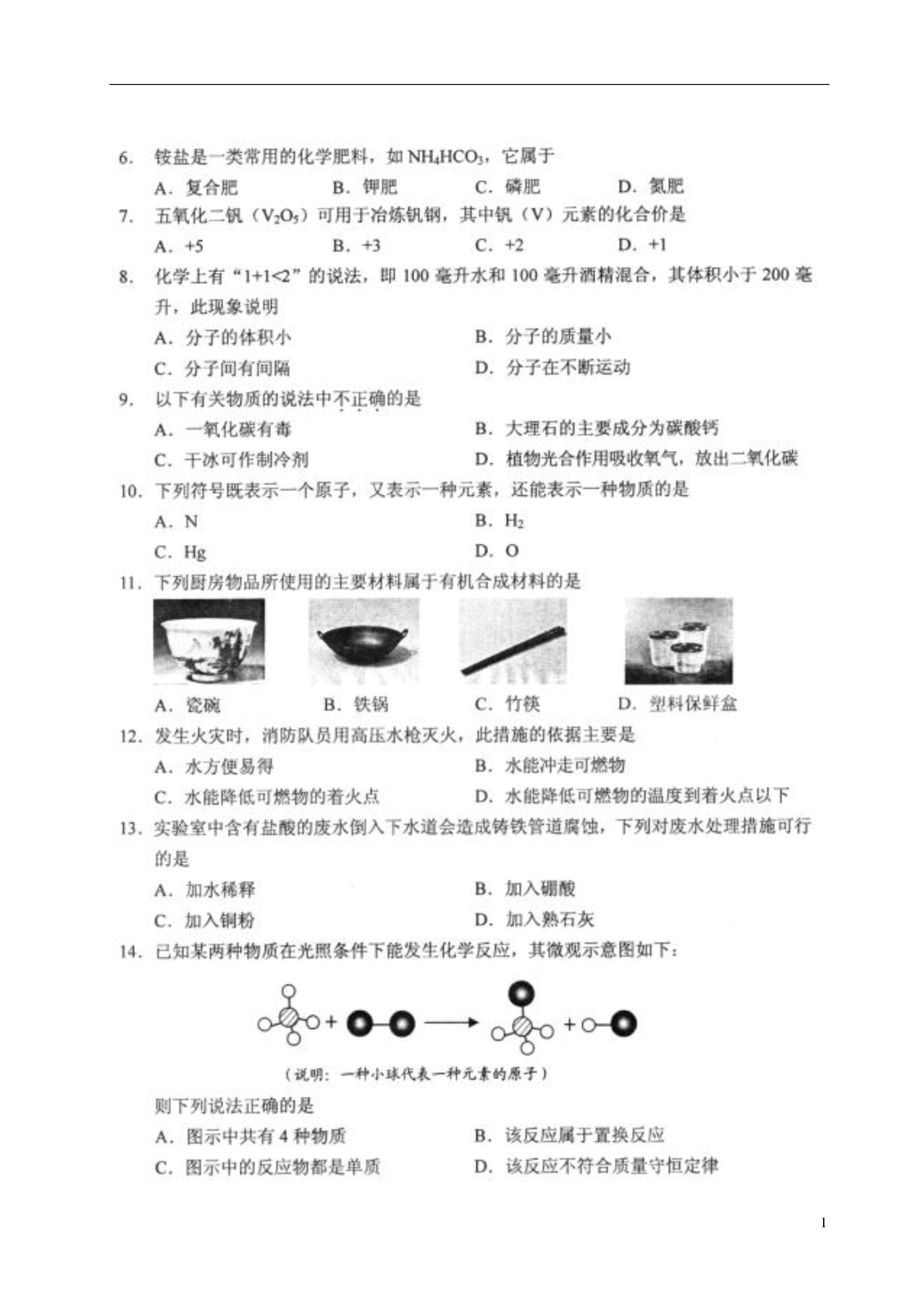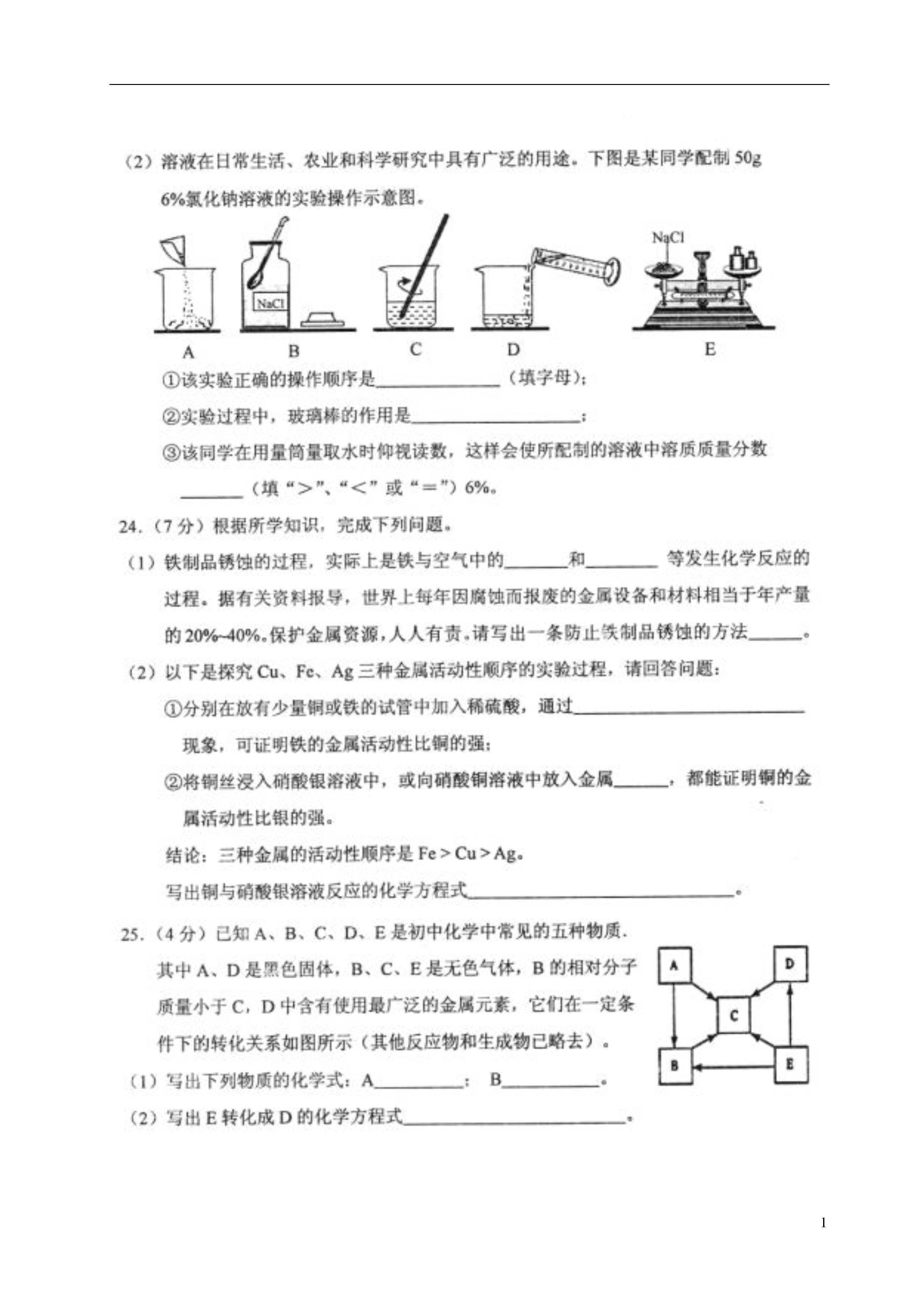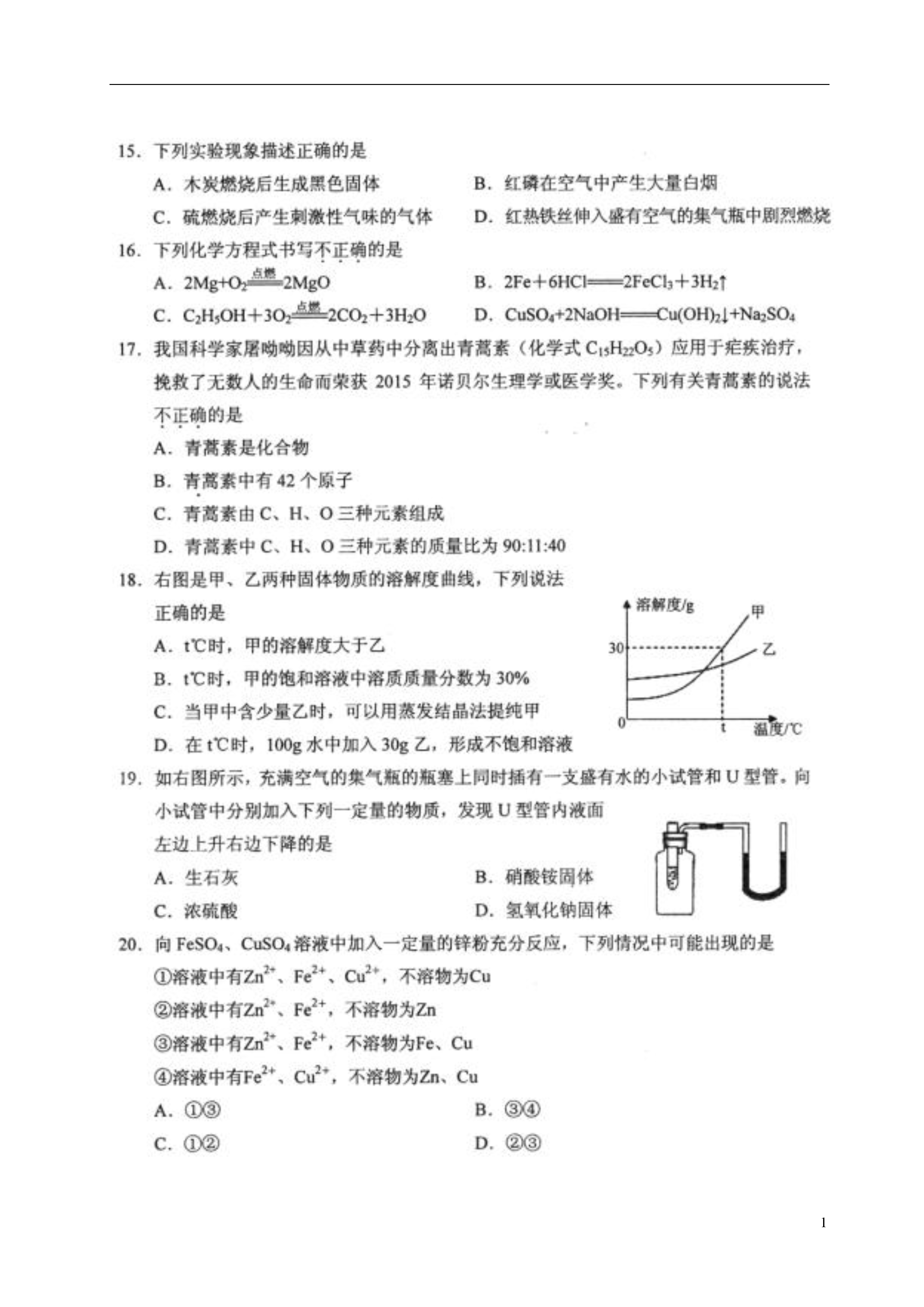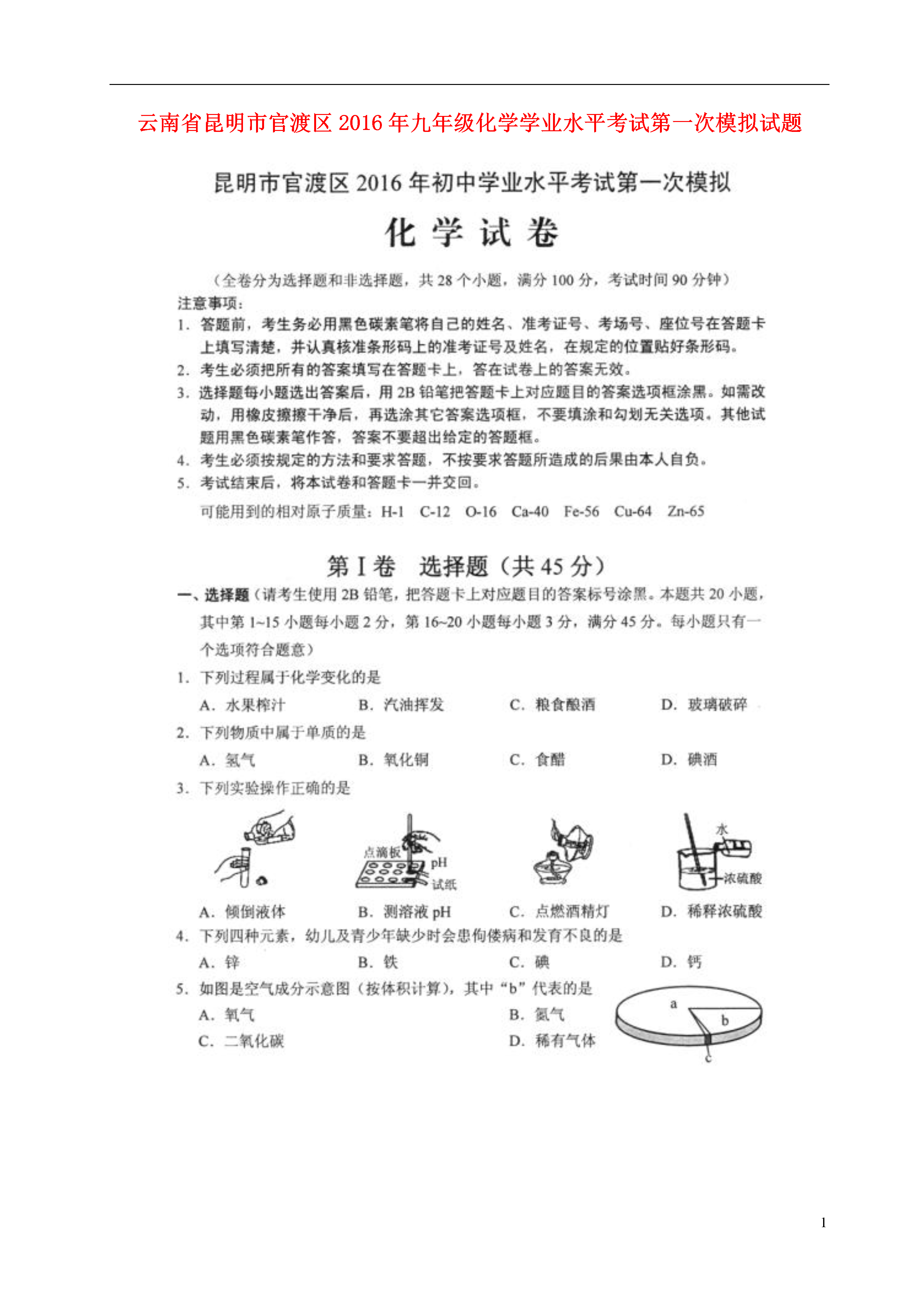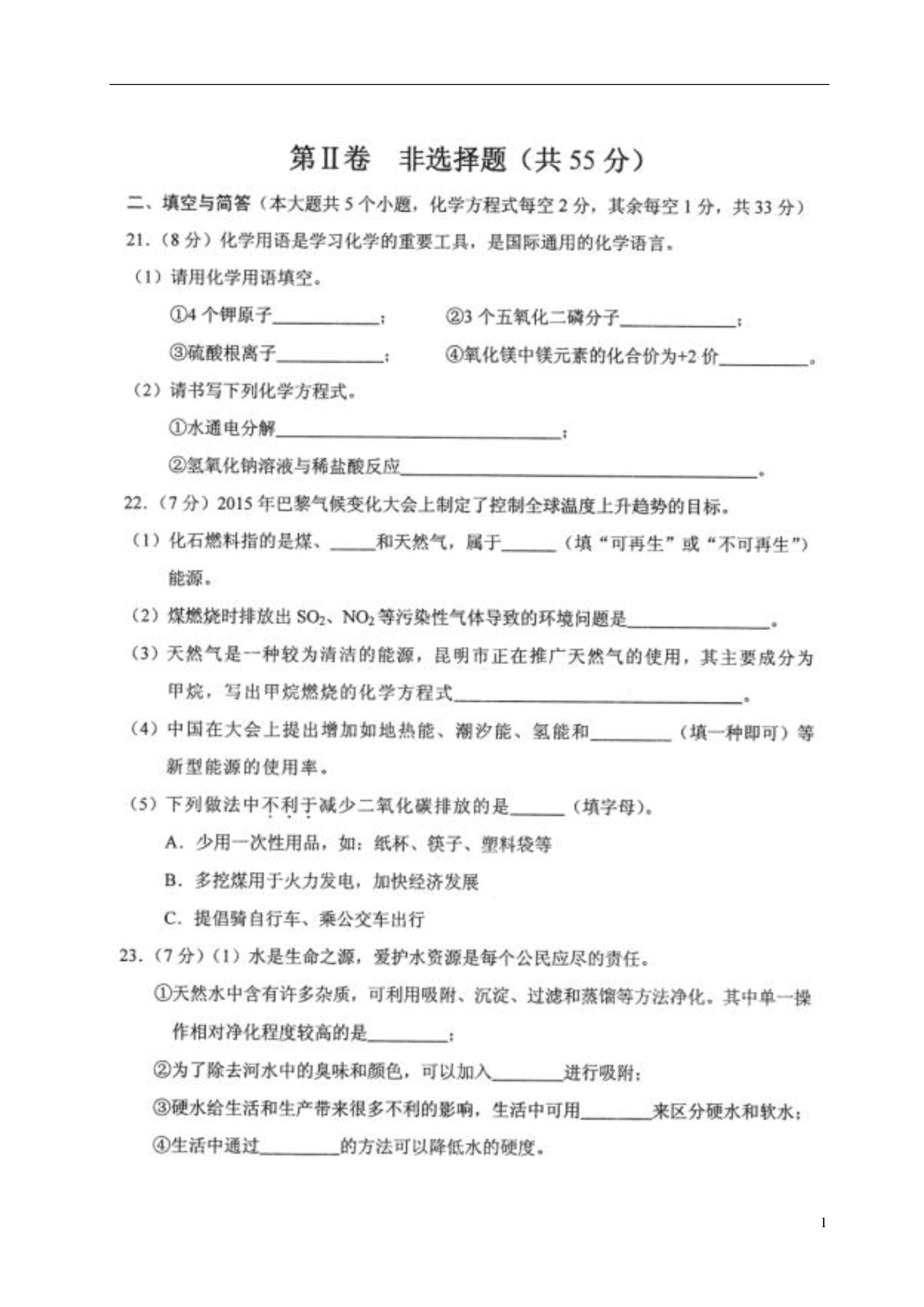 1云南省昆明市官渡区2016年九年级化学学业水平考试第一次模拟试题昆明市官渡区2016年初中学业水平考试第一次模拟化学参考答案第Ⅰ卷选择题(共45分)一、选择题(请考生使用2B铅笔,把答题卡上对应题目的答案标号涂黑。本题共20小题,其中第1~15小题每小题2分,第16~20小题每小题3分,满分45分。每小题只有一个选项符合题意)题号12345678910答案CABDADACDC题号11121314151617181920答案DDDACBBABA第Ⅱ卷非选择题(共55分)二、填空与简答(本大题共5个小题,化学方程式每空2分,其余每空1分,共33分)21.(8分)(1)①4K②3P2O5③SO42-④O(2)①2H2O通电2H2↑+O2↑②NaOH+HClNaCl+H2O22.(7分)(1)石油不可再生(2)酸雨(合理答案均可)(3)CH4+2O2CO2+2H2O(4)太阳能(合理答案均可)(5)B23.(7分)(1)①蒸馏②活性炭③肥皂水④煮沸(2)①BEADC②搅拌,加速溶解③+1228<24.(7分)(1)氧气水或水蒸气(填化学式也可)涂油漆(合理答案均可)(2)①是否产生气泡(合理答案均可)②银(填化学式也可)Cu+2AgNO3===2Ag+Cu(NO3)225.(4分)(1)CCO(2)3Fe+2O2Fe3O4三、实验与探究(本大题共2个小题,化学方程式每空2分,其余每空1分,共16分)26.(10分)(1)集气瓶(2)2KMnO4K2MnO4+MnO2+O2↑吸收SO2气体,防止污染空气(3)BCaCO3+2HCl==CaCl2+H2O+CO2↑a(4)红碳酸不稳定易分解27.(6分)NaOH、Na2CO3Ca(OH)2+Na2CO3==2NaOH+CaCO3↓有白色沉淀产生否产生气泡四、分析与计算(本大题共1个小题,共6分)28.解:125t石灰石中碳酸钙的质量为:125t×80%=100t……………………………………………(1分)设可得到生石灰的质量为x………………………………(1分)CaCO3CaO+CO2↑10056100tx……………………………………………(1分)100:56=100t:x………………………………………………(1分)解得x=56t…………………………………………………(1分)答:可得到生石灰的质量为56t。………………………(1分)