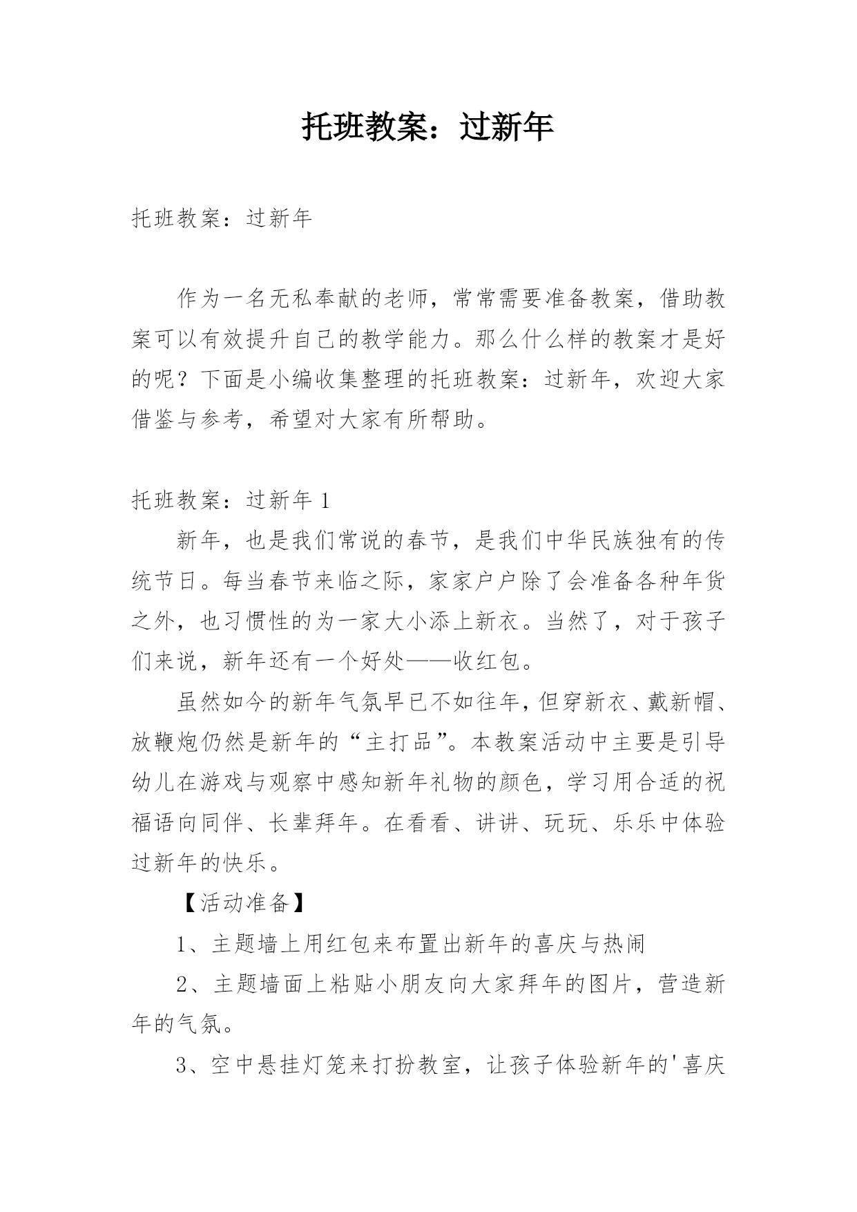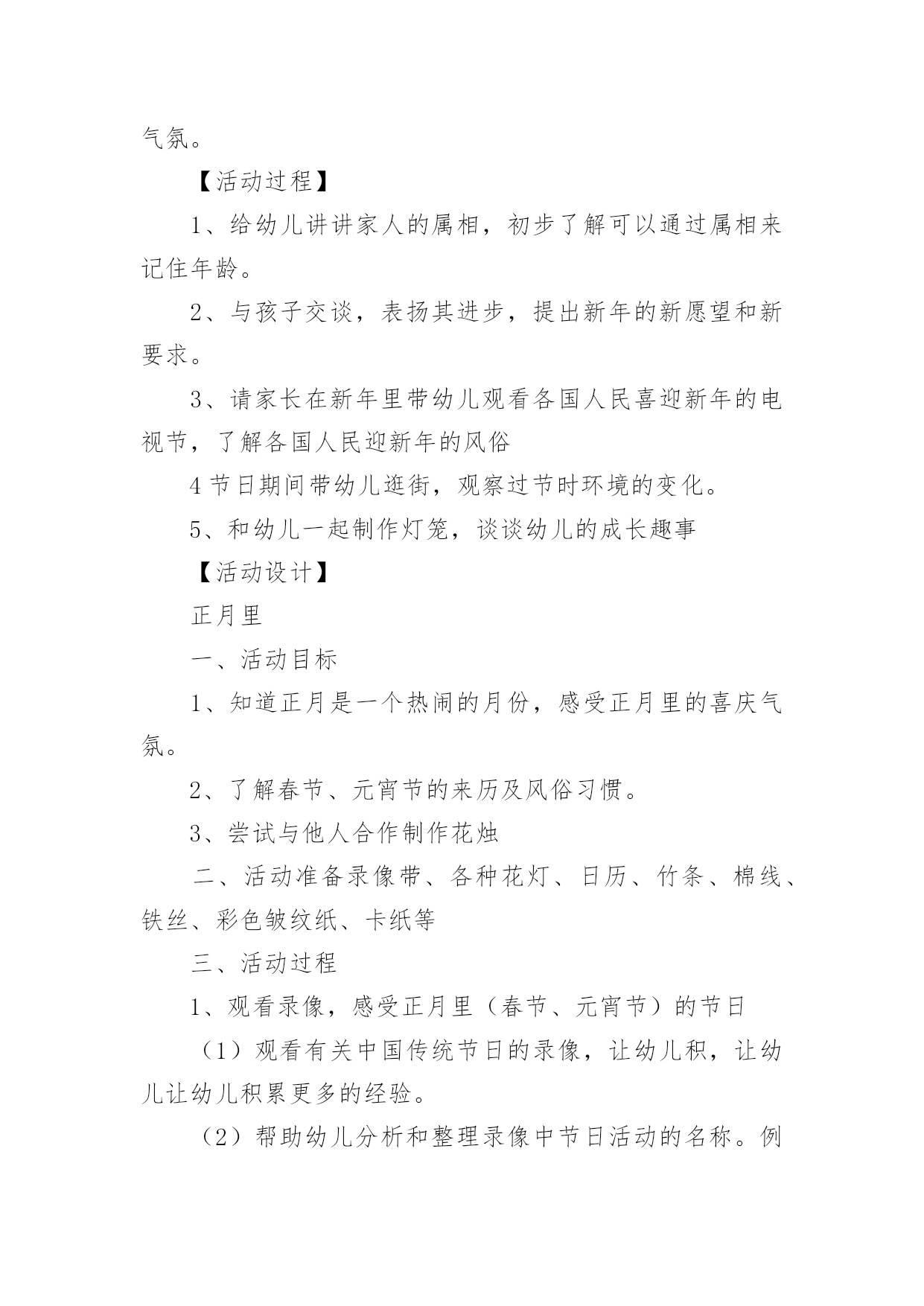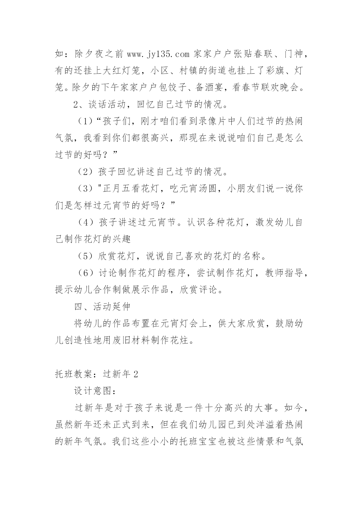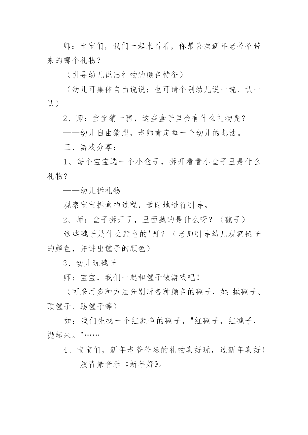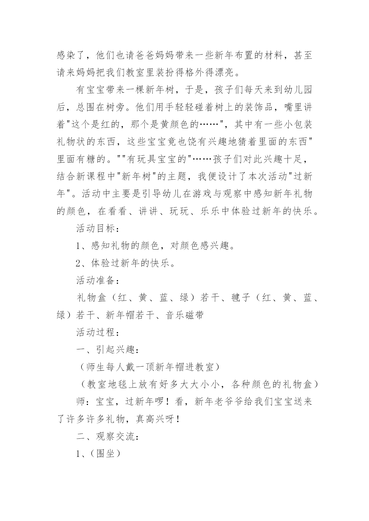 托班教案:过新年 托班教案:过新年作为一名无私奉献的老师,常常需要准备教案,借助教案可以有效提升自己的教学能力。那么什么样的教案才是好的呢?下面是小编收集整理的托班教案:过新年,欢迎大家借鉴与参考,希望对大家有所帮助。托班教案:过新年1新年,也是我们常说的春节,是我们中华民族独有的传统节日。每当春节来临之际,家家户户除了会准备各种年货之外,也习惯性的为一家大小添上新衣。当然了,对于孩子们来说,新年还有一个好处——收红包。虽然如今的新年气氛早已不如往年,但穿新衣、戴新帽、放鞭炮仍然是新年的“主打品”。本教案活动中主要是引导幼儿在游戏与观察中感知新年礼物的颜色,学习用合适的祝福语向同伴、长辈拜年。在看看、讲讲、玩玩、乐乐中体验过新年的快乐。【活动准备】1、主题墙上用红包来布置出新年的喜庆与热闹2、主题墙面上粘贴小朋友向大家拜年的图片,营造新年的气氛。3、空中悬挂灯笼来打扮教室,让孩子体验新年的'喜庆气氛。【活动过程】1、给幼儿讲讲家人的属相,初步了解可以通过属相来记住年龄。2、与孩子交谈,表扬其进步,提出新年的新愿望和新要求。3、请家长在新年里带幼儿观看各国人民喜迎新年的电视节,了解各国人民迎新年的风俗4节日期间带幼儿逛街,观察过节时环境的变化。5、和幼儿一起制作灯笼,谈谈幼儿的成长趣事【活动设计】正月里一、活动目标1、知道正月是一个热闹的月份,感受正月里的喜庆气氛。2、了解春节、元宵节的来历及风俗习惯。3、尝试与他人合作制作花烛二、活动准备录像带、各种花灯、日历、竹条、棉线、铁丝、彩色皱纹纸、卡纸等三、活动过程1、观看录像,感受正月里(春节、元宵节)的节日(1)观看有关中国传统节日的录像,让幼儿积,让幼儿让幼儿积累更多的经验。(2)帮助幼儿分析和整理录像中节日活动的名称。例如:除夕夜之前www.jy135.com家家户户张贴春联、门神,有的还挂上大红灯笼,小区、村镇的街道也挂上了彩旗、灯笼。除夕的下午家家户户包饺子、备酒宴,看春节联欢晚会。2、谈话活动,回忆自己过节的情况。(1)“孩子们,刚才咱们看到录像片中人们过节的热闹气氛,我看到你们都很高兴,那现在来说说咱们自己是怎么过节的好吗?”(2)孩子回忆讲述自己过节的情况。(3)"正月五看花灯,吃元宵汤圆,小朋友们说一说你们是怎样过元宵节的好吗?”(4)孩子讲述过元宵节。认识各种花灯,激发幼儿自己制作花灯的兴趣(5)欣赏花灯,说说自己喜欢的花灯的名称。(6)讨论制作花灯的程序,尝试制作花灯,教师指导,提示幼儿合作制做展示作品,欣赏评论。四、活动延伸将幼儿的作品布置在元宵灯会上,供大家欣赏,鼓励幼儿创造性地用废旧材料制作花炷。托班教案:过新年2设计意图:过新年是对于孩子来说是一件十分高兴的大事。如今,虽然新年还未正式到来,但在我们幼儿园已到处洋溢着热闹的新年气氛。我们这些小小的托班宝宝也被这些情景和气氛感染了,他们也请爸爸妈妈带来一些新年布置的材料,甚至请来妈妈把我们教室里装扮得格外得漂亮。有宝宝带来一棵新年树,于是,孩子们每天来到幼儿园后,总围在树旁。他们用手轻轻碰着树上的装饰品,嘴里讲着"这个是红的,那个是黄颜色的……",其中有一些小包装礼物状的东西,这些宝宝竟也饶有兴趣地猜着里面的东西"里面有糖的。""有玩具宝宝的"……孩子们对此兴趣十足,结合新课程中"新年树"的主题,我便设计了本次活动"过新年"。活动中主要是引导幼儿在游戏与观察中感知新年礼物的颜色,在看看、讲讲、玩玩、乐乐中体验过新年的快乐。活动目标:1、感知礼物的颜色,对颜色感兴趣。2、体验过新年的快乐。活动准备:礼物盒(红、黄、蓝、绿)若干、毽子(红、黄、蓝、绿)若干、新年帽若干、音乐磁带活动过程:一、引起兴趣:(师生每人戴一顶新年帽进教室)(教室地毯上放有好多大大小小,各种颜色的礼物盒)师:宝宝,过新年啰!看,新年老爷爷给我们宝宝送来了许多许多礼物,真高兴呀!二、观察交流:1、(围坐)师:宝宝们,我们一起来看看,你最喜欢新年老爷爷带来的哪个礼物?(引导幼儿说出礼物的颜色特征)(幼儿可集体自由说说:也可请个别幼儿说一说、认一认)2、师:宝宝猜一猜,这些盒子里会有什么礼物呢?——幼儿自由猜想,老师肯定每一个幼儿的想法。三、游戏分享:1、每个宝宝选一个小盒子,拆开看看小盒子里是什么礼物?——幼儿拆礼物观察宝宝拆盒的过程,适时地进行引导。2、师:盒子拆开了,里面藏的是什么呀?(毽子)这些毽子是什么颜色的'呀?(老师引导幼儿观察毽子的颜色,并讲出毽子的颜色)3、幼儿玩毽子师:宝宝,我们一起和毽子做游戏吧!(可采用多种方法分别玩各种颜色的毽子,如:抛毽子、顶毽子、踢毽子等)如:我们先找一个红颜色的毽子,"红毽子,红毽子,抛起来。"……4、宝宝们,新年老爷爷送的礼物真好玩,过新年真好!——放背景音乐《新年好》。托班教案:过新年3设