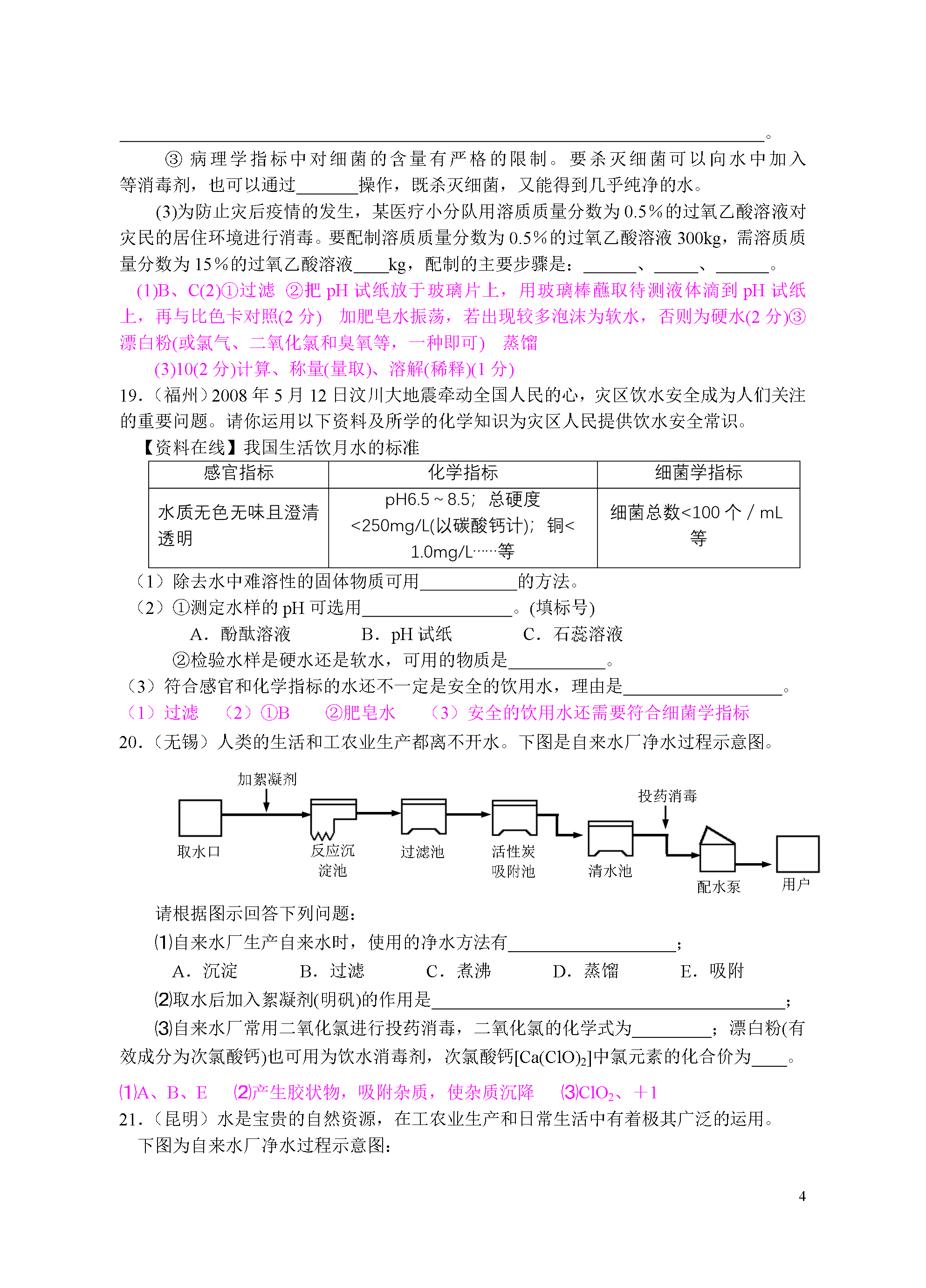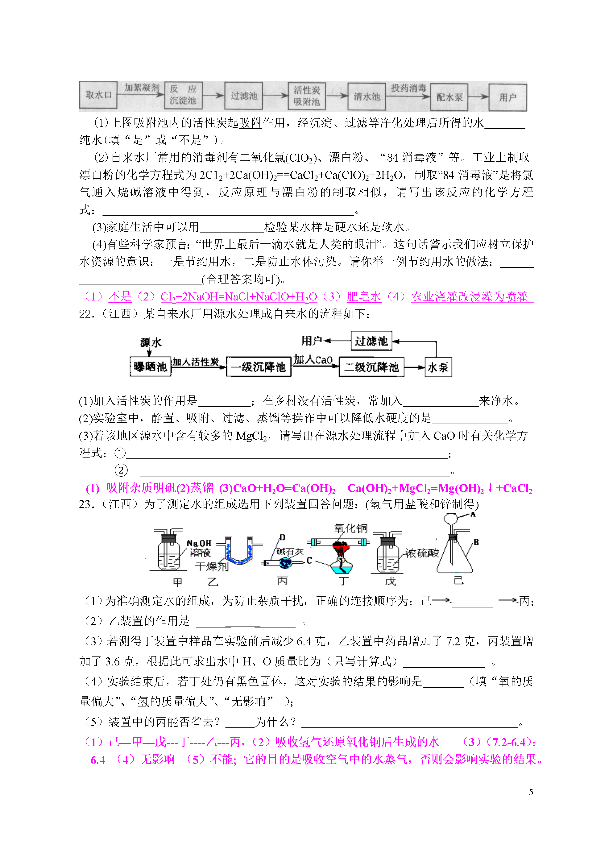 52008年中考试题汇编(自然界里的水)1.(上海)许多物质的名称中含有“水”。“水”通常有三种含义:①表示水这种物质;②表示物质处于液态;③表示水溶液。下列物质名称中的“水”不属于以上三种含义的是A.重水B.氨水C.水银D.水晶2.(广东)当水的温度和压强升高到某临界点以上时,水就处于一种既不同于液态,又不同于固态和气体的新的流体态——超临界态。在超临界态水中,某些有机高分子会很快被氧化为无毒小分子。下列说法不正确的是(B)A.超临界态水氧化技术不形成二次污染B.超临界态水是一种新物质C.超临界态水是一种新型催化剂D.超临界态水可用于解决白色污染问题3.(江西)污水处理的主要方法有:①中和法;②化学沉淀法;③氧化还原法;④过滤法。其中属于化学方法的有AA.①②③B.①②④C.②③④D.①②③④4.(河南)下列实验方案不可行的是DA.用肥皂水区分硬水与软水B.用水区分硝酸铵固体与蔗糖固体C.用pH试纸区分澄清石灰水和食盐水D.用紫色石蕊试液区分稀盐酸与稀硫酸5.(重庆)下列关于水的说法正确的是()A、水的污染会引起土壤污染B、地球上淡水资源非常丰富C、过滤能够除去水中所有杂质D、水由氢气和氧气组成6.(汕头)用右图的简易净水器处理河水,下面对该净水器分析正确的是A.能杀菌消毒B.能把硬水变为软水C.能得到纯净水D.活性炭主要起吸附杂质的作用7.(揭阳)在四川汶川大地震中,很多同胞失去了宝贵的生命。在这些遇难同胞中,有很多人不是被石块压死,而是在废墟里漫长的等待中严重脱水而死,说明了水对于我们生命的延续是如此的重要,下列关于水的说法中不正确的是A.水是氧化物B.水由氢、氧两种元素组成C.水由水分子构成D.水由两个氢原子和一个氧原子构成8.(晋江)水是人类生活中不可缺少的物质。下列关于水的说法或做法中正确的是A.长期饮用蒸馏水对人体健康有益B.工厂将澄清、透明的废水直接排入河中C.用明矾可以将硬水软化D.提倡“一水多用”9.(南通)下列有关水的叙述中,不正确的是A.水汽化时分子间隔发生了变化B.用明矾溶液可以区分硬水和软水C.工业废水处理后可以循环使用D.水是能溶解多种物质的常用溶剂10.(潍坊)航天员专用的小分子团水具有饮用量少、在人体内储留时间长、排放量少等特点。航天员一次饮用125mL小分子团水,可维持人体6h正常需水量。下列关于小分子团水的说法中正确的是()A.水分子的化学性质被改变了B.小分子团水中水分子间没有间隙C.小分子团水中水分子停止了运动D.小分子团水的部分物理性质与普通水有所不同11.(烟台)下列清洗方法中,利用乳化作用的是(A)用自来水洗手(B)用汽油清洗油污(C)用洗涤剂清洗油腻的餐具(D)用盐酸清除铁锈12.(烟台)科学家发现在特殊条件下,水能表现出许多有趣的结构和性质。一定条件下给水施加一个弱电场,常温常压下水结成冰,俗称“热冰”,下图为其模拟图。下列说法正确的是(A)水结成“热冰”的过程中原子个数发生变化(B)上述变化过程中分子问间隔没有发生变化(C)在弱电场下,水分子运动从无序转变为有序(D)利用该性质,人们在常温常压下可建成溜冰场13.(昆明)有关电解水实验(如右图)的下列叙述,错误的是(C)A.试管甲中的气体是氢气B.试管乙中的气体是氧气C.该实验证明水由氢气和氧气组成D该实验证明水由氢元素和氧元素组成14.(黄冈)节约用水和合理开发利用水资源是每个公民应尽的责任和义务,你认为下列做法与之不相符的是A.洗菜、洗衣、淘米的水用来浇花、拖地、冲厕所B.将活性炭放入硬水中使其软化C.合理施用农药、化肥,以减少水体污染D.加强工业废水的排放监控,坚持达标排放15.(南京)2008年“中国水周”活动的宣传主题为“发展水利,改善民生”。(1)①水(填“属于”或“不属于”)六大类营养素之一。②保持水的化学性质的最小粒子是。(2)右图是活性炭净水器示意图,其中活性炭的作用是:不仅可以的物质,还可以的杂质。(3)有一杯主要含有MgCl2和CaC2的硬水。某兴趣小组设计出软化水的部分实验方案,请你一起来完成。可供选用的物质有:Ca(OH)2溶液、NaOH溶液、饱和Na2CO3溶液、肥皂水实验步骤现象结论或化学方程式①取少量水样于试管中,向其中滴加Ca(0H):溶液,直到不再产生沉淀有白色沉淀产生MgCl2+Ca(OH)2=Mg(OH)2↓+CaCl2②继续向上述试管中滴加,直到不再产生沉淀有白色沉淀产生化学方程式:③过滤滤液澄清④证明硬水已软化(1)①属于②水分子(H2O分子)(2)滤去不溶性吸附一些可溶性(本题答案不分先后顺序)(3)②(饱和)Na3CO3溶液CaCl2+Na2CO3=2NaCl+CaCO3↓(只写此化学方程式即给分,再写Ca(OH)2+Na2CO3=2Na0H+CaCO3↓不扣分也不加分)④取上