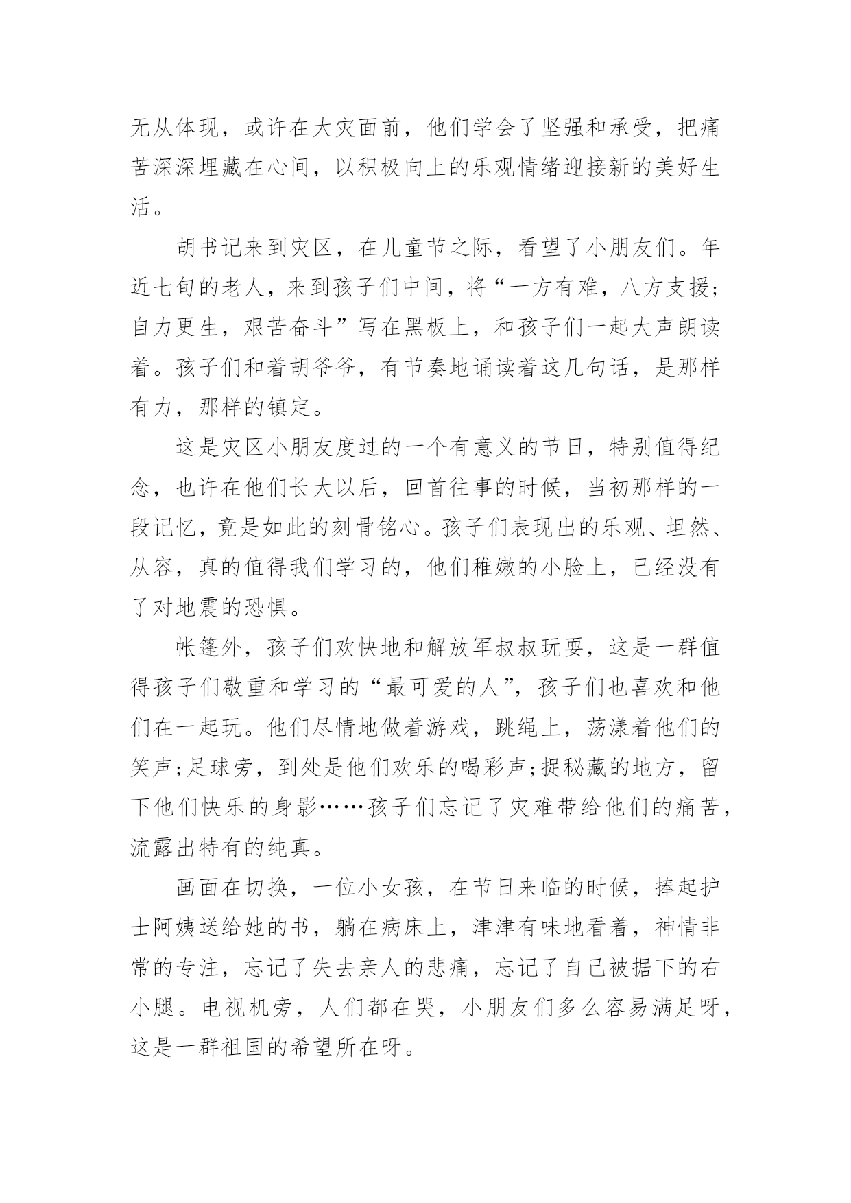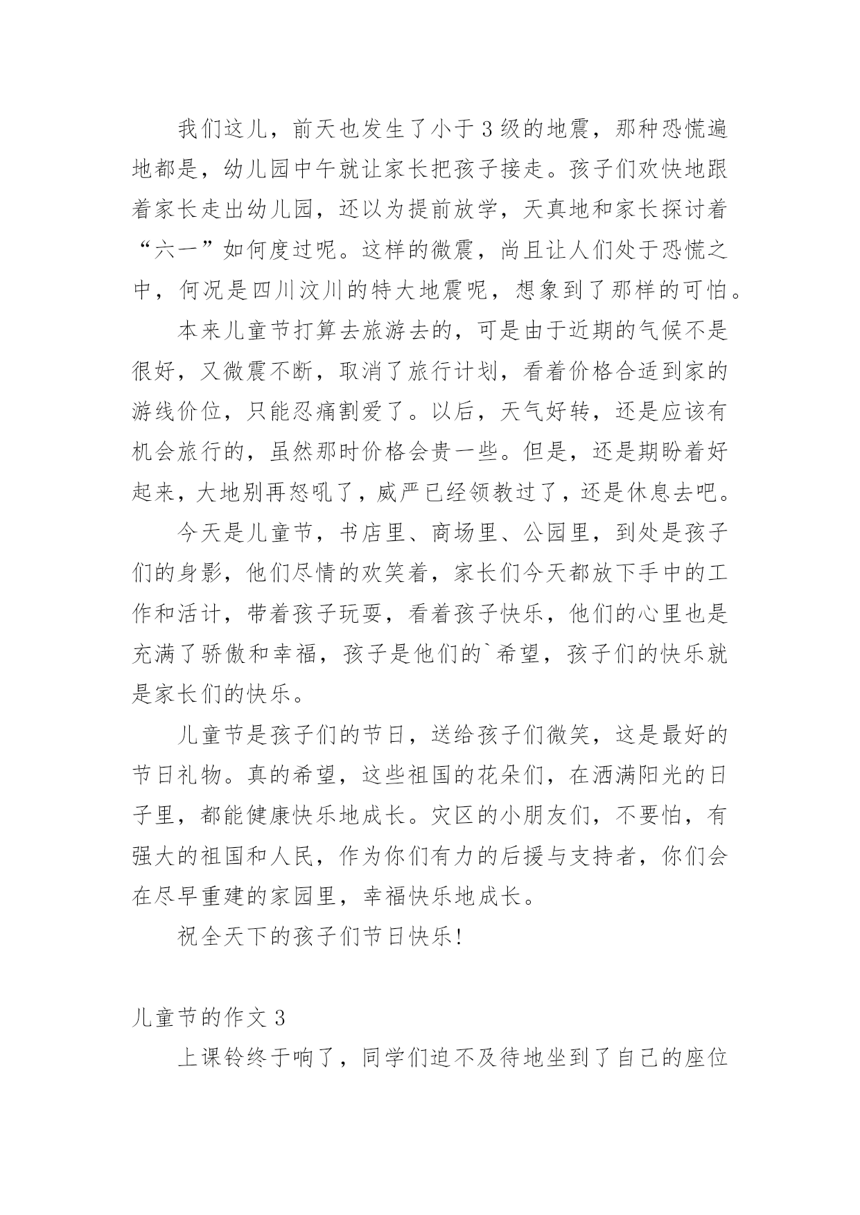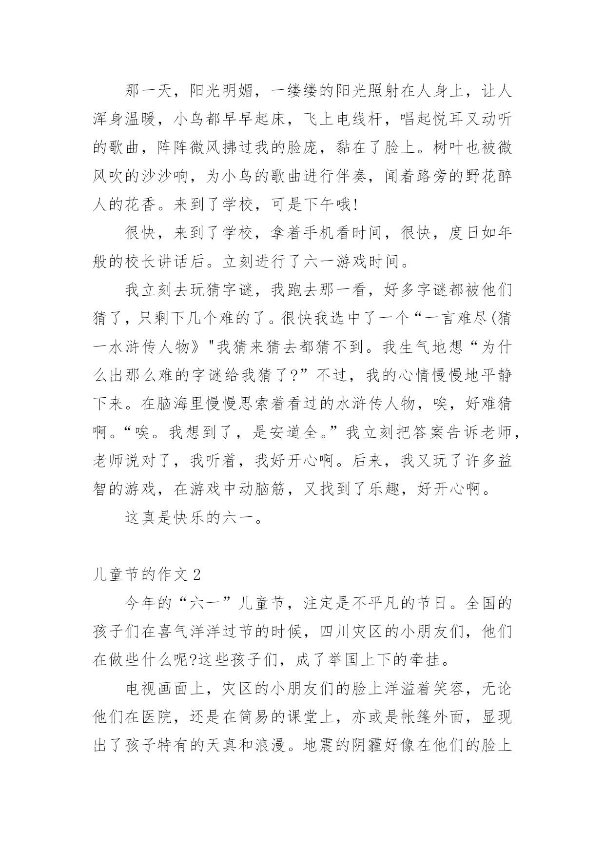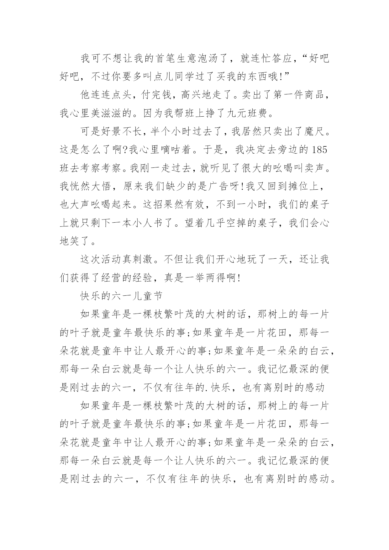 儿童节的作文 儿童节的作文在学习、工作、生活中,大家总少不了接触作文吧,作文一定要做到主题集中,围绕同一主题作深入阐述,切忌东拉西扯,主题涣散甚至无主题。写起作文来就毫无头绪?以下是小编为大家收集的儿童节的作文,欢迎阅读,希望大家能够喜欢。儿童节的作文1六月一日,学校举行了六一儿童节的庆祝活动。每个同学从家里带一些旧东西到学校,然后以班级为单位,进行旧东西的买卖。校长宣布活动开始后,我们就兴致勃勃地开始了“跳蚤市场”的活动。我们搬来桌子,放好物品,站成一排静静地等着“顾客”的到来,期待我们的东西早点卖完。五分钟以后,我摊位的第一位客人来了,他径直选了个魔尺熟练地玩了起来,看样子是个魔尺高手。只见他目不转睛地盯着魔尺,看了许久,他好像动心了,一只手在口袋里不停地摸着什么东西,又过了大约三十秒,他终于开口了:“同学,这个魔尺多少钱?”“一点也不贵,两根合在一起,刚好是十元钱。”我微笑着对他说,“怎么样,便宜吧!”“九元可以吗?我就九元了。”他急切地说。我可不想让我的首笔生意泡汤了,就连忙答应,“好吧好吧,不过你要多叫点儿同学过了买我的东西哦!”他连连点头,付完钱,高兴地走了。卖出了第一件商品,我心里美滋滋的。因为我帮班上挣了九元班费。可是好景不长,半个小时过去了,我居然只卖出了魔尺。这是怎么了啊?我心里嘀咕着。于是,我决定去旁边的185班去考察考察。我刚一走过去,就听见了很大的吆喝叫卖声。我恍然大悟,原来我们缺少的是广告呀!我又回到摊位上,也大声吆喝起来。这招果然有效,不到一小时,我们的桌子上就只剩下一本小人书了。望着几乎空掉的桌子,我们会心地笑了。这次活动真刺激。不但让我们开心地玩了一天,还让我们获得了经营的经验,真是一举两得啊!快乐的六一儿童节如果童年是一棵枝繁叶茂的大树的话,那树上的每一片的叶子就是童年最快乐的事;如果童年是一片花田,那每一朵花就是童年中让人最开心的事;如果童年是一朵朵的白云,那每一朵白云就是每一个让人快乐的六一。我记忆最深的便是刚过去的六一,不仅有往年的.快乐,也有离别时的感动如果童年是一棵枝繁叶茂的大树的话,那树上的每一片的叶子就是童年最快乐的事;如果童年是一片花田,那每一朵花就是童年中让人最开心的事;如果童年是一朵朵的白云,那每一朵白云就是每一个让人快乐的六一。我记忆最深的便是刚过去的六一,不仅有往年的快乐,也有离别时的感动。那一天,阳光明媚,一缕缕的阳光照射在人身上,让人浑身温暖,小鸟都早早起床,飞上电线杆,唱起悦耳又动听的歌曲,阵阵微风拂过我的脸庞,黏在了脸上。树叶也被微风吹的沙沙响,为小鸟的歌曲进行伴奏,闻着路旁的野花醉人的花香。来到了学校,可是下午哦!很快,来到了学校,拿着手机看时间,很快,度日如年般的校长讲话后。立刻进行了六一游戏时间。我立刻去玩猜字谜,我跑去那一看,好多字谜都被他们猜了,只剩下几个难的了。很快我选中了一个“一言难尽(猜一水浒传人物》"我猜来猜去都猜不到。我生气地想“为什么出那么难的字谜给我猜了?”不过,我的心情慢慢地平静下来。在脑海里慢慢思索着看过的水浒传人物,唉,好难猜啊。“唉。我想到了,是安道全。”我立刻把答案告诉老师,老师说对了,我听着,我好开心啊。后来,我又玩了许多益智的游戏,在游戏中动脑筋,又找到了乐趣,好开心啊。这真是快乐的六一。儿童节的作文2今年的“六一”儿童节,注定是不平凡的节日。全国的孩子们在喜气洋洋过节的时候,四川灾区的小朋友们,他们在做些什么呢?这些孩子们,成了举国上下的牵挂。电视画面上,灾区的小朋友们的脸上洋溢着笑容,无论他们在医院,还是在简易的课堂上,亦或是帐篷外面,显现出了孩子特有的天真和浪漫。地震的阴霾好像在他们的脸上无从体现,或许在大灾面前,他们学会了坚强和承受,把痛苦深深埋藏在心间,以积极向上的乐观情绪迎接新的美好生活。胡书记来到灾区,在儿童节之际,看望了小朋友们。年近七旬的老人,来到孩子们中间,将“一方有难,八方支援;自力更生,艰苦奋斗”写在黑板上,和孩子们一起大声朗读着。孩子们和着胡爷爷,有节奏地诵读着这几句话,是那样有力,那样的镇定。这是灾区小朋友度过的一个有意义的节日,特别值得纪念,也许在他们长大以后,回首往事的时候,当初那样的一段记忆,竟是如此的刻骨铭心。孩子们表现出的乐观、坦然、从容,真的值得我们学习的,他们稚嫩的小脸上,已经没有了对地震的恐惧。帐篷外,孩子们欢快地和解放军叔叔玩耍,这是一群值得孩子们敬重和学习的“最可爱的人”,孩子们也喜欢和他们在一起玩。他们尽情地做着游戏,跳绳上,荡漾着他们的笑声;足球旁,到处是他们欢乐的喝彩声;捉秘藏的地方,留下他们快乐的身影……孩子们忘记了灾难带给他们的痛苦,流露出特有的纯真。画面在切换,一位小女孩,在节日来临的时候,捧起护士阿姨送给她的书,躺在病床上,津津有味地看着,神情非常的专注,忘记