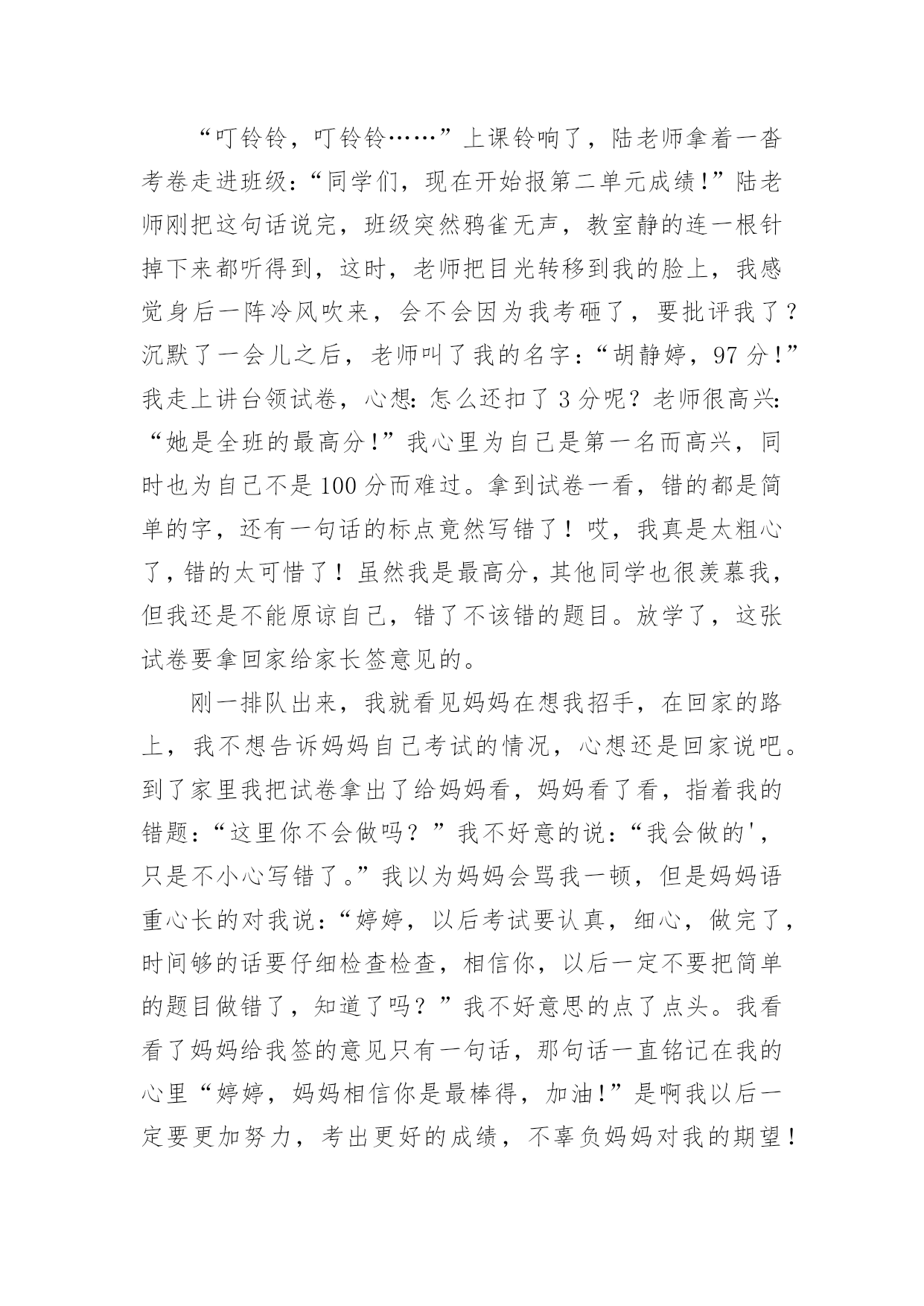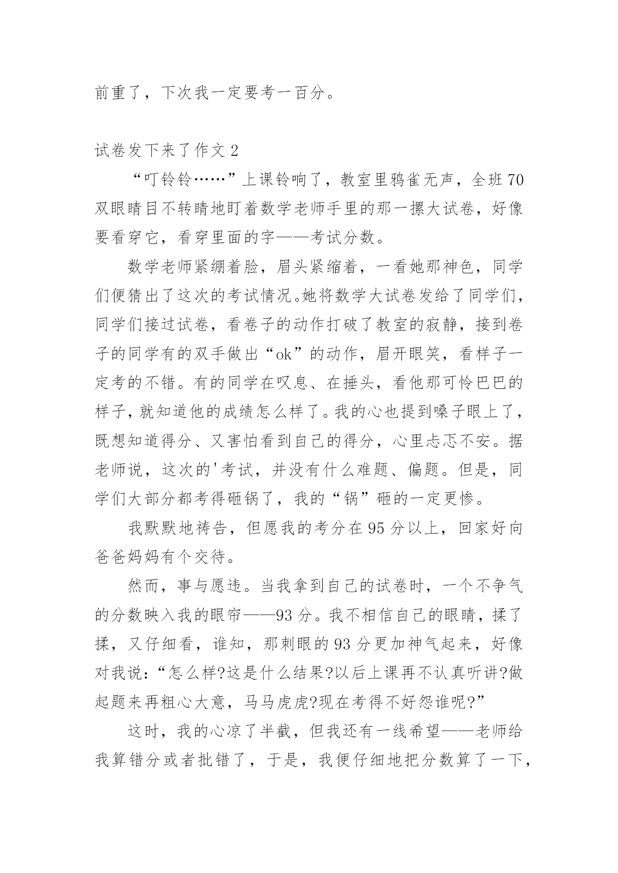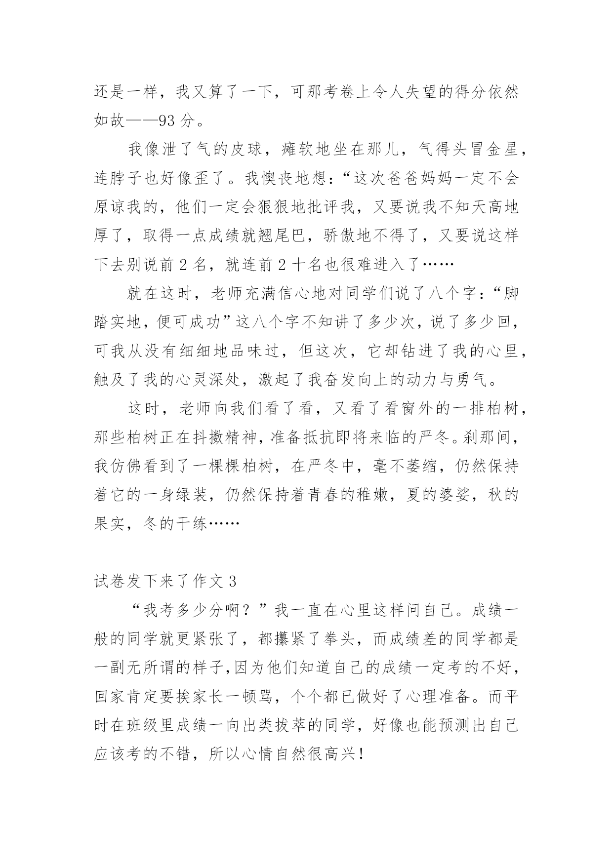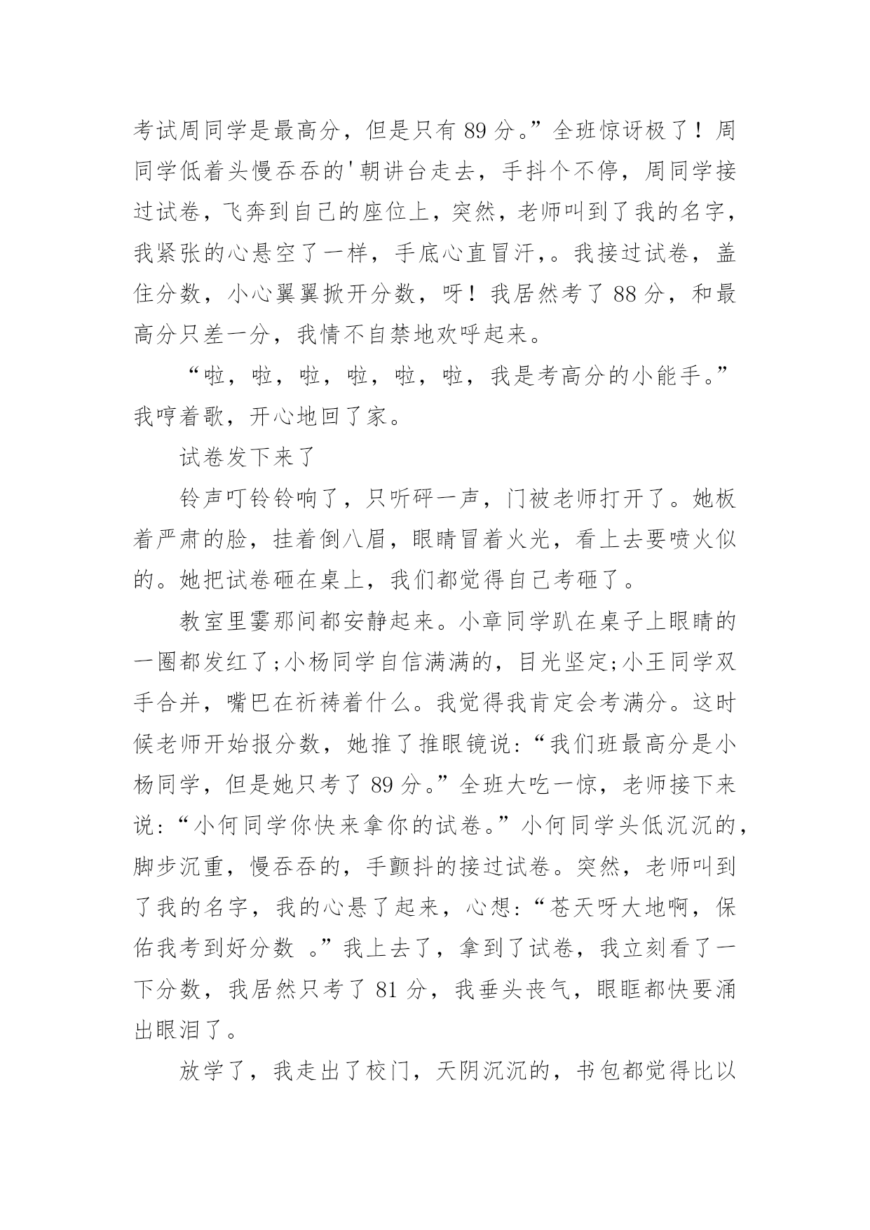 试卷发下来了作文 试卷发下来了作文[集锦5篇]在学习、工作乃至生活中,大家都写过作文,肯定对各类作文都很熟悉吧,作文可分为小学作文、中学作文、大学作文(论文)。那么,怎么去写作文呢?以下是小编整理的试卷发下来了作文,欢迎阅读,希望大家能够喜欢。试卷发下来了作文1试卷发下来了“发试卷了!发试卷了!同学们快坐好,王老师来了!”我们班的百灵鸟钱同学边跑边喊到,顿时,教室里安静了下来。上课了,只听见走廊上传来一阵“噔,噔,噔”的脚步声,那脚步声就像一颗定时炸弹正在倒计时一样,同学们鸦雀无声,教室里连一根针掉在地上也听的见。我的心里七上八下,仿佛过了一个世纪似的。忽然,门被重重撞开啦,老师愤怒地把试卷重重的摔在讲台上瞬间,教室里弥漫着一股浓浓的杀气。王同学趴在桌子上头低着就要埋进了抽屉一样,一副无精打采的样子,学霸周同学自信满满的端坐着,用眼睛紧紧的盯着试卷。我的嘴里不断祈祷:“希望我考的好一点,希望我考的好一点……”开始报分数了,王老师推了推眼镜,严肃的说:“这次考试周同学是最高分,但是只有89分。”全班惊讶极了!周同学低着头慢吞吞的'朝讲台走去,手抖个不停,周同学接过试卷,飞奔到自己的座位上,突然,老师叫到了我的名字,我紧张的心悬空了一样,手底心直冒汗,。我接过试卷,盖住分数,小心翼翼掀开分数,呀!我居然考了88分,和最高分只差一分,我情不自禁地欢呼起来。“啦,啦,啦,啦,啦,啦,我是考高分的小能手。”我哼着歌,开心地回了家。试卷发下来了铃声叮铃铃响了,只听砰一声,门被老师打开了。她板着严肃的脸,挂着倒八眉,眼睛冒着火光,看上去要喷火似的。她把试卷砸在桌上,我们都觉得自己考砸了。教室里霎那间都安静起来。小章同学趴在桌子上眼睛的一圈都发红了;小杨同学自信满满的,目光坚定;小王同学双手合并,嘴巴在祈祷着什么。我觉得我肯定会考满分。这时候老师开始报分数,她推了推眼镜说:“我们班最高分是小杨同学,但是她只考了89分。”全班大吃一惊,老师接下来说:“小何同学你快来拿你的试卷。”小何同学头低沉沉的,脚步沉重,慢吞吞的,手颤抖的接过试卷。突然,老师叫到了我的名字,我的心悬了起来,心想:“苍天呀大地啊,保佑我考到好分数。”我上去了,拿到了试卷,我立刻看了一下分数,我居然只考了81分,我垂头丧气,眼眶都快要涌出眼泪了。放学了,我走出了校门,天阴沉沉的,书包都觉得比以前重了,下次我一定要考一百分。试卷发下来了作文2“叮铃铃……”上课铃响了,教室里鸦雀无声,全班70双眼睛目不转睛地盯着数学老师手里的那一摞大试卷,好像要看穿它,看穿里面的字——考试分数。数学老师紧绷着脸,眉头紧缩着,一看她那神色,同学们便猜出了这次的考试情况。她将数学大试卷发给了同学们,同学们接过试卷,看卷子的动作打破了教室的寂静,接到卷子的同学有的双手做出“ok”的动作,眉开眼笑,看样子一定考的不错。有的同学在叹息、在捶头,看他那可怜巴巴的样子,就知道他的成绩怎么样了。我的心也提到嗓子眼上了,既想知道得分、又害怕看到自己的得分,心里忐忑不安。据老师说,这次的'考试,并没有什么难题、偏题。但是,同学们大部分都考得砸锅了,我的“锅”砸的一定更惨。我默默地祷告,但愿我的考分在95分以上,回家好向爸爸妈妈有个交待。然而,事与愿违。当我拿到自己的试卷时,一个不争气的分数映入我的眼帘——93分。我不相信自己的眼睛,揉了揉,又仔细看,谁知,那刺眼的93分更加神气起来,好像对我说:“怎么样?这是什么结果?以后上课再不认真听讲?做起题来再粗心大意,马马虎虎?现在考得不好怨谁呢?”这时,我的心凉了半截,但我还有一线希望——老师给我算错分或者批错了,于是,我便仔细地把分数算了一下,还是一样,我又算了一下,可那考卷上令人失望的得分依然如故——93分。我像泄了气的皮球,瘫软地坐在那儿,气得头冒金星,连脖子也好像歪了。我懊丧地想:“这次爸爸妈妈一定不会原谅我的,他们一定会狠狠地批评我,又要说我不知天高地厚了,取得一点成绩就翘尾巴,骄傲地不得了,又要说这样下去别说前2名,就连前2十名也很难进入了……就在这时,老师充满信心地对同学们说了八个字:“脚踏实地,便可成功”这八个字不知讲了多少次,说了多少回,可我从没有细细地品味过,但这次,它却钻进了我的心里,触及了我的心灵深处,激起了我奋发向上的动力与勇气。这时,老师向我们看了看,又看了看窗外的一排柏树,那些柏树正在抖擞精神,准备抵抗即将来临的严冬。刹那间,我仿佛看到了一棵棵柏树,在严冬中,毫不萎缩,仍然保持着它的一身绿装,仍然保持着青春的稚嫩,夏的婆娑,秋的果实,冬的干练……试卷发下来了作文3“我考多少分啊?”我一直在心里这样问自己。成绩一般的同学就更紧张了,都攥紧了拳头,而成绩差的同学都是一副无所谓的样子,因为他们知道自己的成绩一定考的不好,回家肯定要挨家长一顿骂,个个
