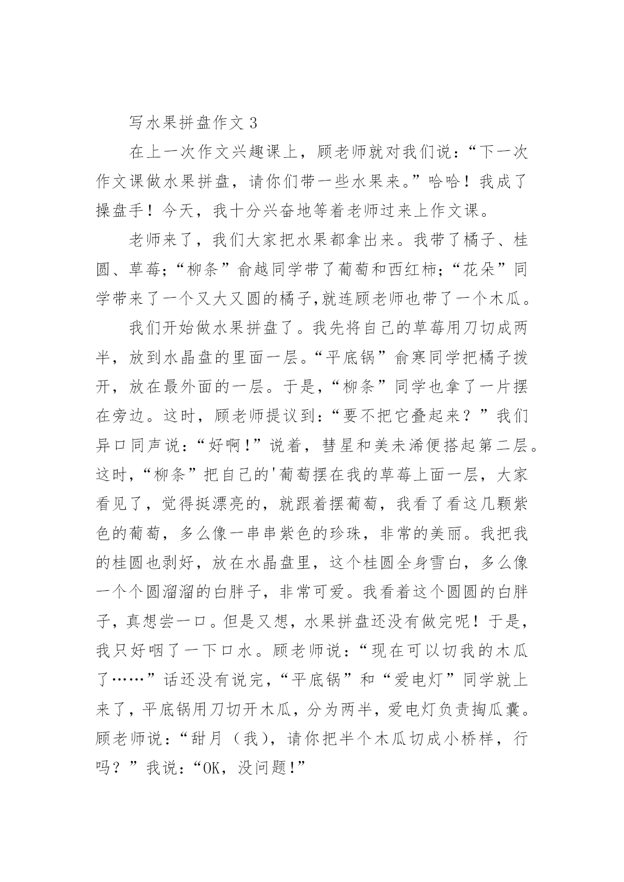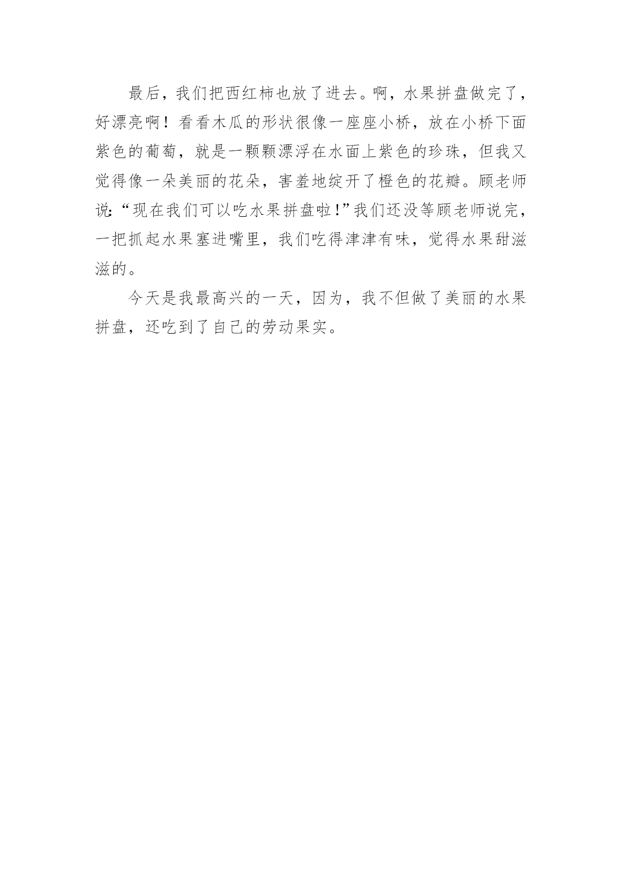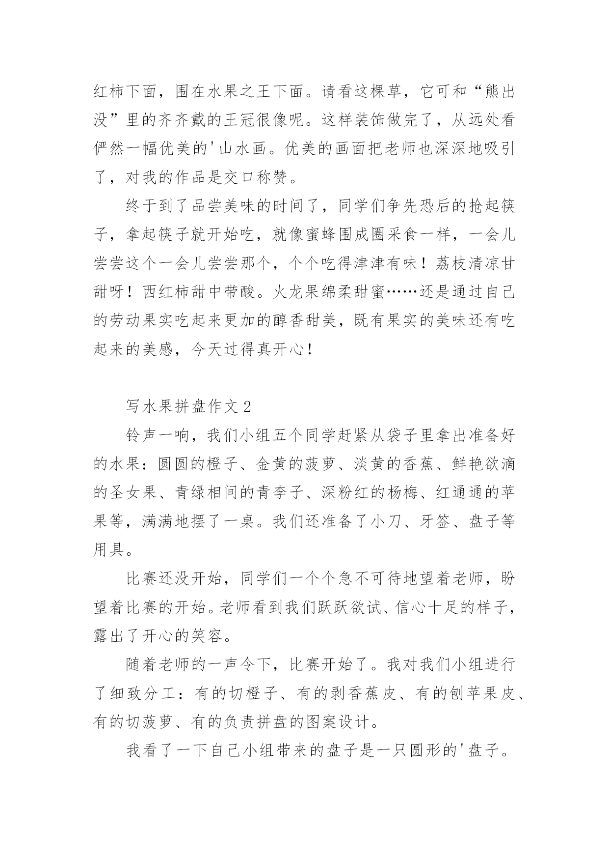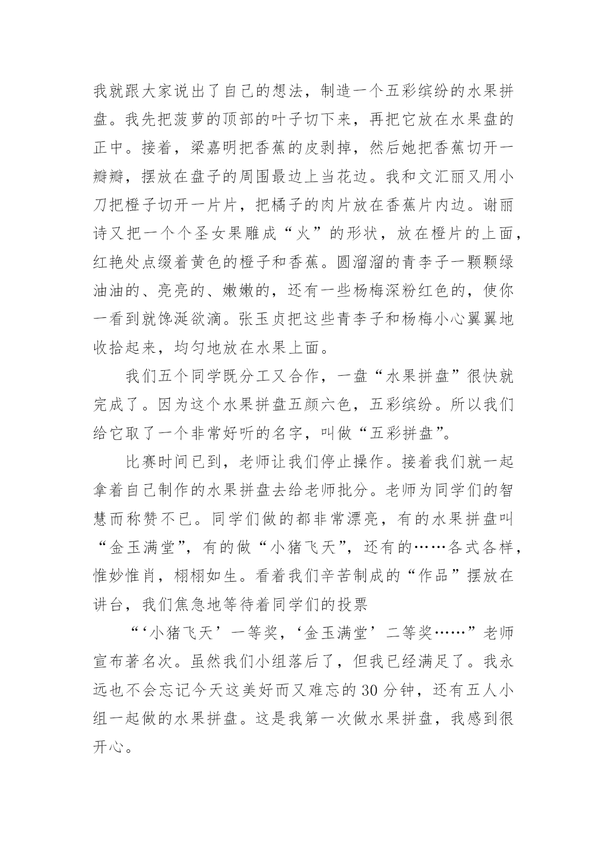 写水果拼盘作文 写水果拼盘作文水果拼盘的做法简单,是菜谱里的常见菜,水果拼盘口味属于甜味,做法属拌菜类,但怎么做水果拼盘最好吃,主要看自己的口味习惯进行细节调整。写水果拼盘作文1今天,我们要做水果拼盘,我怀着激动的心情早早地来到作文班,只见桌上的水果各种各样,让我看得眼花缭乱,有杏儿,有火龙果,有桃子,有香蕉,还有梨……真是五花八门啊!我也不甘示弱赶紧拿出事先准备好的水果放在了桌子上。开始做水果了,我先拿出一个桃子,然后一刀切下去,“嚓嚓”几声响后,一个个船形的桃子被我这“邓氏一刀”给切出漂亮的图形,然后把圆形切两瓣分别放在中间,再切一瓣西红柿放在四个香蕉中间,接着再把火龙果切成三角形,一个凸出来一个凹进去,宛如一座座高山,最后把一棵棵洗好的“小草”放在几座“高山”的缝隙里,周围围上了一棵棵绿树。哈哈!只剩装饰了,我把桑葚一个个切成片围成一个圆形,黝黑的桑葚像一颗颗闪亮的黑珍珠,格外引人注目。再把小吃素鱼放在桑葚上面,像一条条小鱼在水中自由自在的游来游去,两只小船在里面游啊游,最后把两个荔枝放到西红柿下面,围在水果之王下面。请看这棵草,它可和“熊出没”里的齐齐戴的王冠很像呢。这样装饰做完了,从远处看俨然一幅优美的'山水画。优美的画面把老师也深深地吸引了,对我的作品是交口称赞。终于到了品尝美味的时间了,同学们争先恐后的抢起筷子,拿起筷子就开始吃,就像蜜蜂围成圈采食一样,一会儿尝尝这个一会儿尝尝那个,个个吃得津津有味!荔枝清凉甘甜呀!西红柿甜中带酸。火龙果绵柔甜蜜……还是通过自己的劳动果实吃起来更加的醇香甜美,既有果实的美味还有吃起来的美感,今天过得真开心!写水果拼盘作文2铃声一响,我们小组五个同学赶紧从袋子里拿出准备好的水果:圆圆的橙子、金黄的菠萝、淡黄的香蕉、鲜艳欲滴的圣女果、青绿相间的青李子、深粉红的杨梅、红通通的苹果等,满满地摆了一桌。我们还准备了小刀、牙签、盘子等用具。比赛还没开始,同学们一个个急不可待地望着老师,盼望着比赛的开始。老师看到我们跃跃欲试、信心十足的样子,露出了开心的笑容。随着老师的一声令下,比赛开始了。我对我们小组进行了细致分工:有的切橙子、有的剥香蕉皮、有的刨苹果皮、有的切菠萝、有的负责拼盘的图案设计。我看了一下自己小组带来的盘子是一只圆形的'盘子。我就跟大家说出了自己的想法,制造一个五彩缤纷的水果拼盘。我先把菠萝的顶部的叶子切下来,再把它放在水果盘的正中。接着,梁嘉明把香蕉的皮剥掉,然后她把香蕉切开一瓣瓣,摆放在盘子的周围最边上当花边。我和文汇丽又用小刀把橙子切开一片片,把橘子的肉片放在香蕉片内边。谢丽诗又把一个个圣女果雕成“火”的形状,放在橙片的上面,红艳处点缀着黄色的橙子和香蕉。圆溜溜的青李子一颗颗绿油油的、亮亮的、嫩嫩的,还有一些杨梅深粉红色的,使你一看到就馋涎欲滴。张玉贞把这些青李子和杨梅小心翼翼地收拾起来,均匀地放在水果上面。我们五个同学既分工又合作,一盘“水果拼盘”很快就完成了。因为这个水果拼盘五颜六色,五彩缤纷。所以我们给它取了一个非常好听的名字,叫做“五彩拼盘”。比赛时间已到,老师让我们停止操作。接着我们就一起拿着自己制作的水果拼盘去给老师批分。老师为同学们的智慧而称赞不已。同学们做的都非常漂亮,有的水果拼盘叫“金玉满堂”,有的做“小猪飞天”,还有的……各式各样,惟妙惟肖,栩栩如生。看着我们辛苦制成的“作品”摆放在讲台,我们焦急地等待着同学们的投票“‘小猪飞天’一等奖,‘金玉满堂’二等奖……”老师宣布著名次。虽然我们小组落后了,但我已经满足了。我永远也不会忘记今天这美好而又难忘的30分钟,还有五人小组一起做的水果拼盘。这是我第一次做水果拼盘,我感到很开心。写水果拼盘作文3在上一次作文兴趣课上,顾老师就对我们说:“下一次作文课做水果拼盘,请你们带一些水果来。”哈哈!我成了操盘手!今天,我十分兴奋地等着老师过来上作文课。老师来了,我们大家把水果都拿出来。我带了橘子、桂圆、草莓;“柳条”俞越同学带了葡萄和西红柿;“花朵”同学带来了一个又大又圆的橘子,就连顾老师也带了一个木瓜。我们开始做水果拼盘了。我先将自己的草莓用刀切成两半,放到水晶盘的里面一层。“平底锅”俞寒同学把橘子拨开,放在最外面的一层。于是,“柳条”同学也拿了一片摆在旁边。这时,顾老师提议到:“要不把它叠起来?”我们异口同声说:“好啊!”说着,彗星和美未浠便搭起第二层。这时,“柳条”把自己的'葡萄摆在我的草莓上面一层,大家看见了,觉得挺漂亮的,就跟着摆葡萄,我看了看这几颗紫色的葡萄,多么像一串串紫色的珍珠,非常的美丽。我把我的桂圆也剥好,放在水晶盘里,这个桂圆全身雪白,多么像一个个圆溜溜的白胖子,非常可爱。我看着这个圆圆的白胖子,真想尝一口。但是又想,水果拼盘还没有做完呢!于是,我只好咽了一下口水。顾老师说:“现在可以切我的木瓜了