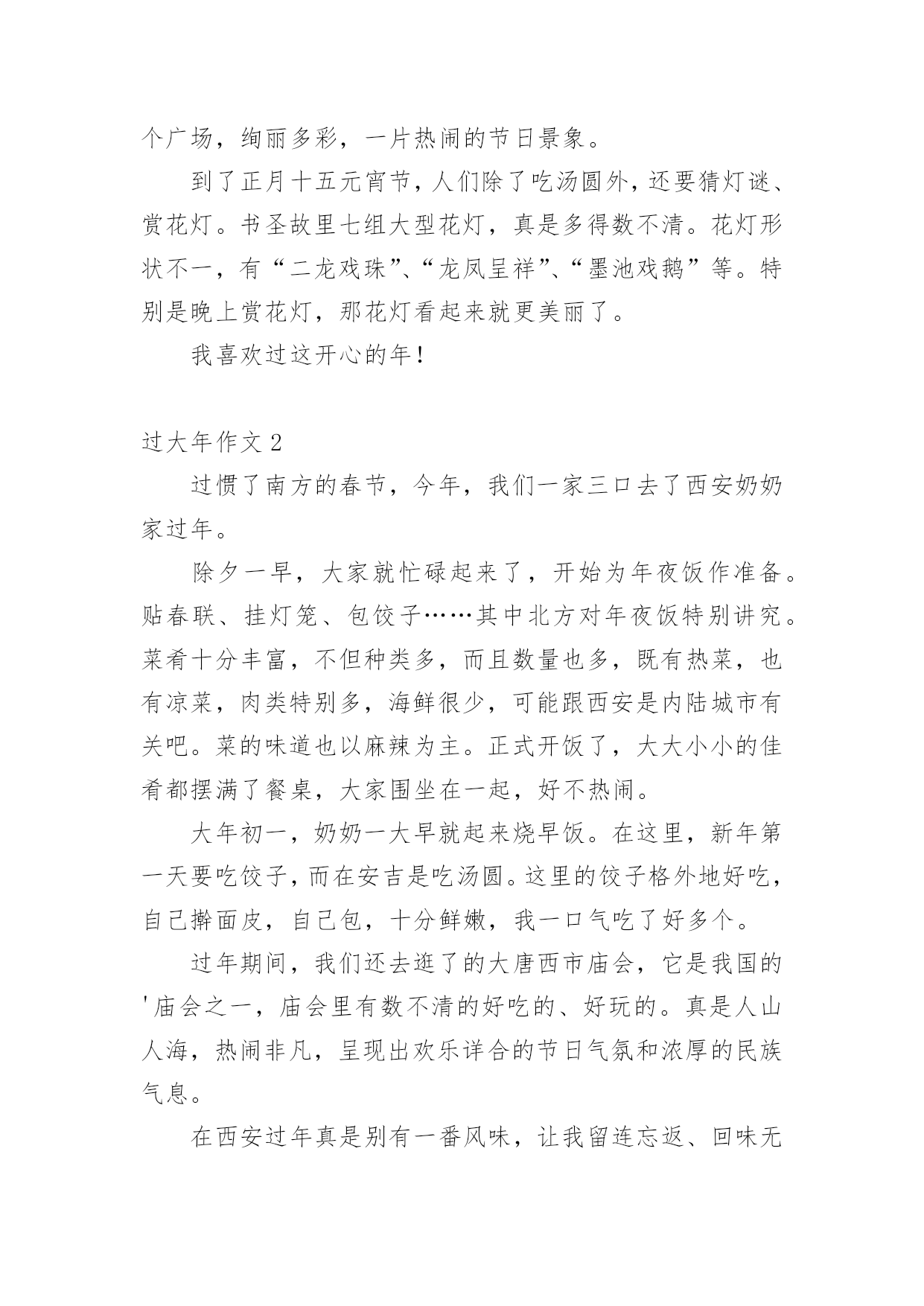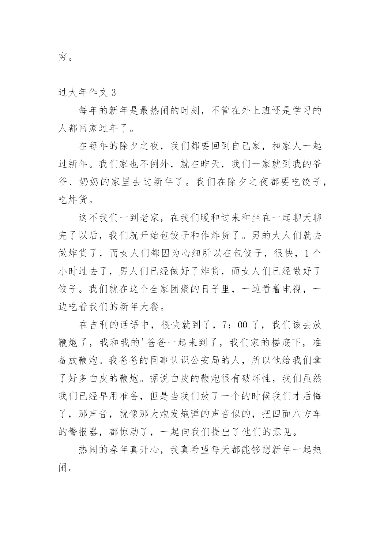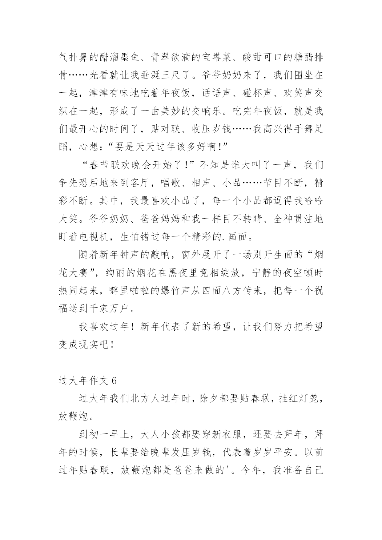 过大年作文 过大年作文在生活、工作和学习中,大家一定都接触过作文吧,作文一定要做到主题集中,围绕同一主题作深入阐述,切忌东拉西扯,主题涣散甚至无主题。写起作文来就毫无头绪?以下是小编精心整理的过大年作文,仅供参考,大家一起来看看吧。过大年作文1我觉得最开心的事那就是过年了。在除夕夜,我们全家邀请外公、外婆、爷爷、奶奶到我们家来吃年夜饭。丰盛的年夜饭摆满了整整一大桌,大家津津有味地吃着,七嘴八舌地谈着高兴事,嘻嘻哈哈笑声不绝。到了八时整,我们一家人围着电视观看“春节联欢晚会”。节目有小品、相声、魔术、歌曲等,个个都非常精彩。当零点钟声敲响时,窗外传来了阵阵的鞭炮声,我们迎来了新的一年!此时此刻,我想到了王安石的《元日》:“爆竹声中一岁除,春风送暖入屠苏。千门万户曈曈日,总把新桃换旧符。”正月里人们穿上节日的.新装,纷纷走亲访友。马路上人山人海,路两旁的树上挂着大大小小的红灯笼和中国结。广场上打扮得十分漂亮,到处摆放着用鲜花拼成的各种造型,有的是“蛇”、有的是巨型花篮、还有的是“孔雀开屏”,吸引着人们争相观看。到了晚上,五光十色的霓虹灯装点着整个广场,绚丽多彩,一片热闹的节日景象。到了正月十五元宵节,人们除了吃汤圆外,还要猜灯谜、赏花灯。书圣故里七组大型花灯,真是多得数不清。花灯形状不一,有“二龙戏珠”、“龙凤呈祥”、“墨池戏鹅”等。特别是晚上赏花灯,那花灯看起来就更美丽了。我喜欢过这开心的年!过大年作文2过惯了南方的春节,今年,我们一家三口去了西安奶奶家过年。除夕一早,大家就忙碌起来了,开始为年夜饭作准备。贴春联、挂灯笼、包饺子……其中北方对年夜饭特别讲究。菜肴十分丰富,不但种类多,而且数量也多,既有热菜,也有凉菜,肉类特别多,海鲜很少,可能跟西安是内陆城市有关吧。菜的味道也以麻辣为主。正式开饭了,大大小小的佳肴都摆满了餐桌,大家围坐在一起,好不热闹。大年初一,奶奶一大早就起来烧早饭。在这里,新年第一天要吃饺子,而在安吉是吃汤圆。这里的饺子格外地好吃,自己擀面皮,自己包,十分鲜嫩,我一口气吃了好多个。过年期间,我们还去逛了的大唐西市庙会,它是我国的'庙会之一,庙会里有数不清的好吃的、好玩的。真是人山人海,热闹非凡,呈现出欢乐详合的节日气氛和浓厚的民族气息。在西安过年真是别有一番风味,让我留连忘返、回味无穷。过大年作文3每年的新年是最热闹的时刻,不管在外上班还是学习的人都回家过年了。在每年的除夕之夜,我们都要回到自己家,和家人一起过新年。我们家也不例外,就在昨天,我们一家就到我的爷爷、奶奶的家里去过新年了。我们在除夕之夜都要吃饺子,吃炸货。这不我们一到老家,在我们暖和过来和坐在一起聊天聊完了以后,我们就开始包饺子和作炸货了。男的大人们就去做炸货了,而女人们都因为心细所以在包饺子,很快,1个小时过去了,男人们已经做好了炸货,而女人们已经做好了饺子。我们就在这个全家团聚的日子里,一边看着电视,一边吃着我们的新年大餐。在吉利的话语中,很快就到了,7:00了,我们该去放鞭炮了,我和我的'爸爸一起来到了,我们家的楼底下,准备放鞭炮。我爸爸的同事认识公安局的人,所以他给我们拿了好多白皮的鞭炮。据说白皮的鞭炮很有破坏性,我们虽然我们已经早用准备,但是当我们放了一个的时候我们才后悔了,那声音,就像那大炮发炮弹的声音似的,把四面八方车的警报器,都惊动了,一起向我们提出了他们的意见。热闹的春年真开心,我真希望每天都能够想新年一起热闹。过大年作文4大年三十,辞旧迎新,到处洋溢着欢乐的气氛。晚上,一家人围着大圆桌高高兴兴地吃团圆饭。饭后,我们便开始放鞭炮、放烟花。邻家大哥哥拿来了一枚“蝴蝶花”,小心翼翼地点燃。不一会儿,一朵朵五颜六色的花就到处乱窜,有黄色的,有绿色的……像蝴蝶在飞舞。那“火星”冲上云霄,又洒落下来,既像炼钢炉里的火花,又似美丽的喷泉。这时,“太空人”喷出一道白色火焰,仿佛一朵正在怒放的菊花,令人赏心悦目。堂姐的`“连珠筒”更是奇妙,一会儿喷红,一会儿吐绿,在空中变幻着。调皮的小表弟点燃爆竹,一扔,立刻捂着耳朵逃开了;“啪”的一声,爆竹爆炸了。越来越多的人出来了,鞭炮声响成一片,礼花把夜空映得如同白昼。我们拍着手,跳着、笑着,沉浸在欢乐的海洋中……“当当当……”零点的钟声敲响了,新的一年来临了。我们欢呼着,雀跃着,互相祝愿新年好。一朵朵烟花映红了人们的笑脸。哦,幸福之花开在天上,开在地上,也开在人们的心上……过大年作文5“过年了,过年了!”我期盼已久的新年终于到了。爸爸妈妈忙碌了半天,准备了一桌丰盛的年夜饭,有香气扑鼻的醋溜墨鱼、青翠欲滴的宝塔菜、酸甜可口的糖醋排骨……光看就让我垂涎三尺了。爷爷奶奶来了,我们围坐在一起,津津有味地吃着年夜饭,话语声、碰杯声、欢笑声交织在一起,形成了一曲美妙的交响乐。吃完年夜饭,就是我们最开心的时间了,贴