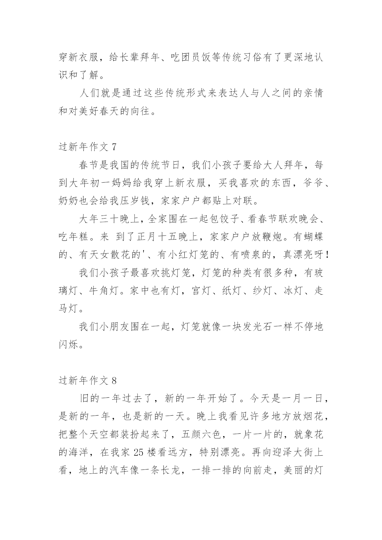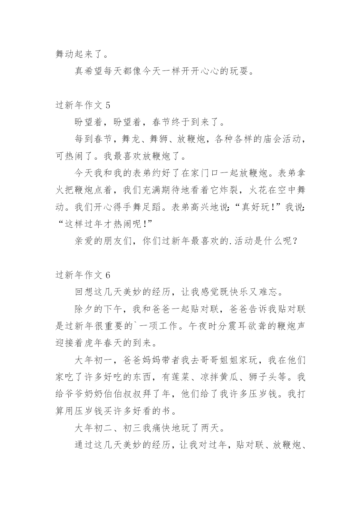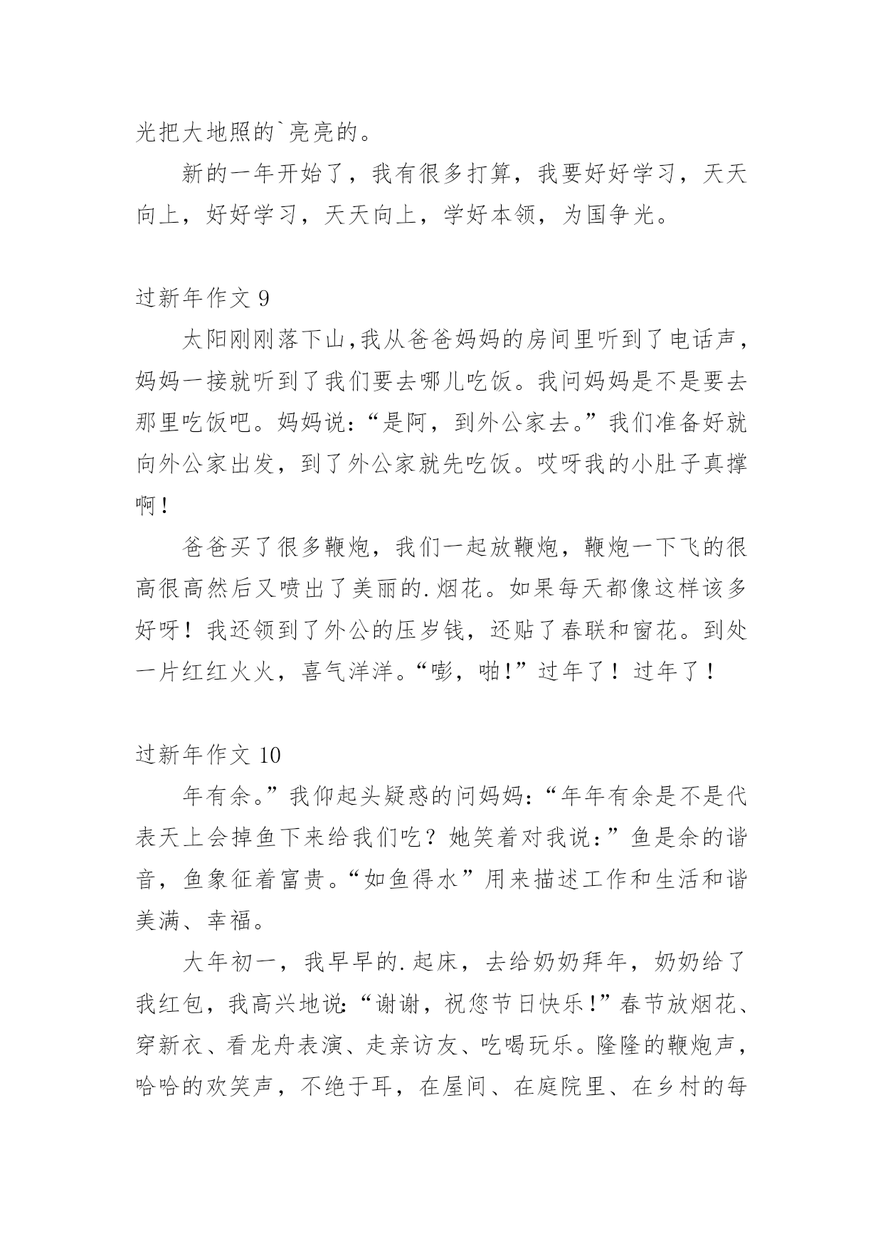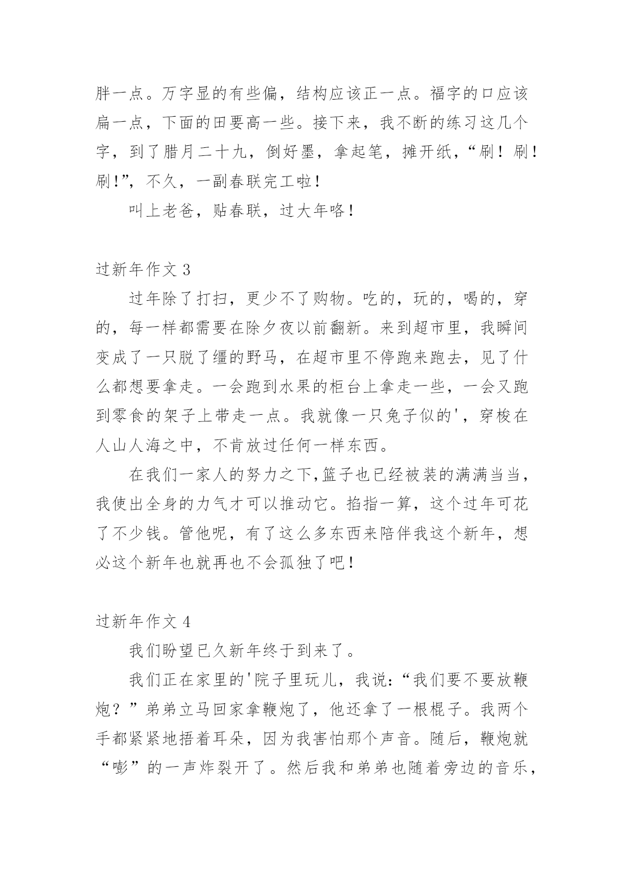 过新年作文 【必备】过新年作文在学习、工作、生活中,大家或多或少都会接触过作文吧,作文是人们以书面形式表情达意的言语活动。那么,怎么去写作文呢?下面是小编为大家收集的过新年作文,欢迎阅读,希望大家能够喜欢。过新年作文1今天是除夕,是中国传统的节日。在很久很久以前年是一只怪兽,经常来村里里捣乱,后来人们想出了它怕鞭炮声和红色。人们就贴对联放鞭炮。这多是年的来历和过的习俗了!我在外婆家过年,我们早早的吃完了年夜饭。忽然外面响起了一阵阵鞭炮声。看了以后我忍不住地拿起我的`小烟花跟小伙伴玩,来庆祝年的到来!过新年作文2一放寒假,妈妈就宣布我家的春联交给我负责。写什么呢?我在隶书春联字帖里翻来翻去,嘿!这幅好;“一帆风顺全家福,万事如意满门春。”横批:“新春祥和”。定好了对联,我就开始动工了,先在毛边纸上练习一下,我一鼓作气写下整幅联,“不错!”妈妈在旁边笑眯眯的看着。我仔细看了看,帆字下笔的时候应该再重一些,让它显的'胖一点。万字显的有些偏,结构应该正一点。福字的口应该扁一点,下面的田要高一些。接下来,我不断的练习这几个字,到了腊月二十九,倒好墨,拿起笔,摊开纸,“刷!刷!刷!”,不久,一副春联完工啦!叫上老爸,贴春联,过大年咯!过新年作文3过年除了打扫,更少不了购物。吃的,玩的,喝的,穿的,每一样都需要在除夕夜以前翻新。来到超市里,我瞬间变成了一只脱了缰的野马,在超市里不停跑来跑去,见了什么都想要拿走。一会跑到水果的柜台上拿走一些,一会又跑到零食的架子上带走一点。我就像一只兔子似的',穿梭在人山人海之中,不肯放过任何一样东西。在我们一家人的努力之下,篮子也已经被装的满满当当,我使出全身的力气才可以推动它。掐指一算,这个过年可花了不少钱。管他呢,有了这么多东西来陪伴我这个新年,想必这个新年也就再也不会孤独了吧!过新年作文4我们盼望已久新年终于到来了。我们正在家里的'院子里玩儿,我说:“我们要不要放鞭炮?”弟弟立马回家拿鞭炮了,他还拿了一根棍子。我两个手都紧紧地捂着耳朵,因为我害怕那个声音。随后,鞭炮就“嘭”的一声炸裂开了。然后我和弟弟也随着旁边的音乐,舞动起来了。真希望每天都像今天一样开开心心的玩耍。过新年作文5盼望着,盼望着,春节终于到来了。每到春节,舞龙、舞狮、放鞭炮,各种各样的庙会活动,可热闹了。我最喜欢放鞭炮了。今天我和我的表弟约好了在家门口一起放鞭炮。表弟拿火把鞭炮点着,我们充满期待地看着它炸裂,火花在空中舞动。我们开心得手舞足蹈。表弟高兴地说:“真好玩!”我说:“这样过年才热闹呢!”亲爱的朋友们,你们过新年最喜欢的.活动是什么呢?过新年作文6回想这几天美妙的经历,让我感觉既快乐又难忘。除夕的下午,我和爸爸一起贴对联,爸爸告诉我贴对联是过新年很重要的`一项工作。午夜时分震耳欲聋的鞭炮声迎接着虎年春天的到来。大年初一,爸爸妈妈带者我去哥哥姐姐家玩,我在他们家吃了许多好吃的东西,有莲菜、凉拌黄瓜、狮子头等。我给爷爷奶奶伯伯叔叔拜了年,他们给了我许多压岁钱。我打算用压岁钱买许多好看的书。大年初二、初三我痛快地玩了两天。通过这几天美妙的经历,让我对过年,贴对联、放鞭炮、穿新衣服,给长辈拜年、吃团员饭等传统习俗有了更深地认识和了解。人们就是通过这些传统形式来表达人与人之间的亲情和对美好春天的向往。过新年作文7春节是我国的传统节日,我们小孩子要给大人拜年,每到大年初一妈妈给我穿上新衣服,买我喜欢的东西,爷爷、奶奶也会给我压岁钱,家家户户都贴上对联。大年三十晚上,全家围在一起包饺子、看春节联欢晚会、吃年糕。来到了正月十五晚上,家家户户放鞭炮。有蝴蝶的、有天女散花的'、有小红灯笼的、有喷泉的,真漂亮呀!我们小孩子最喜欢挑灯笼,灯笼的种类有很多种,有玻璃灯、牛角灯。家中也有灯,宫灯、纸灯、纱灯、冰灯、走马灯。我们小朋友围在一起,灯笼就像一块发光石一样不停地闪烁。过新年作文8旧的一年过去了,新的一年开始了。今天是一月一日,是新的一年,也是新的一天。晚上我看见许多地方放烟花,把整个天空都装扮起来了,五颜六色,一片一片的,就象花的海洋,在我家25楼看远方,特别漂亮。再向迎泽大街上看,地上的汽车像一条长龙,一排一排的向前走,美丽的灯光把大地照的`亮亮的。新的一年开始了,我有很多打算,我要好好学习,天天向上,好好学习,天天向上,学好本领,为国争光。过新年作文9太阳刚刚落下山,我从爸爸妈妈的房间里听到了电话声,妈妈一接就听到了我们要去哪儿吃饭。我问妈妈是不是要去那里吃饭吧。妈妈说:“是阿,到外公家去。”我们准备好就向外公家出发,到了外公家就先吃饭。哎呀我的小肚子真撑啊!爸爸买了很多鞭炮,我们一起放鞭炮,鞭炮一下飞的很高很高然后又喷出了美丽的.烟花。如果每天都像这样该多好呀!我还领到了外公的压岁钱,还贴了春联和窗花。到处一片红红火火,喜气洋洋。“嘭,啪!