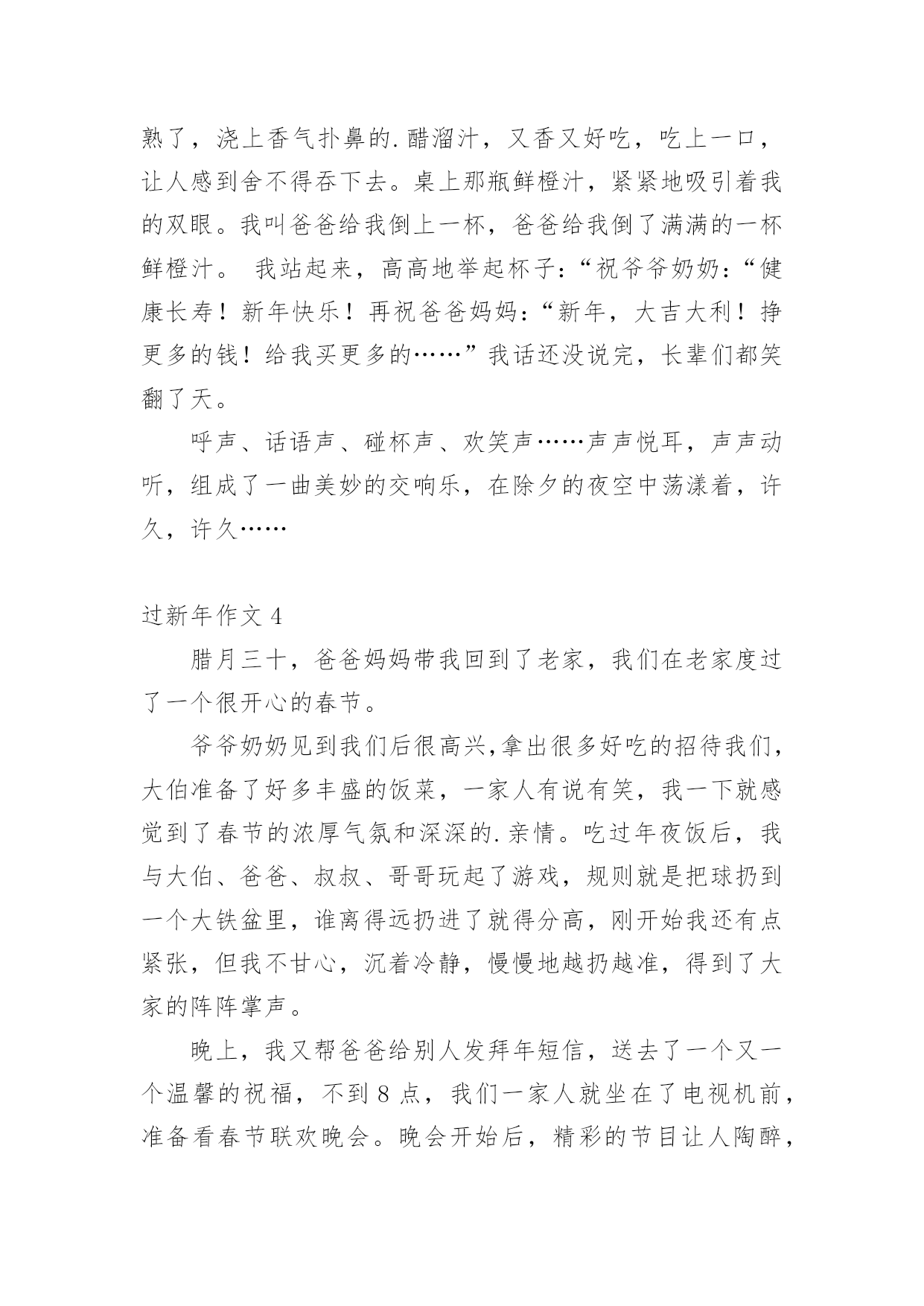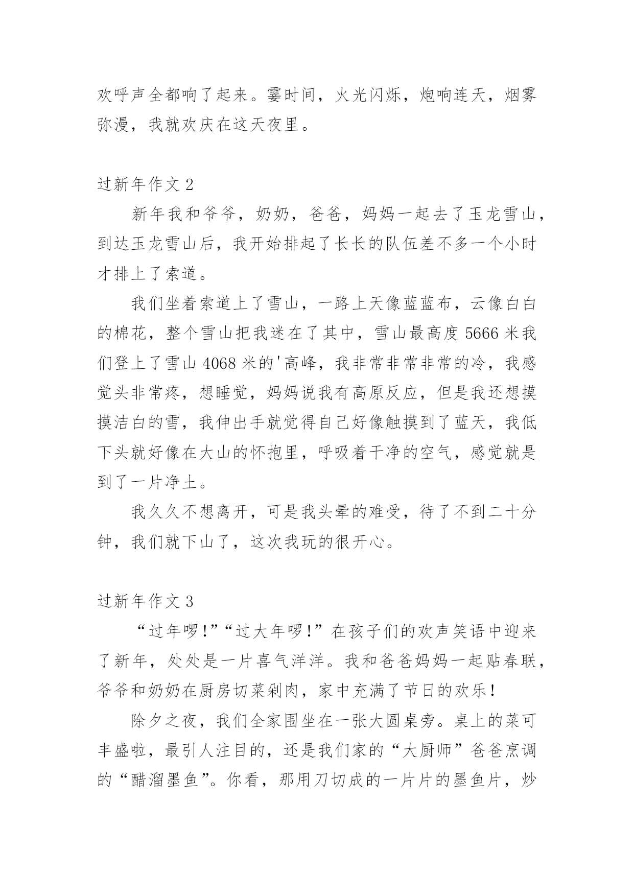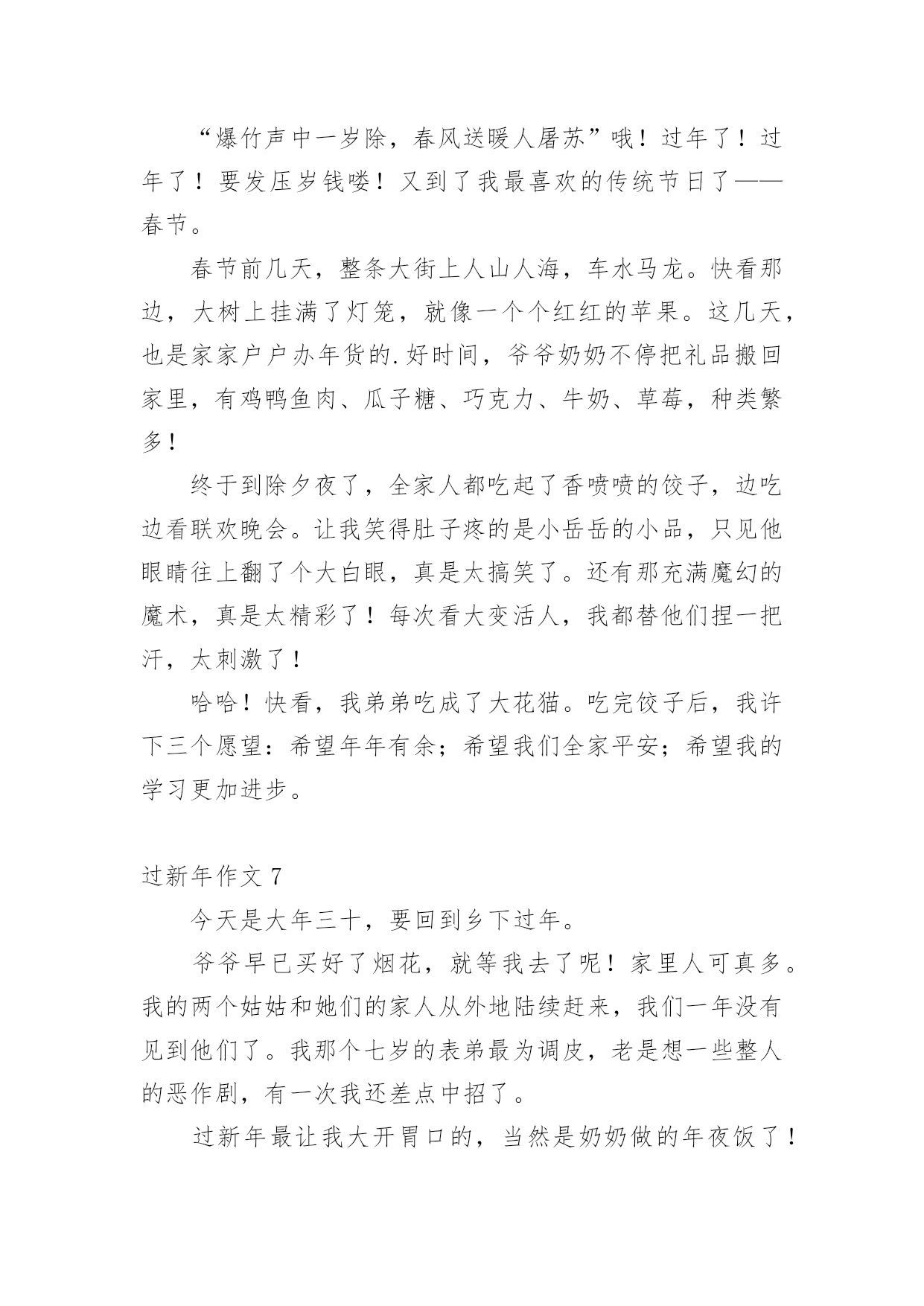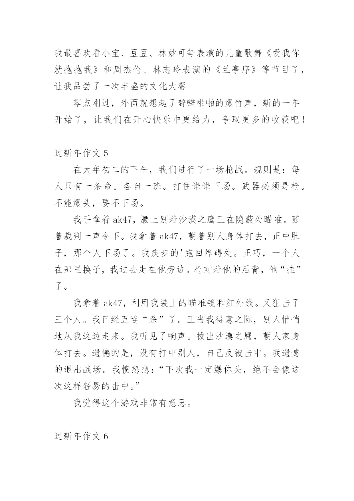 过新年作文 过新年作文在平时的学习、工作或生活中,大家都不可避免地要接触到作文吧,作文是经过人的思想考虑和语言组织,通过文字来表达一个主题意义的记叙方法。如何写一篇有思想、有文采的作文呢?以下是小编为大家收集的过新年作文,仅供参考,大家一起来看看吧。过新年作文1盼星星,盼月亮。终于迎来了一年中最热闹,最欢庆的一天,新年。早上,鞭炮的喧闹声把我从睡梦中惊醒。我揉了揉睡朦朦的眼睛,穿上妈妈给我买的新衣服,新裤子。心里别提有多高兴了。今天难得所有人团聚在一起,小朋友可以尽情地在河边放鞭炮,大人们坐在一起打扑克。多幸福啊!吃完几个饺子,我们一家人就出发去外婆家了。到了外婆家,只见外婆早就在厨房忙了,我兴奋地去问外婆:"外婆您在做什么呀!""我在做你们最爱吃的手蘑年糕啊!"外婆笑着说。^_^我一听,兴奋地一蹦三尺高。这时,哥哥和阿姨也来了。夸我穿的'新衣服,新裤子真好看。我心里更高兴了。晚饭过后,大街上早已是人山人海,有的戴着安全帽有的拿着照相机、还有的手拿鞭炮跃跃欲试。突然,鞭炮声、欢呼声全都响了起来。霎时间,火光闪烁,炮响连天,烟雾弥漫,我就欢庆在这天夜里。过新年作文2新年我和爷爷,奶奶,爸爸,妈妈一起去了玉龙雪山,到达玉龙雪山后,我开始排起了长长的队伍差不多一个小时才排上了索道。我们坐着索道上了雪山,一路上天像蓝蓝布,云像白白的棉花,整个雪山把我迷在了其中,雪山最高度5666米我们登上了雪山4068米的'高峰,我非常非常非常的冷,我感觉头非常疼,想睡觉,妈妈说我有高原反应,但是我还想摸摸洁白的雪,我伸出手就觉得自己好像触摸到了蓝天,我低下头就好像在大山的怀抱里,呼吸着干净的空气,感觉就是到了一片净土。我久久不想离开,可是我头晕的难受,待了不到二十分钟,我们就下山了,这次我玩的很开心。过新年作文3“过年啰!”“过大年啰!”在孩子们的欢声笑语中迎来了新年,处处是一片喜气洋洋。我和爸爸妈妈一起贴春联,爷爷和奶奶在厨房切菜剁肉,家中充满了节日的欢乐!除夕之夜,我们全家围坐在一张大圆桌旁。桌上的菜可丰盛啦,最引人注目的,还是我们家的“大厨师”爸爸烹调的“醋溜墨鱼”。你看,那用刀切成的一片片的墨鱼片,炒熟了,浇上香气扑鼻的.醋溜汁,又香又好吃,吃上一口,让人感到舍不得吞下去。桌上那瓶鲜橙汁,紧紧地吸引着我的双眼。我叫爸爸给我倒上一杯,爸爸给我倒了满满的一杯鲜橙汁。我站起来,高高地举起杯子:“祝爷爷奶奶:“健康长寿!新年快乐!再祝爸爸妈妈:“新年,大吉大利!挣更多的钱!给我买更多的……”我话还没说完,长辈们都笑翻了天。呼声、话语声、碰杯声、欢笑声……声声悦耳,声声动听,组成了一曲美妙的交响乐,在除夕的夜空中荡漾着,许久,许久……过新年作文4腊月三十,爸爸妈妈带我回到了老家,我们在老家度过了一个很开心的春节。爷爷奶奶见到我们后很高兴,拿出很多好吃的招待我们,大伯准备了好多丰盛的饭菜,一家人有说有笑,我一下就感觉到了春节的浓厚气氛和深深的.亲情。吃过年夜饭后,我与大伯、爸爸、叔叔、哥哥玩起了游戏,规则就是把球扔到一个大铁盆里,谁离得远扔进了就得分高,刚开始我还有点紧张,但我不甘心,沉着冷静,慢慢地越扔越准,得到了大家的阵阵掌声。晚上,我又帮爸爸给别人发拜年短信,送去了一个又一个温馨的祝福,不到8点,我们一家人就坐在了电视机前,准备看春节联欢晚会。晚会开始后,精彩的节目让人陶醉,我最喜欢看小宝、豆豆、林妙可等表演的儿童歌舞《爱我你就抱抱我》和周杰伦、林志玲表演的《兰亭序》等节目了,让我品尝了一次丰盛的文化大餐零点刚过,外面就想起了噼噼啪啪的爆竹声,新的一年开始了,让我们在开心快乐中更给力,争取更多的收获吧!过新年作文5在大年初二的下午,我们进行了一场枪战。规则是:每人只有一条命。各自一班。打住谁谁下场。武器必须是枪。不能爆头,要不下场。我手拿着ak47,腰上别着沙漠之鹰正在隐蔽处瞄准。随着裁判一声令下。我拿着ak47,朝着别人身体打去,正中肚子,那个人下场了。我疾步的'跑回障碍处。正巧,一个人在那里换子,我过去走在他旁边。枪对着他的后背,他“挂”了。我拿着ak47,利用我装上的瞄准镜和红外线。又狙击了三个人。我已经五连“杀”了。正当我得意之际,别人悄悄地从我这边走来。我听见了响声。拔出沙漠之鹰,朝人家身体打去。遗憾的是,没有打中别人,自己反被击中。我遗憾的退出战场。我愤怒想:“下次我一定爆你头,绝不会像这次这样轻易的击中。”我觉得这个游戏非常有意思。过新年作文6“爆竹声中一岁除,春风送暖人屠苏”哦!过年了!过年了!要发压岁钱喽!又到了我最喜欢的传统节日了——春节。春节前几天,整条大街上人山人海,车水马龙。快看那边,大树上挂满了灯笼,就像一个个红红的苹果。这几天,也是家家户户办年货的.好时间,爷爷奶奶不停把礼品搬回家里,有鸡鸭鱼肉、瓜子糖、巧克力、牛