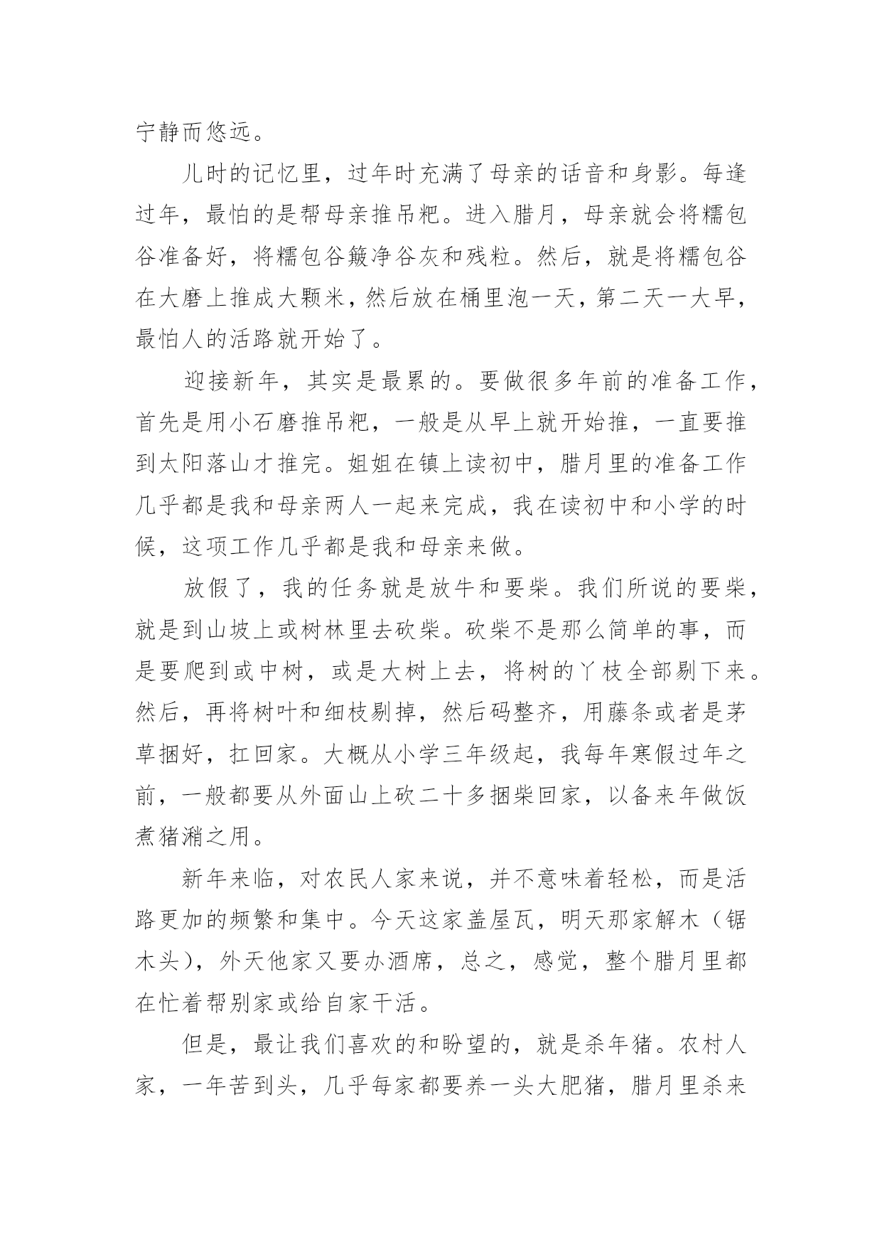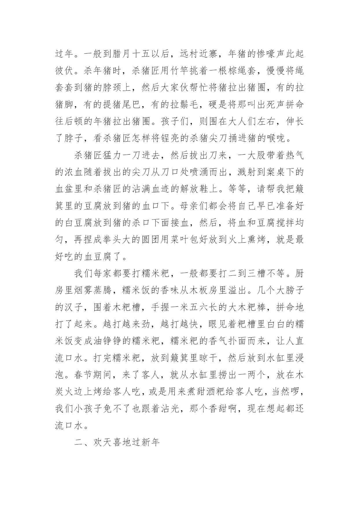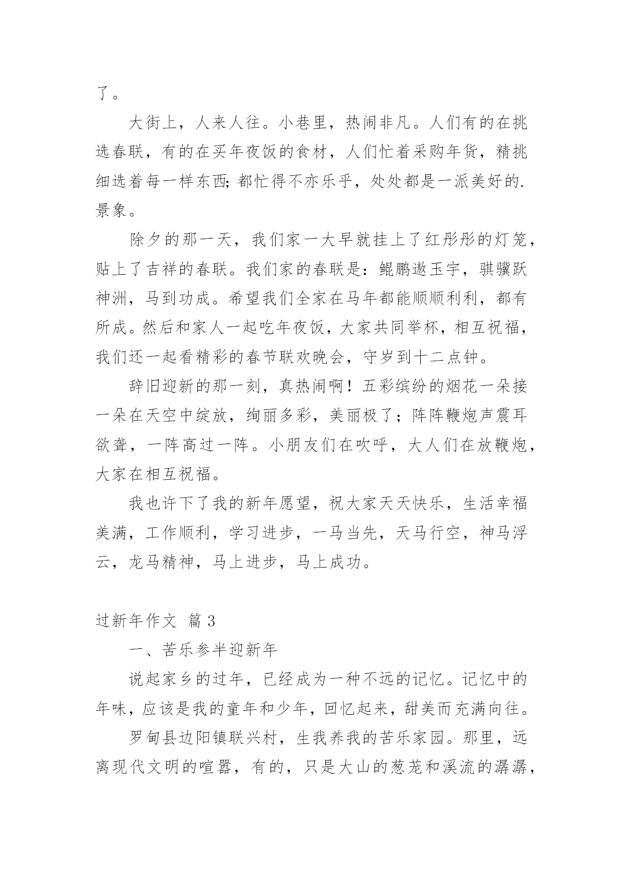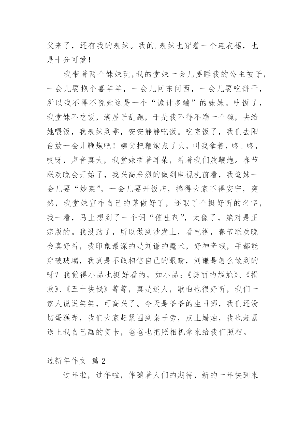 过新年作文 【必备】过新年作文三篇在平时的学习、工作或生活中,大家总免不了要接触或使用作文吧,通过作文可以把我们那些零零散散的思想,聚集在一块。那么,怎么去写作文呢?以下是小编精心整理的过新年作文3篇,欢迎阅读与收藏。过新年作文篇1今年过年,我家可热闹了,我的叔叔、婶婶、爷爷、奶奶、爸爸、妈妈都来了,最特别的是,住在武汉的外婆他们,也回来过年了!我可是比往年开心多了,武汉来的小姨、姨父、外婆也是异常的开心,最让我兴奋得是,我那3岁的堂妹和我1岁多的表妹也来了!家里真是热闹非凡。叮咚,叮咚,哦,原来是爷爷奶奶来了,今天也是爷爷的生日,所以偷偷的画了一张生日贺卡,还订了一个大蛋糕。不过第一件事,当然是要奶奶给一个大红包啦!奶奶就给了两个红包,然后说大红包明天爷爷给。叮咚,叮咚,谁来了?哦,原来是婶婶和叔叔,还有我的堂妹来了,我堂妹身穿一条红色连衣裙,扎着一个蝴蝶结,可好看了!哎呀,怎么又是爷爷抱着进来的,我堂妹的腿好像退化了,在家里都要抱。叮咚,叮咚,又是谁来了?哦,原来是外婆、小姨和姨父来了,还有我的表妹。我的.表妹也穿着一个连衣裙,也是十分可爱!我带着两个妹妹玩,我的堂妹一会儿要睡我的公主被子,一会儿要抱个喜羊羊,一会儿问东问西,一会儿要吃饼干,所以我不得不说她这是一个“诡计多端”的妹妹。吃饭了,我堂妹不吃饭,满屋子乱跑,于是我不得不端一个碗,去给她喂饭,我表妹到乖,安安静静吃饭。吃完饭了,我们去阳台放一会儿鞭炮吧!姨父把鞭炮点了火,叫我拿着,咚、咚,哎呀,声音真大,我堂妹捂着耳朵,看着我们放鞭炮。春节联欢晚会开始了,我兴高采烈的做到电视机前看,我堂妹一会儿要“炒菜”,一会儿要开饭店,搞得大家不得安宁,突然,我堂妹宣布自己的菜做好了,还取了个挺好听的名字,我一看,马上想到了一个词“催吐剂”,太像了,绝对是正宗版的。我没劲了,所以做到沙发上,看电视,春节联欢晚会真好看,我印象最深的是刘谦的魔术,好神奇哦,手都能穿破玻璃,我真是不敢相信自己的眼睛,刘谦是怎么做到的呀?我觉得小品也挺好看的,如小品:《美丽的尴尬》、《捐款》、《五十块钱》等等,真是迷人,歌曲也很好听,我们一家人说说笑笑,可高兴了。今天是爷爷的生日哪,我们还没切蛋糕呢,我们大家赶紧围到桌子旁,点上蜡烛,我也赶紧送上我自己画的贺卡,爸爸也把照相机拿来给我们照相。过新年作文篇2过年啦,过年啦,伴随着人们的期待,新的一年快到来了。大街上,人来人往。小巷里,热闹非凡。人们有的在挑选春联,有的在买年夜饭的食材,人们忙着采购年货,精挑细选着每一样东西;都忙得不亦乐乎,处处都是一派美好的.景象。除夕的那一天,我们家一大早就挂上了红彤彤的灯笼,贴上了吉祥的春联。我们家的春联是:鲲鹏遨玉宇,骐骥跃神洲,马到功成。希望我们全家在马年都能顺顺利利,都有所成。然后和家人一起吃年夜饭,大家共同举杯,相互祝福,我们还一起看精彩的春节联欢晚会,守岁到十二点钟。辞旧迎新的那一刻,真热闹啊!五彩缤纷的烟花一朵接一朵在天空中绽放,绚丽多彩,美丽极了;阵阵鞭炮声震耳欲聋,一阵高过一阵。小朋友们在吹呼,大人们在放鞭炮,大家在相互祝福。我也许下了我的新年愿望,祝大家天天快乐,生活幸福美满,工作顺利,学习进步,一马当先,天马行空,神马浮云,龙马精神,马上进步,马上成功。过新年作文篇3一、苦乐参半迎新年说起家乡的过年,已经成为一种不远的记忆。记忆中的年味,应该是我的童年和少年,回忆起来,甜美而充满向往。罗甸县边阳镇联兴村,生我养我的苦乐家园。那里,远离现代文明的喧嚣,有的,只是大山的葱茏和溪流的潺潺,宁静而悠远。儿时的记忆里,过年时充满了母亲的话音和身影。每逢过年,最怕的是帮母亲推吊粑。进入腊月,母亲就会将糯包谷准备好,将糯包谷簸净谷灰和残粒。然后,就是将糯包谷在大磨上推成大颗米,然后放在桶里泡一天,第二天一大早,最怕人的活路就开始了。迎接新年,其实是最累的。要做很多年前的准备工作,首先是用小石磨推吊粑,一般是从早上就开始推,一直要推到太阳落山才推完。姐姐在镇上读初中,腊月里的准备工作几乎都是我和母亲两人一起来完成,我在读初中和小学的时候,这项工作几乎都是我和母亲来做。放假了,我的任务就是放牛和要柴。我们所说的要柴,就是到山坡上或树林里去砍柴。砍柴不是那么简单的事,而是要爬到或中树,或是大树上去,将树的丫枝全部剔下来。然后,再将树叶和细枝剔掉,然后码整齐,用藤条或者是茅草捆好,扛回家。大概从小学三年级起,我每年寒假过年之前,一般都要从外面山上砍二十多捆柴回家,以备来年做饭煮猪潲之用。新年来临,对农民人家来说,并不意味着轻松,而是活路更加的频繁和集中。今天这家盖屋瓦,明天那家解木(锯木头),外天他家又要办酒席,总之,感觉,整个腊月里都在忙着帮别家或给自家干活。但是,最让我们喜欢的和盼望的,就是杀年猪。农村人家,一年