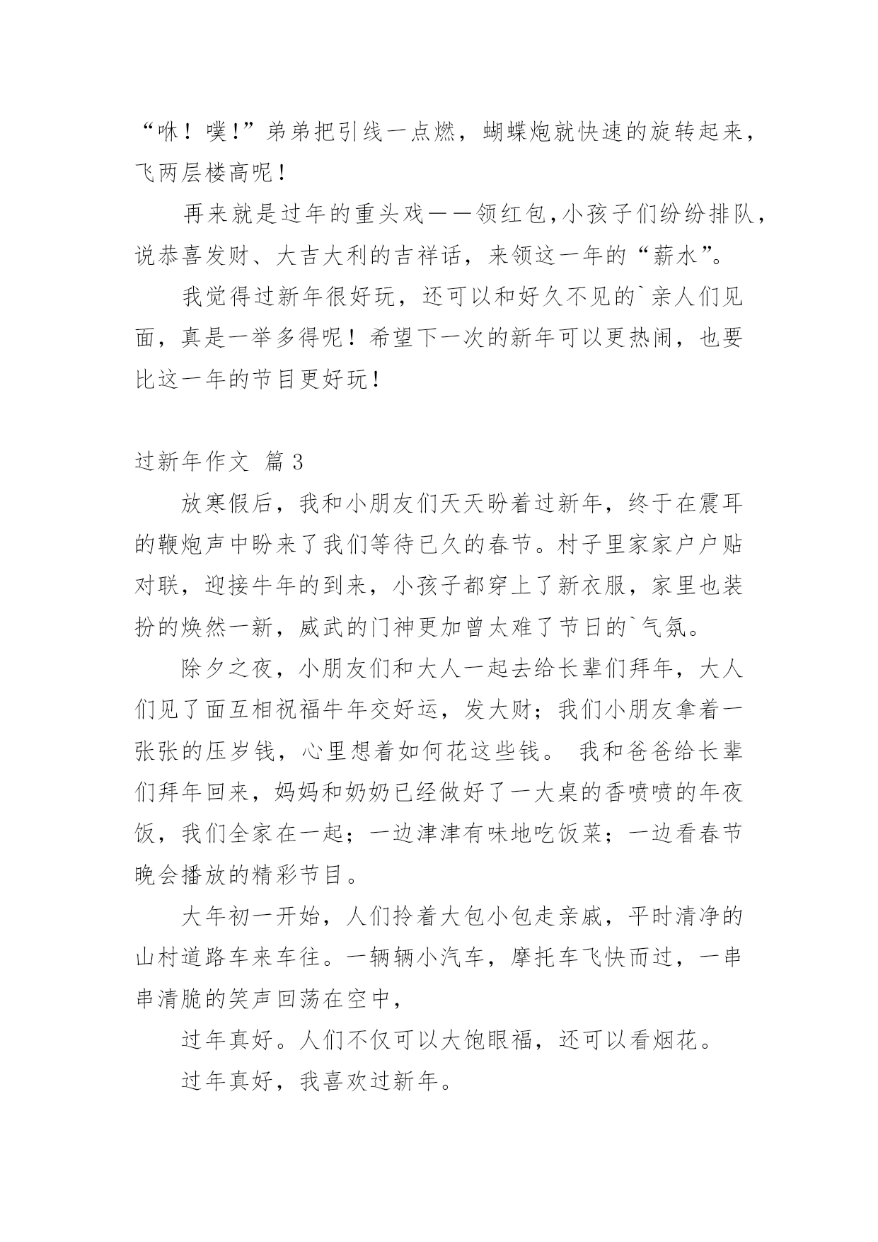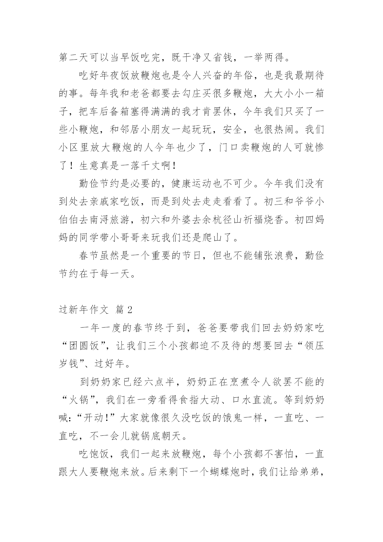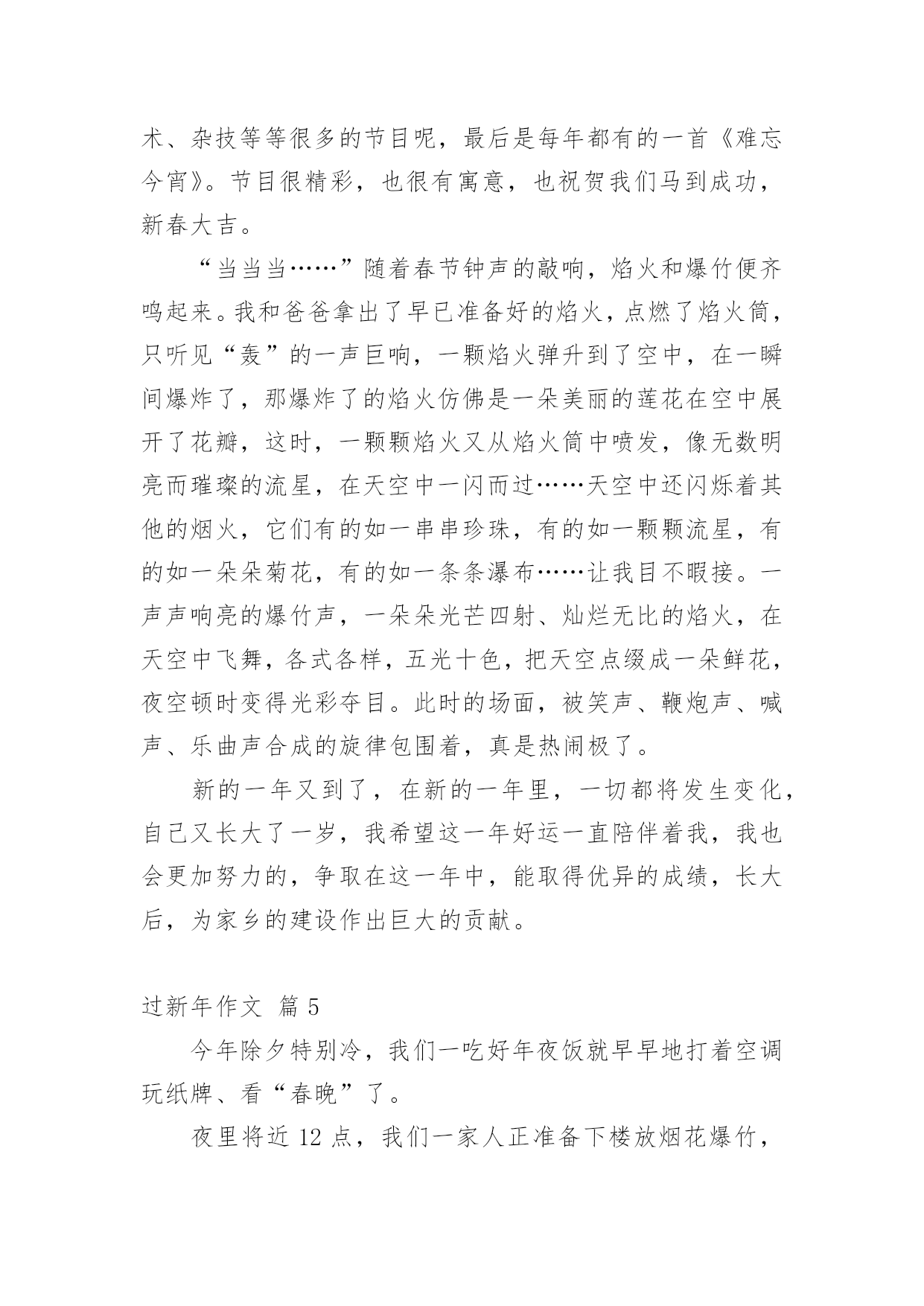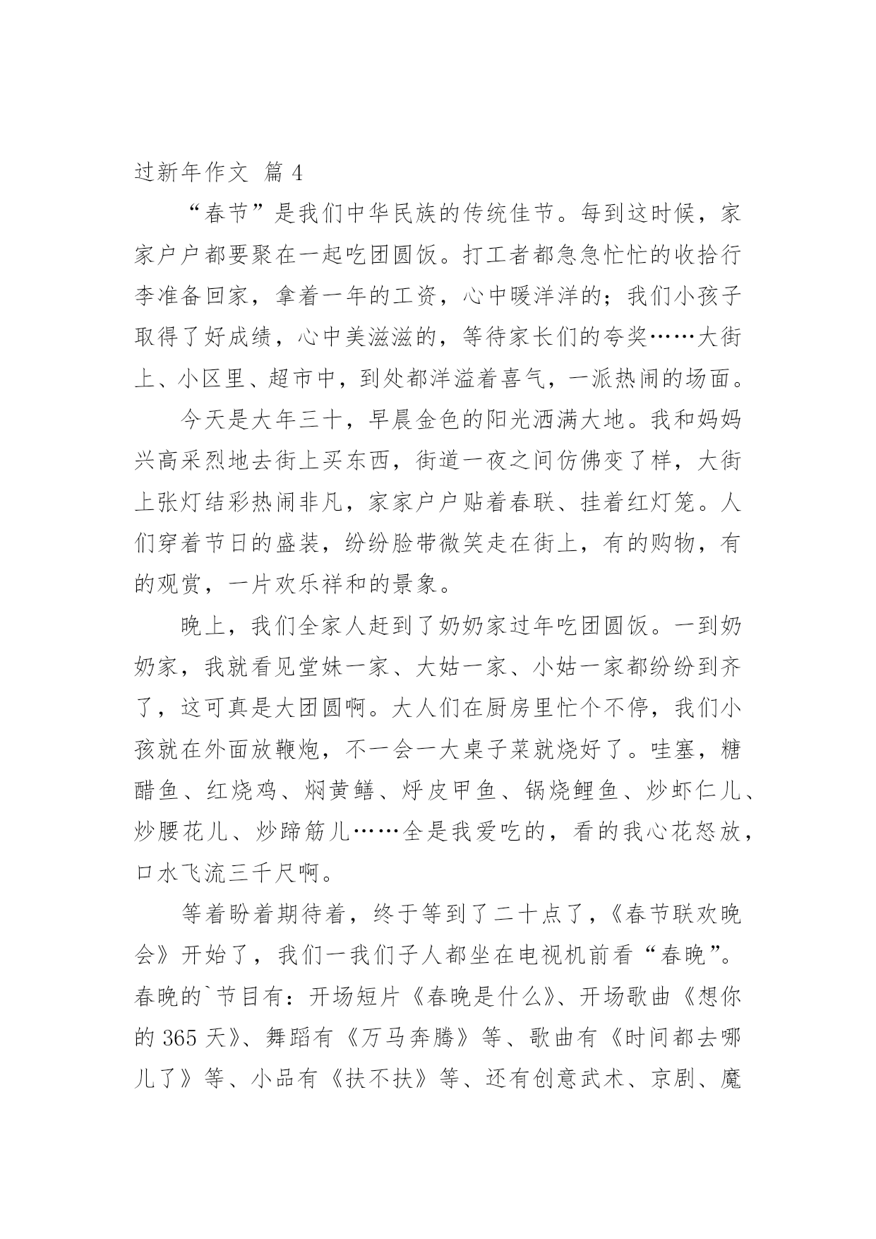 过新年作文 过新年作文(精选)在平日的学习、工作和生活里,许多人都写过作文吧,作文一定要做到主题集中,围绕同一主题作深入阐述,切忌东拉西扯,主题涣散甚至无主题。为了让您在写作文时更加简单方便,以下是小编帮大家整理的过新年作文10篇,希望能够帮助到大家。过新年作文篇1新年来了!盼望已久的新年终于来了!可是啊,今年却没有去年那么热闹。你猜为啥?嘿,原来今年提倡勤俭节约过新年。最著名的“改革”行动当然要数“光盘行动”了。听说,要是去饭店吃饭,把点的菜都吃光,就可以获得一张光盘作为奖励送给你。我觉得,光盘行动的确值得提倡,杜绝一切浪费,不要让农民伯伯辛辛苦苦种出来的'血汗收成得而复失。我们家今年过年也紧跟形势。除夕日,爷爷、小伯伯来我们家过年。往年,爸妈一早起来要买很多菜,又是鸡鸭又是鱼肉,浪费也很多。今年,我们买了鸡、甲鱼等,菜虽然不太多,但是吃得很开心,浪费也少了。不像去年,吃好一桌子高蛋白的年夜饭后厨房里吃剩的饭菜还堆得像一座小山,好几天都吃不完,最后只好都倒掉。今年吃剩下的菜,第二天可以当早饭吃完,既干净又省钱,一举两得。吃好年夜饭放鞭炮也是令人兴奋的年俗,也是我最期待的事。每年我和老爸都要去勾庄买很多鞭炮,大大小小一箱子,把车后备箱塞得满满的我才肯罢休,今年我们只买了一些小鞭炮,和邻居小朋友一起玩玩,安全,也很热闹。我们小区里放大鞭炮的人今年也少了,门口卖鞭炮的人可就惨了!生意真是一落千丈啊!勤俭节约是必要的,健康运动也不可少。今年我们没有到处去亲戚家吃饭,而是到处去走走看看了。初三和爷爷小伯伯去南浔旅游,初六和外婆去余杭径山祈福烧香。初四妈妈的同学带小哥哥来玩我们还是爬山了。春节虽然是一个重要的节日,但也不能铺张浪费,勤俭节约在于每一天。过新年作文篇2一年一度的春节终于到,爸爸要带我们回去奶奶家吃“团圆饭”,让我们三个小孩都迫不及待的想要回去“领压岁钱”、过好年。到奶奶家已经六点半,奶奶正在烹煮令人欲罢不能的“火锅”,我们在一旁看得食指大动、口水直流。等到奶奶喊:“开动!”大家就像很久没吃饭的饿鬼一样,一直吃、一直吃,不一会儿就锅底朝天。吃饱饭,我们一起来放鞭炮,每个小孩都不害怕,一直跟大人要鞭炮来放。后来剩下一个蝴蝶炮时,我们让给弟弟,“咻!噗!”弟弟把引线一点燃,蝴蝶炮就快速的旋转起来,飞两层楼高呢!再来就是过年的重头戏--领红包,小孩子们纷纷排队,说恭喜发财、大吉大利的吉祥话,来领这一年的“薪水”。我觉得过新年很好玩,还可以和好久不见的`亲人们见面,真是一举多得呢!希望下一次的新年可以更热闹,也要比这一年的节目更好玩!过新年作文篇3放寒假后,我和小朋友们天天盼着过新年,终于在震耳的鞭炮声中盼来了我们等待已久的春节。村子里家家户户贴对联,迎接牛年的到来,小孩子都穿上了新衣服,家里也装扮的焕然一新,威武的门神更加曾太难了节日的`气氛。除夕之夜,小朋友们和大人一起去给长辈们拜年,大人们见了面互相祝福牛年交好运,发大财;我们小朋友拿着一张张的压岁钱,心里想着如何花这些钱。我和爸爸给长辈们拜年回来,妈妈和奶奶已经做好了一大桌的香喷喷的年夜饭,我们全家在一起;一边津津有味地吃饭菜;一边看春节晚会播放的精彩节目。大年初一开始,人们拎着大包小包走亲戚,平时清净的山村道路车来车往。一辆辆小汽车,摩托车飞快而过,一串串清脆的笑声回荡在空中,过年真好。人们不仅可以大饱眼福,还可以看烟花。过年真好,我喜欢过新年。过新年作文篇4“春节”是我们中华民族的传统佳节。每到这时候,家家户户都要聚在一起吃团圆饭。打工者都急急忙忙的收拾行李准备回家,拿着一年的工资,心中暖洋洋的;我们小孩子取得了好成绩,心中美滋滋的,等待家长们的夸奖……大街上、小区里、超市中,到处都洋溢着喜气,一派热闹的场面。今天是大年三十,早晨金色的阳光洒满大地。我和妈妈兴高采烈地去街上买东西,街道一夜之间仿佛变了样,大街上张灯结彩热闹非凡,家家户户贴着春联、挂着红灯笼。人们穿着节日的盛装,纷纷脸带微笑走在街上,有的购物,有的观赏,一片欢乐祥和的景象。晚上,我们全家人赶到了奶奶家过年吃团圆饭。一到奶奶家,我就看见堂妹一家、大姑一家、小姑一家都纷纷到齐了,这可真是大团圆啊。大人们在厨房里忙个不停,我们小孩就在外面放鞭炮,不一会一大桌子菜就烧好了。哇塞,糖醋鱼、红烧鸡、焖黄鳝、烀皮甲鱼、锅烧鲤鱼、炒虾仁儿、炒腰花儿、炒蹄筋儿……全是我爱吃的,看的我心花怒放,口水飞流三千尺啊。等着盼着期待着,终于等到了二十点了,《春节联欢晚会》开始了,我们一我们子人都坐在电视机前看“春晚”。春晚的`节目有:开场短片《春晚是什么》、开场歌曲《想你的365天》、舞蹈有《万马奔腾》等、歌曲有《时间都去哪儿了》等、小品有《扶不扶》等、还有创意武术、京剧、魔术、杂技等等很多的节目呢,最后是每年都有的一首《难忘今宵》