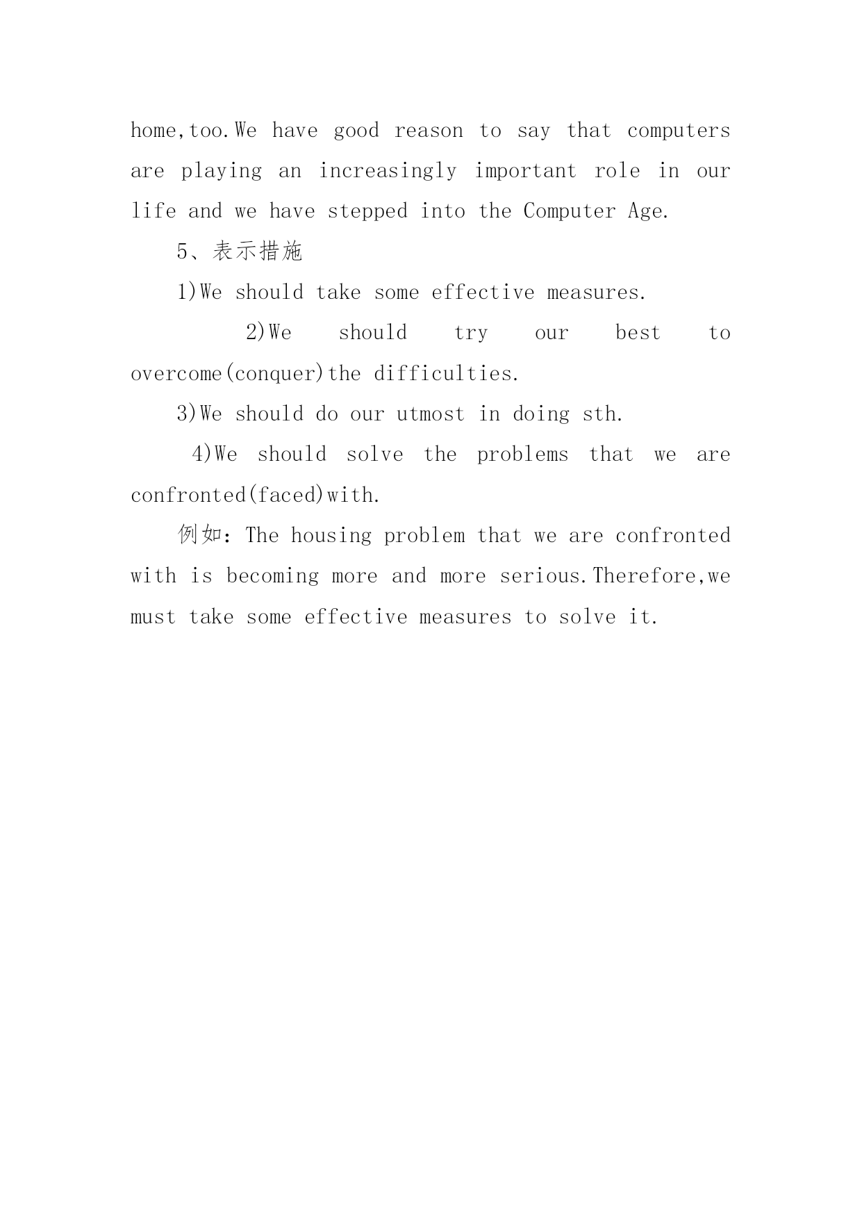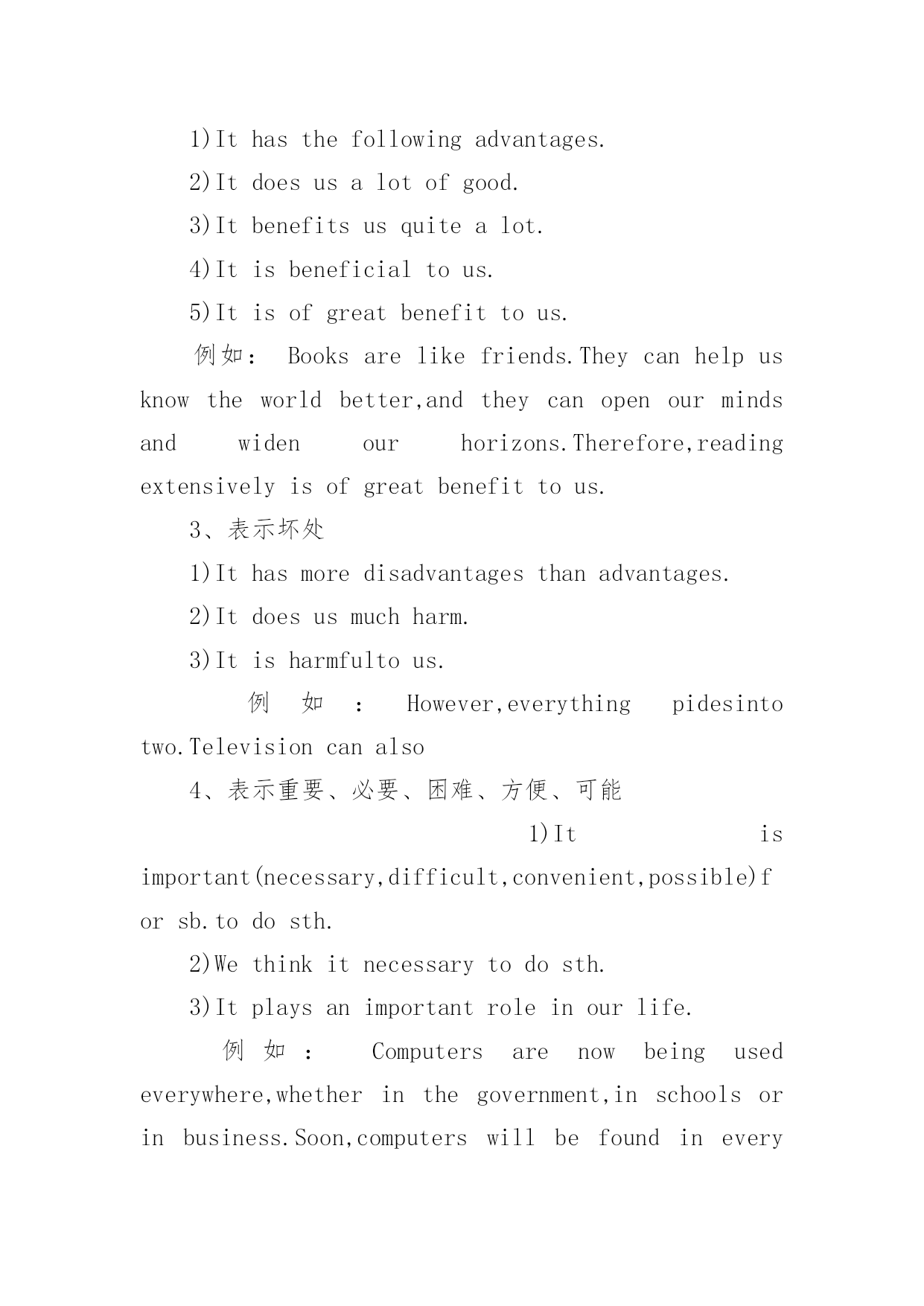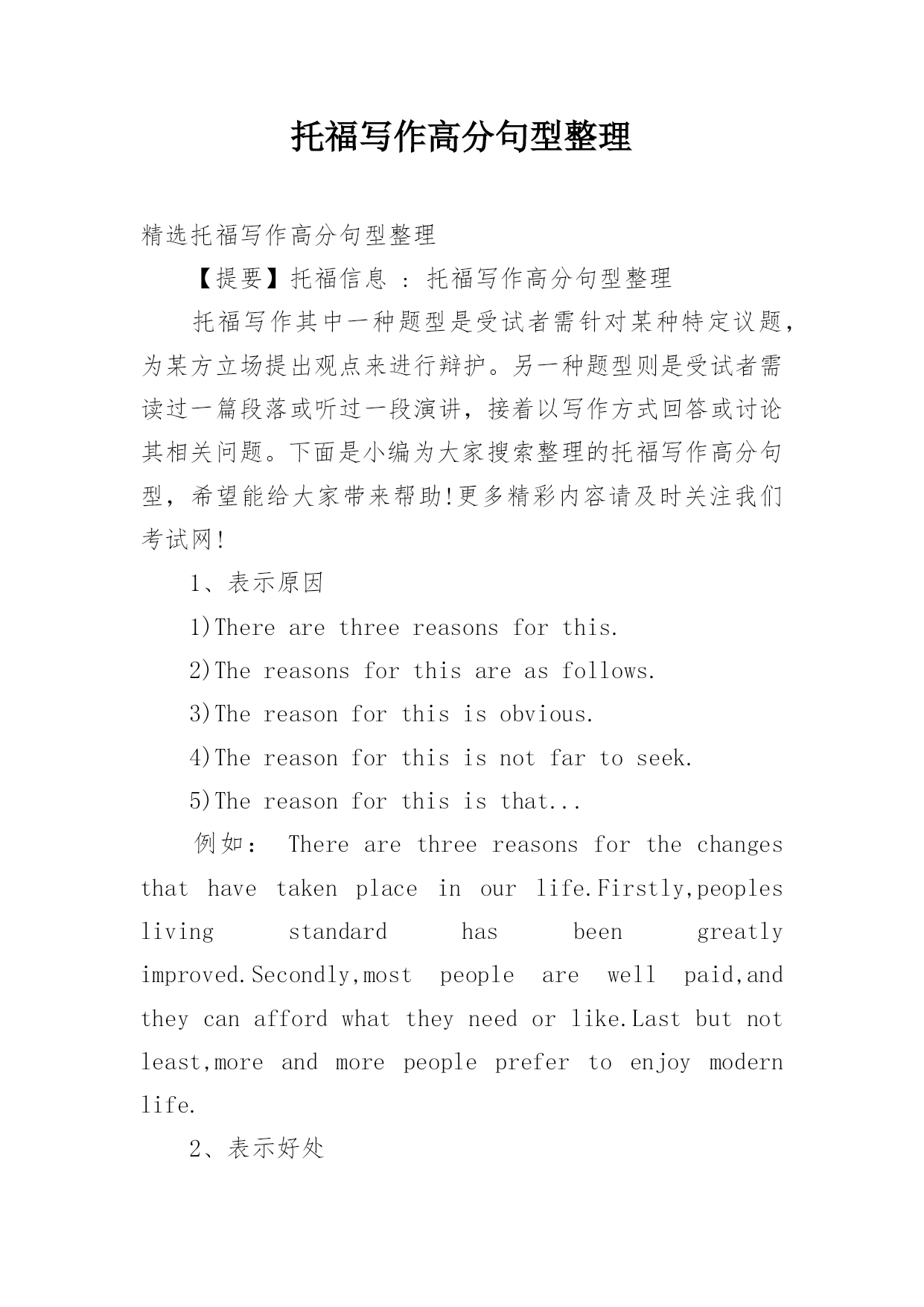 托福写作高分句型整理 精选托福写作高分句型整理【提要】托福信息:托福写作高分句型整理托福写作其中一种题型是受试者需针对某种特定议题,为某方立场提出观点来进行辩护。另一种题型则是受试者需读过一篇段落或听过一段演讲,接着以写作方式回答或讨论其相关问题。下面是小编为大家搜索整理的托福写作高分句型,希望能给大家带来帮助!更多精彩内容请及时关注我们考试网!1、表示原因1)Therearethreereasonsforthis.2)Thereasonsforthisareasfollows.3)Thereasonforthisisobvious.4)Thereasonforthisisnotfartoseek.5)Thereasonforthisisthat...例如:Therearethreereasonsforthechangesthathavetakenplaceinourlife.Firstly,peopleslivingstandardhasbeengreatlyimproved.Secondly,mostpeoplearewellpaid,andtheycanaffordwhattheyneedorlike.Lastbutnotleast,moreandmorepeopleprefertoenjoymodernlife.2、表示好处1)Ithasthefollowingadvantages.2)Itdoesusalotofgood.3)Itbenefitsusquitealot.4)Itisbeneficialtous.5)Itisofgreatbenefittous.例如:Booksarelikefriends.Theycanhelpusknowtheworldbetter,andtheycanopenourmindsandwidenourhorizons.Therefore,readingextensivelyisofgreatbenefittous.3、表示坏处1)Ithasmoredisadvantagesthanadvantages.2)Itdoesusmuchharm.3)Itisharmfultous.例如:However,everythingpidesintotwo.Televisioncanalso4、表示重要、必要、困难、方便、可能1)Itisimportant(necessary,difficult,convenient,possible)forsb.todosth.2)Wethinkitnecessarytodosth.3)Itplaysanimportantroleinourlife.例如:Computersarenowbeingusedeverywhere,whetherinthegovernment,inschoolsorinbusiness.Soon,computerswillbefoundineveryhome,too.WehavegoodreasontosaythatcomputersareplayinganincreasinglyimportantroleinourlifeandwehavesteppedintotheComputerAge.5、表示措施1)Weshouldtakesomeeffectivemeasures.2)Weshouldtryourbesttoovercome(conquer)thedifficulties.3)Weshoulddoourutmostindoingsth.4)Weshouldsolvetheproblemsthatweareconfronted(faced)with.例如:Thehousingproblemthatweareconfrontedwithisbecomingmoreandmoreserious.Therefore,wemusttakesomeeffectivemeasurestosolveit.