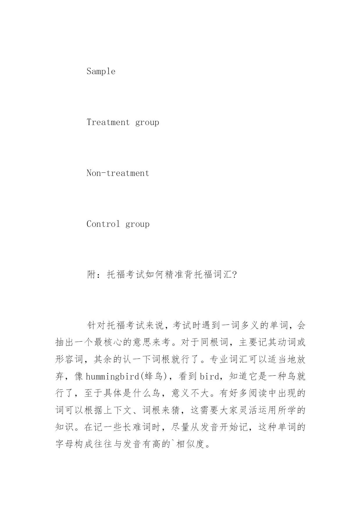 托福听力词汇之科研 托福听力词汇之科研 对于托福考生来说,想要把托福词汇完全背诵下来是一件难度很大的事情。考生可以想方设法背词汇。下面,小编根据分类法,为大家整理了一些托福听力词汇,希望对大家有帮助。 Hypothesis Alternativehypothesis择一假说 Nullhypothesis无效假说,零假说 Collectdata Survey,questionnaire Experiment Interfere,influence Observation Analyzedata Interpretdata Analysis Analytical Subject Sample Treatmentgroup Non-treatment Controlgroup 附:托福考试如何精准背托福词汇? 针对托福考试来说,考试时遇到一词多义的单词,会抽出一个最核心的意思来考。对于同根词,主要记其动词或形容词,其余的认一下词根就行了。专业词汇可以适当地放弃,像hummingbird(蜂鸟),看到bird,知道它是一种鸟就行了,至于具体是什么鸟,意义不大。有好多阅读中出现的词可以根据上下文、词根来猜,这需要大家灵活运用所学的知识。在记一些长难词时,尽量从发音开始记,这种单词的字母构成往往与发音有高的`相似度。 要想真正提高英语水平,阅读原版小说是每一个高手的必经之路。在阅读原版书之前,我们都应该查找百科全书或相应的工具书,了解到作者的生平、作品以及世人的评价。在阅读过程中碰到生词先做标记,读完后再查词典。把生词记载在本子上,以便及时背诵。每读完一章写一篇读后感,相当于开卷考试,来锻炼自己的写作能力。