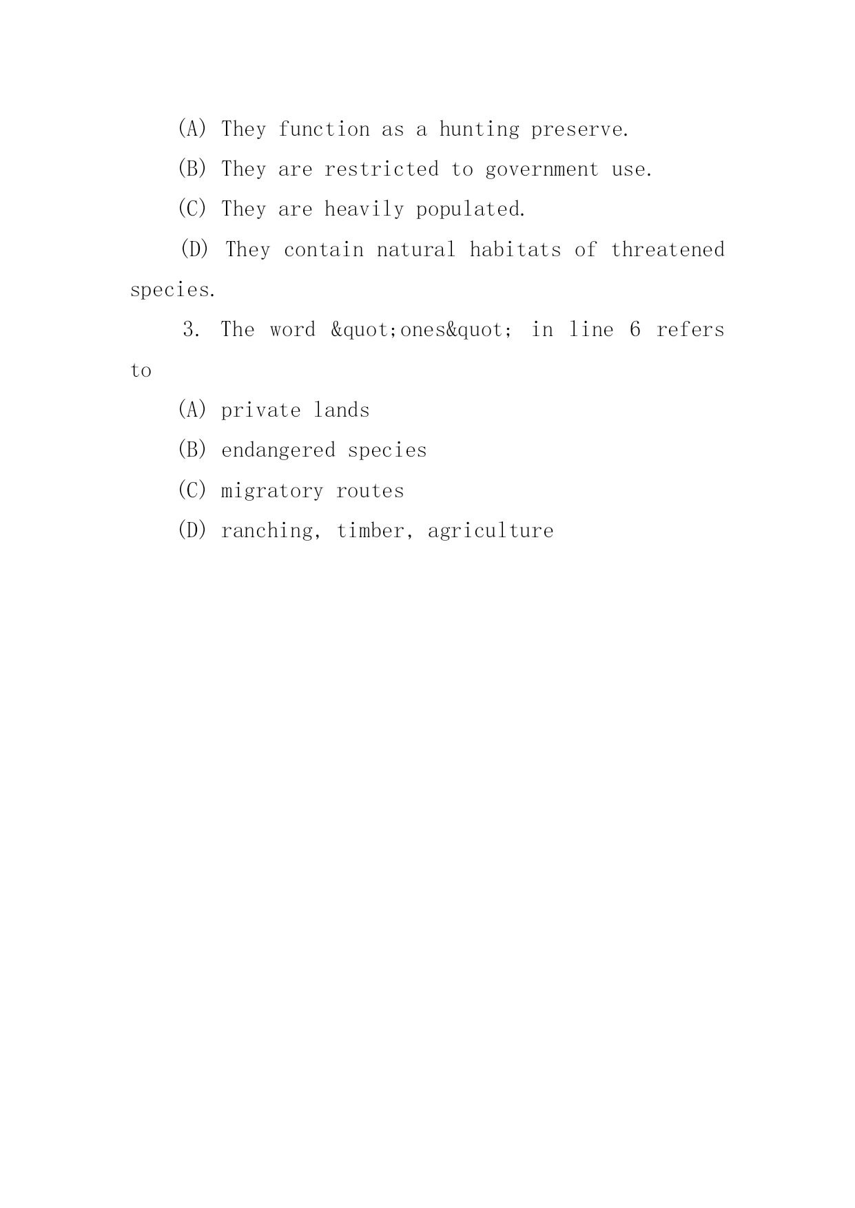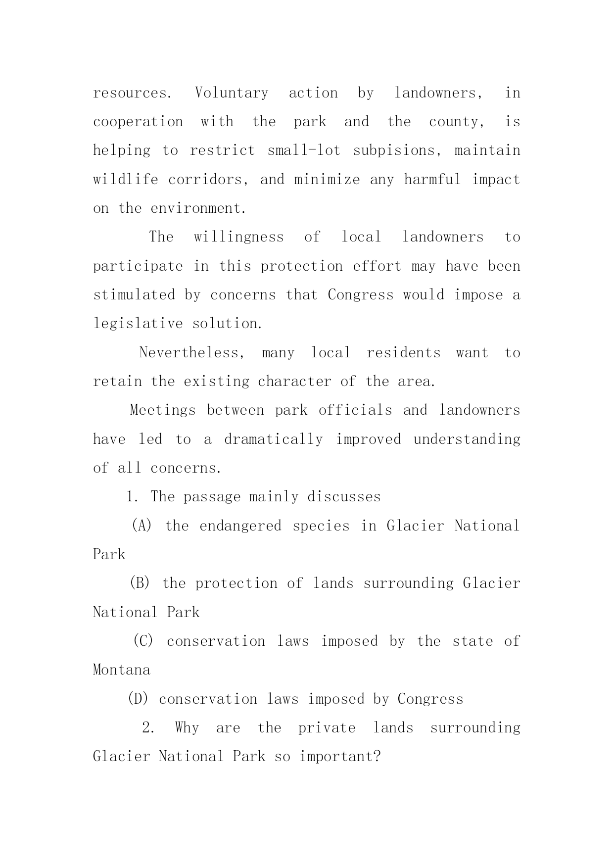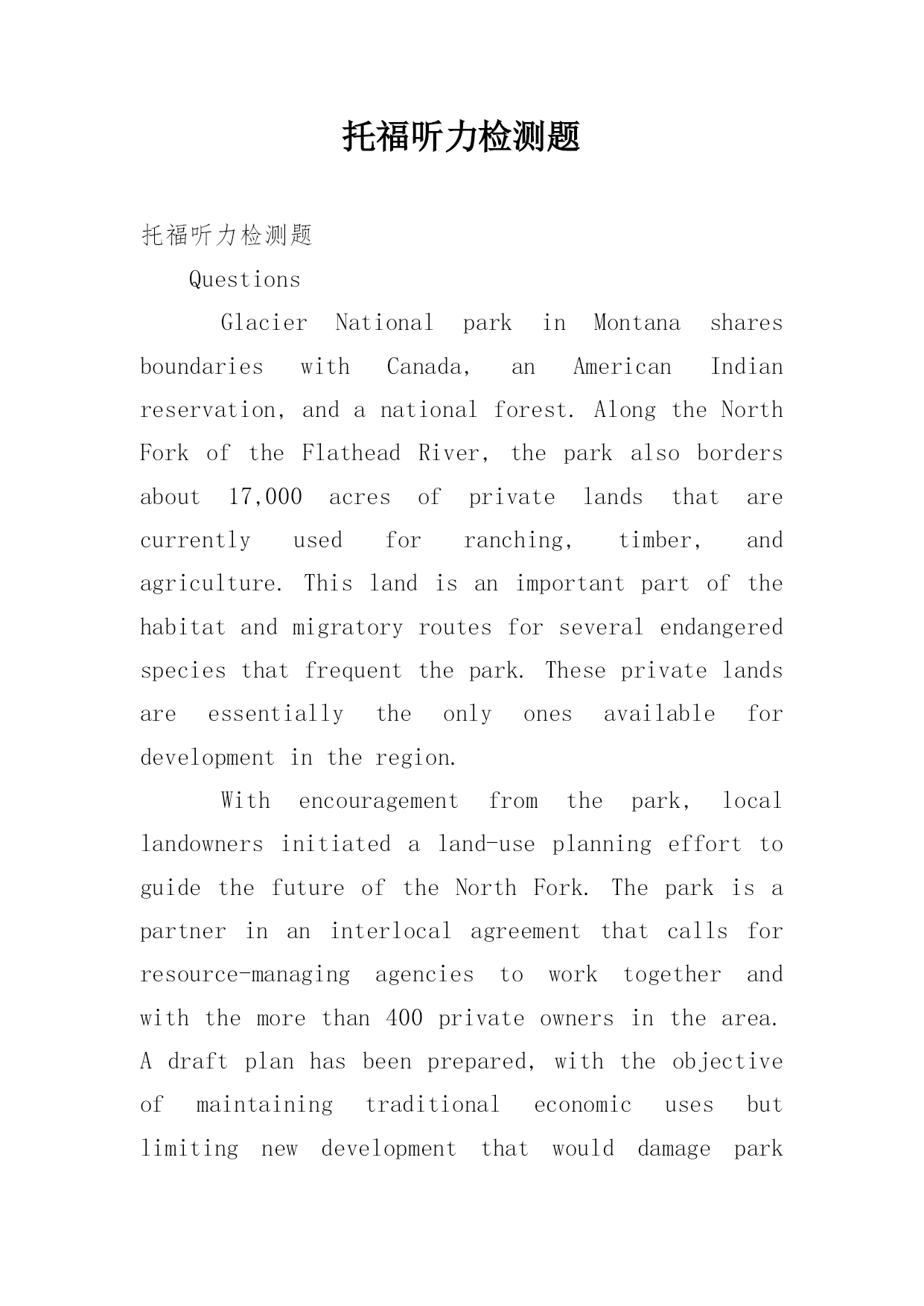 托福听力检测题 托福听力检测题QuestionsGlacierNationalparkinMontanasharesboundarieswithCanada,anAmericanIndianreservation,andanationalforest.AlongtheNorthForkoftheFlatheadRiver,theparkalsobordersabout17,000acresofprivatelandsthatarecurrentlyusedforranching,timber,andagriculture.Thislandisanimportantpartofthehabitatandmigratoryroutesforseveralendangeredspeciesthatfrequentthepark.Theseprivatelandsareessentiallytheonlyonesavailablefordevelopmentintheregion.Withencouragementfromthepark,locallandownersinitiatedaland-useplanningefforttoguidethefutureoftheNorthFork.Theparkisapartnerinaninterlocalagreementthatcallsforresource-managingagenciestoworktogetherandwiththemorethan400privateownersinthearea.Adraftplanhasbeenprepared,withtheobjectiveofmaintainingtraditionaleconomicusesbutlimitingnewdevelopmentthatwoulddamageparkresources.Voluntaryactionbylandowners,incooperationwiththeparkandthecounty,ishelpingtorestrictsmall-lotsubpisions,maintainwildlifecorridors,andminimizeanyharmfulimpactontheenvironment.ThewillingnessoflocallandownerstoparticipateinthisprotectioneffortmayhavebeenstimulatedbyconcernsthatCongresswouldimposealegislativesolution.Nevertheless,manylocalresidentswanttoretaintheexistingcharacterofthearea.Meetingsbetweenparkofficialsandlandownershaveledtoadramaticallyimprovedunderstandingofallconcerns.1.Thepassagemainlydiscusses(A)theendangeredspeciesinGlacierNationalPark(B)theprotectionoflandssurroundingGlacierNationalPark(C)conservationlawsimposedbythestateofMontana(D)conservationlawsimposedbyCongress2.WhyaretheprivatelandssurroundingGlacierNationalParksoimportant?(A)Theyfunctionasahuntingpreserve.(B)Theyarerestrictedtogovernmentuse.(C)Theyareheavilypopulated.(D)Theycontainnaturalhabitatsofthreatenedspecies.3.Theword"ones"inline6refersto(A)privatelands(B)endangeredspecies(C)migratoryroutes(D)ranching,timber,agriculture