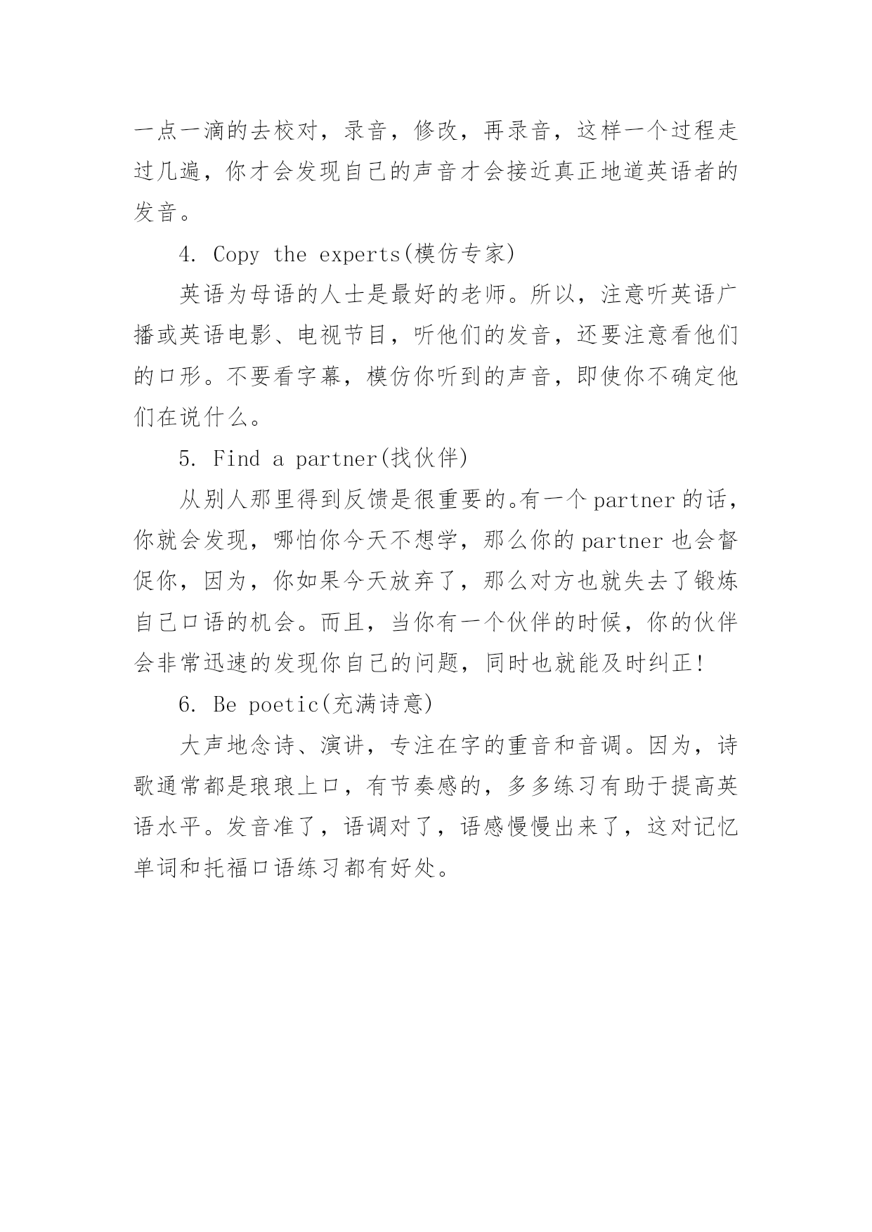 托福口语考试的练习方法 托福口语考试的练习方法1.Practice(练习)在托福口语练习中,发音有问题是难免的,因此很多人会害怕说错而不开口。没关系,多练习就好了,不要害羞。本来,郁闷应该是一个过程,应该是你前进过程中一个必须经历的过程。但是很多情况下,由于你不动手去解决,因此,他就变成了一个结果。托福口语练习,跟口才是有相同性的。您想要一个好的口才,那么就要通过不断的练习来实现。但是,人一旦过了15岁,就特别害怕失败。人一旦过了25岁,就大多不接受新知识。这都是阻碍你提升自己口语的拦路虎。渴望去丢脸!只有今天多丢脸,才有出分后的那张笑脸。2.Slowdown(慢下来)很多初学者总是希望走一步到位的路线,但是实际上,什么都是有一个循序渐进的过程。就像很多人在练绕口令的时候,也是从慢速逐渐加速的,而不是一次马上就能有很快速度的,因此,刚刚开始的时候,控制自己的语速,尽量说的标准一些!3.Listentoyourself(听自己)如果你不能听出你自己的`发音问题,就很难去改正它。其实现在很多口语材料都配备了相应的音频,你绝对应该把自己的声音录下来,然后跟相应的声音进行比较,只有这样一点一滴的去校对,录音,修改,再录音,这样一个过程走过几遍,你才会发现自己的声音才会接近真正地道英语者的发音。4.Copytheexperts(模仿专家)英语为母语的人士是最好的老师。所以,注意听英语广播或英语电影、电视节目,听他们的发音,还要注意看他们的口形。不要看字幕,模仿你听到的声音,即使你不确定他们在说什么。5.Findapartner(找伙伴)从别人那里得到反馈是很重要的。有一个partner的话,你就会发现,哪怕你今天不想学,那么你的partner也会督促你,因为,你如果今天放弃了,那么对方也就失去了锻炼自己口语的机会。而且,当你有一个伙伴的时候,你的伙伴会非常迅速的发现你自己的问题,同时也就能及时纠正!6.Bepoetic(充满诗意)大声地念诗、演讲,专注在字的重音和音调。因为,诗歌通常都是琅琅上口,有节奏感的,多多练习有助于提高英语水平。发音准了,语调对了,语感慢慢出来了,这对记忆单词和托福口语练习都有好处。