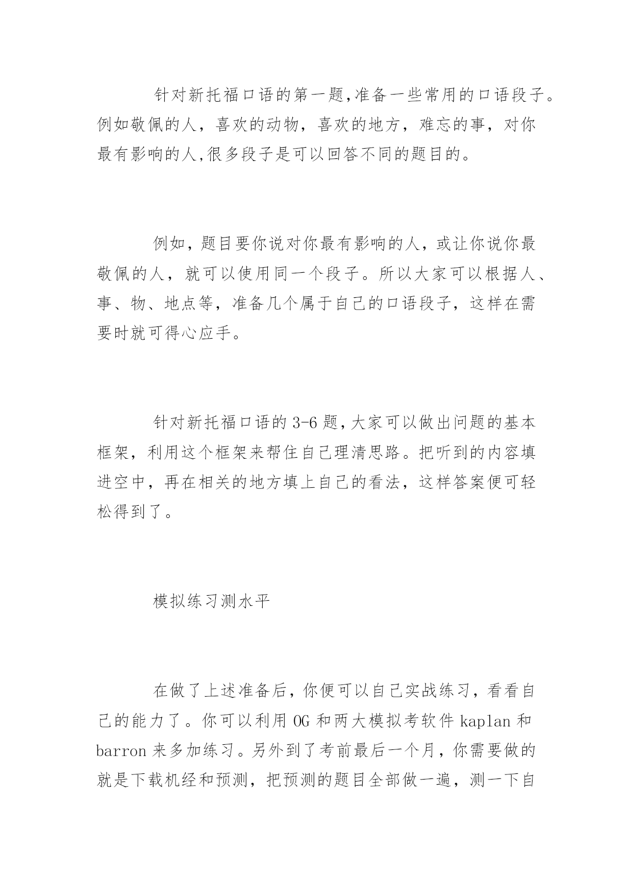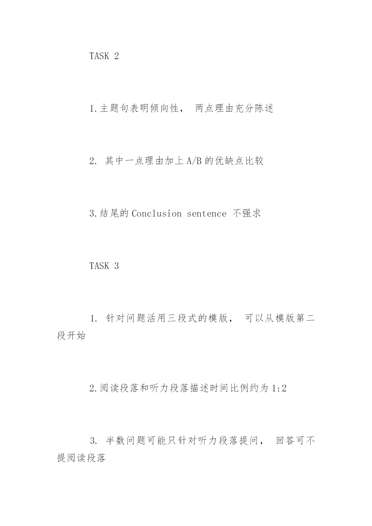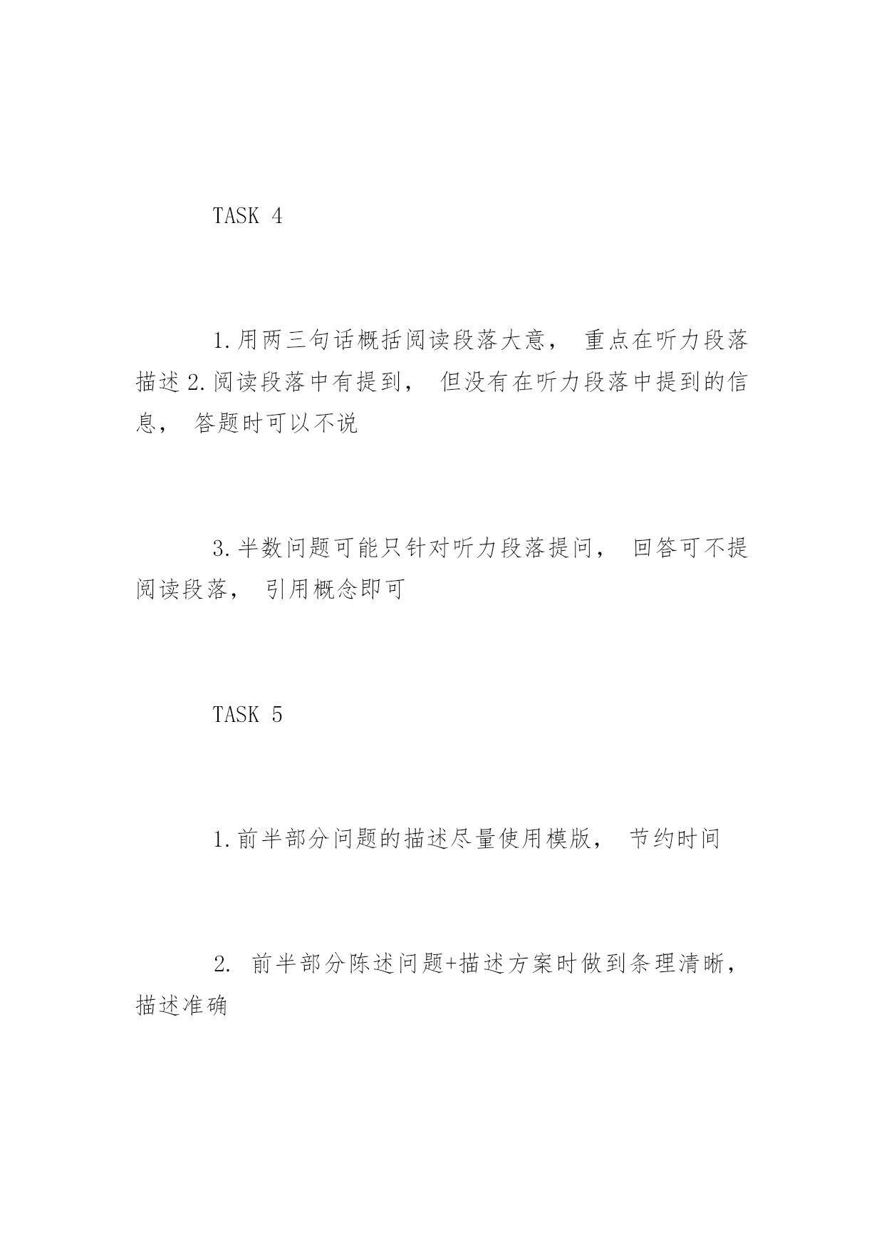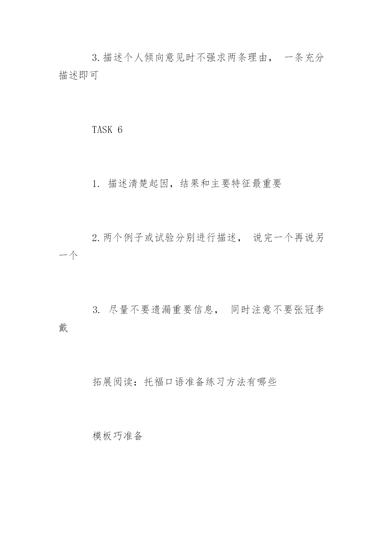 托福口语各题型注意重点 托福口语各题型注意重点 新托福考试采用真实场景,如模拟大学校园中的动态和交互式环境,试题综合考查听、说、读、写4项英语语言能力,考生可充分展示使用英语进行交流的能力。以下是yjbys网小编整理的关于托福口语各题型注意重点,供大家备考。 TASK1 1.一个主题句,三点理由,其中一点举例 2.举例越具体越好 3.题目分话题准备,每类话题准备一个45秒回答(录音) TASK2 1.主题句表明倾向性,两点理由充分陈述 2.其中一点理由加上A/B的优缺点比较 3.结尾的Conclusionsentence不强求 TASK3 1.针对问题活用三段式的模版,可以从模版第二段开始 2.阅读段落和听力段落描述时间比例约为1:2 3.半数问题可能只针对听力段落提问,回答可不提阅读段落 TASK4 1.用两三句话概括阅读段落大意,重点在听力段落描述2.阅读段落中有提到,但没有在听力段落中提到的信息,答题时可以不说 3.半数问题可能只针对听力段落提问,回答可不提阅读段落,引用概念即可 TASK5 1.前半部分问题的描述尽量使用模版,节约时间 2.前半部分陈述问题+描述方案时做到条理清晰,描述准确 3.描述个人倾向意见时不强求两条理由,一条充分描述即可 TASK6 1.描述清楚起因,结果和主要特征最重要 2.两个例子或试验分别进行描述,说完一个再说另一个 3.尽量不要遗漏重要信息,同时注意不要张冠李戴 拓展阅读:托福口语准备练习方法有哪些 模板巧准备 针对新托福口语的第一题,准备一些常用的口语段子。例如敬佩的人,喜欢的动物,喜欢的地方,难忘的事,对你最有影响的人,很多段子是可以回答不同的题目的。 例如,题目要你说对你最有影响的人,或让你说你最敬佩的人,就可以使用同一个段子。所以大家可以根据人、事、物、地点等,准备几个属于自己的口语段子,这样在需要时就可得心应手。 针对新托福口语的3-6题,大家可以做出问题的基本框架,利用这个框架来帮住自己理清思路。把听到的内容填进空中,再在相关的地方填上自己的看法,这样答案便可轻松得到了。 模拟练习测水平 在做了上述准备后,你便可以自己实战练习,看看自己的能力了。你可以利用OG和两大模拟考软件kaplan和barron来多加练习。另外到了考前最后一个月,你需要做的就是下载机经和预测,把预测的题目全部做一遍,测一下自己的新托福口语水平。 建议你把预测的.题目一个不漏的全部做完,这样不仅可以锻炼口语,增强能力,重要的不会为自己考试时遇到出现过的题目却不会做而留下遗憾。 争分夺秒来应试 口语考试需要你在听到题目的第一刻将该说的准备好,大脑迅速地做出反应,闪现灵感,等到提示音响起时,你就要开始大声响亮的说出你的答案。 它锻炼一个人的口、耳、脑的协调能力,是一个需要争分夺秒的技术活。另外在准备时你也可以在草稿纸上写下准备内容,可以看草稿回答。因此有没有充分的准备也影响着你的发挥。