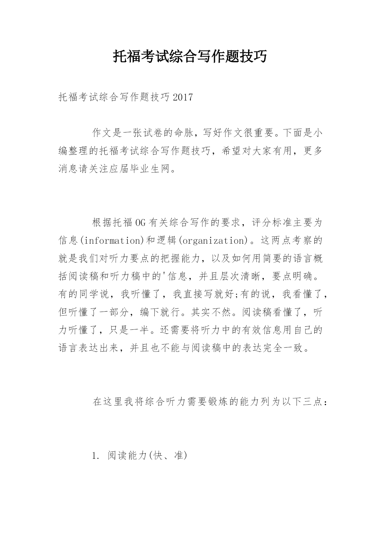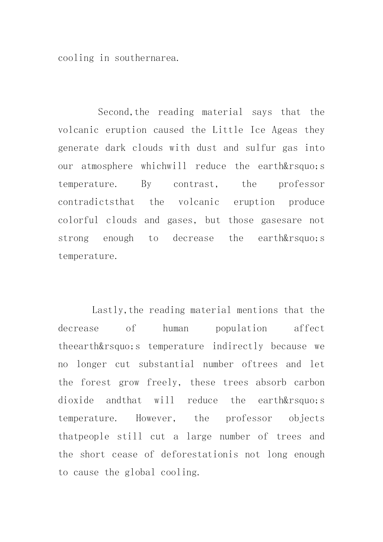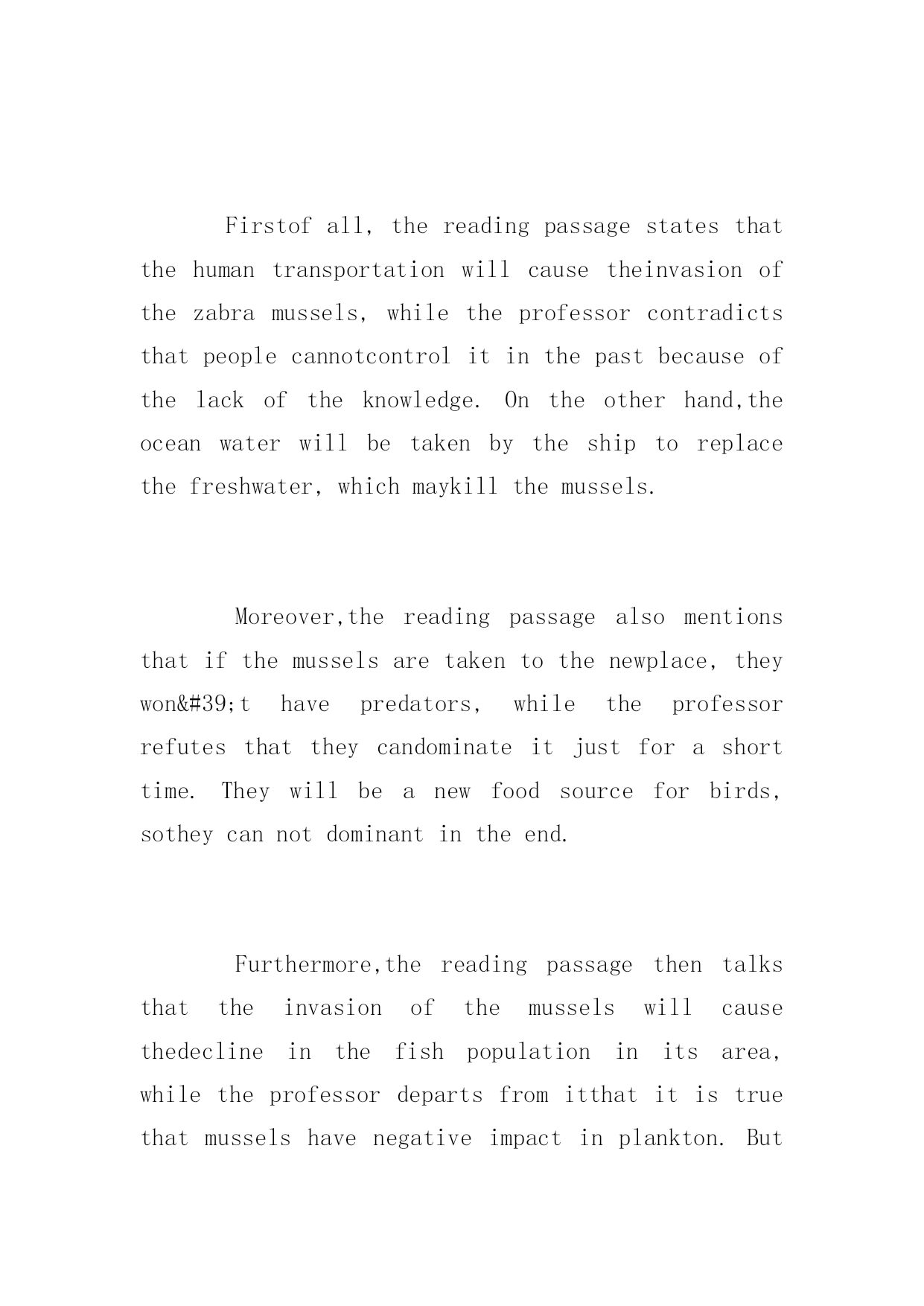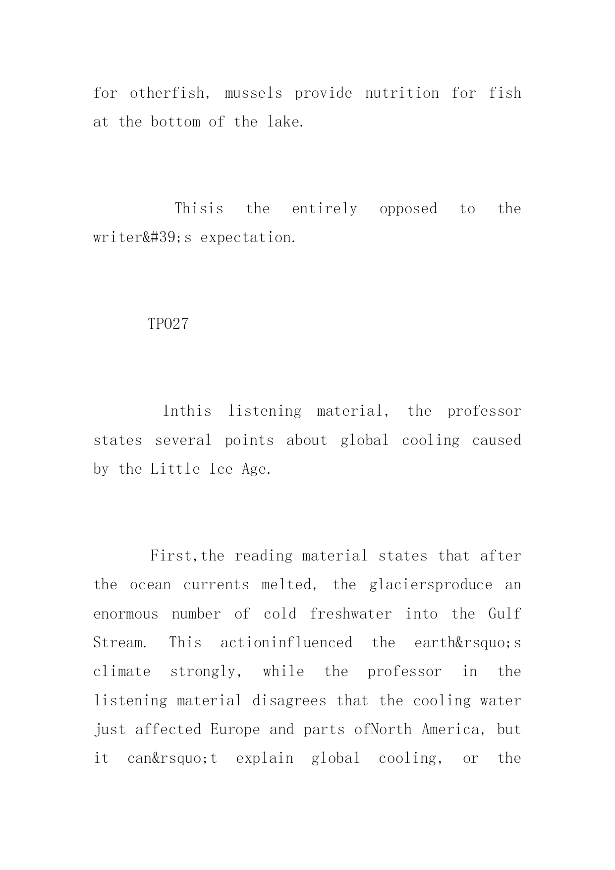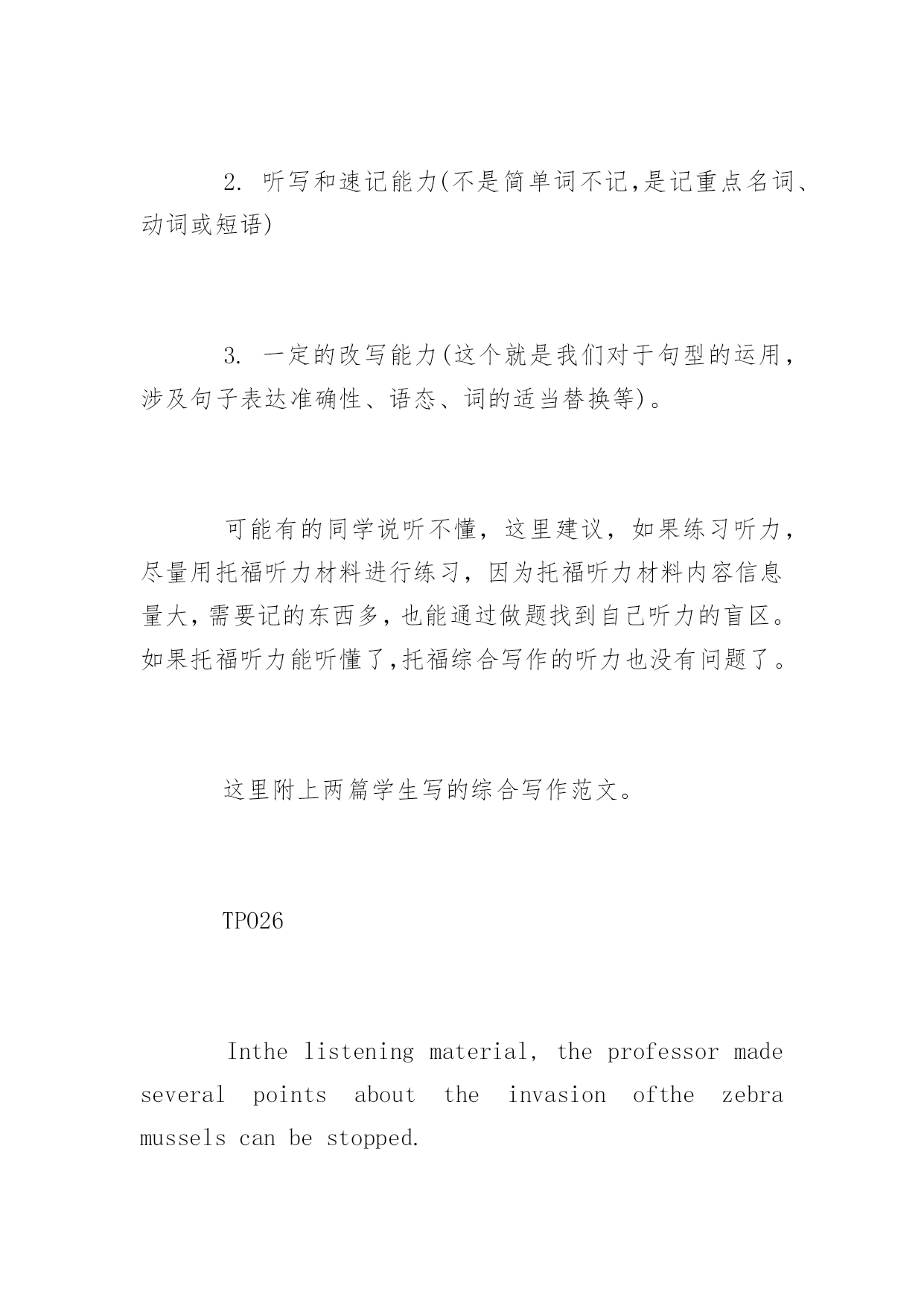 托福考试综合写作题技巧 托福考试综合写作题技巧2017 作文是一张试卷的命脉,写好作文很重要。下面是小编整理的托福考试综合写作题技巧,希望对大家有用,更多消息请关注应届毕业生网。 根据托福OG有关综合写作的要求,评分标准主要为信息(information)和逻辑(organization)。这两点考察的就是我们对听力要点的把握能力,以及如何用简要的语言概括阅读稿和听力稿中的'信息,并且层次清晰,要点明确。有的同学说,我听懂了,我直接写就好;有的说,我看懂了,但听懂了一部分,编下就行。其实不然。阅读稿看懂了,听力听懂了,只是一半。还需要将听力中的有效信息用自己的语言表达出来,并且也不能与阅读稿中的表达完全一致。 在这里我将综合听力需要锻炼的能力列为以下三点: 1.阅读能力(快、准) 2.听写和速记能力(不是简单词不记,是记重点名词、动词或短语) 3.一定的改写能力(这个就是我们对于句型的运用,涉及句子表达准确性、语态、词的适当替换等)。 可能有的同学说听不懂,这里建议,如果练习听力,尽量用托福听力材料进行练习,因为托福听力材料内容信息量大,需要记的东西多,也能通过做题找到自己听力的盲区。如果托福听力能听懂了,托福综合写作的听力也没有问题了。 这里附上两篇学生写的综合写作范文。 TPO26 Inthelisteningmaterial,theprofessormadeseveralpointsabouttheinvasionofthezebramusselscanbestopped. Firstofall,thereadingpassagestatesthatthehumantransportationwillcausetheinvasionofthezabramussels,whiletheprofessorcontradictsthatpeoplecannotcontrolitinthepastbecauseofthelackoftheknowledge.Ontheotherhand,theoceanwaterwillbetakenbytheshiptoreplacethefreshwater,whichmaykillthemussels. Moreover,thereadingpassagealsomentionsthatifthemusselsaretakentothenewplace,theywon'thavepredators,whiletheprofessorrefutesthattheycandominateitjustforashorttime.Theywillbeanewfoodsourceforbirds,sotheycannotdominantintheend. Furthermore,thereadingpassagethentalksthattheinvasionofthemusselswillcausethedeclineinthefishpopulationinitsarea,whiletheprofessordepartsfromitthatitistruethatmusselshavenegativeimpactinplankton.Butforotherfish,musselsprovidenutritionforfishatthebottomofthelake. Thisistheentirelyopposedtothewriter'sexpectation. TPO27 Inthislisteningmaterial,theprofessorstatesseveralpointsaboutglobalcoolingcausedbytheLittleIceAge. First,thereadingmaterialstatesthataftertheoceancurrentsmelted,theglaciersproduceanenormousnumberofcoldfreshwaterintotheGulfStream.Thisactioninfluencedtheearth’sclimatestrongly,whiletheprofessorinthelisteningmaterialdisagreesthatthecoolingwaterjustaffectedEuropeandpartsofNorthAmerica,butitcan’texplainglobalcooling,orthecoolinginsouthernarea. Second,thereadingmaterialsaysthatthevolcaniceruptioncause
