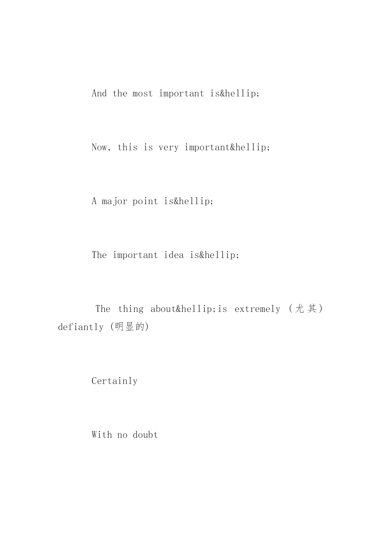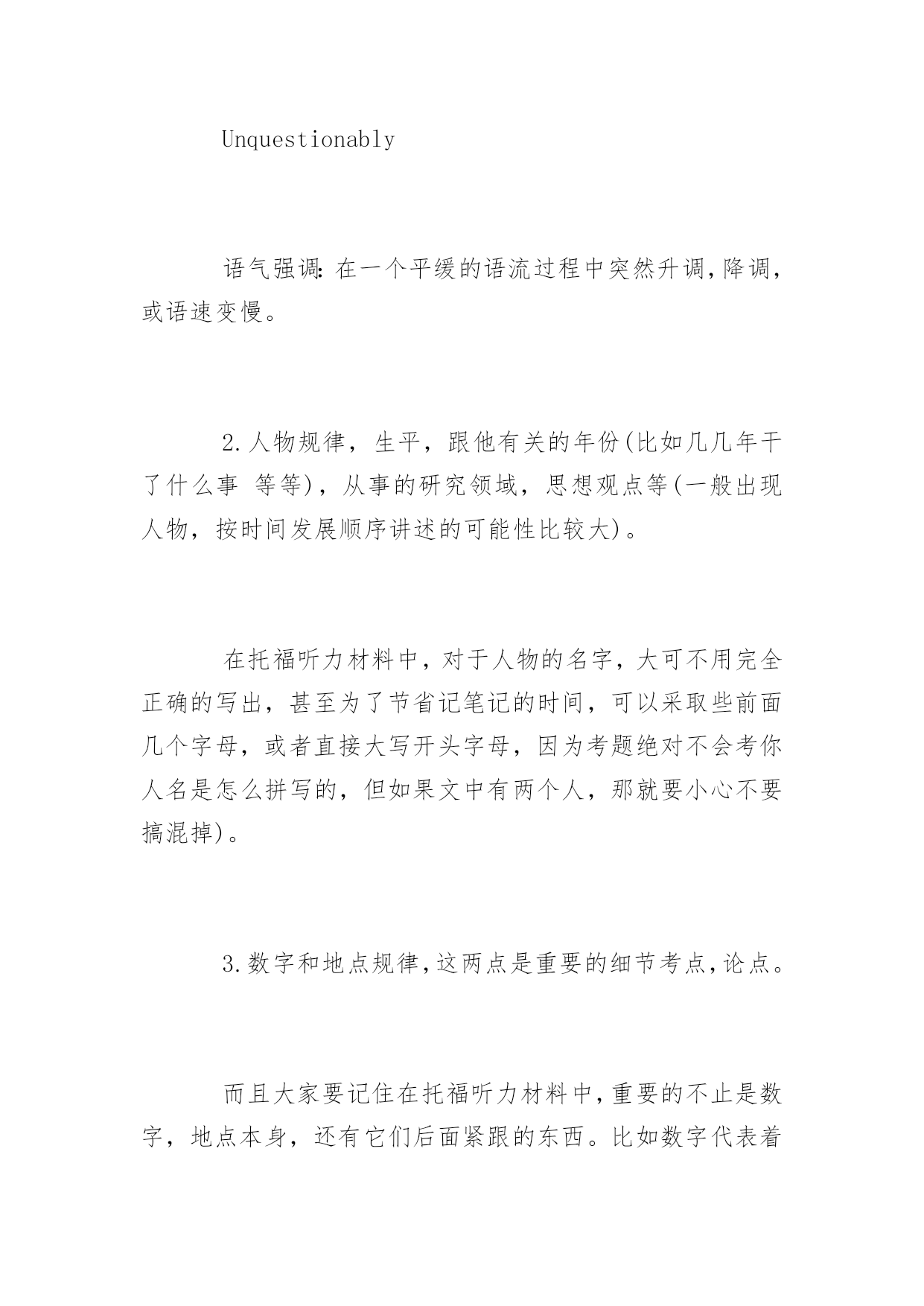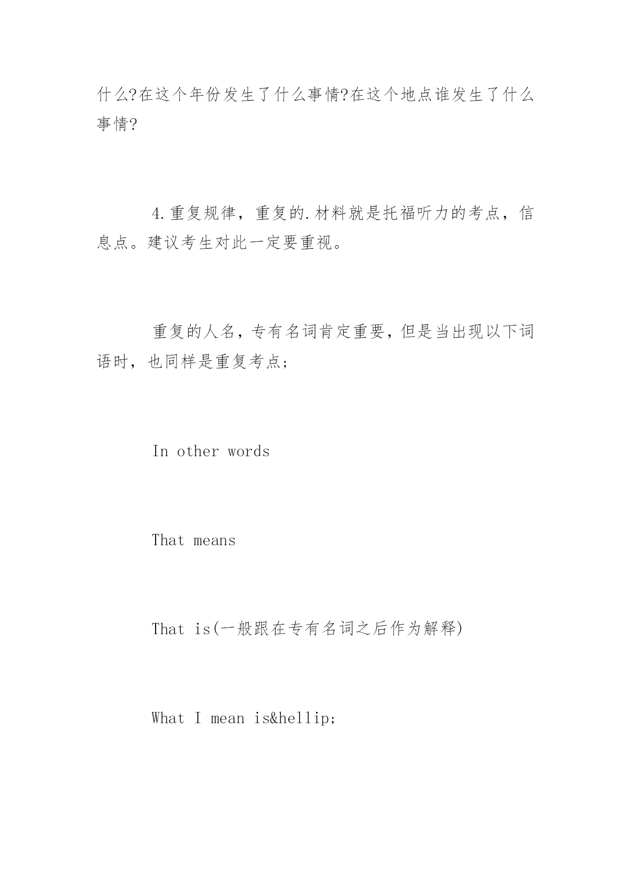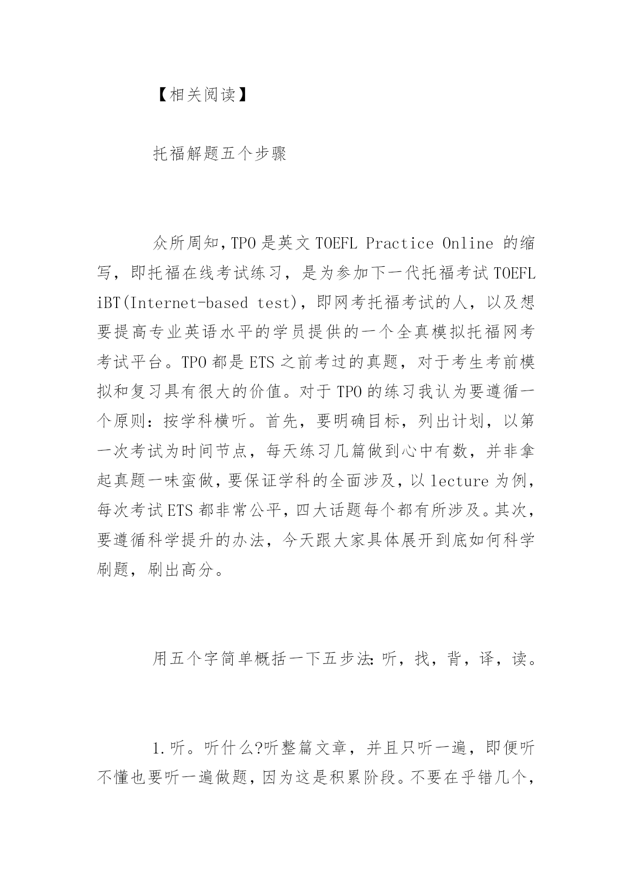 托福听力备考信号词 托福听力备考信号词 托福考试题型变化比较大,出题形式更加灵活多变,以下是小编为大家搜索整理的托福听力备考信号词,希望能给大家带来帮助!更多精彩内容请及时关注我们应届毕业生考试网! 1.强调规律通过词语来强调,或通过语气,加重音量来强调同样考到的几率很高 Infact/indeed Actually Inanycase Absolutely Andthemostimportantis… Now,thisisveryimportant… Amajorpointis… Theimportantideais… Thethingabout…isextremely(尤其)defiantly(明显的) Certainly Withnodoubt Unquestionably 语气强调:在一个平缓的语流过程中突然升调,降调,或语速变慢。 2.人物规律,生平,跟他有关的年份(比如几几年干了什么事等等),从事的研究领域,思想观点等(一般出现人物,按时间发展顺序讲述的可能性比较大)。 在托福听力材料中,对于人物的名字,大可不用完全正确的写出,甚至为了节省记笔记的时间,可以采取些前面几个字母,或者直接大写开头字母,因为考题绝对不会考你人名是怎么拼写的,但如果文中有两个人,那就要小心不要搞混掉)。 3.数字和地点规律,这两点是重要的细节考点,论点。 而且大家要记住在托福听力材料中,重要的不止是数字,地点本身,还有它们后面紧跟的东西。比如数字代表着什么?在这个年份发生了什么事情?在这个地点谁发生了什么事情? 4.重复规律,重复的.材料就是托福听力的考点,信息点。建议考生对此一定要重视。 重复的人名,专有名词肯定重要,但是当出现以下词语时,也同样是重复考点; Inotherwords Thatmeans Thatis(一般跟在专有名词之后作为解释) WhatImeanis… 【相关阅读】 托福解题五个步骤 众所周知,TPO是英文TOEFLPracticeOnline的缩写,即托福在线考试练习,是为参加下一代托福考试TOEFLiBT(Internet-basedtest),即网考托福考试的人,以及想要提高专业英语水平的学员提供的一个全真模拟托福网考考试平台。TPO都是ETS之前考过的真题,对于考生考前模拟和复习具有很大的价值。对于TPO的练习我认为要遵循一个原则:按学科横听。首先,要明确目标,列出计划,以第一次考试为时间节点,每天练习几篇做到心中有数,并非拿起真题一味蛮做,要保证学科的全面涉及,以lecture为例,每次考试ETS都非常公平,四大话题每个都有所涉及。其次,要遵循科学提升的办法,今天跟大家具体展开到底如何科学刷题,刷出高分。 用五个字简单概括一下五步法:听,找,背,译,读。 1.听。听什么?听整篇文章,并且只听一遍,即便听不懂也要听一遍做题,因为这是积累阶段。不要在乎错几个,关键是积累实力,笑傲考场。 2.找。找什么?找出题点,也就是找答案句。此步骤就是持反命题的心态,怎么从出题者角度把握考点。读万卷书,不如行万里路,行万里路不如阅出题点无数。鉴于托福听力先文后题的特点,要着重训练自己在听的同时就把握好出题点,笔记记下重要细节,真正达到一种效果:所记即所考,所考即所记。每道题,即便做对的,也要再听一遍找到答案句并在纸质原文中划出,培养对于出题点的敏感性。 3.背。背什么?背生词。买个小本,专门归纳积累文章中的生词,尤其是学术词汇。单词是基础关,想过语言关,先过词汇关。听力词汇学术性特点较为明显,需要大家耐心积累。不背单词只有一种结果:听!不!懂! 4.译。译什么?译原文。听一句翻译一句,可以借助托福听听这个软件,听不懂马上看原文,反复再听,直到听懂为止。这个环节主要训练如何听懂文章。无论如何都要清楚,听懂是最靠谱的技巧。 5.读。读什么?读原文。听一句读一句,尽量模仿speaker的语音语调,关注重音,把握句子结构。跟读的意义在于培养语感,从语言本质出发锻炼听力能力。听说是相辅相成的,想要提高听力最快的办法就是勤读多说。 至此,五步法已经分享完毕,大家可以开始按照自己的计划狂刷TPO了。永远记住:听力的锻炼并非一日之功,最忌讳一曝十寒,想要成功其实不难,早下手,苦逼练。
