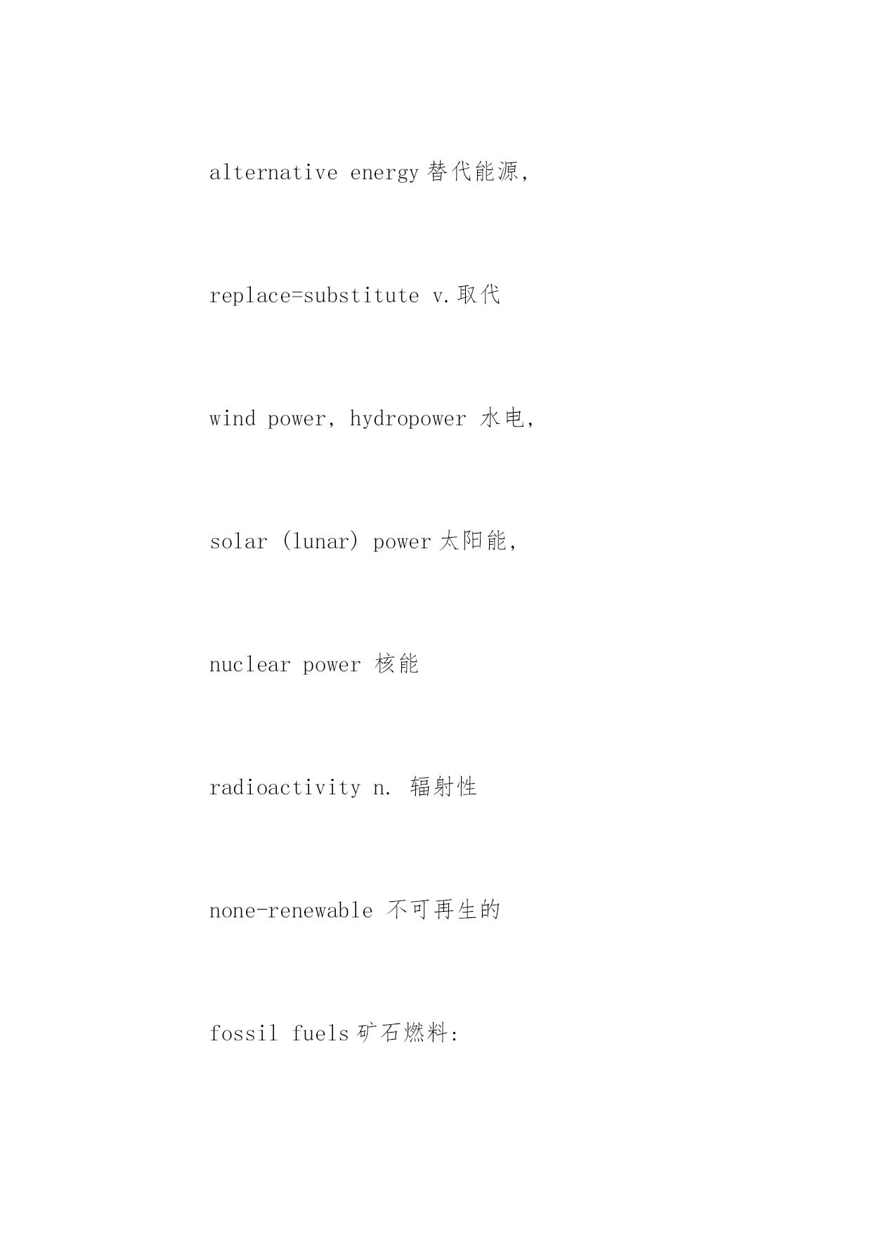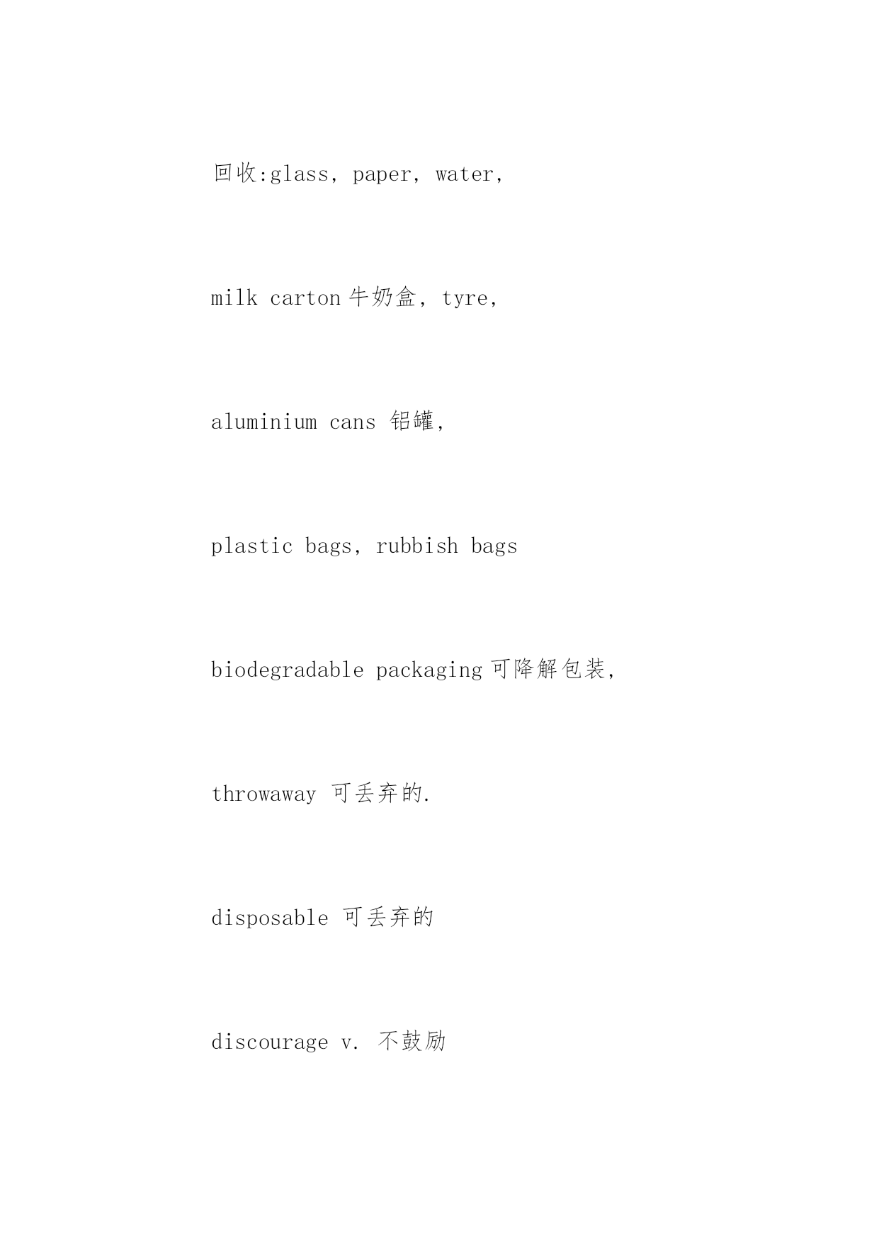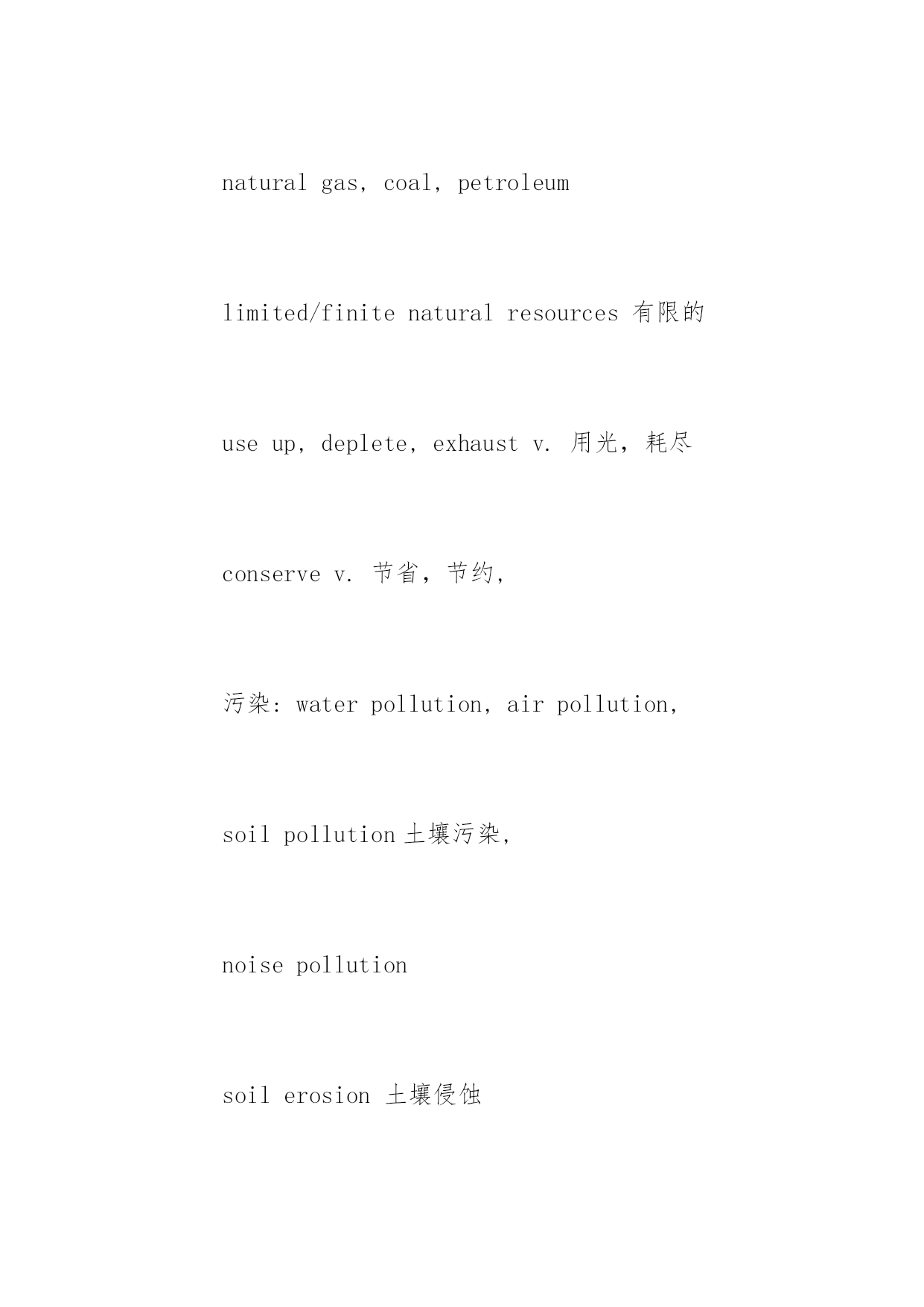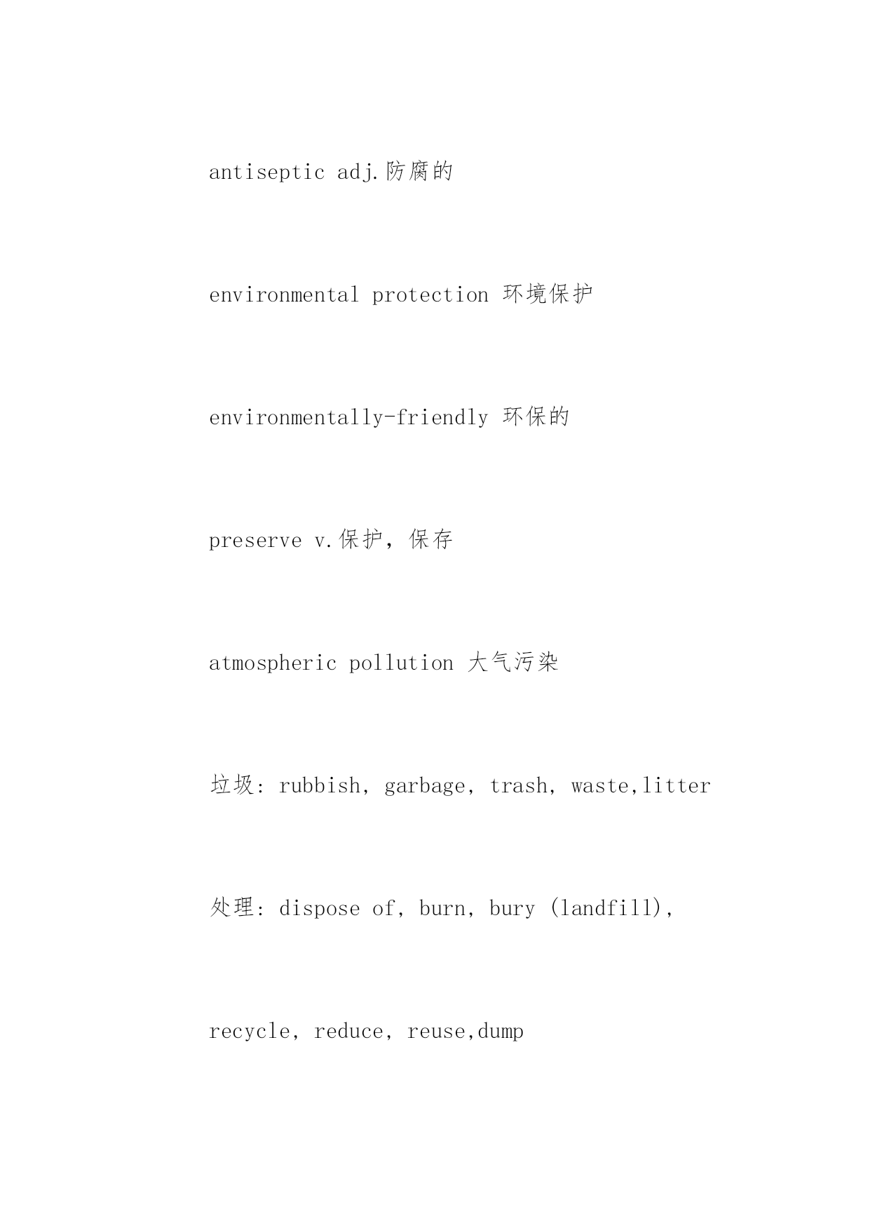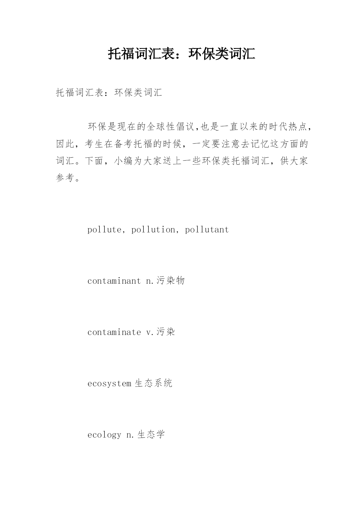托福词汇表:环保类词汇 托福词汇表:环保类词汇 环保是现在的全球性倡议,也是一直以来的时代热点,因此,考生在备考托福的时候,一定要注意去记忆这方面的词汇。下面,小编为大家送上一些环保类托福词汇,供大家参考。 pollute,pollution,pollutant contaminantn.污染物 contaminatev.污染 ecosystem生态系统 ecologyn.生态学 antisepticadj.防腐的 environmentalprotection环境保护 environmentally-friendly环保的 preservev.保护,保存 atmosphericpollution大气污染 垃圾:rubbish,garbage,trash,waste,litter 处理:disposeof,burn,bury(landfill), recycle,reduce,reuse,dump 回收:glass,paper,water, milkcarton牛奶盒,tyre, aluminiumcans铝罐, plasticbags,rubbishbags biodegradablepackaging可降解包装, throwaway可丢弃的. disposable可丢弃的 discouragev.不鼓励 alternativeenergy替代能源, replace=substitutev.取代 windpower,hydropower水电, solar(lunar)power太阳能, nuclearpower核能 radioactivityn.辐射性 none-renewable不可再生的 fossilfuels矿石燃料: naturalgas,coal,petroleum limited/finitenaturalresources有限的 useup,deplete,exhaustv.用光,耗尽 conservev.节省,节约, 污染:waterpollution,airpollution, soilpollution土壤污染, noisepollution soilerosion土壤侵蚀 soilpollution土壤污染 stainn.污染,污点,玷污 stinkv.发出臭味