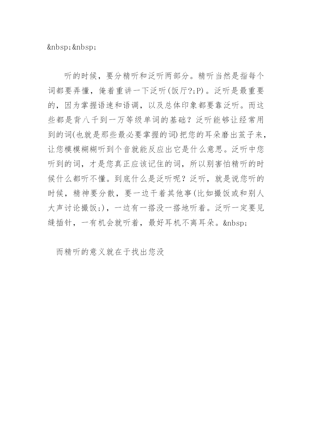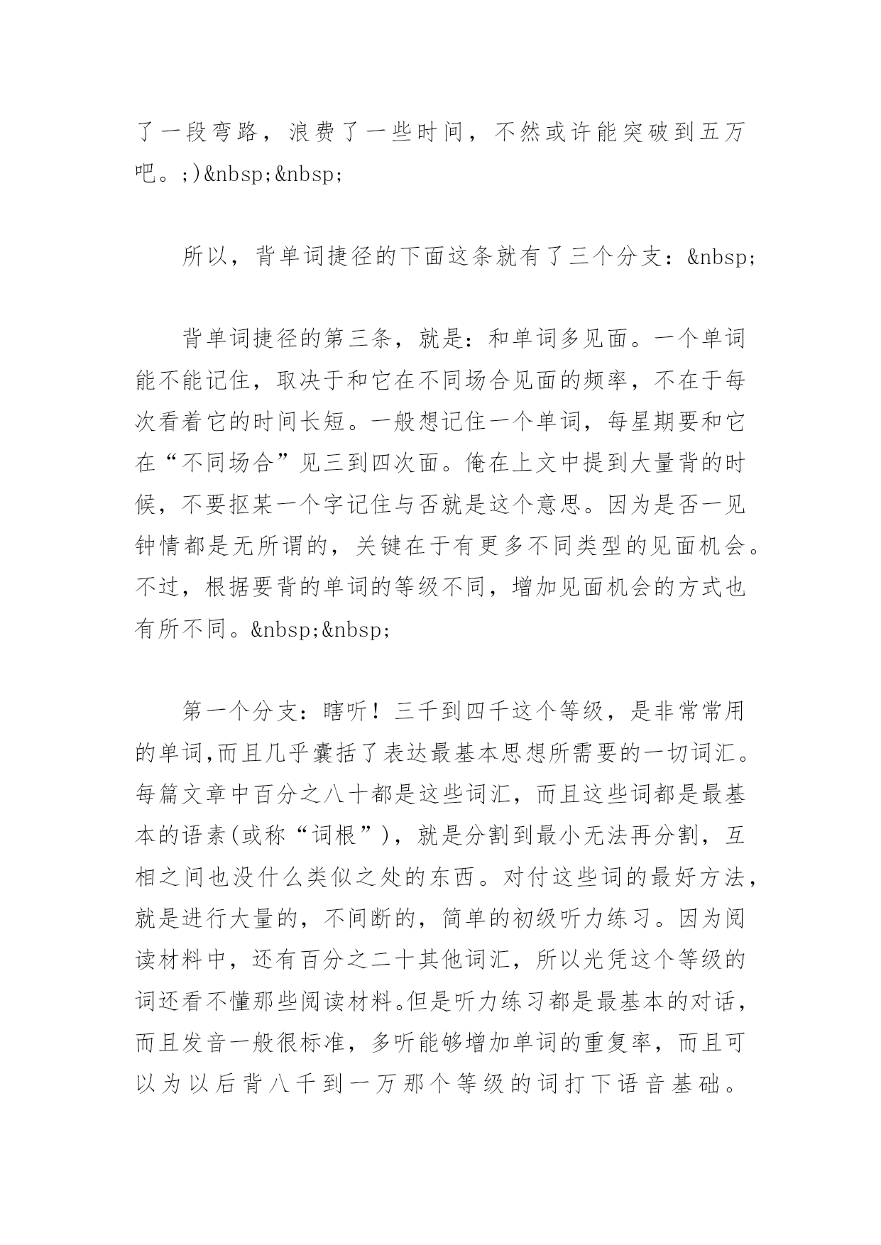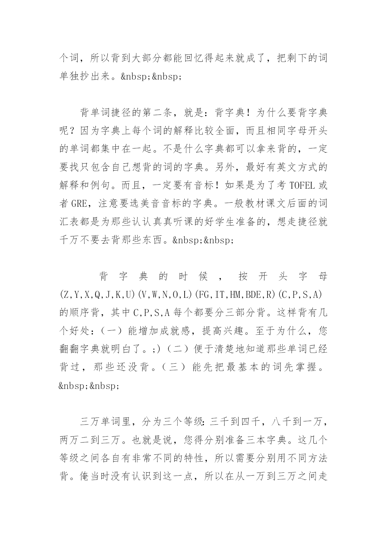托福背单词的最科学方法 托福背单词的最科学方法 怎样才能把这么多单词背下来呢?最重要的一点,就是:...如果想比别人成功,就一定要走捷径。不要期盼自己比别人幸运,也不要指望自己比别人更聪明或者更勤奋。从智力上说,从机遇上说,自己和别人都是差不了多少的,想超过和自己差不多的人,就一定要走捷径,捷径,捷径! 背单词捷径的第一条,就是:一定要每次都大量地背。因为自己不比别人聪明,所以背完单词,别人忘掉五分之一,自己决不会比别人忘得少。然而,别人每天背十个单词,自己却可以背一百个,忘掉五分之一,还剩八十个,是别人最聪明状态下的十倍。每天一百个是最低限。其实背到后来您会发现这个要求并不高,一个月后,您可能自然而然地就背到三百或者五百。 这一百个要分成四组来背,上午三十,中午十个,下午三十,晚上三十。第二天早晨复习以前没背下来的词。背的时候,要一目十词(注意,是十个而不是更多或更少),不要认认真真背,因为没有认认真真的时间。一边看一边读每个词的读音,默读也成。看完后回忆一遍,回忆不起来的再看。这次背的目的在于留下个大概印象,下次看见能知道这个词,所以背到大部分都能回忆得起来就成了,把剩下的词单独抄出来。 背单词捷径的第二条,就是:背字典!为什么要背字典呢?因为字典上每个词的解释比较全面,而且相同字母开头的单词都集中在一起。不是什么字典都可以拿来背的,一定要找只包含自己想背的词的字典。另外,最好有英文方式的解释和例句。而且,一定要有音标!如果是为了考TOFEL或者GRE,注意要选美音音标的字典。一般教材课文后面的词汇表都是为那些认认真真听课的好学生准备的,想走捷径就千万不要去背那些东西。 背字典的时候,按开头字母(Z,Y,X,Q,J,K,U)(V,W,N,O,L)(FG,IT,HM,BDE,R)(C,P,S,A)的顺序背,其中C,P,S,A每个都要分三部分背。这样背有几个好处:(一)能增加成就感,提高兴趣。至于为什么,您翻翻字典就明白了。;)(二)便于清楚地知道那些单词已经背过,那些还没背。(三)能先把最基本的词先掌握。 三万单词里,分为三个等级:三千到四千,八千到一万,两万二到三万。也就是说,您得分别准备三本字典。这几个等级之间各自有非常不同的特性,所以需要分别用不同方法背。俺当时没有认识到这一点,所以在从一万到三万之间走了一段弯路,浪费了一些时间,不然或许能突破到五万吧。;) 所以,背单词捷径的下面这条就有了三个分支: 背单词捷径的第三条,就是:和单词多见面。一个单词能不能记住,取决于和它在不同场合见面的频率,不在于每次看着它的时间长短。一般想记住一个单词,每星期要和它在“不同场合”见三到四次面。俺在上文中提到大量背的时候,不要抠某一个字记住与否就是这个意思。因为是否一见钟情都是无所谓的,关键在于有更多不同类型的见面机会。不过,根据要背的单词的等级不同,增加见面机会的方式也有所不同。 第一个分支:瞎听!三千到四千这个等级,是非常常用的单词,而且几乎囊括了表达最基本思想所需要的一切词汇。每篇文章中百分之八十都是这些词汇,而且这些词都是最基本的语素(或称“词根”),就是分割到最小无法再分割,互相之间也没什么类似之处的东西。对付这些词的最好方法,就是进行大量的,不间断的,简单的初级听力练习。因为阅读材料中,还有百分之二十其他词汇,所以光凭这个等级的词还看不懂那些阅读材料。但是听力练习都是最基本的对话,而且发音一般很标准,多听能够增加单词的重复率,而且可以为以后背八千到一万那个等级的词打下语音基础。 听的时候,要分精听和泛听两部分。精听当然是指每个词都要弄懂,俺着重讲一下泛听(饭厅?;P)。泛听是最重要的,因为掌握语速和语调,以及总体印象都要靠泛听。而这些都是背八千到一万等级单词的基础?泛听能够让经常用到的词(也就是那些最必要掌握的词)把您的耳朵磨出茧子来,让您模模糊糊听到个音就能反应出它是什么意思。泛听中您听到的词,才是您真正应该记住的词,所以别害怕精听的时候什么都听不懂。到底什么是泛听呢?泛听,就是说您听的时候,精神要分散,要一边干着其他事(比如撮饭或和别人大声讨论撮饭;),一边有一搭没一搭地听着。泛听一定要见缝插针,一有机会就听着,最好耳机不离耳朵。 而精听的意义就在于找出您没