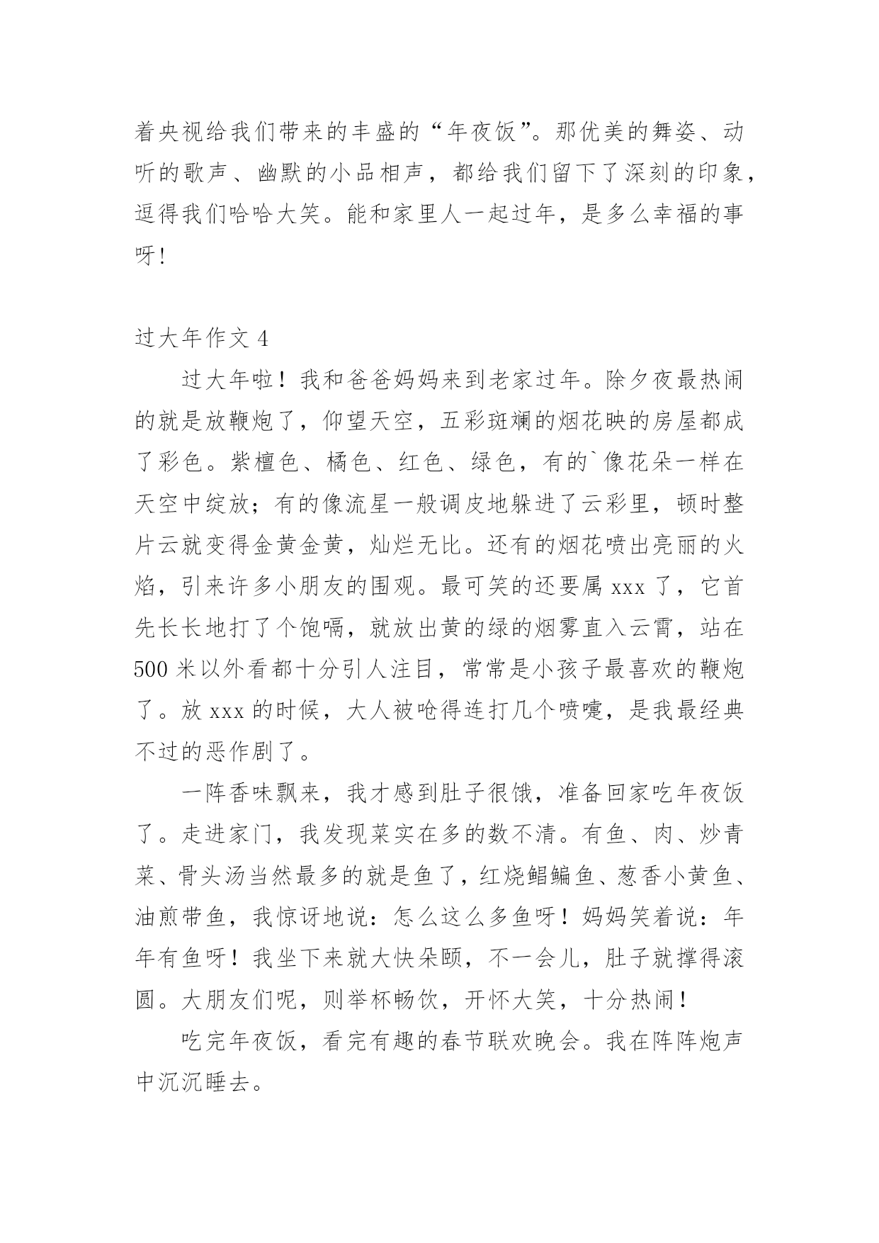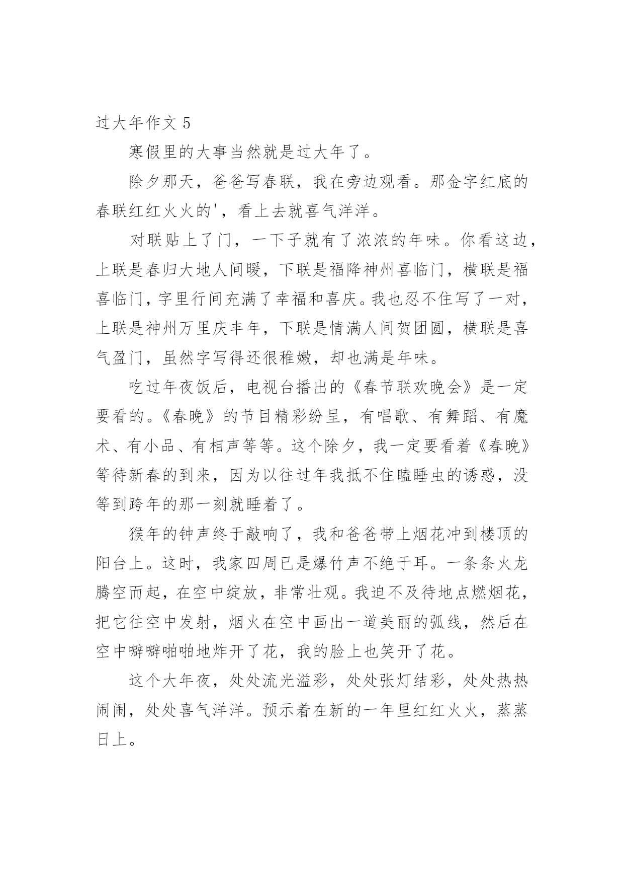 过大年作文 过大年作文(精华)无论是在学校还是在社会中,大家对作文都不陌生吧,作文要求篇章结构完整,一定要避免无结尾作文的出现。为了让您在写作文时更加简单方便,下面是小编为大家整理的过大年作文,欢迎大家分享。过大年作文1盼望着、盼望着,我期待已久的日子终于要来临了:过大年!“叮玲玲”、迷迷糊糊的我被一阵不悦的闹钟声给搅了美梦,不过、醒来之后,外面一阵一阵的鞭炮声让我一下变得开心起来。麻利地穿好妈妈买给我的`新衣服,走出了房间。哇!爷爷早就起来了、原来是他放的鞭炮,于是、我笑眯眯地向他走去,调皮地说道:“爷爷、恭喜发财、红包拿来~”,爷爷也被我逗乐了、随手掏出了早已准备好的红包、递给我,说“孙女乖、好好学习哦,去吃“万万顺吧”(就是饺子)。吃完早饭,开始准备向各家各户去拜年咯!!!提着红色的袋子,那是喜庆的象征。因为可以收获好多好多的瓜子、糖果和年糕。伴随着阵阵噼里啪啦地声响和互相对新的一年的祝福与愿望,我乐在其中,和我的小伙伴们玩的真是不易乐乎~不知不觉就到了晚上,对我们来说,就是我们乐园。因为可以放好多好多缤纷多彩、绚丽耀眼的烟花了。我们点燃了三个“降落伞”、接着又放了两个“春兰秋菊”的烟花,一簇簇、一片片,红的像玫瑰、黄的像菊花,真的好漂亮!新的一年、新的一天、新的开始,最后我们对着满身烟花的夜空中大喊:“新年快乐!”过大年作文2每年的新年是最热闹的时刻,不管在外上班还是学习的人都回家过年了。在每年的除夕之夜,我们都要回到自己家,和家人一起过新年。我们家也不例外,就在昨天,我们一家就到我的爷爷、奶奶的家里去过新年了。我们在除夕之夜都要吃饺子,吃炸货。这不我们一到老家,在我们暖和过来和坐在一起聊天聊完了以后,我们就开始包饺子和作炸货了。男的大人们就去做炸货了,而女人们都因为心细所以在包饺子,很快,1个小时过去了,男人们已经做好了炸货,而女人们已经做好了饺子。我们就在这个全家团聚的日子里,一边看着电视,一边吃着我们的新年大餐。在吉利的话语中,很快就到了,7:00了,我们该去放鞭炮了,我和我的爸爸一起来到了,我们家的`楼底下,准备放鞭炮。我爸爸的同事认识公安局的人,所以他给我们拿了好多白皮的鞭炮。据说白皮的鞭炮很有破坏性,我们虽然我们已经早用准备,但是当我们放了一个的时候我们才后悔了,那声音,就像那大炮发炮弹的声音似的,把四面八方车的警报器,都惊动了,一起向我们提出了他们的意见。热闹的春年真开心,我真希望每天都能够想新年一起热闹。过大年作文3千盼万盼,终于盼到过年了。前几天不停地赶作业,现在可以停下来休息几天了。过年了,家家都喜气洋洋、张灯结彩,我们家也不例外。大年三十那天,我就和爸爸妈妈来到奶奶家。早上,大街上人山人海,总是有“哐”、“叮”的声音。不知原因的我,就使全身力气挤进人群,原来有一对人马正在舞龙灯。舞龙灯的叔叔阿姨们穿着整齐的白衣服和红裤子,他们抓住龙灯,龙灯连绵起伏地摆动着,锣鼓声也伴随着龙灯。他们正穿过每条街巷为人们祈祷平安。晚上,我们一家人坐在凳子上,吃着团圆饭。吃完饭,我们站在楼上的阳台上看着楼下的烟花。第一个放的是花篮,花篮是由六个圆孔组成的,花篮先“兹”的喷起了火花,突然“砰”的.一声飞上了天空,炸成了许多五颜六色的火花,就这样喷了六次,好像正在为人们祝福呢!春节联欢晚会节目开始了,全家人围坐在沙发上,品尝着央视给我们带来的丰盛的“年夜饭”。那优美的舞姿、动听的歌声、幽默的小品相声,都给我们留下了深刻的印象,逗得我们哈哈大笑。能和家里人一起过年,是多么幸福的事呀!过大年作文4过大年啦!我和爸爸妈妈来到老家过年。除夕夜最热闹的就是放鞭炮了,仰望天空,五彩斑斓的烟花映的房屋都成了彩色。紫檀色、橘色、红色、绿色,有的`像花朵一样在天空中绽放;有的像流星一般调皮地躲进了云彩里,顿时整片云就变得金黄金黄,灿烂无比。还有的烟花喷出亮丽的火焰,引来许多小朋友的围观。最可笑的还要属xxx了,它首先长长地打了个饱嗝,就放出黄的绿的烟雾直入云霄,站在500米以外看都十分引人注目,常常是小孩子最喜欢的鞭炮了。放xxx的时候,大人被呛得连打几个喷嚏,是我最经典不过的恶作剧了。一阵香味飘来,我才感到肚子很饿,准备回家吃年夜饭了。走进家门,我发现菜实在多的数不清。有鱼、肉、炒青菜、骨头汤当然最多的就是鱼了,红烧鲳鳊鱼、葱香小黄鱼、油煎带鱼,我惊讶地说:怎么这么多鱼呀!妈妈笑着说:年年有鱼呀!我坐下来就大快朵颐,不一会儿,肚子就撑得滚圆。大朋友们呢,则举杯畅饮,开怀大笑,十分热闹!吃完年夜饭,看完有趣的春节联欢晚会。我在阵阵炮声中沉沉睡去。过大年作文5寒假里的大事当然就是过大年了。除夕那天,爸爸写春联,我在旁边观看。那金字红底的春联红红火火的',看上去就喜气洋洋。对联贴上了门,一下子就有了浓浓的年味。你看这边,上联是春归大地人间暖,