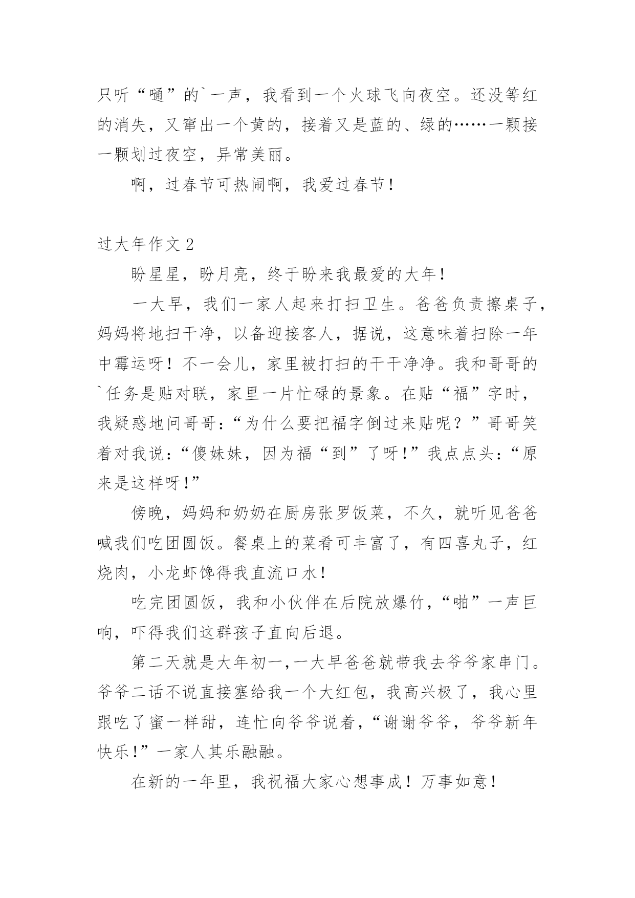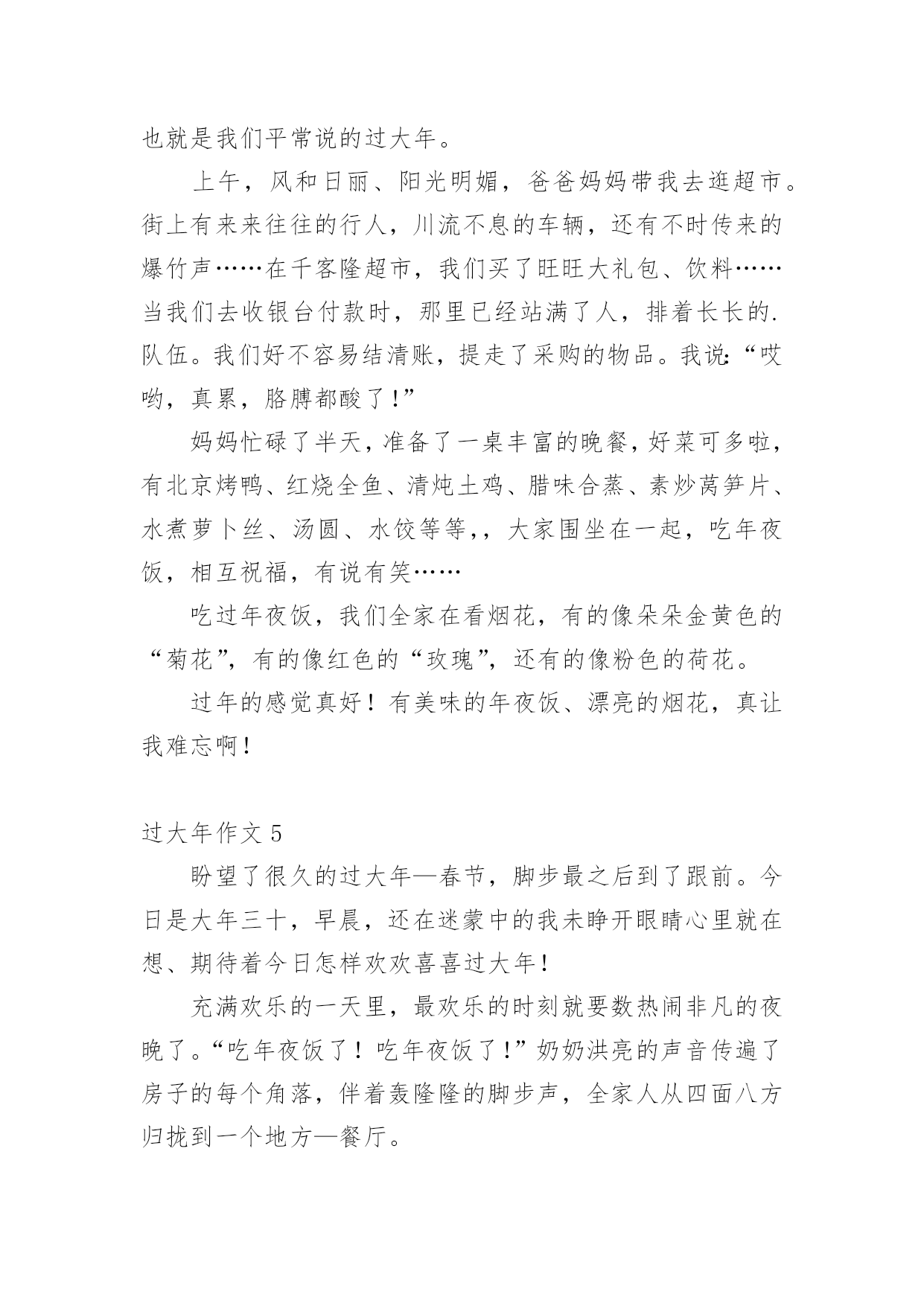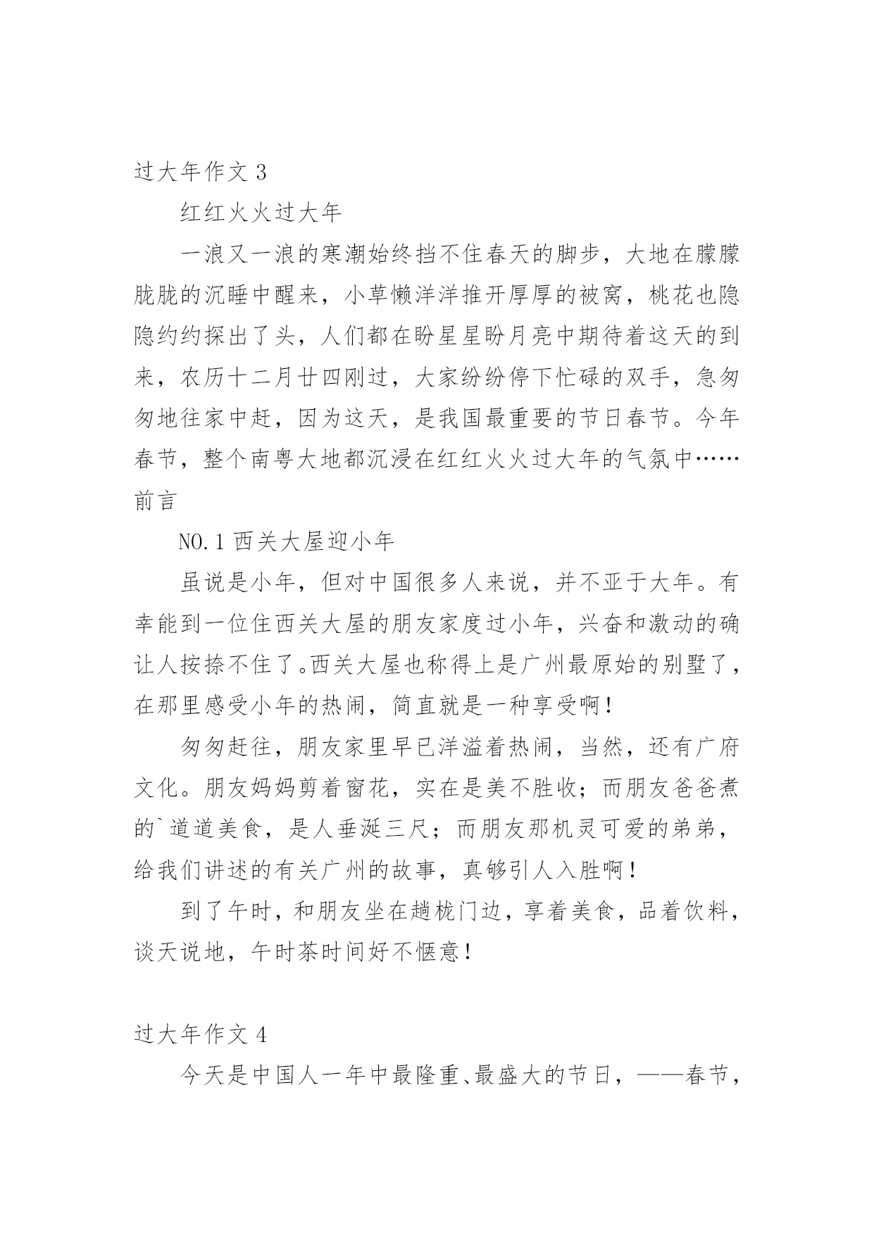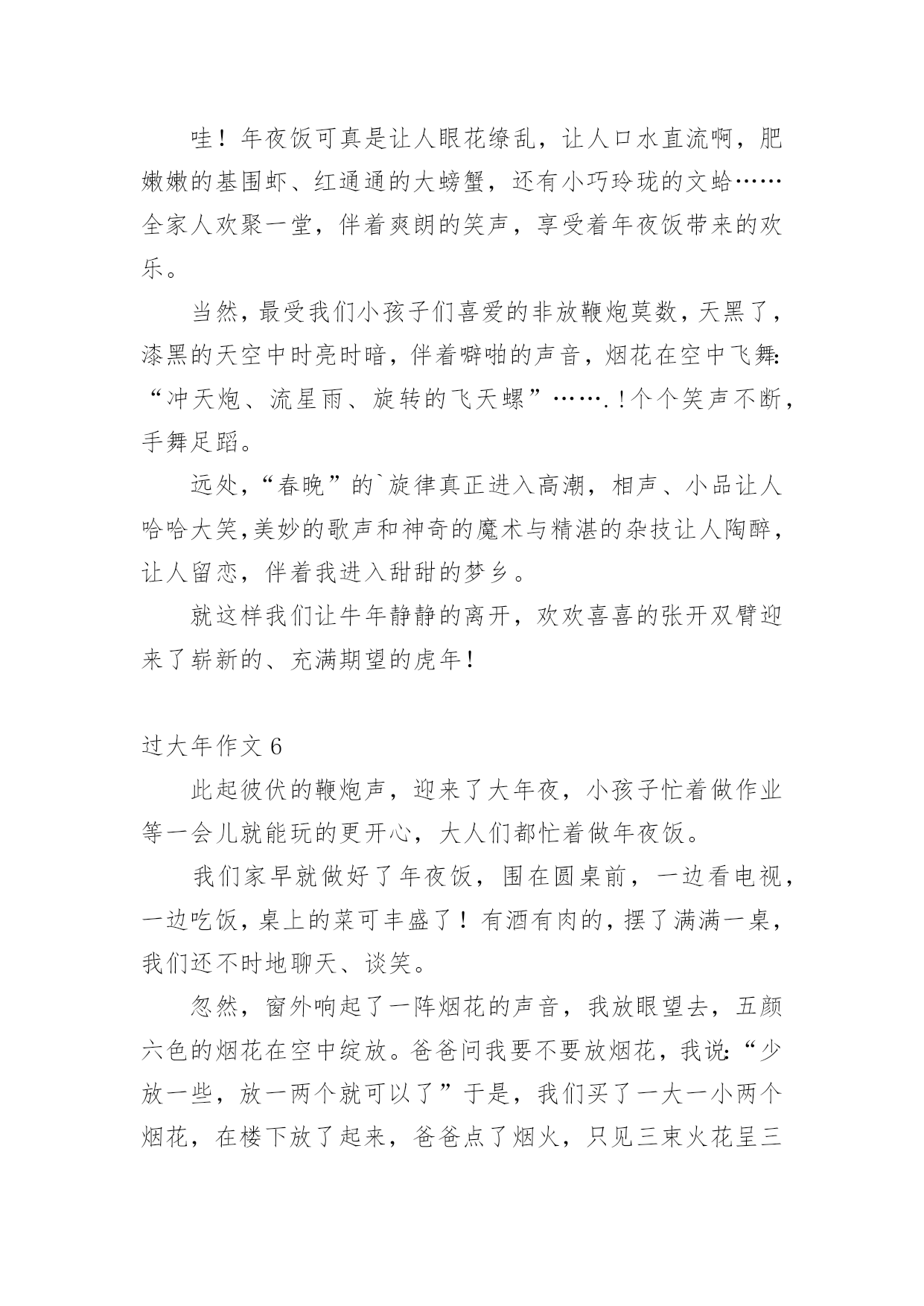 过大年作文 过大年作文在学习、工作乃至生活中,大家都写过作文,肯定对各类作文都很熟悉吧,写作文可以锻炼我们的独处习惯,让自己的心静下来,思考自己未来的方向。如何写一篇有思想、有文采的作文呢?以下是小编为大家收集的过大年作文,仅供参考,希望能够帮助到大家。过大年作文1我国有许多特色的传统的节日,如春节、元宵、清明、端午、中秋等……但在这些节日中,我尤其喜欢春节。因为春节是我国最隆重的传统节日。中国人过年有许多风俗,很有讲究:如拜神、祭祖、贴春联、放鞭炮、压岁钱、祈福、吃年夜饭、初一吃饺子、拜大年......一年一次的洗旧迎新的时刻,家家户户都洋溢着新春的喜悦,人人披上红处处流露欢喜,伴随着鞭炮鸣响,春节锣鼓张罗地拉开序幕。夜色降临,除夕的夜格外热闹,人人喜笑颜开,见面了便恭喜恭喜,递交红包,孩子收到了便笑滋滋地快速地收进袋子里,一家人团聚在饭桌前开开心心地有说有笑,大人们互相劝酒,小孩们追逐打闹,见到人人的脸上都挂着甜美的幸福,此时的感觉格外温暖,外面的风是冷的,但里面的心是热的。外面“噼噼啪啪”地在放炮仗了,焰火照亮了整个夜空。只听“嗵”的`一声,我看到一个火球飞向夜空。还没等红的消失,又窜出一个黄的,接着又是蓝的、绿的……一颗接一颗划过夜空,异常美丽。啊,过春节可热闹啊,我爱过春节!过大年作文2盼星星,盼月亮,终于盼来我最爱的大年!一大早,我们一家人起来打扫卫生。爸爸负责擦桌子,妈妈将地扫干净,以备迎接客人,据说,这意味着扫除一年中霉运呀!不一会儿,家里被打扫的干干净净。我和哥哥的`任务是贴对联,家里一片忙碌的景象。在贴“福”字时,我疑惑地问哥哥:“为什么要把福字倒过来贴呢?”哥哥笑着对我说:“傻妹妹,因为福“到”了呀!”我点点头:“原来是这样呀!”傍晚,妈妈和奶奶在厨房张罗饭菜,不久,就听见爸爸喊我们吃团圆饭。餐桌上的菜肴可丰富了,有四喜丸子,红烧肉,小龙虾馋得我直流口水!吃完团圆饭,我和小伙伴在后院放爆竹,“啪”一声巨响,吓得我们这群孩子直向后退。第二天就是大年初一,一大早爸爸就带我去爷爷家串门。爷爷二话不说直接塞给我一个大红包,我高兴极了,我心里跟吃了蜜一样甜,连忙向爷爷说着,“谢谢爷爷,爷爷新年快乐!”一家人其乐融融。在新的一年里,我祝福大家心想事成!万事如意!过大年作文3红红火火过大年一浪又一浪的寒潮始终挡不住春天的脚步,大地在朦朦胧胧的沉睡中醒来,小草懒洋洋推开厚厚的被窝,桃花也隐隐约约探出了头,人们都在盼星星盼月亮中期待着这天的到来,农历十二月廿四刚过,大家纷纷停下忙碌的双手,急匆匆地往家中赶,因为这天,是我国最重要的节日春节。今年春节,整个南粤大地都沉浸在红红火火过大年的气氛中……前言NO.1西关大屋迎小年虽说是小年,但对中国很多人来说,并不亚于大年。有幸能到一位住西关大屋的朋友家度过小年,兴奋和激动的确让人按捺不住了。西关大屋也称得上是广州最原始的别墅了,在那里感受小年的热闹,简直就是一种享受啊!匆匆赶往,朋友家里早已洋溢着热闹,当然,还有广府文化。朋友妈妈剪着窗花,实在是美不胜收;而朋友爸爸煮的`道道美食,是人垂涎三尺;而朋友那机灵可爱的弟弟,给我们讲述的有关广州的故事,真够引人入胜啊!到了午时,和朋友坐在趟栊门边,享着美食,品着饮料,谈天说地,午时茶时间好不惬意!过大年作文4今天是中国人一年中最隆重、最盛大的节日,——春节,也就是我们平常说的过大年。上午,风和日丽、阳光明媚,爸爸妈妈带我去逛超市。街上有来来往往的行人,川流不息的车辆,还有不时传来的爆竹声……在千客隆超市,我们买了旺旺大礼包、饮料……当我们去收银台付款时,那里已经站满了人,排着长长的.队伍。我们好不容易结清账,提走了采购的物品。我说:“哎哟,真累,胳膊都酸了!”妈妈忙碌了半天,准备了一桌丰富的晚餐,好菜可多啦,有北京烤鸭、红烧全鱼、清炖土鸡、腊味合蒸、素炒莴笋片、水煮萝卜丝、汤圆、水饺等等,,大家围坐在一起,吃年夜饭,相互祝福,有说有笑……吃过年夜饭,我们全家在看烟花,有的像朵朵金黄色的“菊花”,有的像红色的“玫瑰”,还有的像粉色的荷花。过年的感觉真好!有美味的年夜饭、漂亮的烟花,真让我难忘啊!过大年作文5盼望了很久的过大年—春节,脚步最之后到了跟前。今日是大年三十,早晨,还在迷蒙中的我未睁开眼睛心里就在想、期待着今日怎样欢欢喜喜过大年!充满欢乐的一天里,最欢乐的时刻就要数热闹非凡的夜晚了。“吃年夜饭了!吃年夜饭了!”奶奶洪亮的声音传遍了房子的每个角落,伴着轰隆隆的脚步声,全家人从四面八方归拢到一个地方—餐厅。哇!年夜饭可真是让人眼花缭乱,让人口水直流啊,肥嫩嫩的基围虾、红通通的大螃蟹,还有小巧玲珑的文蛤……全家人欢聚一堂,伴着爽朗的笑声,享受着年夜饭带来的欢乐。当然,最受我们小孩子们喜爱的非放鞭炮莫数,天黑了,漆黑的天空中时亮时暗,伴
