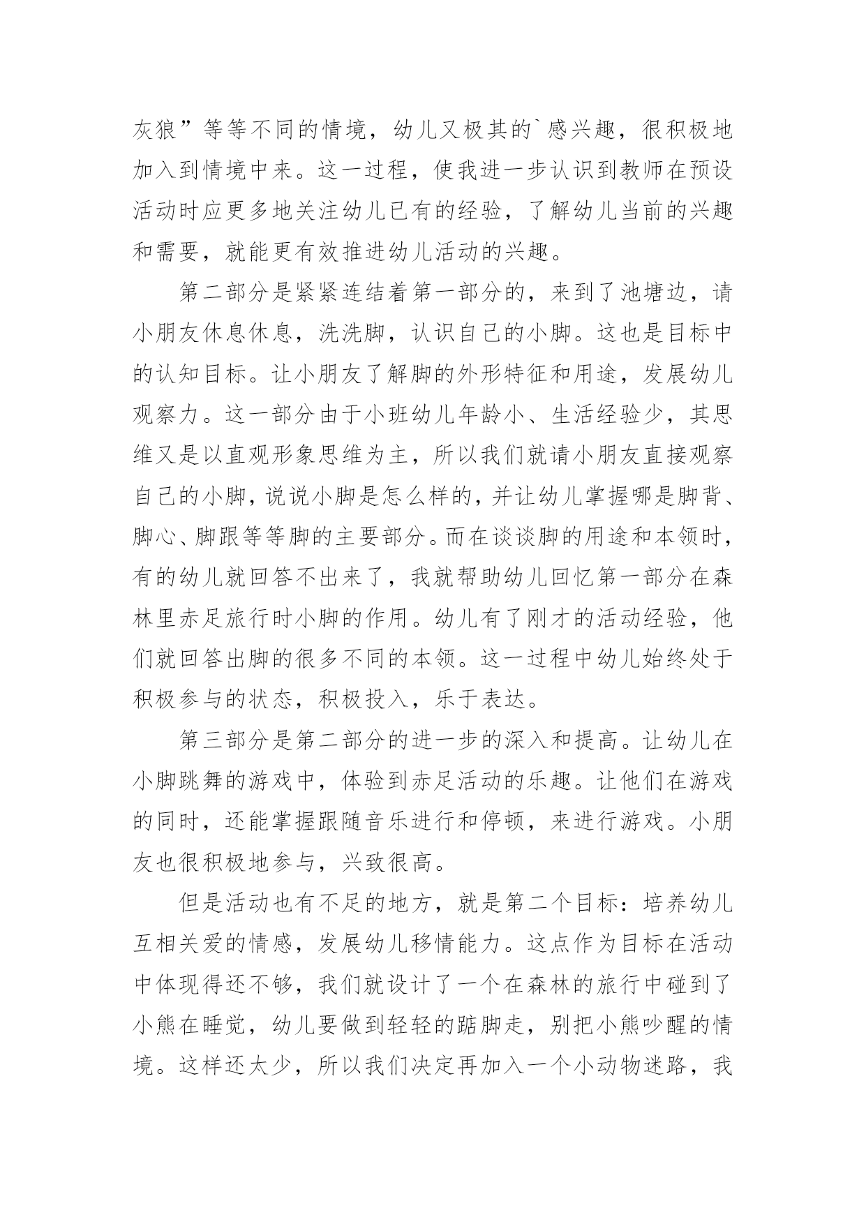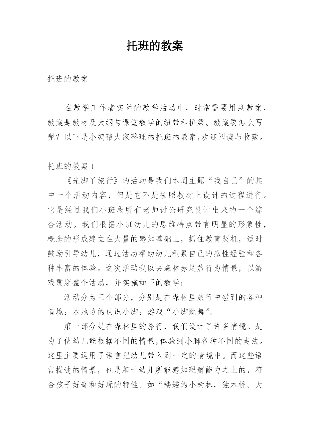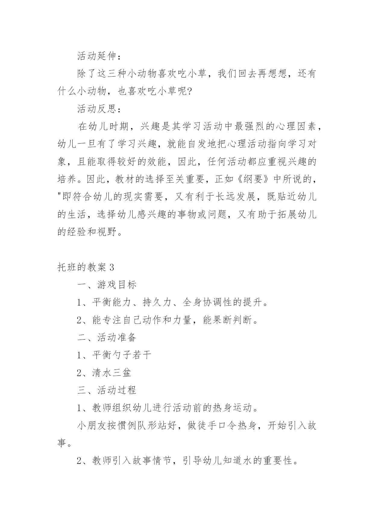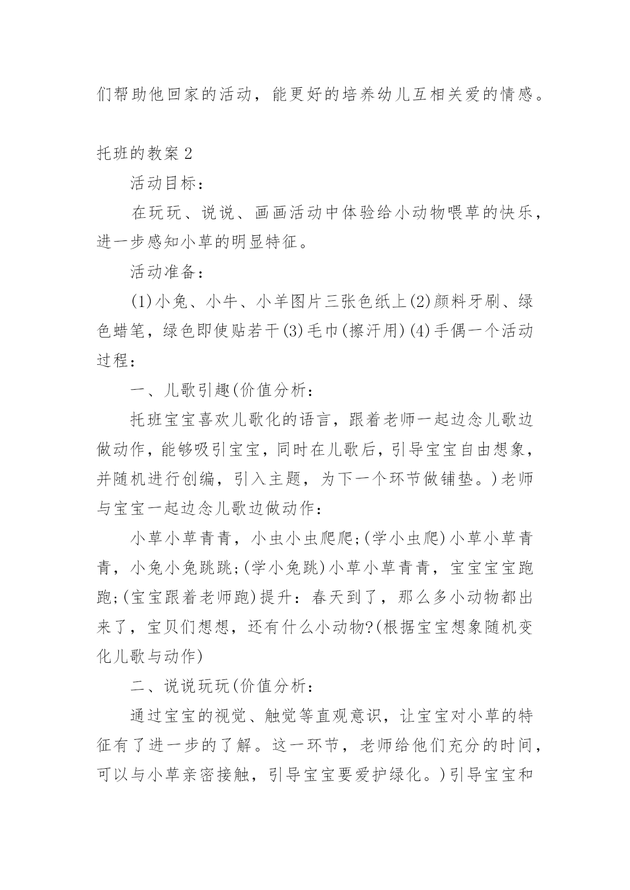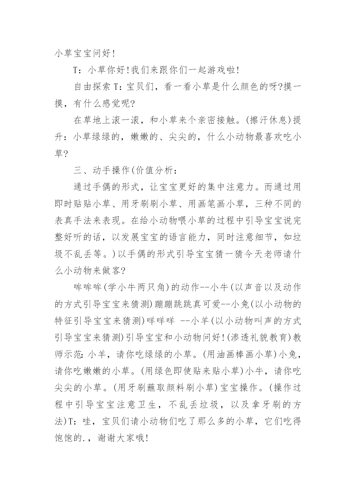 托班的教案 托班的教案在教学工作者实际的教学活动中,时常需要用到教案,教案是教材及大纲与课堂教学的纽带和桥梁。教案要怎么写呢?以下是小编帮大家整理的托班的教案,欢迎阅读与收藏。托班的教案1《光脚丫旅行》的活动是我们本周主题“我自己”的其中一个活动内容,但是它不是按照教材上设计的过程进行。它是经过我们小班段所有老师讨论研究设计出来的一个综合活动。我们根据小班幼儿的思维特点带有明显的形象性,概念的形成建立在大量的感知基础上,抓住教育契机,适时鼓励引导幼儿,通过活动帮助幼儿积累自己的感性经验和各种丰富的体验。这次活动我以去森林赤足旅行为情景,以游戏贯穿整个活动,并实施如下的教学:活动分为三个部分,分别是在森林里旅行中碰到的各种情境;水池边的认识小脚;游戏“小脚跳舞”。第一部分是在森林里的旅行,我们设计了许多情境。是为了使幼儿能根据不同的情景,体验到小脚各种不同的走法。这里主要运用了语言把幼儿带入到一定的情境中。而这些语言描述的情景,也是基于幼儿所能感知理解能力之上的,符合孩子好奇和好玩的特性。如“矮矮的小树林,独木桥、大灰狼”等等不同的情境,幼儿又极其的`感兴趣,很积极地加入到情境中来。这一过程,使我进一步认识到教师在预设活动时应更多地关注幼儿已有的经验,了解幼儿当前的兴趣和需要,就能更有效推进幼儿活动的兴趣。第二部分是紧紧连结着第一部分的,来到了池塘边,请小朋友休息休息,洗洗脚,认识自己的小脚。这也是目标中的认知目标。让小朋友了解脚的外形特征和用途,发展幼儿观察力。这一部分由于小班幼儿年龄小、生活经验少,其思维又是以直观形象思维为主,所以我们就请小朋友直接观察自己的小脚,说说小脚是怎么样的,并让幼儿掌握哪是脚背、脚心、脚跟等等脚的主要部分。而在谈谈脚的用途和本领时,有的幼儿就回答不出来了,我就帮助幼儿回忆第一部分在森林里赤足旅行时小脚的作用。幼儿有了刚才的活动经验,他们就回答出脚的很多不同的本领。这一过程中幼儿始终处于积极参与的状态,积极投入,乐于表达。第三部分是第二部分的进一步的深入和提高。让幼儿在小脚跳舞的游戏中,体验到赤足活动的乐趣。让他们在游戏的同时,还能掌握跟随音乐进行和停顿,来进行游戏。小朋友也很积极地参与,兴致很高。但是活动也有不足的地方,就是第二个目标:培养幼儿互相关爱的情感,发展幼儿移情能力。这点作为目标在活动中体现得还不够,我们就设计了一个在森林的旅行中碰到了小熊在睡觉,幼儿要做到轻轻的踮脚走,别把小熊吵醒的情境。这样还太少,所以我们决定再加入一个小动物迷路,我们帮助他回家的活动,能更好的培养幼儿互相关爱的情感。托班的教案2活动目标:在玩玩、说说、画画活动中体验给小动物喂草的快乐,进一步感知小草的明显特征。活动准备:(1)小兔、小牛、小羊图片三张色纸上(2)颜料牙刷、绿色蜡笔,绿色即使贴若干(3)毛巾(擦汗用)(4)手偶一个活动过程:一、儿歌引趣(价值分析:托班宝宝喜欢儿歌化的语言,跟着老师一起边念儿歌边做动作,能够吸引宝宝,同时在儿歌后,引导宝宝自由想象,并随机进行创编,引入主题,为下一个环节做铺垫。)老师与宝宝一起边念儿歌边做动作:小草小草青青,小虫小虫爬爬;(学小虫爬)小草小草青青,小兔小兔跳跳;(学小兔跳)小草小草青青,宝宝宝宝跑跑;(宝宝跟着老师跑)提升:春天到了,那么多小动物都出来了,宝贝们想想,还有什么小动物?(根据宝宝想象随机变化儿歌与动作)二、说说玩玩(价值分析:通过宝宝的视觉、触觉等直观意识,让宝宝对小草的特征有了进一步的了解。这一环节,老师给他们充分的时间,可以与小草亲密接触,引导宝宝要爱护绿化。)引导宝宝和小草宝宝问好!T:小草你好!我们来跟你们一起游戏啦!自由探索T:宝贝们,看一看小草是什么颜色的呀?摸一摸,有什么感觉呢?在草地上滚一滚,和小草来个亲密接触。(擦汗休息)提升:小草绿绿的,嫩嫩的、尖尖的,什么小动物最喜欢吃小草?三、动手操作(价值分析:通过手偶的形式,让宝宝更好的集中注意力。而通过用即时贴贴小草、用牙刷刷小草、用画笔画小草,三种不同的表真手法来表现。在给小动物喂小草的过程中引导宝宝说完整好听的话,以发展宝宝的语言能力,同时注意细节,如垃圾不乱丢等。)以手偶的形式引导宝宝猜一猜今天老师请什么小动物来做客?哞哞哞(学小牛两只角)的动作--小牛(以声音以及动作的方式引导宝宝来猜测)蹦蹦跳跳真可爱--小兔(以小动物的特征引导宝宝来猜测)咩咩咩--小羊(以小动物叫声的方式引导宝宝来猜测)引导宝宝和小动物问好!(渗透礼貌教育)教师示范:小羊,请你吃绿绿的小草。(用油画棒画小草)小兔,请你吃嫩嫩的小草。(用绿色即使贴来贴小草)小牛,请你吃尖尖的小草。(用牙刷蘸取颜料刷小草)宝宝操作。(操作过程中引导宝宝注意卫生,不乱丢垃圾,以及拿牙刷的方法)T:哇,宝贝们请小动物们吃了那么多的小草,