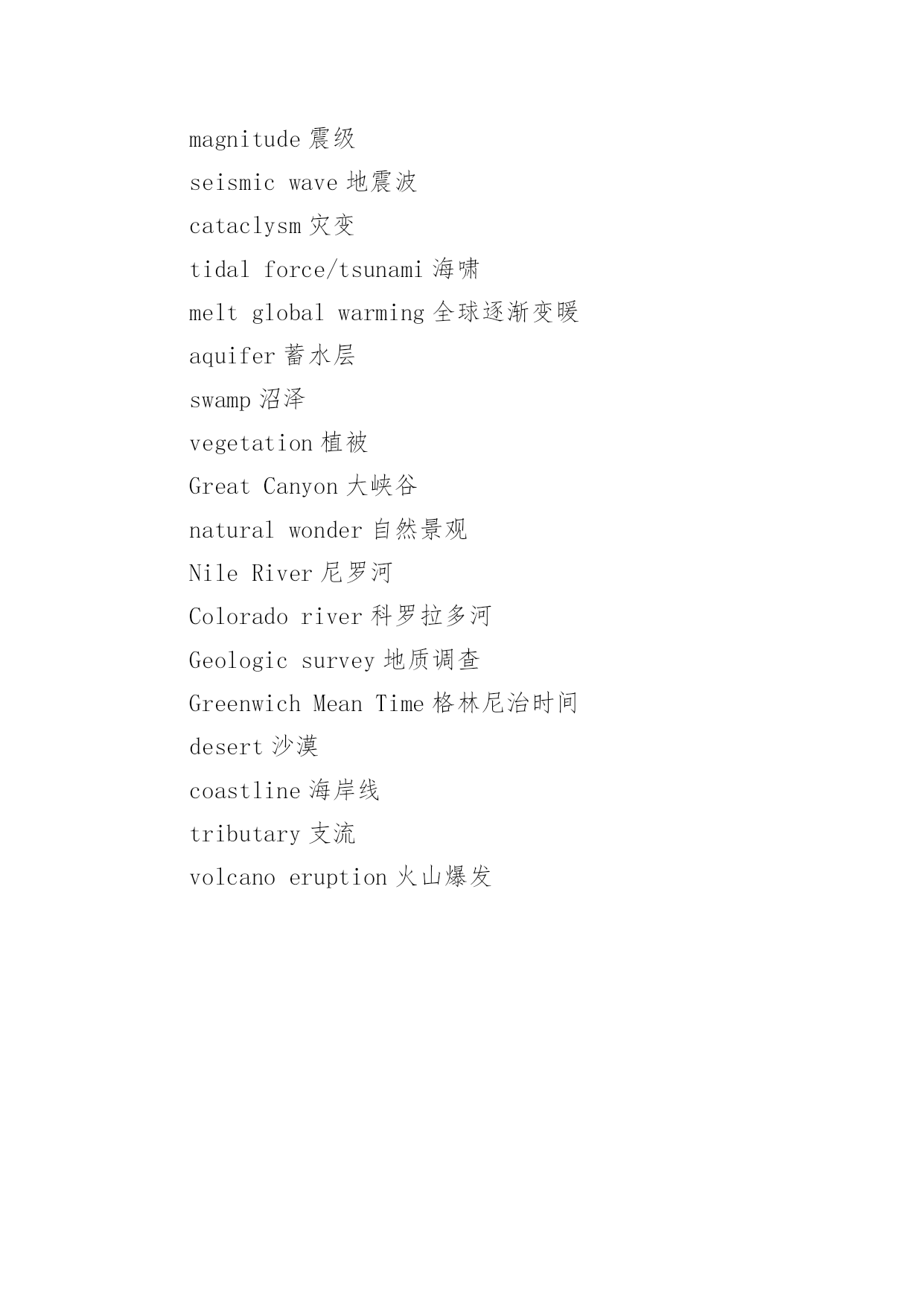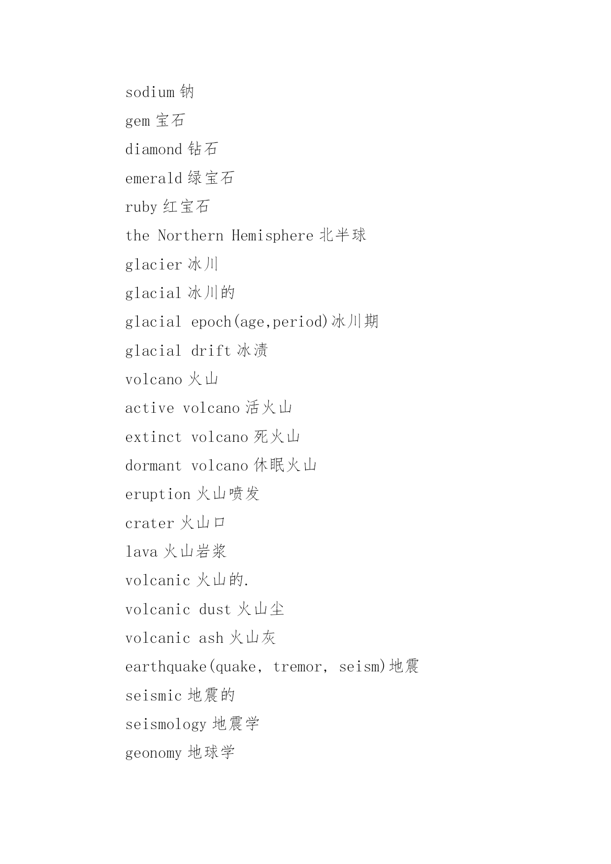 托福英语专业词汇辅导 托福英语专业词汇辅导Successistheabilitytogofromonefailuretoanotherwithnolossofenthusiasm.以下是小编为大家搜索整理的托福英语专业词汇辅导,希望能给大家带来帮助!更多精彩内容请及时关注我们应届毕业生考试网!geology地质学geologist地质学家stratum(pl:strata),layer地层stratigraphy地层学crust地壳mantle地幔core地核continentalcrust大陆地壳oceaniccrust海洋地壳plate板块fault断层faultplane断层面faultzone断层带rift(crack,split)断裂disintegration(decomposition)分解erosion腐蚀fossil化石outercore外核igneousrock火成岩metamorphicrock变质岩volcanic火山岩quartz石英quartzite石英岩sedimentaryrock沉积岩limestone石灰岩granite花岗岩marble大理石lithosphere岩石圈magma/moltenlava岩浆mineral矿物ore矿石deposit矿床platinum白金/铂silver银copper黄铜aluminum铝tin锡lead铅zinc锌nickel镍mercury汞/水银sodium钠gem宝石diamond钻石emerald绿宝石ruby红宝石theNorthernHemisphere北半球glacier冰川glacial冰川的glacialepoch(age,period)冰川期glacialdrift冰渍volcano火山activevolcano活火山extinctvolcano死火山dormantvolcano休眠火山eruption火山喷发crater火山口lava火山岩浆volcanic火山的.volcanicdust火山尘volcanicash火山灰earthquake(quake,tremor,seism)地震seismic地震的seismology地震学geonomy地球学magnitude震级seismicwave地震波cataclysm灾变tidalforce/tsunami海啸meltglobalwarming全球逐渐变暖aquifer蓄水层swamp沼泽vegetation植被GreatCanyon大峡谷naturalwonder自然景观NileRiver尼罗河Coloradoriver科罗拉多河Geologicsurvey地质调查GreenwichMeanTime格林尼治时间desert沙漠coastline海岸线tributary支流volcanoeruption火山爆发