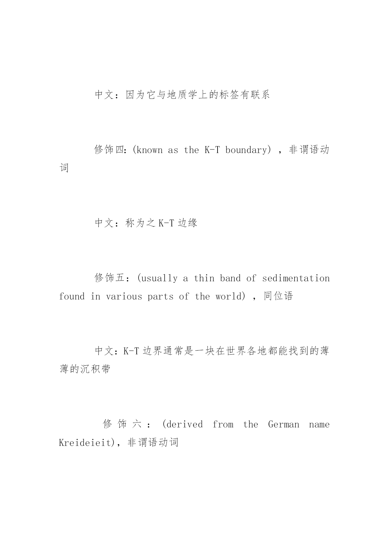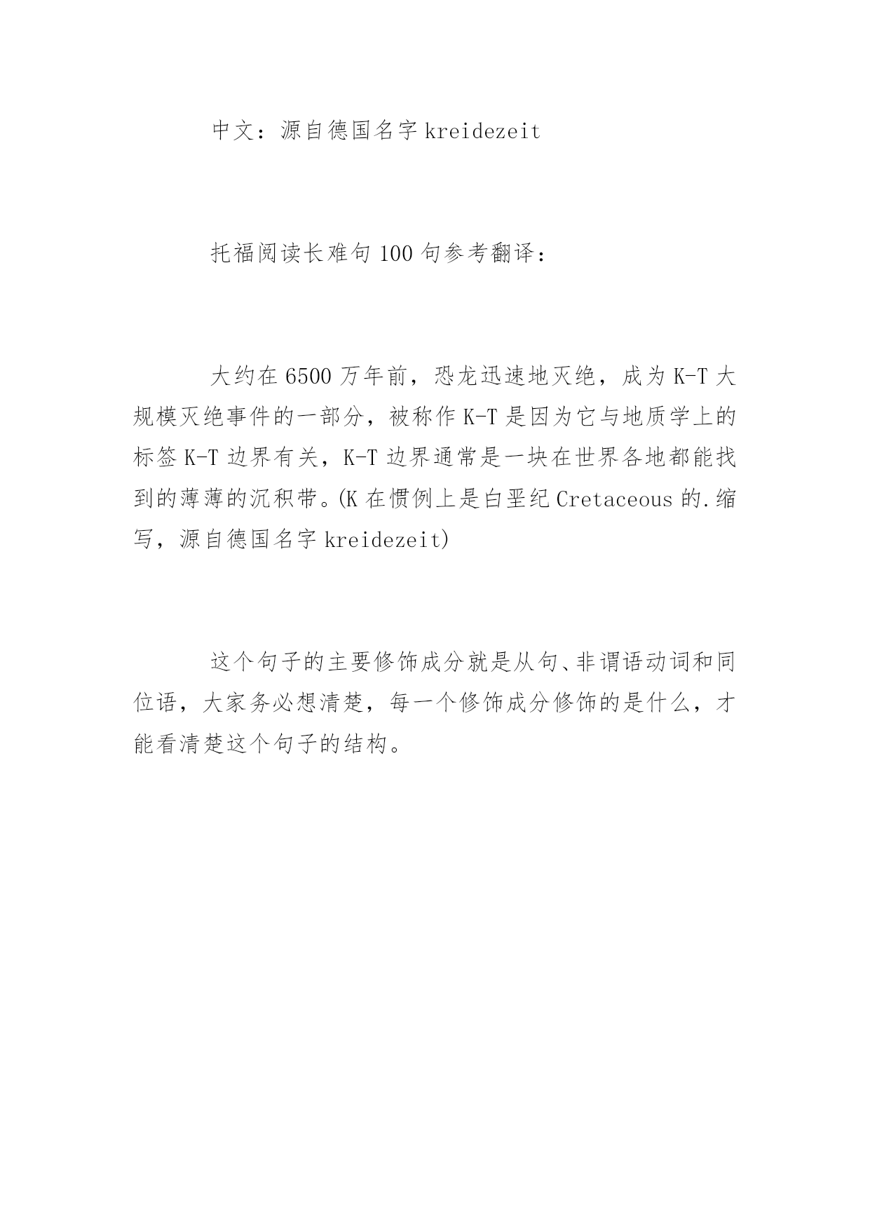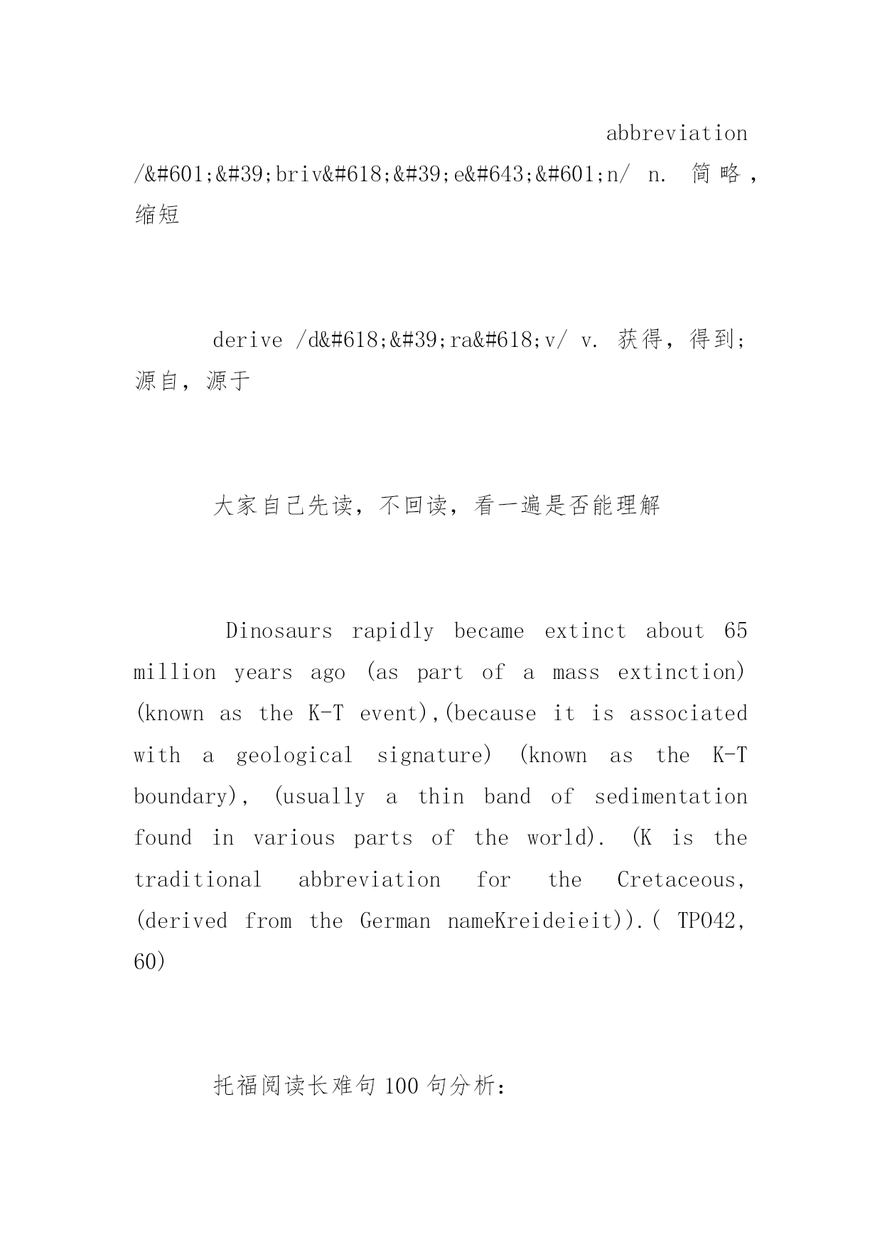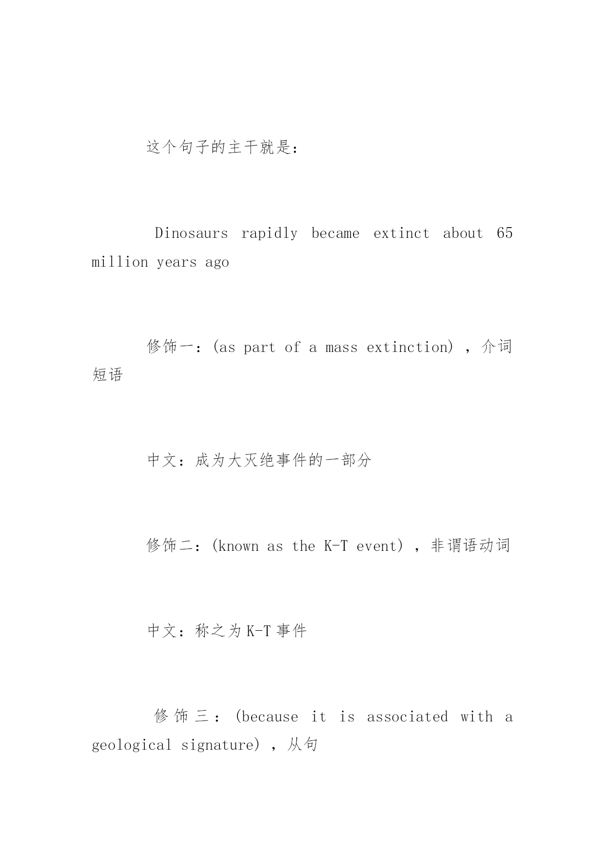 托福阅读备考长难句分析 2016托福阅读备考长难句分析 很多考生觉得托福考试有用难度,但只要我们能好好备考,好好准备,相信许多考生都能取得好的成绩。以下是yjbys网小编整理的关于托福阅读备考长难句分析,供大家备考。 托福阅读备考长难句分析之白垩纪灭绝事件: Dinosaursrapidlybecameextinctabout65millionyearsagoaspartofamassextinctionknownastheK-Tevent,becauseitisassociatedwithageologicalsignatureknownastheK-Tboundary,usuallyathinbandofsedimentationfoundinvariouspartsoftheworld.(KisthetraditionalabbreviationfortheCretaceous,derivedfromtheGermannameKreideieit).(TPO42,60) abbreviation/ə'brivɪ'eʃən/n.简略,缩短 derive/dɪ'raɪv/v.获得,得到;源自,源于 大家自己先读,不回读,看一遍是否能理解 Dinosaursrapidlybecameextinctabout65millionyearsago(aspartofamassextinction)(knownastheK-Tevent),(becauseitisassociatedwithageologicalsignature)(knownastheK-Tboundary),(usuallyathinbandofsedimentationfoundinvariouspartsoftheworld).(KisthetraditionalabbreviationfortheCretaceous,(derivedfromtheGermannameKreideieit)).(TPO42,60) 托福阅读长难句100句分析: 这个句子的主干就是: Dinosaursrapidlybecameextinctabout65millionyearsago 修饰一:(aspartofamassextinction),介词短语 中文:成为大灭绝事件的一部分 修饰二:(knownastheK-Tevent),非谓语动词 中文:称之为K-T事件 修饰三:(becauseitisassociatedwithageologicalsignature),从句 中文:因为它与地质学上的标签有联系 修饰四:(knownastheK-Tboundary),非谓语动词 中文:称为之K-T边缘 修饰五:(usuallyathinbandofsedimentationfoundinvariouspartsoftheworld),同位语 中文:K-T边界通常是一块在世界各地都能找到的薄薄的沉积带 修饰六:(derivedfromtheGermannameKreideieit),非谓语动词 中文:源自德国名字kreidezeit 托福阅读长难句100句参考翻译: 大约在6500万年前,恐龙迅速地灭绝,成为K-T大规模灭绝事件的一部分,被称作K-T是因为它与地质学上的标签K-T边界有关,K-T边界通常是一块在世界各地都能找到的薄薄的沉积带。(K在惯例上是白垩纪Cretaceous的.缩写,源自德国名字kreidezeit) 这个句子的主要修饰成分就是从句、非谓语动词和同位语,大家务必想清楚,每一个修饰成分修饰的是什么,才能看清楚这个句子的结构。