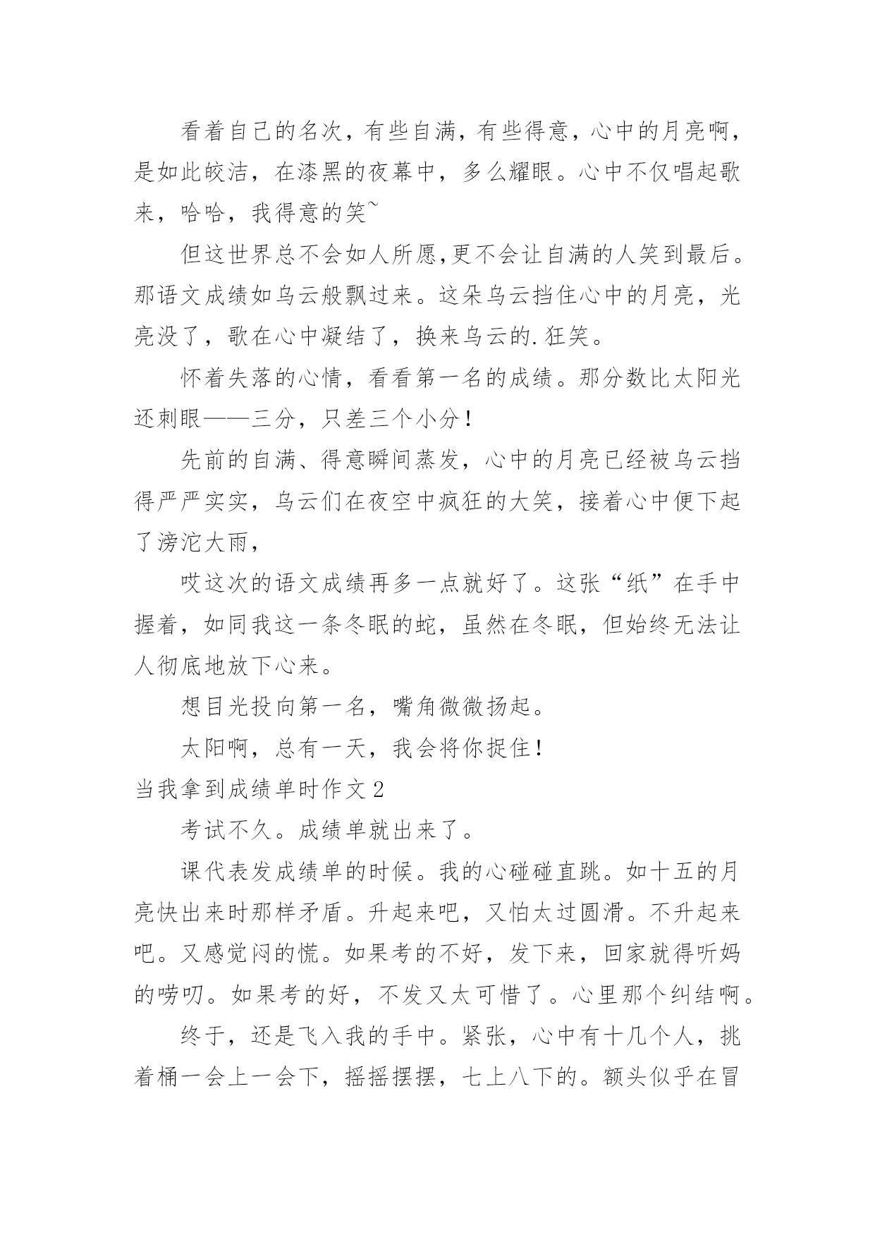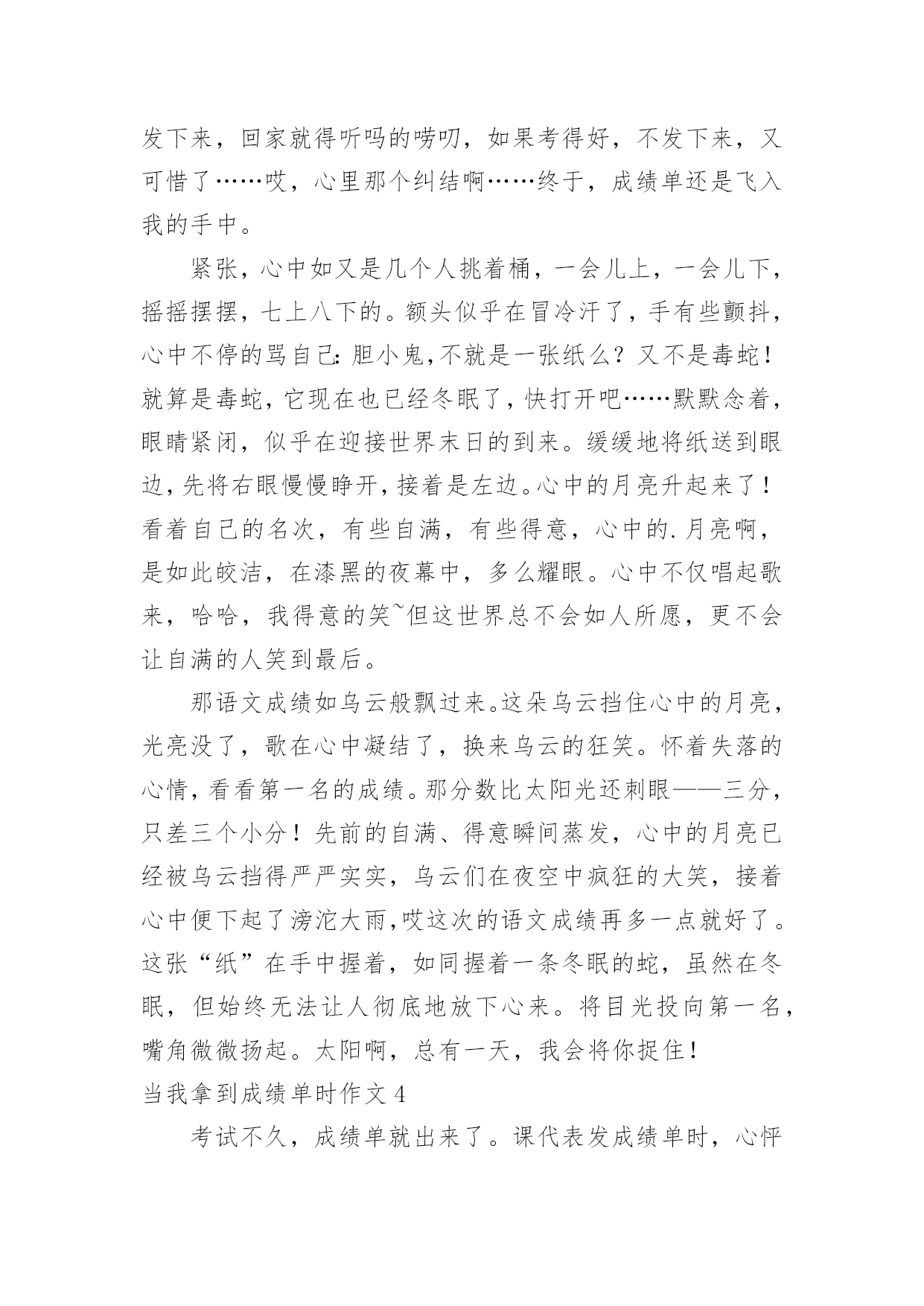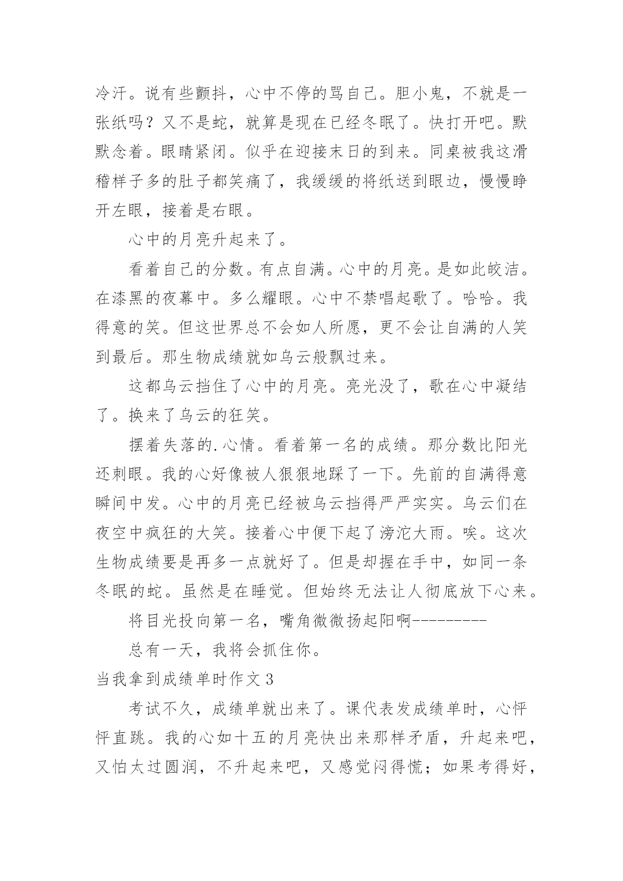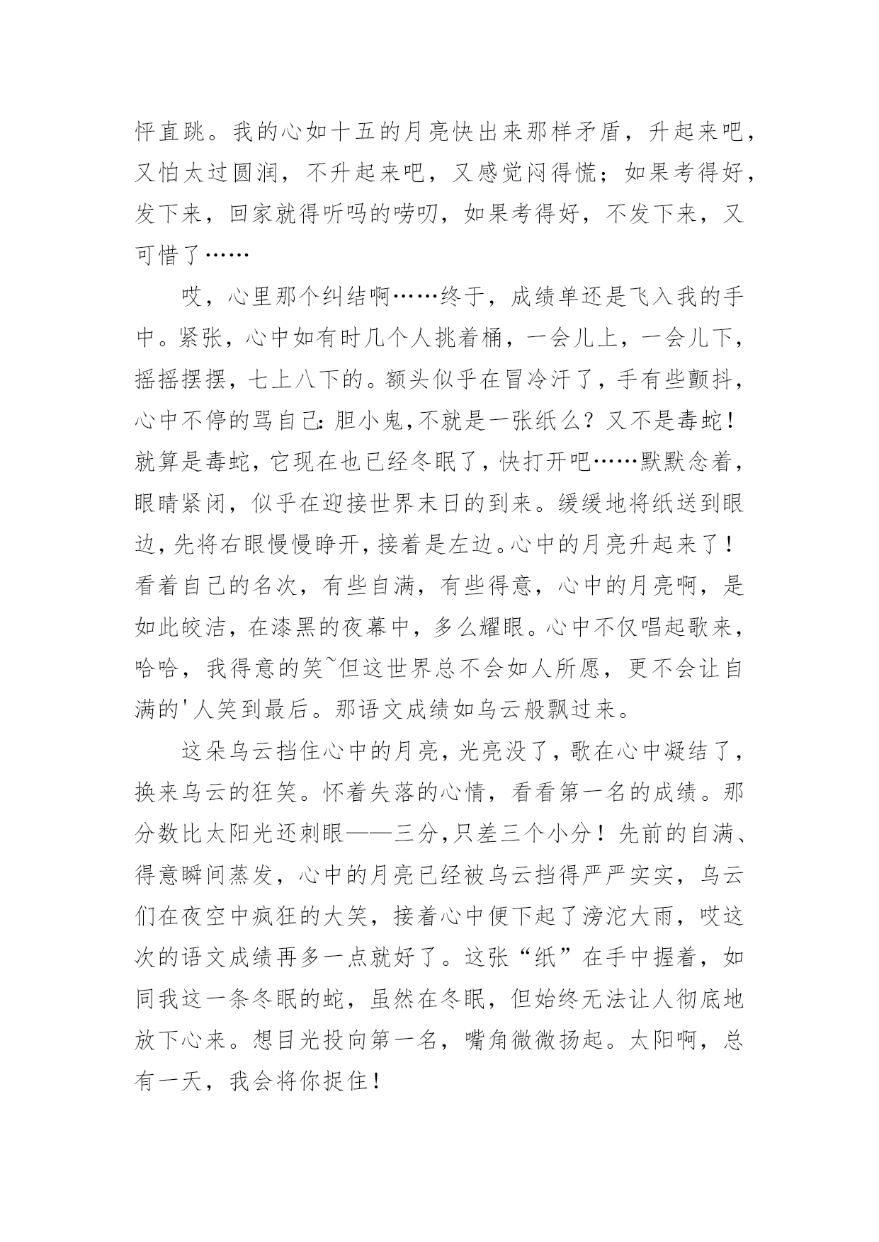 当我拿到成绩单时作文 当我拿到成绩单时作文在学习、工作、生活中,大家都有写作文的经历,对作文很是熟悉吧,作文可分为小学作文、中学作文、大学作文(论文)。那么你有了解过作文吗?下面是小编整理的当我拿到成绩单时作文,希望对大家有所帮助。当我拿到成绩单时作文1考试不久,成绩单就出来了。课代表发成绩单时,心怦怦直跳。我的心如十五的月亮快出来那样矛盾,升起来吧,又怕太过圆润,不升起来吧,又感觉闷得慌;如果考得好,发下来,回家就得听吗的唠叨,如果考得好,不发下来,又可惜了……哎,心里那个纠结啊……终于,成绩单还是飞入我的手中。紧张,心中如有时几个人挑着桶,一会儿上,一会儿下,摇摇摆摆,七上八下的。额头似乎在冒冷汗了,手有些颤抖,心中不停的骂自己:胆小鬼,不就是一张纸么?又不是毒蛇!就算是毒蛇,它现在也已经冬眠了,快打开吧……默默念着,眼睛紧闭,似乎在迎接世界末日的到来。缓缓地将纸送到眼边,先将右眼慢慢睁开,接着是左边。心中的月亮升起来了!看着自己的名次,有些自满,有些得意,心中的月亮啊,是如此皎洁,在漆黑的夜幕中,多么耀眼。心中不仅唱起歌来,哈哈,我得意的笑~但这世界总不会如人所愿,更不会让自满的人笑到最后。那语文成绩如乌云般飘过来。这朵乌云挡住心中的月亮,光亮没了,歌在心中凝结了,换来乌云的.狂笑。怀着失落的心情,看看第一名的成绩。那分数比太阳光还刺眼——三分,只差三个小分!先前的自满、得意瞬间蒸发,心中的月亮已经被乌云挡得严严实实,乌云们在夜空中疯狂的大笑,接着心中便下起了滂沱大雨,哎这次的语文成绩再多一点就好了。这张“纸”在手中握着,如同我这一条冬眠的蛇,虽然在冬眠,但始终无法让人彻底地放下心来。想目光投向第一名,嘴角微微扬起。太阳啊,总有一天,我会将你捉住!当我拿到成绩单时作文2考试不久。成绩单就出来了。课代表发成绩单的时候。我的心碰碰直跳。如十五的月亮快出来时那样矛盾。升起来吧,又怕太过圆滑。不升起来吧。又感觉闷的慌。如果考的不好,发下来,回家就得听妈的唠叨。如果考的好,不发又太可惜了。心里那个纠结啊。终于,还是飞入我的手中。紧张,心中有十几个人,挑着桶一会上一会下,摇摇摆摆,七上八下的。额头似乎在冒冷汗。说有些颤抖,心中不停的骂自己。胆小鬼,不就是一张纸吗?又不是蛇,就算是现在已经冬眠了。快打开吧。默默念着。眼睛紧闭。似乎在迎接末日的到来。同桌被我这滑稽样子多的肚子都笑痛了,我缓缓的将纸送到眼边,慢慢睁开左眼,接着是右眼。心中的月亮升起来了。看着自己的分数。有点自满。心中的月亮。是如此皎洁。在漆黑的夜幕中。多么耀眼。心中不禁唱起歌了。哈哈。我得意的笑。但这世界总不会如人所愿,更不会让自满的人笑到最后。那生物成绩就如乌云般飘过来。这都乌云挡住了心中的月亮。亮光没了,歌在心中凝结了。换来了乌云的狂笑。摆着失落的.心情。看着第一名的成绩。那分数比阳光还刺眼。我的心好像被人狠狠地踩了一下。先前的自满得意瞬间中发。心中的月亮已经被乌云挡得严严实实。乌云们在夜空中疯狂的大笑。接着心中便下起了滂沱大雨。唉。这次生物成绩要是再多一点就好了。但是却握在手中,如同一条冬眠的蛇。虽然是在睡觉。但始终无法让人彻底放下心来。将目光投向第一名,嘴角微微扬起阳啊---------总有一天,我将会抓住你。当我拿到成绩单时作文3考试不久,成绩单就出来了。课代表发成绩单时,心怦怦直跳。我的心如十五的月亮快出来那样矛盾,升起来吧,又怕太过圆润,不升起来吧,又感觉闷得慌;如果考得好,发下来,回家就得听吗的唠叨,如果考得好,不发下来,又可惜了……哎,心里那个纠结啊……终于,成绩单还是飞入我的手中。紧张,心中如又是几个人挑着桶,一会儿上,一会儿下,摇摇摆摆,七上八下的。额头似乎在冒冷汗了,手有些颤抖,心中不停的骂自己:胆小鬼,不就是一张纸么?又不是毒蛇!就算是毒蛇,它现在也已经冬眠了,快打开吧……默默念着,眼睛紧闭,似乎在迎接世界末日的到来。缓缓地将纸送到眼边,先将右眼慢慢睁开,接着是左边。心中的月亮升起来了!看着自己的名次,有些自满,有些得意,心中的.月亮啊,是如此皎洁,在漆黑的夜幕中,多么耀眼。心中不仅唱起歌来,哈哈,我得意的笑~但这世界总不会如人所愿,更不会让自满的人笑到最后。那语文成绩如乌云般飘过来。这朵乌云挡住心中的月亮,光亮没了,歌在心中凝结了,换来乌云的狂笑。怀着失落的心情,看看第一名的成绩。那分数比太阳光还刺眼——三分,只差三个小分!先前的自满、得意瞬间蒸发,心中的月亮已经被乌云挡得严严实实,乌云们在夜空中疯狂的大笑,接着心中便下起了滂沱大雨,哎这次的语文成绩再多一点就好了。这张“纸”在手中握着,如同握着一条冬眠的蛇,虽然在冬眠,但始终无法让人彻底地放下心来。将目光投向第一名,嘴角微微扬起。太阳啊,总有一天,我会将你捉住!当我拿到成绩单时作文4考试不久