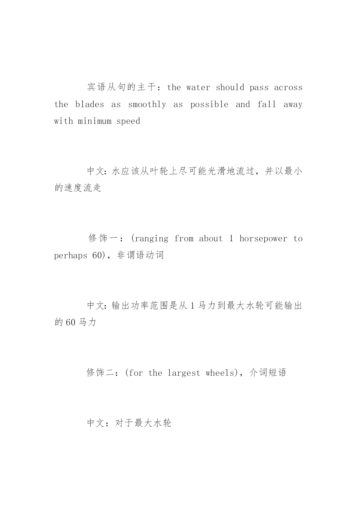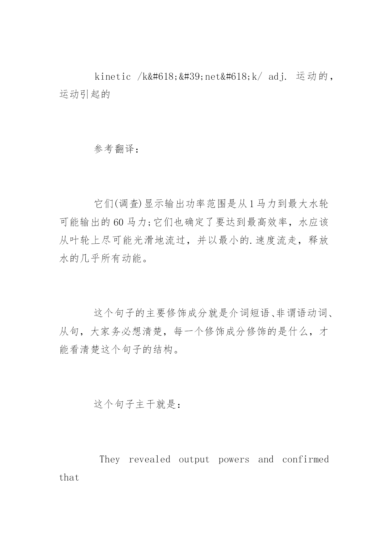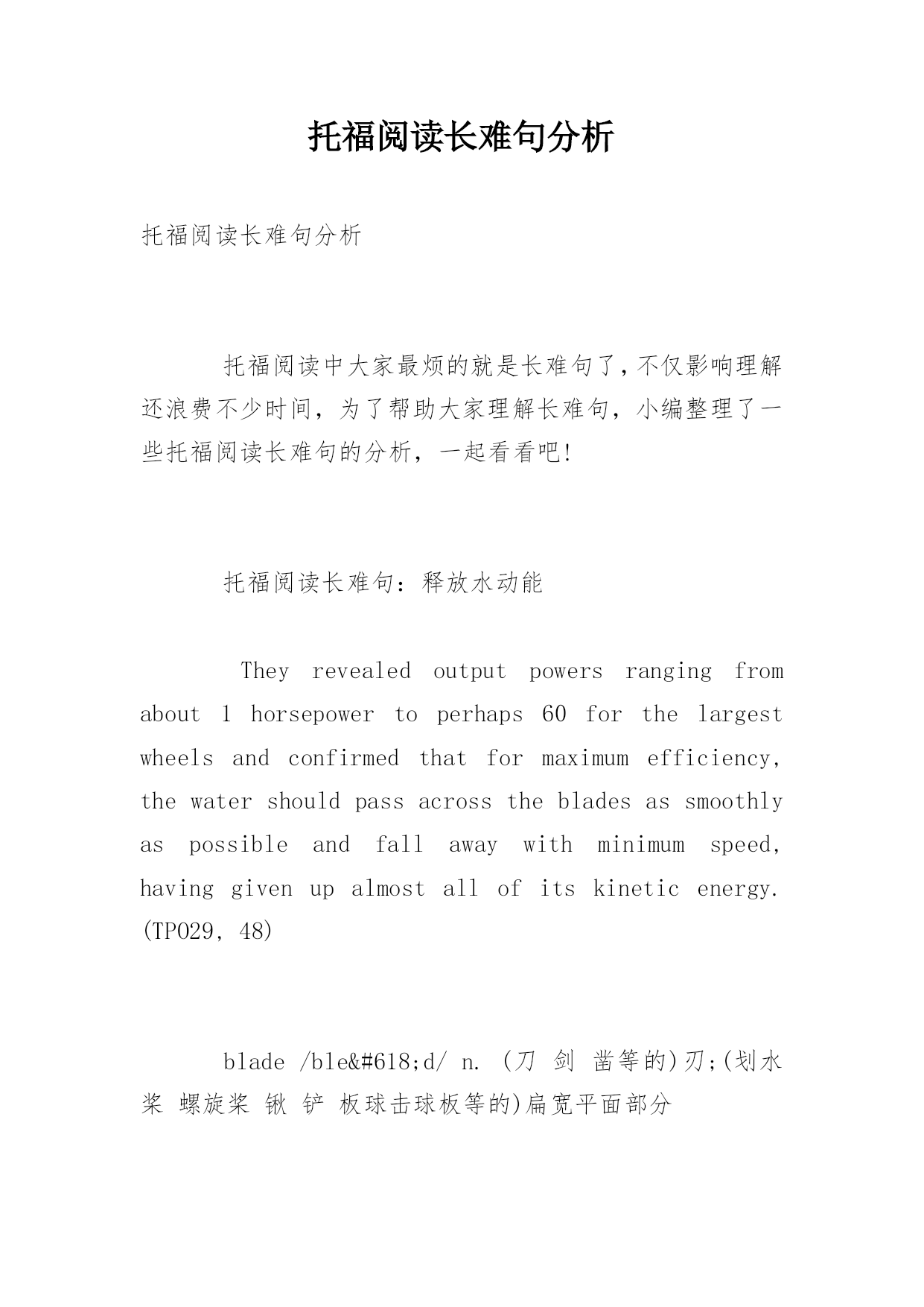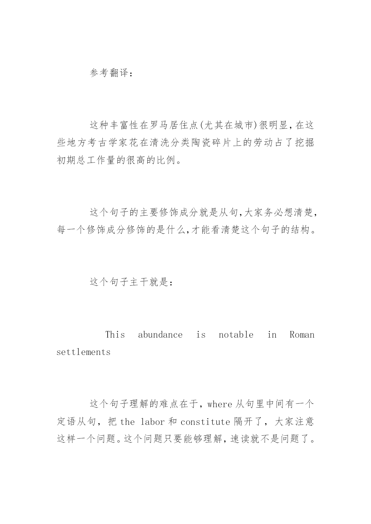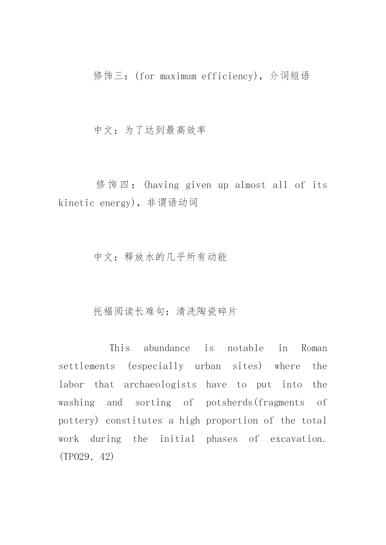 托福阅读长难句分析 托福阅读长难句分析 托福阅读中大家最烦的就是长难句了,不仅影响理解还浪费不少时间,为了帮助大家理解长难句,小编整理了一些托福阅读长难句的分析,一起看看吧! 托福阅读长难句:释放水动能 Theyrevealedoutputpowersrangingfromabout1horsepowertoperhaps60forthelargestwheelsandconfirmedthatformaximumefficiency,thewatershouldpassacrossthebladesassmoothlyaspossibleandfallawaywithminimumspeed,havinggivenupalmostallofitskineticenergy.(TPO29,48) blade/bleɪd/n.(刀剑凿等的)刃;(划水桨螺旋桨锹铲板球击球板等的)扁宽平面部分 kinetic/kɪ'netɪk/adj.运动的,运动引起的 参考翻译: 它们(调查)显示输出功率范围是从1马力到最大水轮可能输出的60马力;它们也确定了要达到最高效率,水应该从叶轮上尽可能光滑地流过,并以最小的.速度流走,释放水的几乎所有动能。 这个句子的主要修饰成分就是介词短语、非谓语动词、从句,大家务必想清楚,每一个修饰成分修饰的是什么,才能看清楚这个句子的结构。 这个句子主干就是: Theyrevealedoutputpowersandconfirmedthat 宾语从句的主干:thewatershouldpassacrossthebladesassmoothlyaspossibleandfallawaywithminimumspeed 中文:水应该从叶轮上尽可能光滑地流过,并以最小的速度流走 修饰一:(rangingfromabout1horsepowertoperhaps60),非谓语动词 中文:输出功率范围是从1马力到最大水轮可能输出的60马力 修饰二:(forthelargestwheels),介词短语 中文:对于最大水轮 修饰三:(formaximumefficiency),介词短语 中文:为了达到最高效率 修饰四:(havinggivenupalmostallofitskineticenergy),非谓语动词 中文:释放水的几乎所有动能 托福阅读长难句:清洗陶瓷碎片 ThisabundanceisnotableinRomansettlements(especiallyurbansites)wherethelaborthatarchaeologistshavetoputintothewashingandsortingofpotsherds(fragmentsofpottery)constitutesahighproportionofthetotalworkduringtheinitialphasesofexcavation.(TPO29,42) 参考翻译: 这种丰富性在罗马居住点(尤其在城市)很明显,在这些地方考古学家花在清洗分类陶瓷碎片上的劳动占了挖掘初期总工作量的很高的比例。 这个句子的主要修饰成分就是从句,大家务必想清楚,每一个修饰成分修饰的是什么,才能看清楚这个句子的结构。 这个句子主干就是: ThisabundanceisnotableinRomansettlements 这个句子理解的难点在于,where从句里中间有一个定语从句,把thelabor和constitute隔开了,大家注意这样一个问题。这个问题只要能够理解,速读就不是问题了。 修饰一:(wherethelaborconstitutesahighproportionofthetotalworkduringtheinitialphasesofexcavation),从句 中文:在这些地方劳动占了挖掘初期总工作量的很高的比例 修饰二:(thatarchaeologistshavetoputintothewashingandsortingofpotsherds(fragmentsofpottery)),从句,修饰labor,难点就在于这个从句的理解,其实就是putthelaborintothewashingandstoringofpotsherds 中文:考古学家花在清洗分类陶瓷碎片上的劳动