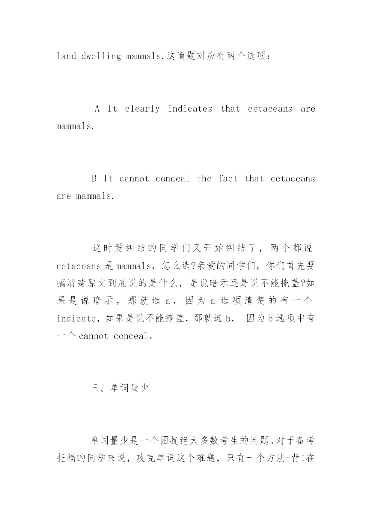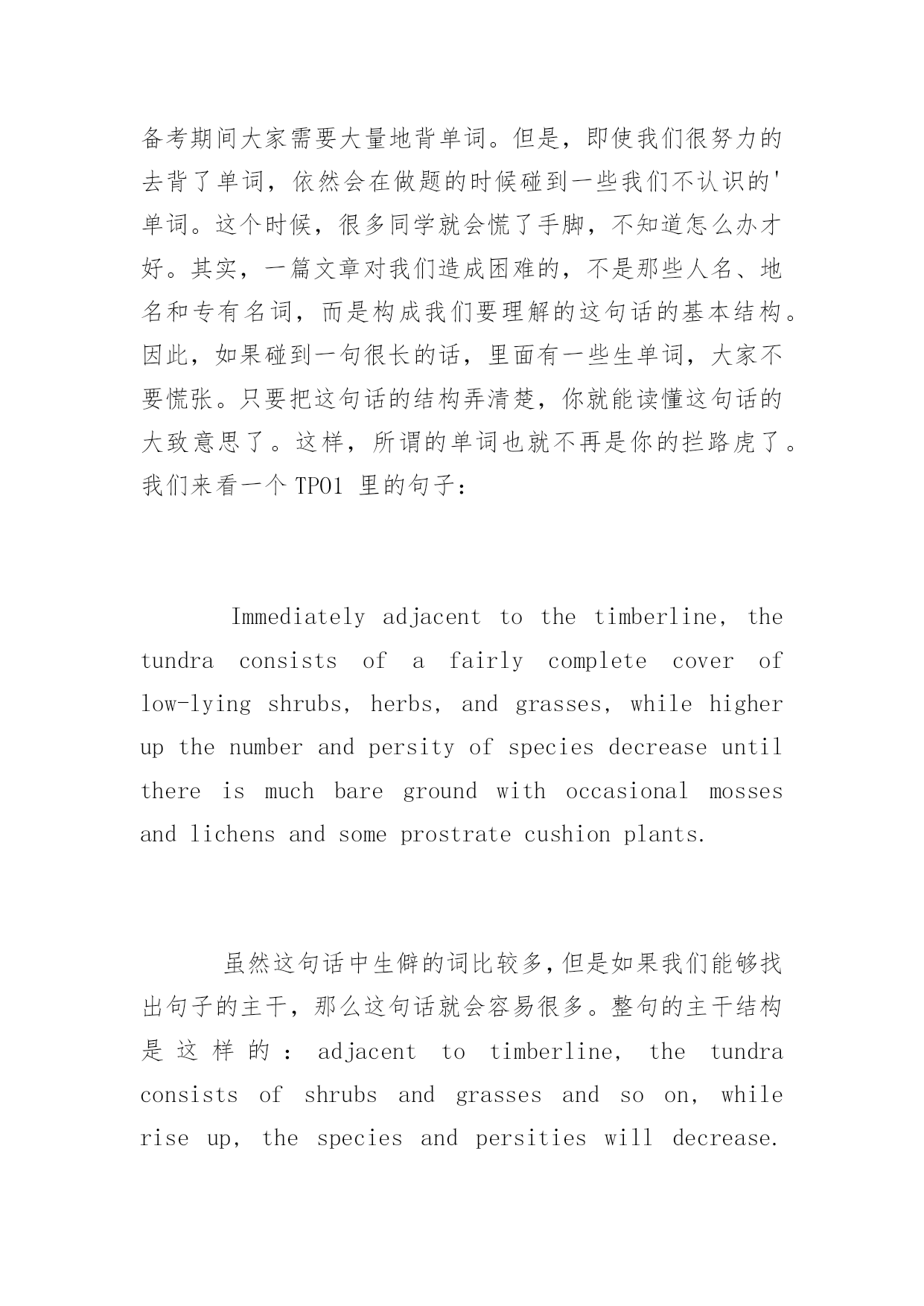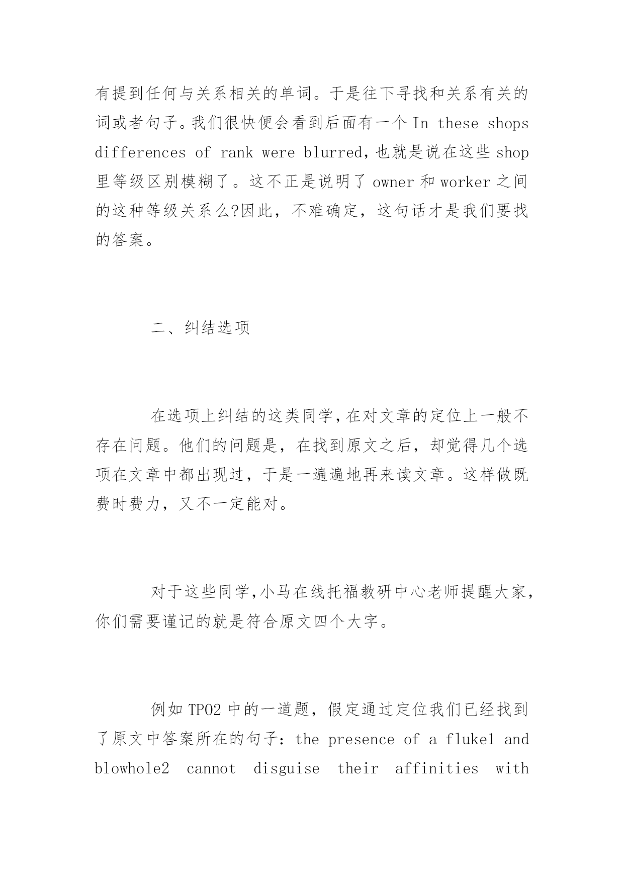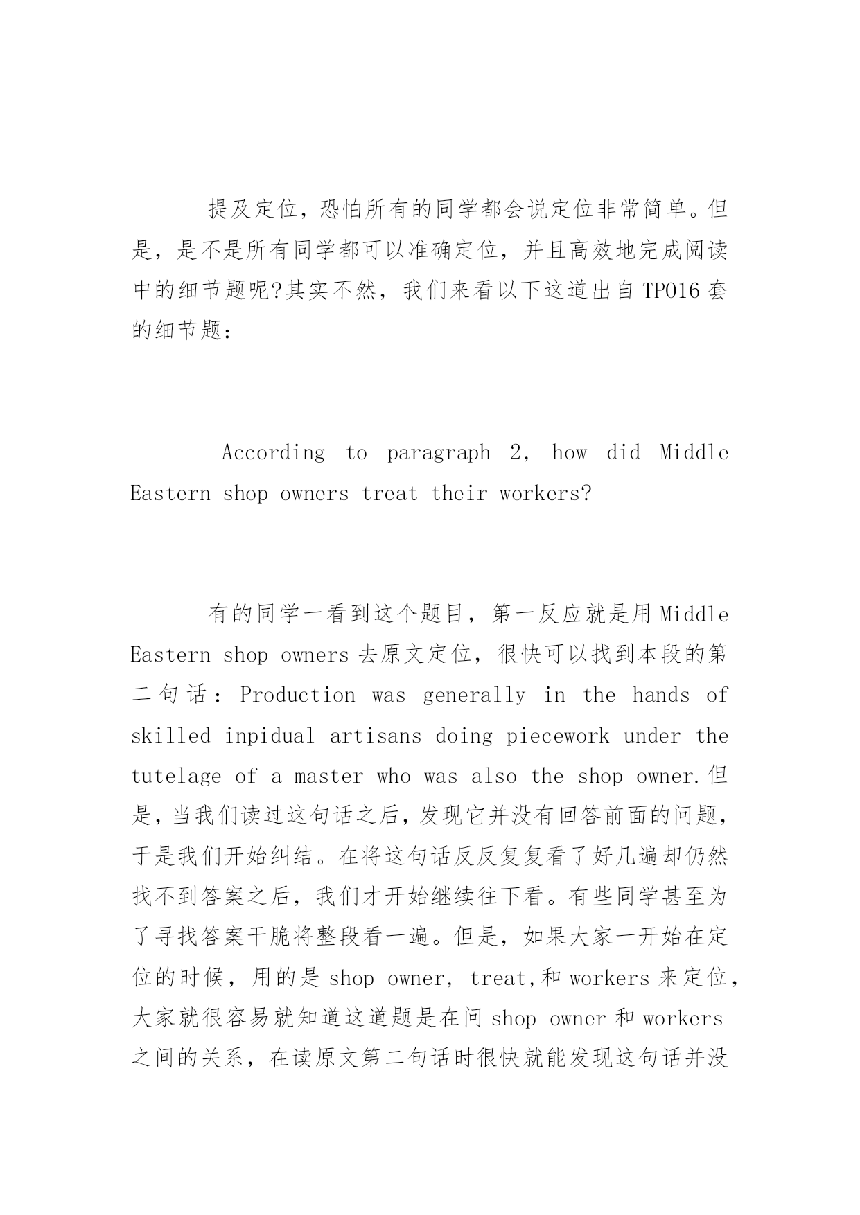 托福考试阅读细节题答题技巧 2016托福考试阅读细节题答题技巧 托福阅读既要不断的练习与积累,也有一定的技巧,为了帮助考生们更加有效的备考托福,以下是yjbys网小编整理的关于托福考试阅读细节题答题技巧,希望对同学们的托福阅读有所帮助。 几乎在每次托福考试之后,都可以听到某些同学对着细节题扼腕长叹道:我怎么这样的题也会错!是的,我们在上课的时候,反复听着老师一遍遍地说细节题的解题方法,自以为这些方法都早已烂熟于心,但是在做题的过程中却屡屡出错。这是为什么呢? 要解答这个问题,我们首先就要找到出错的地方,然后对症下药。那么接下来,由小马在线托福教研中心老师为大家介绍考生经常会出错的地方。这些地方大致可以分为以下三种情况: 一、不会定位 提及定位,恐怕所有的同学都会说定位非常简单。但是,是不是所有同学都可以准确定位,并且高效地完成阅读中的细节题呢?其实不然,我们来看以下这道出自TPO16套的细节题: Accordingtoparagraph2,howdidMiddleEasternshopownerstreattheirworkers? 有的同学一看到这个题目,第一反应就是用MiddleEasternshopowners去原文定位,很快可以找到本段的第二句话:Productionwasgenerallyinthehandsofskilledinpidualartisansdoingpieceworkunderthetutelageofamasterwhowasalsotheshopowner.但是,当我们读过这句话之后,发现它并没有回答前面的问题,于是我们开始纠结。在将这句话反反复复看了好几遍却仍然找不到答案之后,我们才开始继续往下看。有些同学甚至为了寻找答案干脆将整段看一遍。但是,如果大家一开始在定位的时候,用的是shopowner,treat,和workers来定位,大家就很容易就知道这道题是在问shopowner和workers之间的关系,在读原文第二句话时很快就能发现这句话并没有提到任何与关系相关的单词。于是往下寻找和关系有关的词或者句子。我们很快便会看到后面有一个Intheseshopsdifferencesofrankwereblurred,也就是说在这些shop里等级区别模糊了。这不正是说明了owner和worker之间的这种等级关系么?因此,不难确定,这句话才是我们要找的答案。 二、纠结选项 在选项上纠结的这类同学,在对文章的定位上一般不存在问题。他们的问题是,在找到原文之后,却觉得几个选项在文章中都出现过,于是一遍遍地再来读文章。这样做既费时费力,又不一定能对。 对于这些同学,小马在线托福教研中心老师提醒大家,你们需要谨记的就是符合原文四个大字。 例如TPO2中的一道题,假定通过定位我们已经找到了原文中答案所在的句子:thepresenceofafluke1andblowhole2cannotdisguisetheiraffinitieswithlanddwellingmammals.这道题对应有两个选项: AItclearlyindicatesthatcetaceansaremammals. BItcannotconcealthefactthatcetaceansaremammals. 这时爱纠结的同学们又开始纠结了,两个都说cetaceans是mammals,怎么选?亲爱的同学们,你们首先要搞清楚原文到底说的是什么,是说暗示还是说不能掩盖?如果是说暗示,那就选a,因为a选项清楚的有一个indicate,如果是说不能掩盖,那就选b,因为b选项中有一个cannotconceal。 三、单词量少 单词量少是一个困扰绝大多数考生的问题。对于备考托福的同学来说,攻克单词这个难题,只有一个方法-背!在备考期间大家需要大量地背单词。但是,即使我们很努力的去背了单词,依然会在做题的时候碰到一些我们不认识的'单词。这个时候,很多同学就会慌了手脚,不知道怎么办才好。其实,一篇文章对我们造成困难的,不是那些人名、地名和专有名词,而是构成我们要理解的这句话的基本结构。因此,如果碰到一句很长的话,里面有一些生单词,大家不要慌张。只要把这句话的结构弄清楚,你就能读懂这句话的大致意思了。这样,所谓的单词也就不再是你的拦路虎了。我们来看一个TPO1里的句子: Immediatelyadjacenttothetimberline,thetundraconsistsofafairlycompletecoveroflow-lyingshrubs,herbs,andgrasses,whilehigherupthenumberandpersityofspeciesdecreaseuntilthereismuchbaregroundwithoccas