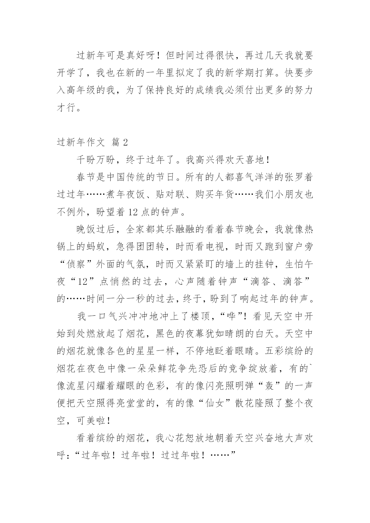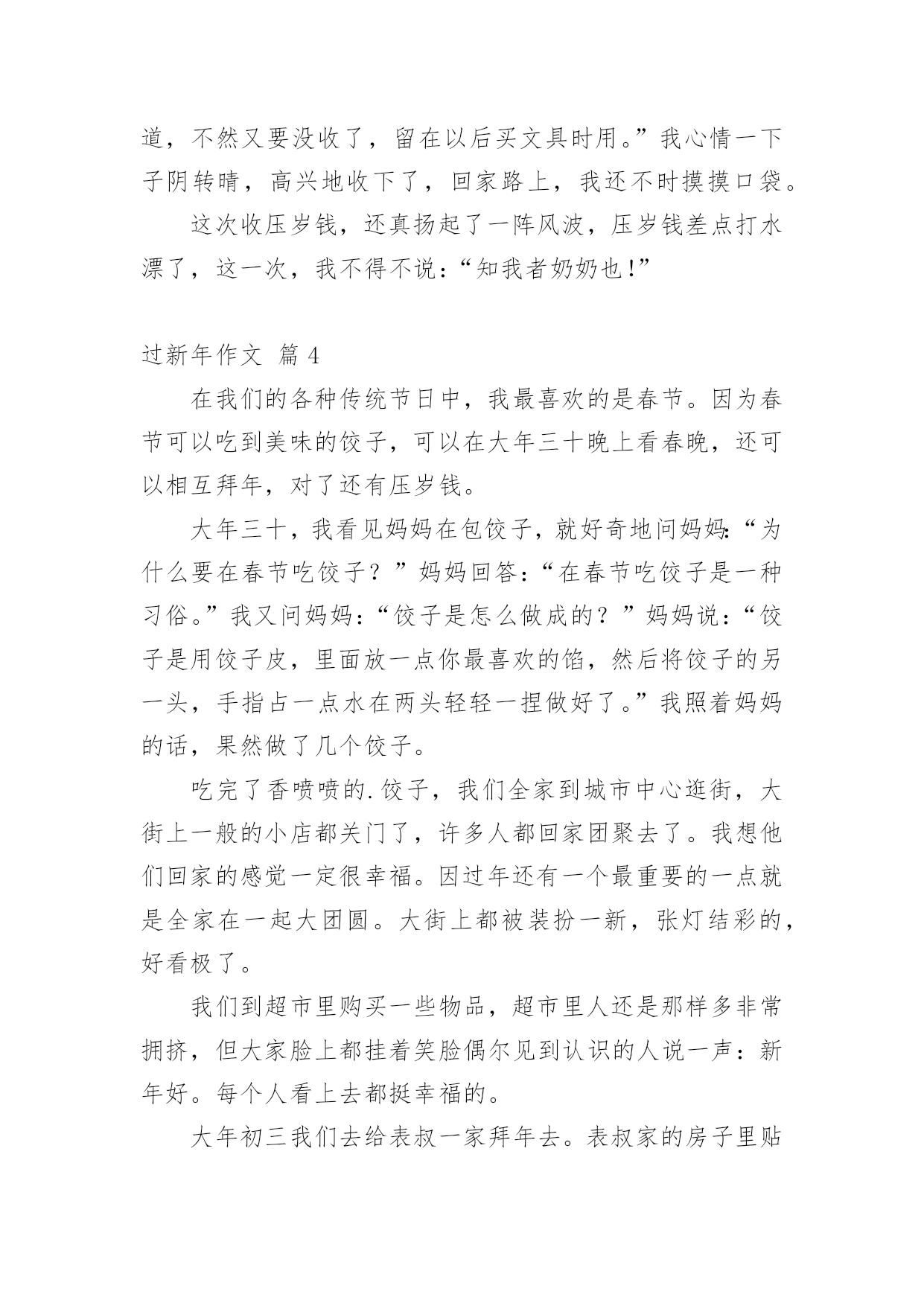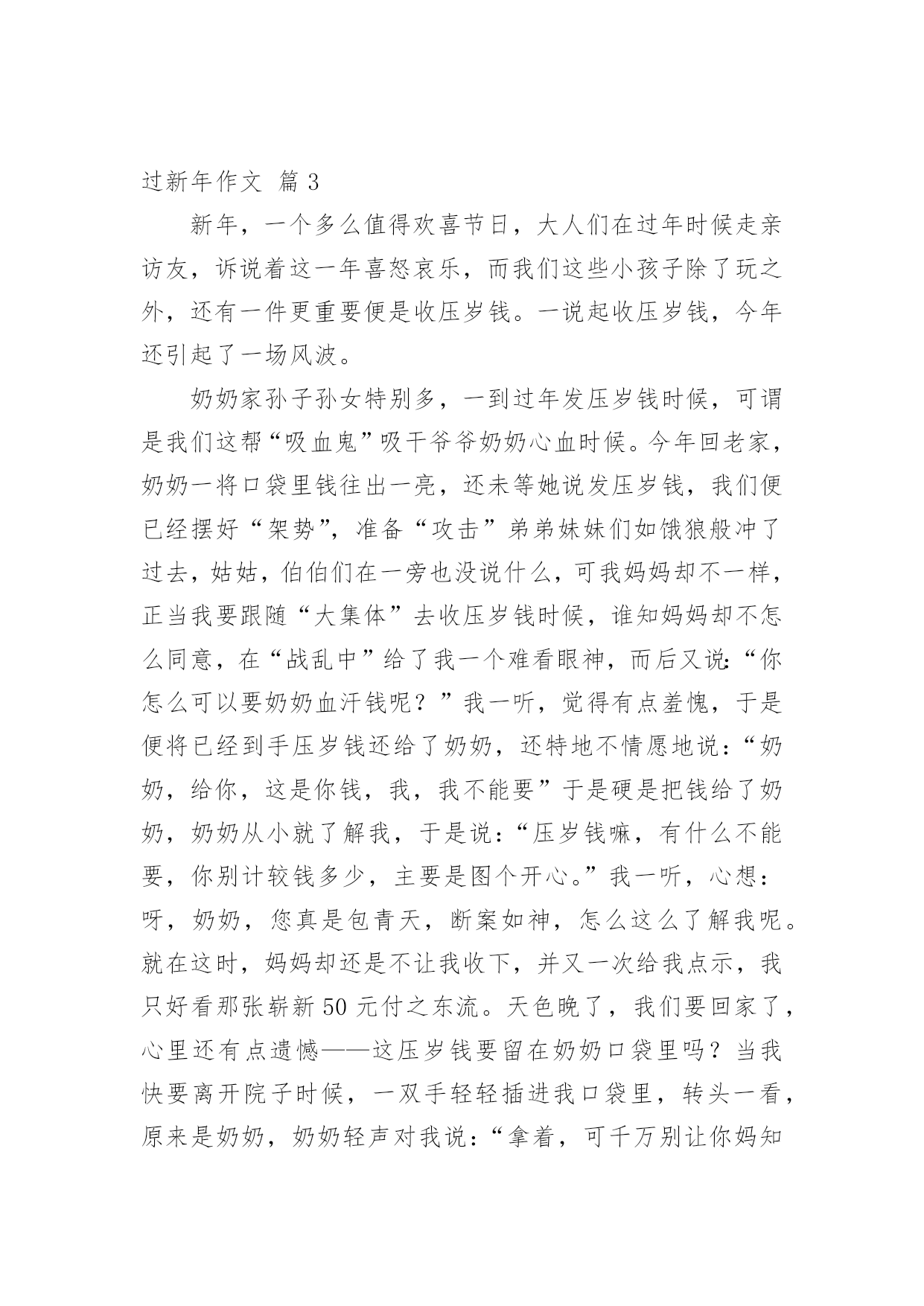 过新年作文 过新年作文(必备)在平平淡淡的学习、工作、生活中,许多人都有过写作文的经历,对作文都不陌生吧,作文根据体裁的不同可以分为记叙文、说明文、应用文、议论文。作文的注意事项有许多,你确定会写吗?以下是小编为大家整理的过新年作文4篇,供大家参考借鉴,希望可以帮助到有需要的朋友。过新年作文篇1时间过得真快,快得我都来不及回味了。明明记得才刚刚放假,怎么就快过年了?瞧!街上的行人熙熙攘攘,好热闹,节日的气氛浓起来了,那种景象真是让人开心,街上的彩灯、彩花、灯笼、全都挂出来,家家都开始办年货,超市里满是买新衣服,买糖果、桔仔、水产的人。小孩子开始叫爸妈买好鞭炮烟花等着过年,有些小朋友已等不及,晚上出来放鞭炮烟花啦!春节到了,我们的笑声也就到了,我们的红包也可以收获了。我们期待着春节的到来。春节那天,我们早早的起床,穿着一身崭新的衣服去爷爷家过年。爷爷住在叔叔家,每次到了除夕,都是我们去到叔叔家,祝爷爷奶奶身体健康,当然,我们小孩子更高兴地是爷爷会给我们每个人一个红包,那红包里的钱是可以自己支配的,而其它的红包必须充公,交到爸爸妈妈那里去的,说是要留着给我们读书用的.。过新年可是真好呀!但时间过得很快,再过几天我就要开学了,我也在新的一年里拟定了我的新学期打算。快要步入高年级的我,为了保持良好的成绩我必须付出更多的努力才行。过新年作文篇2千盼万盼,终于过年了。我高兴得欢天喜地!春节是中国传统的节日。所有的人都喜气洋洋的张罗着过过年……煮年夜饭、贴对联、购买年货……我们小朋友也不例外,盼望着12点的钟声。晚饭过后,全家都其乐融融的看着春节晚会,我就像热锅上的蚂蚁,急得团团转,时而看电视,时而又跑到窗户旁“侦察”外面的气氛,时而又紧紧盯的墙上的挂钟,生怕午夜“12”点悄然的过去,心声随着钟声“滴答、滴答”的……时间一分一秒的过去,终于,盼到了响起过年的钟声。我一口气兴冲冲地冲上了楼顶,“哗”!看见天空中开始到处燃放起了烟花,黑色的夜幕犹如晴朗的白天。天空中的烟花就像各色的星星一样,不停地眨着眼睛。五彩缤纷的烟花在夜色中像一朵朵鲜花争先恐后的竞争绽放着,有的`像流星闪耀着耀眼的色彩,有的像闪亮照明弹“轰”的一声便把天空照得亮堂堂的,有的像“仙女”散花隆照了整个夜空,可美啦!看着缤纷的烟花,我心花恕放地朝着天空兴奋地大声欢呼:“过年啦!过年啦!过过年啦!……”过新年作文篇3新年,一个多么值得欢喜节日,大人们在过年时候走亲访友,诉说着这一年喜怒哀乐,而我们这些小孩子除了玩之外,还有一件更重要便是收压岁钱。一说起收压岁钱,今年还引起了一场风波。奶奶家孙子孙女特别多,一到过年发压岁钱时候,可谓是我们这帮“吸血鬼”吸干爷爷奶奶心血时候。今年回老家,奶奶一将口袋里钱往出一亮,还未等她说发压岁钱,我们便已经摆好“架势”,准备“攻击”弟弟妹妹们如饿狼般冲了过去,姑姑,伯伯们在一旁也没说什么,可我妈妈却不一样,正当我要跟随“大集体”去收压岁钱时候,谁知妈妈却不怎么同意,在“战乱中”给了我一个难看眼神,而后又说:“你怎么可以要奶奶血汗钱呢?”我一听,觉得有点羞愧,于是便将已经到手压岁钱还给了奶奶,还特地不情愿地说:“奶奶,给你,这是你钱,我,我不能要”于是硬是把钱给了奶奶,奶奶从小就了解我,于是说:“压岁钱嘛,有什么不能要,你别计较钱多少,主要是图个开心。”我一听,心想:呀,奶奶,您真是包青天,断案如神,怎么这么了解我呢。就在这时,妈妈却还是不让我收下,并又一次给我点示,我只好看那张崭新50元付之东流。天色晚了,我们要回家了,心里还有点遗憾——这压岁钱要留在奶奶口袋里吗?当我快要离开院子时候,一双手轻轻插进我口袋里,转头一看,原来是奶奶,奶奶轻声对我说:“拿着,可千万别让你妈知道,不然又要没收了,留在以后买文具时用。”我心情一下子阴转晴,高兴地收下了,回家路上,我还不时摸摸口袋。这次收压岁钱,还真扬起了一阵风波,压岁钱差点打水漂了,这一次,我不得不说:“知我者奶奶也!”过新年作文篇4在我们的各种传统节日中,我最喜欢的是春节。因为春节可以吃到美味的饺子,可以在大年三十晚上看春晚,还可以相互拜年,对了还有压岁钱。大年三十,我看见妈妈在包饺子,就好奇地问妈妈:“为什么要在春节吃饺子?”妈妈回答:“在春节吃饺子是一种习俗。”我又问妈妈:“饺子是怎么做成的?”妈妈说:“饺子是用饺子皮,里面放一点你最喜欢的馅,然后将饺子的另一头,手指占一点水在两头轻轻一捏做好了。”我照着妈妈的话,果然做了几个饺子。吃完了香喷喷的.饺子,我们全家到城市中心逛街,大街上一般的小店都关门了,许多人都回家团聚去了。我想他们回家的感觉一定很幸福。因过年还有一个最重要的一点就是全家在一起大团圆。大街上都被装扮一新,张灯结彩的,好看极了。我们到超市里购买一些物品,超市里人还是那样多非常拥挤,但大