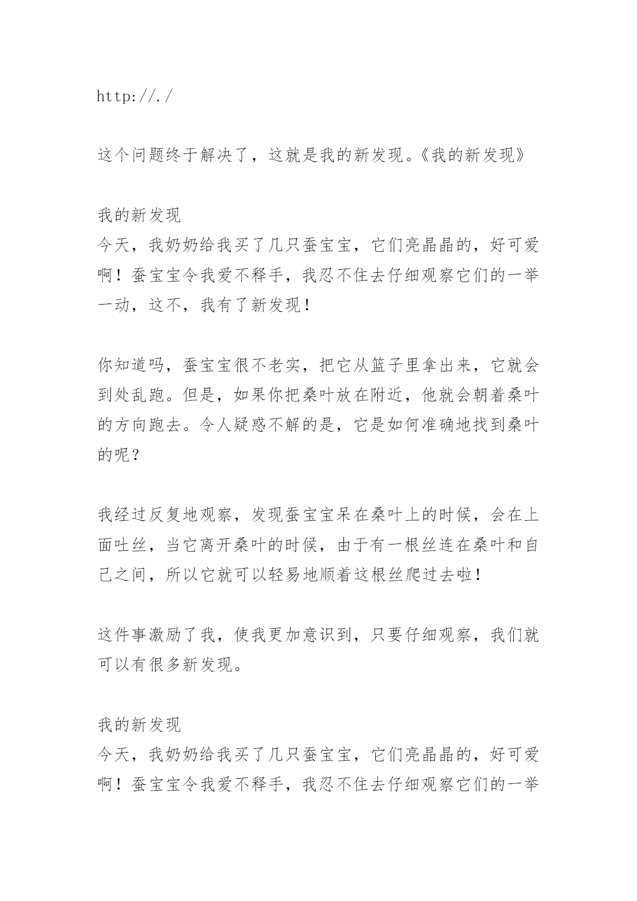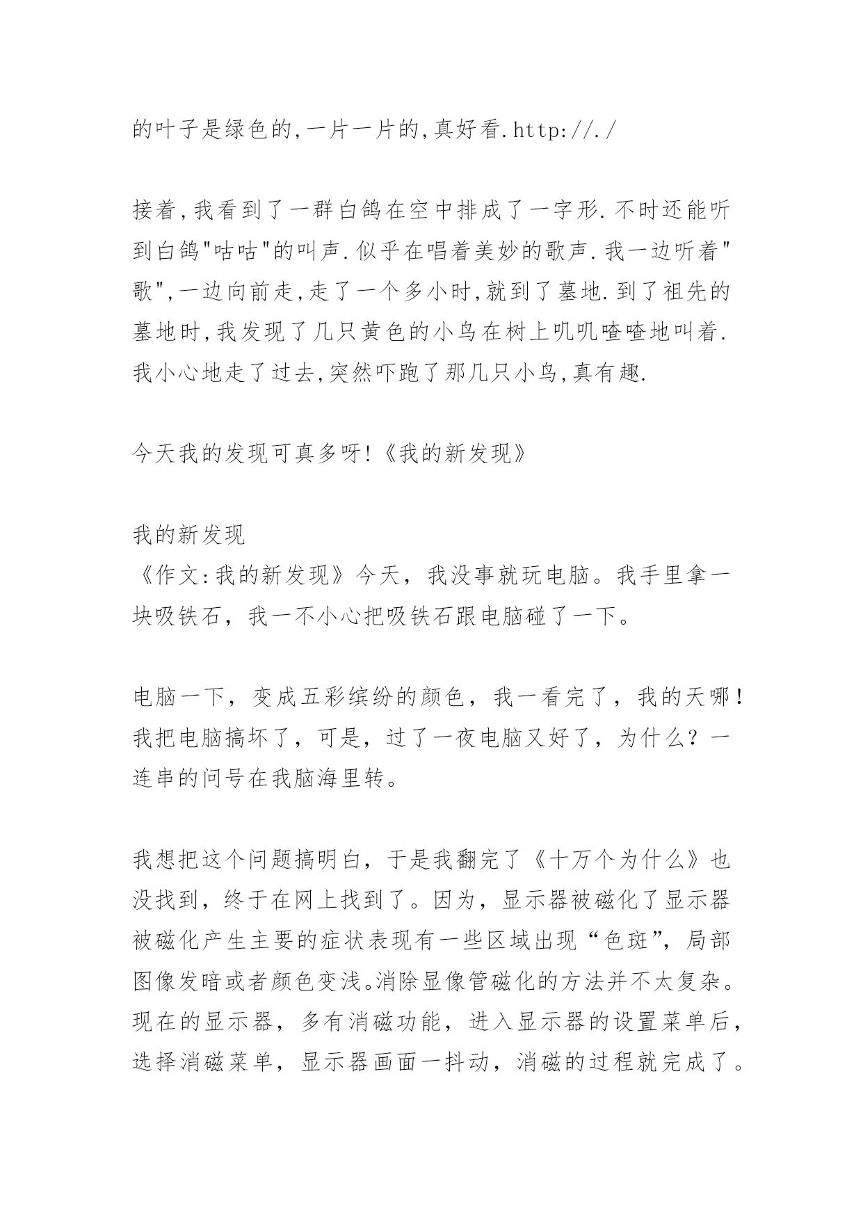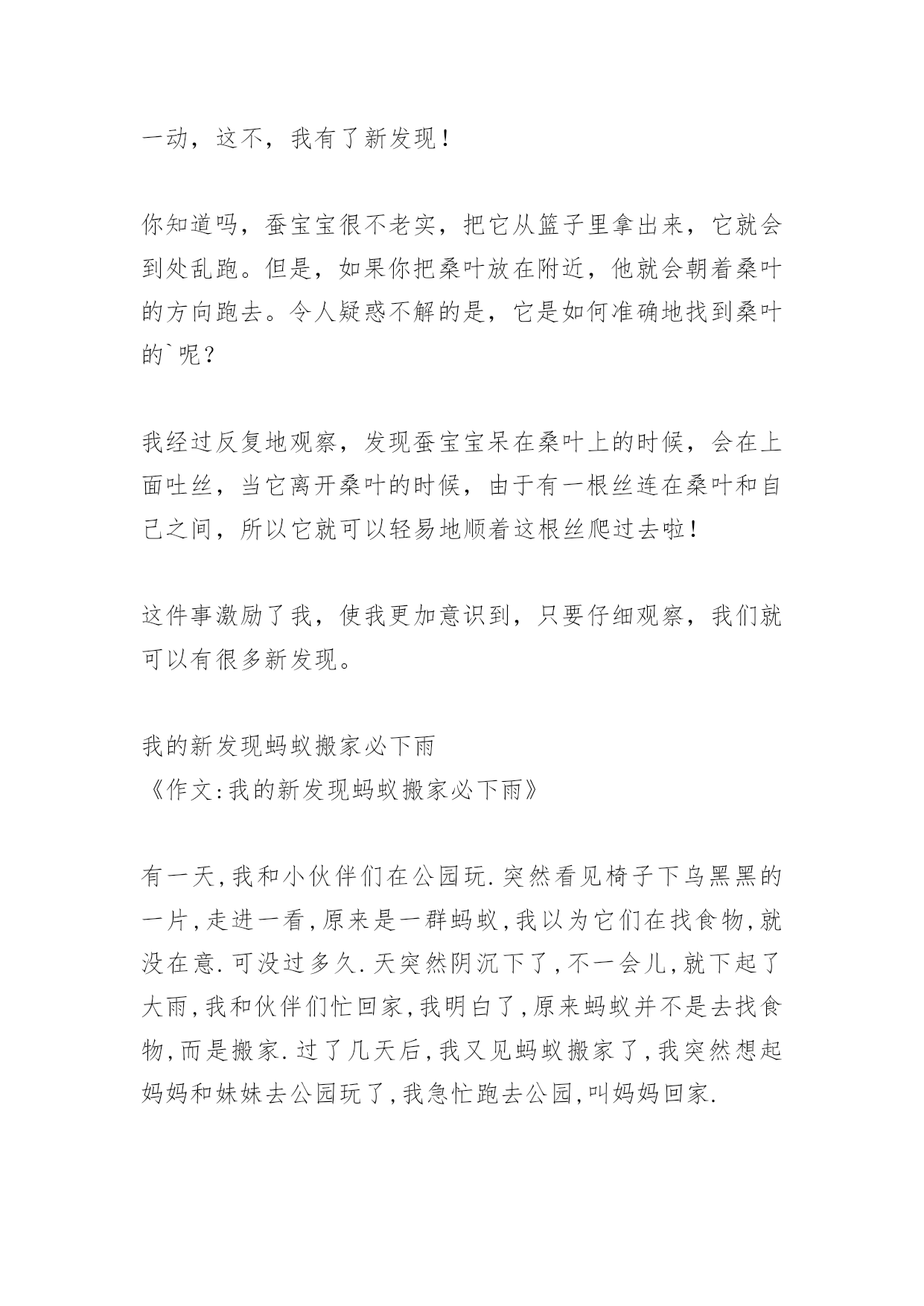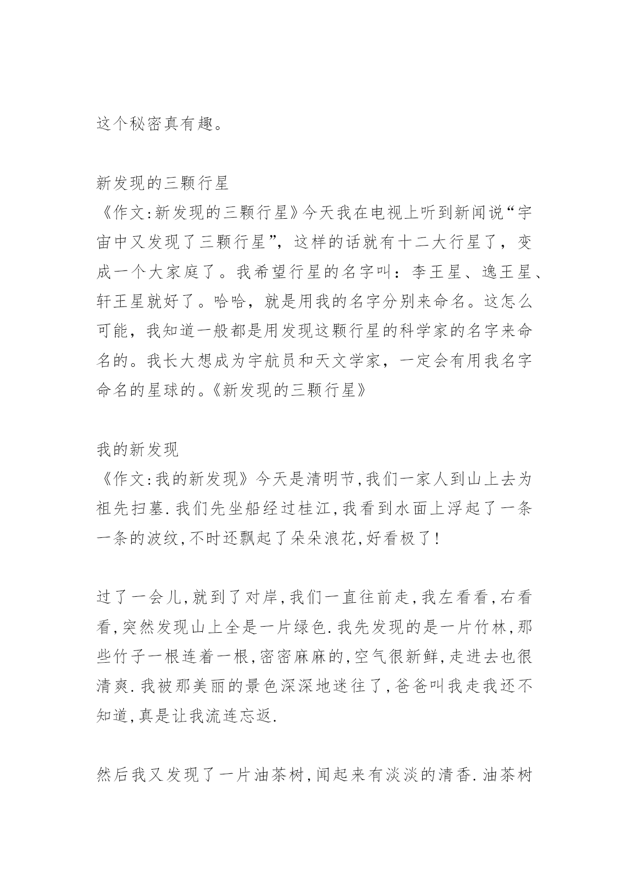 我的新发现作文 我的新发现作文我的新发现我的新发现晚上,我和爸爸去听安利的课,听完课。在回家的路上,我和爸爸的影子变大了,这是怎么一回事?我有疑问。到了第二天下午,我和爸爸去南峰山,可影子却变小了,真是奇怪。到底是怎么一回事啊?”到了星期天,陶老师补作文,也写这个,可是我不知道这个秘密是什么,所以没点题,被老师挨K了一顿。我想:没弄明白我是不会善罢甘休的。我就观察,晚上月亮离我们很远,下午太阳离我们很近。没什么的,我还是没弄懂。只好去问电脑。电脑上显示,当月亮离我们远时,影子会变大,当太阳离我们近时,影子会变小,原来如此,这个秘密太有意思了,解开了这个秘密,心里也甜滋滋的。这个秘密真有趣。新发现的三颗行星《作文:新发现的三颗行星》今天我在电视上听到新闻说“宇宙中又发现了三颗行星”,这样的话就有十二大行星了,变成一个大家庭了。我希望行星的名字叫:李王星、逸王星、轩王星就好了。哈哈,就是用我的名字分别来命名。这怎么可能,我知道一般都是用发现这颗行星的科学家的名字来命名的。我长大想成为宇航员和天文学家,一定会有用我名字命名的星球的。《新发现的三颗行星》我的新发现《作文:我的新发现》今天是清明节,我们一家人到山上去为祖先扫墓.我们先坐船经过桂江,我看到水面上浮起了一条一条的波纹,不时还飘起了朵朵浪花,好看极了!过了一会儿,就到了对岸,我们一直往前走,我左看看,右看看,突然发现山上全是一片绿色.我先发现的是一片竹林,那些竹子一根连着一根,密密麻麻的,空气很新鲜,走进去也很清爽.我被那美丽的景色深深地迷往了,爸爸叫我走我还不知道,真是让我流连忘返.然后我又发现了一片油茶树,闻起来有淡淡的清香.油茶树的叶子是绿色的,一片一片的,真好看.http://./接着,我看到了一群白鸽在空中排成了一字形.不时还能听到白鸽"咕咕"的叫声.似乎在唱着美妙的歌声.我一边听着"歌",一边向前走,走了一个多小时,就到了墓地.到了祖先的墓地时,我发现了几只黄色的小鸟在树上叽叽喳喳地叫着.我小心地走了过去,突然吓跑了那几只小鸟,真有趣.今天我的发现可真多呀!《我的新发现》我的新发现《作文:我的新发现》今天,我没事就玩电脑。我手里拿一块吸铁石,我一不小心把吸铁石跟电脑碰了一下。电脑一下,变成五彩缤纷的颜色,我一看完了,我的天哪!我把电脑搞坏了,可是,过了一夜电脑又好了,为什么?一连串的问号在我脑海里转。我想把这个问题搞明白,于是我翻完了《十万个为什么》也没找到,终于在网上找到了。因为,显示器被磁化了显示器被磁化产生主要的症状表现有一些区域出现“色斑”,局部图像发暗或者颜色变浅。消除显像管磁化的方法并不太复杂。现在的显示器,多有消磁功能,进入显示器的设置菜单后,选择消磁菜单,显示器画面一抖动,消磁的过程就完成了。http://./这个问题终于解决了,这就是我的新发现。《我的新发现》我的新发现今天,我奶奶给我买了几只蚕宝宝,它们亮晶晶的,好可爱啊!蚕宝宝令我爱不释手,我忍不住去仔细观察它们的一举一动,这不,我有了新发现!你知道吗,蚕宝宝很不老实,把它从篮子里拿出来,它就会到处乱跑。但是,如果你把桑叶放在附近,他就会朝着桑叶的方向跑去。令人疑惑不解的是,它是如何准确地找到桑叶的呢?我经过反复地观察,发现蚕宝宝呆在桑叶上的时候,会在上面吐丝,当它离开桑叶的时候,由于有一根丝连在桑叶和自己之间,所以它就可以轻易地顺着这根丝爬过去啦!这件事激励了我,使我更加意识到,只要仔细观察,我们就可以有很多新发现。我的新发现今天,我奶奶给我买了几只蚕宝宝,它们亮晶晶的,好可爱啊!蚕宝宝令我爱不释手,我忍不住去仔细观察它们的一举一动,这不,我有了新发现!你知道吗,蚕宝宝很不老实,把它从篮子里拿出来,它就会到处乱跑。但是,如果你把桑叶放在附近,他就会朝着桑叶的方向跑去。令人疑惑不解的是,它是如何准确地找到桑叶的`呢?我经过反复地观察,发现蚕宝宝呆在桑叶上的时候,会在上面吐丝,当它离开桑叶的时候,由于有一根丝连在桑叶和自己之间,所以它就可以轻易地顺着这根丝爬过去啦!这件事激励了我,使我更加意识到,只要仔细观察,我们就可以有很多新发现。我的新发现蚂蚁搬家必下雨《作文:我的新发现蚂蚁搬家必下雨》有一天,我和小伙伴们在公园玩.突然看见椅子下乌黑黑的一片,走进一看,原来是一群蚂蚁,我以为它们在找食物,就没在意.可没过多久.天突然阴沉下了,不一会儿,就下起了大雨,我和伙伴们忙回家,我明白了,原来蚂蚁并不是去找食物,而是搬家.过了几天后,我又见蚂蚁搬家了,我突然想起妈妈和妹妹去公园玩了,我急忙跑去公园,叫妈妈回家.回到家后,果然就下起了大雨,妈妈问我怎么知道下雨的?我说是蚂蚁告诉我的!"蚂蚁?怎么可能它又没长嘴巴,怎么回告诉你?''妈妈说.我说"是我在公园玩时看见蚂蚁搬家之后不久就下雨了,所以我才知道的.