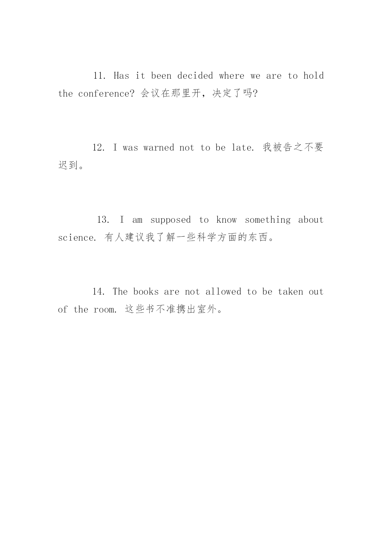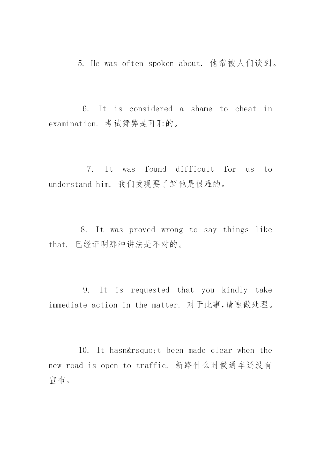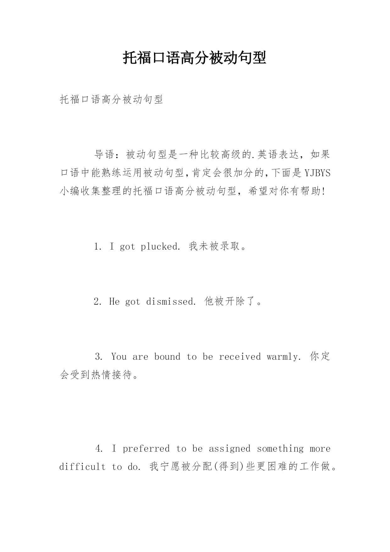 托福口语高分被动句型 托福口语高分被动句型 导语:被动句型是一种比较高级的.英语表达,如果口语中能熟练运用被动句型,肯定会很加分的,下面是YJBYS小编收集整理的托福口语高分被动句型,希望对你有帮助! 1.Igotplucked.我未被录取。 2.Hegotdismissed.他被开除了。 3.Youareboundtobereceivedwarmly.你定会受到热情接待。 4.Ipreferredtobeassignedsomethingmoredifficulttodo.我宁愿被分配(得到)些更困难的工作做。 5.Hewasoftenspokenabout.他常被人们谈到。 6.Itisconsideredashametocheatinexamination.考试舞弊是可耻的。 7.Itwasfounddifficultforustounderstandhim.我们发现要了解他是很难的。 8.Itwasprovedwrongtosaythingslikethat.已经证明那种讲法是不对的。 9.Itisrequestedthatyoukindlytakeimmediateactioninthematter.对于此事,请速做处理。 10.Ithasn’tbeenmadeclearwhenthenewroadisopentotraffic.新路什么时候通车还没有宣布。 11.Hasitbeendecidedwherewearetoholdtheconference?会议在那里开,决定了吗? 12.Iwaswarnednottobelate.我被告之不要迟到。 13.Iamsupposedtoknowsomethingaboutscience.有人建议我了解一些科学方面的东西。 14.Thebooksarenotallowedtobetakenoutoftheroom.这些书不准携出室外。