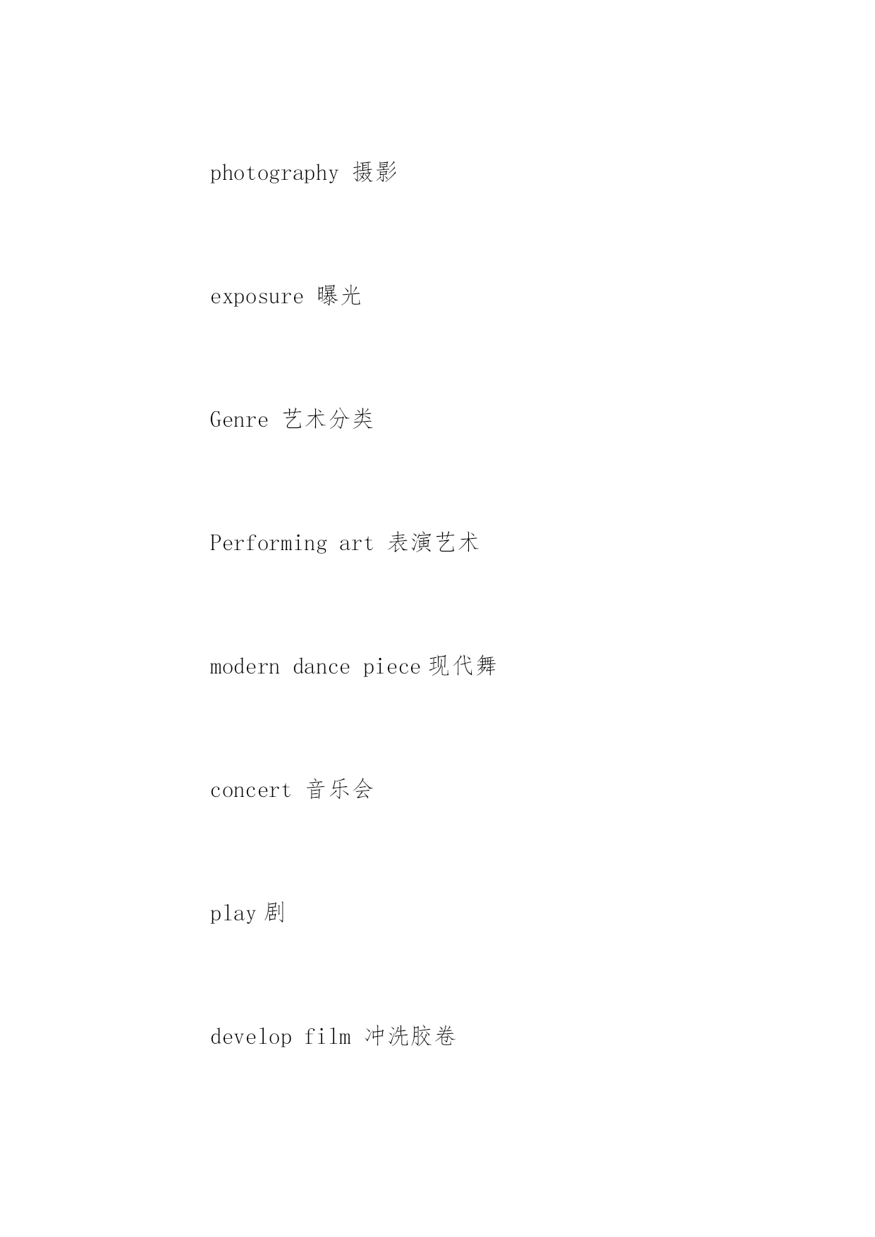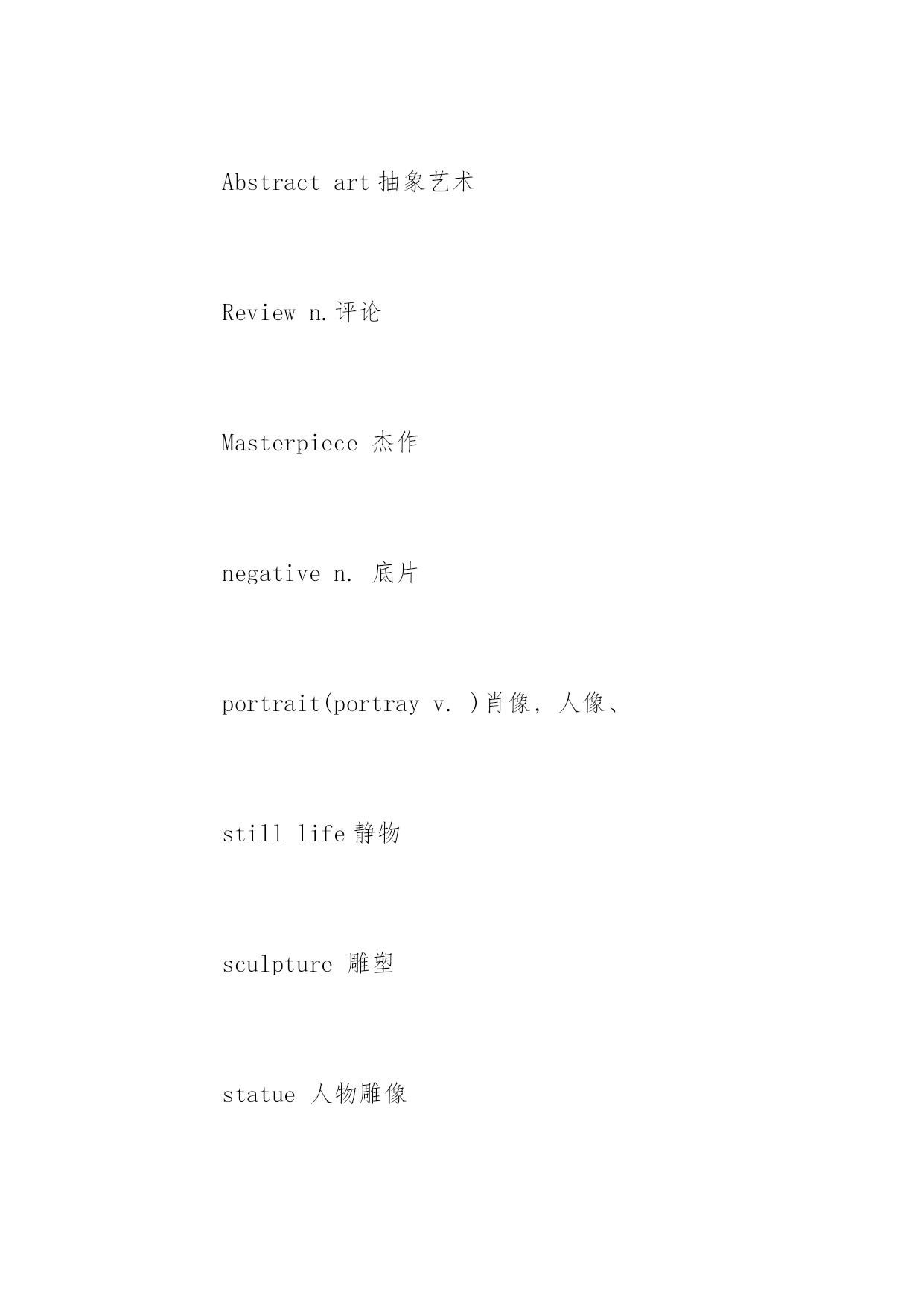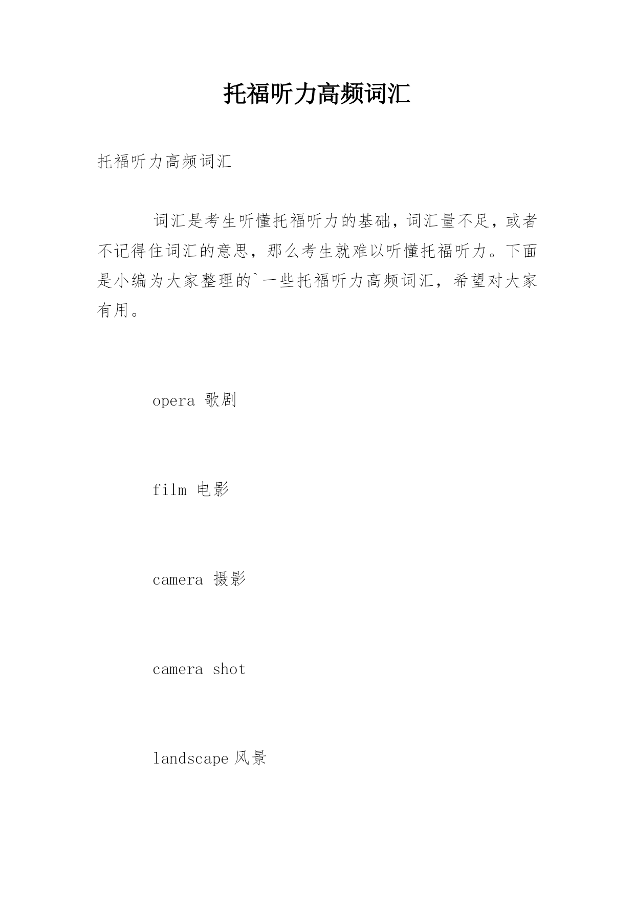 托福听力高频词汇 托福听力高频词汇 词汇是考生听懂托福听力的基础,词汇量不足,或者不记得住词汇的意思,那么考生就难以听懂托福听力。下面是小编为大家整理的`一些托福听力高频词汇,希望对大家有用。 opera歌剧 film电影 camera摄影 camerashot landscape风景 photography摄影 exposure曝光 Genre艺术分类 Performingart表演艺术 moderndancepiece现代舞 concert音乐会 play剧 developfilm冲洗胶卷 anthem国歌 Critic评论家 Criticism批评,评论 analytical分析的 parallel平行的 ballet芭蕾舞 choreographer舞蹈指导 Fine/visualarts视觉艺术 Abstractart抽象艺术 Reviewn.评论 Masterpiece杰作 negativen.底片 portrait(portrayv.)肖像,人像、 stilllife静物 sculpture雕塑 statue人物雕像 lifelike逼真的vivid