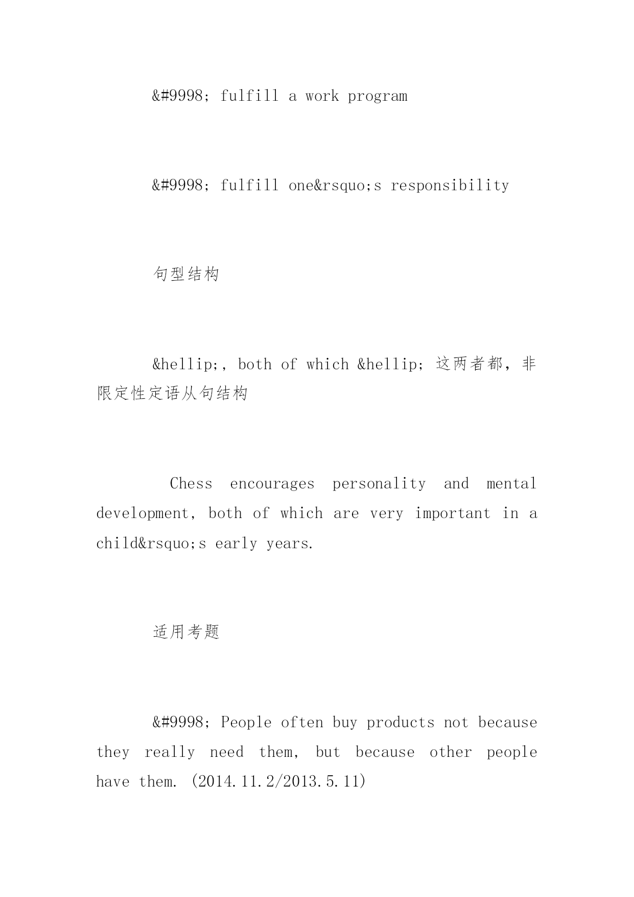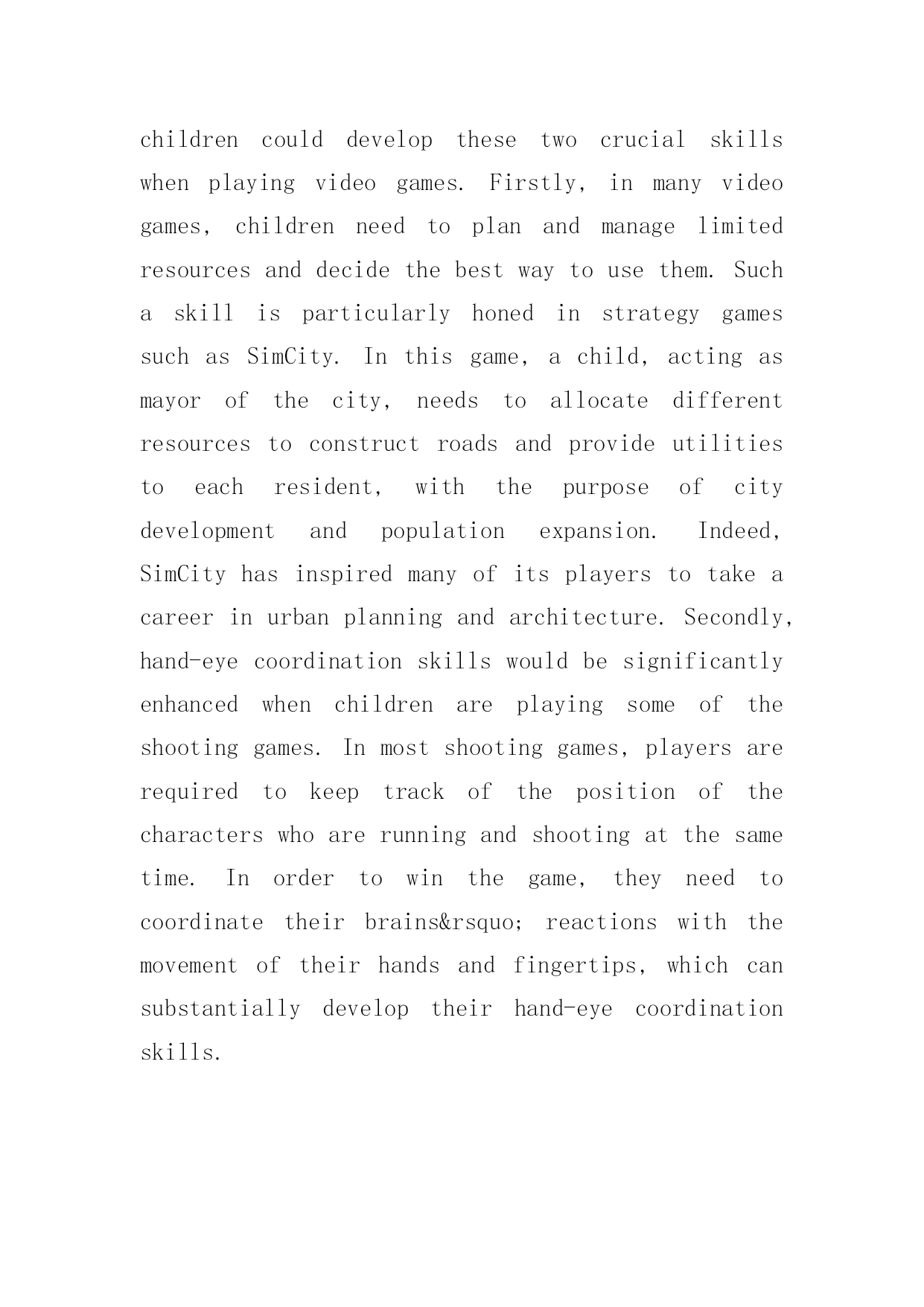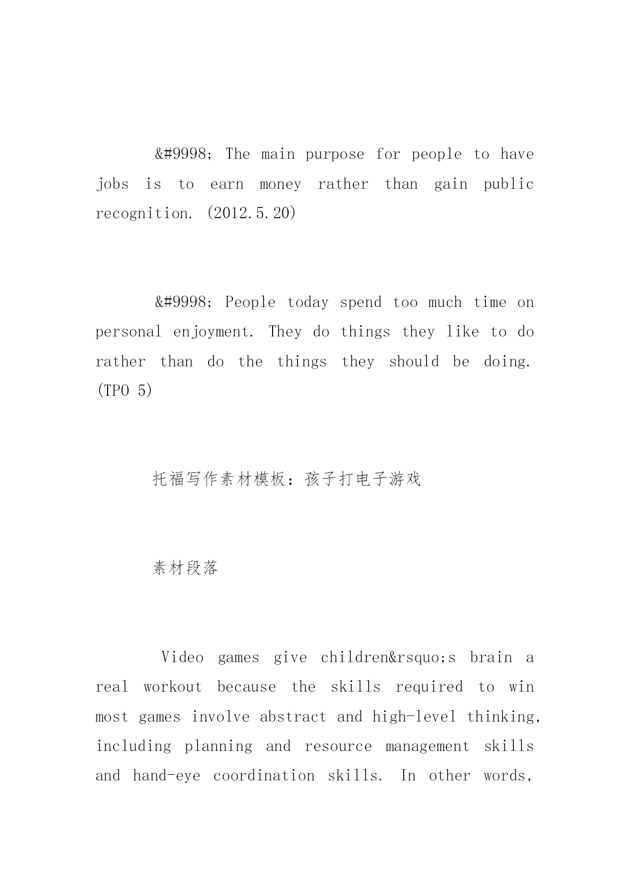 托福写作素材 托福写作素材模板 下面是小编整理的2016年托福写作素材模板,提供给大家复习参考。 2016年托福写作素材模板:马斯洛需求层次理论 素材段落 ConsumermotivationisassociatedwithMaslow’sHierarchyofNeedsTheory.Accordingtohistheory,motivationalforceshavedifferentlevelsofimportance.Themostcommonneedsarephysiologicalneeds(includingfoodandshelter)andsafetyneeds,bothofwhicharetightlyconnectedtobasicsurvival.Higher-levelneedsincludesocialneeds(includingrelationshipsandlove),esteemneeds(includingrecognitionandstatus)andself-actualizationneeds(alsoknownastheneedstofulfilloneself).InMaslow’sview,inpidualsmustmeettheirlower-levelneedsbeforebeingmotivatedtofulfilltheirhigher-levelneeds. 单词和词组 beassociatedwith与…相联系 =beconnectedto ✎Criteriaforthejudgmentofpurchasingdifferentproductsmaybeassociatedwithanumberofelements,particularlypersonalpreferencesandspecificfunctions. fulfill实现、满足=accomplish ✎fulfillaworkprogram ✎fulfillone’sresponsibility 句型结构 …,bothofwhich…这两者都,非限定性定语从句结构 Chessencouragespersonalityandmentaldevelopment,bothofwhichareveryimportantinachild’searlyyears. 适用考题 ✎Peopleoftenbuyproductsnotbecausetheyreallyneedthem,butbecauseotherpeoplehavethem.(2014.11.2/2013.5.11) ✎Themainpurposeforpeopletohavejobsistoearnmoneyratherthangainpublicrecognition.(2012.5.20) ✎Peopletodayspendtoomuchtimeonpersonalenjoyment.Theydothingstheyliketodoratherthandothethingstheyshouldbedoing.(TPO5) 托福写作素材模板:孩子打电子游戏 素材段落 Videogamesgivechildren’sbrainarealworkoutbecausetheskillsrequiredtowinmostgamesinvolveabstractandhigh-levelthinking,includingplanningandresourcemanagementskillsandhand-eyecoordinationskills.Inotherwords,childrencoulddevelopthesetwocrucialskillswhenplayingvideogames.Firstly,inmanyvideogames,childrenneedtoplanandmanagelimitedresourcesanddecidethebestwaytousethem.SuchaskillisparticularlyhonedinstrategygamessuchasSimCity.Inthisgame,achild,actingasmayorofthecity,needstoallocatedifferentresourcestoconstructroadsandprovideutilitiestoeachresident,withthepurposeofcity