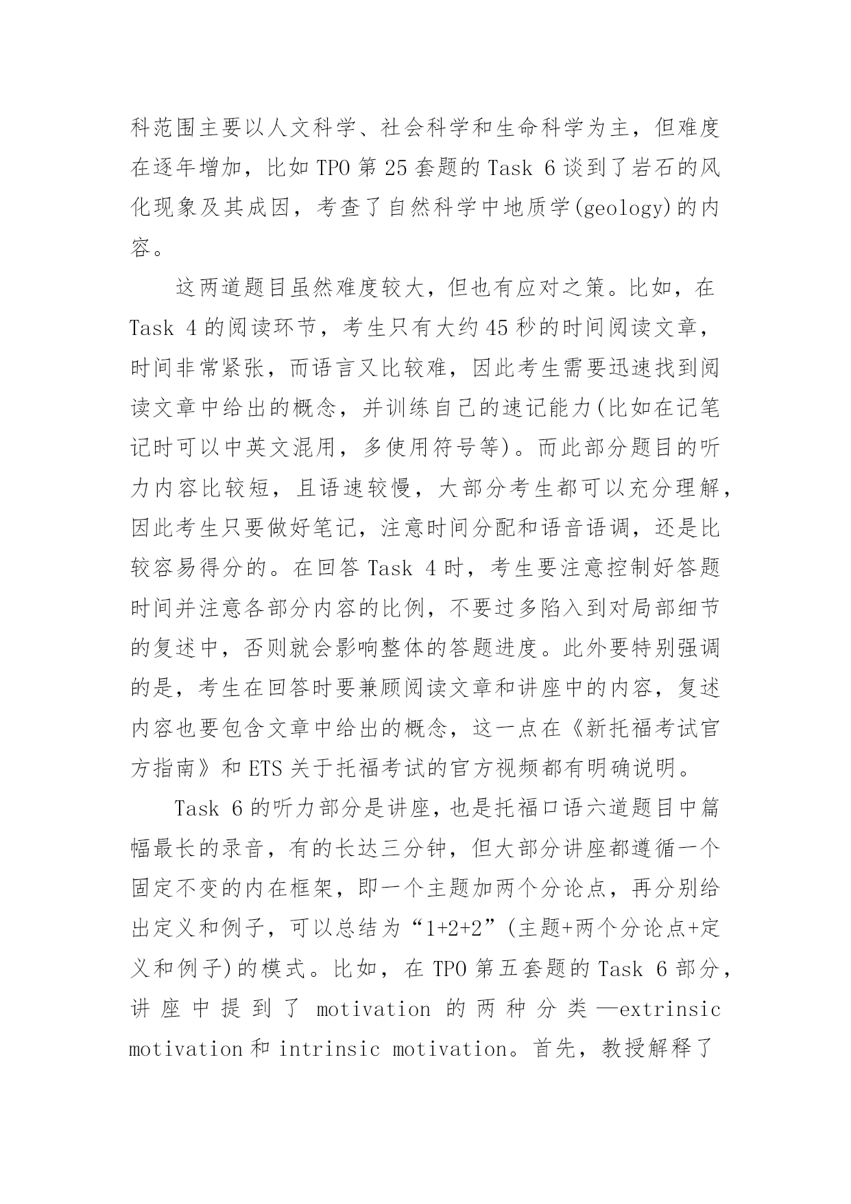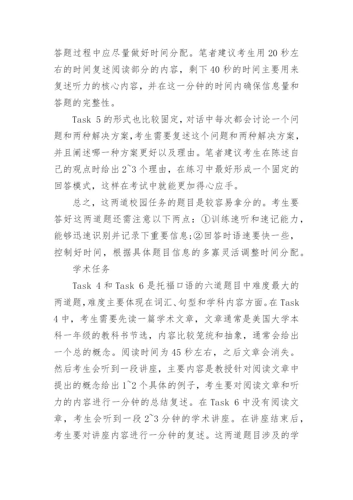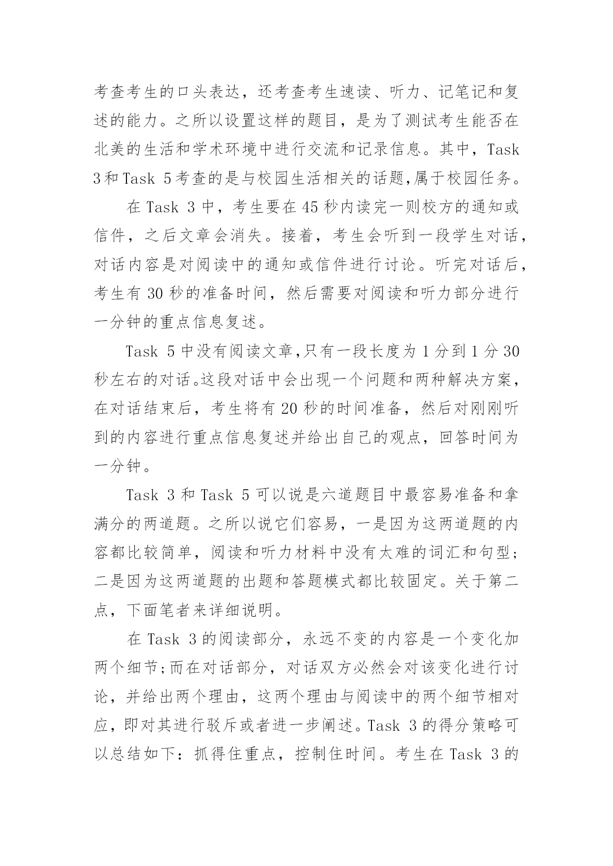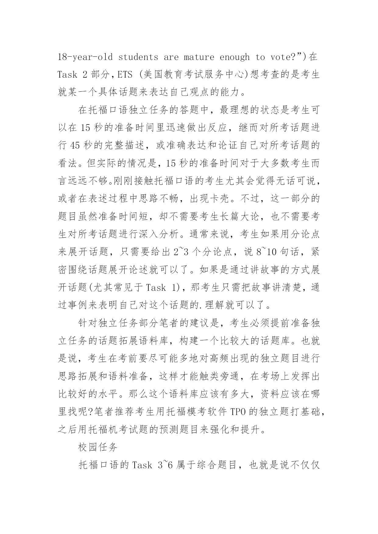 托福口语备考策略 托福口语备考策略托福考试的口语部分一直是许多考生心中的痛,就中国内地而言,考生的口语分数普遍偏低。以下是小编整理的关于托福口语备考策略,希望大家认真阅读!独立任务独立任务部分包含Task1和Task2两道题目。Task1常考的内容有人物、地点、物品和事件,考查的是考生对自己熟悉话题的描述。这一部分既有比较简单的题目(比如describethepersonyouadmirethemost或describetheplaceyouenjoyedgoingtowhenyouwereachild等),也有较难的题目(比如talkaboutanimportantpoliticalevent或describeyourfavoritepainting/poem等)。在这一部分,考生能够用自然、流畅的英文对所考话题进行描述是得分的关键。Task2会给出两个相近或者相反的选项,要求考生论述自己的选择。此部分同样有比较简单的题目(如watchingmoviesinthetheaterorathome,或readinge-booksorpaperbooks,或livingoncampusoroff-campus),也有较难的题目(如:“Isitthegovernmentortheprivatesectorthatshouldprotectendangeredspecies?”又如:“Doyouagreeordisagreethat18-year-oldstudentsarematureenoughtovote?”)在Task2部分,ETS(美国教育考试服务中心)想考查的是考生就某一个具体话题来表达自己观点的能力。在托福口语独立任务的答题中,最理想的状态是考生可以在15秒的准备时间里迅速做出反应,继而对所考话题进行45秒的完整描述,或准确表达和论证自己对所考话题的看法。但实际的情况是,15秒的准备时间对于大多数考生而言远远不够。刚刚接触托福口语的考生尤其会觉得无话可说,或者在表述过程中思路不畅,出现卡壳。不过,这一部分的题目虽然准备时间短,却不需要考生长篇大论,也不需要考生对所考话题进行深入分析。通常来说,考生如果用分论点来展开话题,只需要给出2~3个分论点,说8~10句话,紧密围绕话题展开论述就可以了。如果是通过讲故事的方式展开话题(尤其常见于Task1),那考生只需把故事讲清楚,通过事例来表明自己对这个话题的.理解就可以了。针对独立任务部分笔者的建议是,考生必须提前准备独立任务的话题拓展语料库,构建一个比较大的话题库。也就是说,考生在考前要尽可能多地对高频出现的独立题目进行思路拓展和语料准备,这样才能触类旁通,在考场上发挥出比较好的水平。那么这个语料库应该有多大,资料应该在哪里找呢?笔者推荐考生用托福模考软件TPO的独立题打基础,之后用托福机考试题的预测题目来强化和提升。校园任务托福口语的Task3~6属于综合题目,也就是说不仅仅考查考生的口头表达,还考查考生速读、听力、记笔记和复述的能力。之所以设置这样的题目,是为了测试考生能否在北美的生活和学术环境中进行交流和记录信息。其中,Task3和Task5考查的是与校园生活相关的话题,属于校园任务。在Task3中,考生要在45秒内读完一则校方的通知或信件,之后文章会消失。接着,考生会听到一段学生对话,对话内容是对阅读中的通知或信件进行讨论。听完对话后,考生有30秒的准备时间,然后需要对阅读和听力部分进行一分钟的重点信息复述。Task5中没有阅读文章,只有一段长度为1分到1分30秒左右的对话。这段对话中会出现一个问题和两种解决方案,在对话结束后,考生将有20秒的时间准备,然后对刚刚听到的内容进行重点信息复述并给出自己的观点,回答时间为一分钟。Task3和Task5可以说是六道题目中最容易准备和拿满分的两道题。之所以说它们容易,一是因为这两道题的内容都比较简单,阅读和听力材料中没有太难的词汇和句型;二是因为这两道题的出题和答题模式都比较固定。关于第二点,下面笔者来详细说明。在Task3的阅读部分,永远不变的内容是一个变化加两个细节;而在对话部分,对话双方必然会对该变化进行讨论,并给出两个理由,这两个理由与阅读中的两个细节相对应,即对其进行驳斥或者进一步阐述。Task3的得分策略可以总结如下:抓得住重点,控制住时间。考生在Task3的答题过程中应尽量做好时间分配。笔者建议考生用20秒左右的时间复述阅读部分的内容,剩下40秒的时间主要用来复述听力的核心内容,并在这一分钟的时间内确保信息量和答题的完整性。Task5的形式也比较固定,对话中每次都会讨论一个问题和两种解决方案,考生需要复述这个问题和两种解决方案,并且阐述哪一种方案更好以及理由。笔者建议考生在陈述自己的观点时给出2~3个理由,在练习
