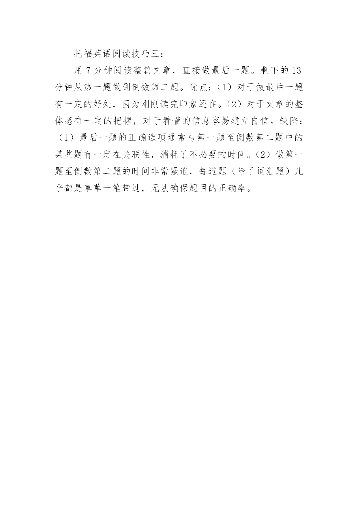 托福英语的阅读技巧有哪些 托福英语的阅读技巧有哪些托福英语阅读技巧一:用5分钟阅读整篇文章,形成对文章结构和关键内容的大致理解。剩下15分钟从第一题开始做到最后一题,先文后题:即先看每一段,然后解决对应的题目。优点:(1)对于文章的整体感有一定的'把握,对于看懂的信息容易建立自信。(2)有利于解决少数与段落主题有关的题目。缺陷:(1)不能在规定时间内完成(2)记不住段落的内容,做题时仍需返回段落,重新定位到具体的某句话来寻找答案。(3)做最后一题时,仍需重新阅读文章,因为距第一遍阅读文章已经时隔了十几分钟,不可能记得很清楚;或者凭借先前阅读后的大致印象选择答案,心理感觉没底。托福英语阅读技巧二:用15分钟做第一题至倒数第二题,先题后文:即读题目根据关键词定位到段落中的某句话,然后比对这句话和选项的含义,最后选出答案。剩下5分钟做最后一题。优点:(1)保证了绝大多数题目的正确率(2)确保在规定时间内完成。缺陷:(1)需要掌握简化后的解题方法,即上完强化班之后需要把习得的技巧进行简化后才能应用于实战。(2)对于第一题至倒数第二题中个别与全文结构或主题有关的题目不能在第一时间做出判断,只能放到做完最后一题之后完成,增加了考生的心理负担和翻页的时间损耗。托福英语阅读技巧三:用7分钟阅读整篇文章,直接做最后一题。剩下的13分钟从第一题做到倒数第二题。优点:(1)对于做最后一题有一定的好处,因为刚刚读完印象还在。(2)对于文章的整体感有一定的把握,对于看懂的信息容易建立自信。缺陷:(1)最后一题的正确选项通常与第一题至倒数第二题中的某些题有一定在关联性,消耗了不必要的时间。(2)做第一题至倒数第二题的时间非常紧迫,每道题(除了词汇题)几乎都是草草一笔带过,无法确保题目的正确率。