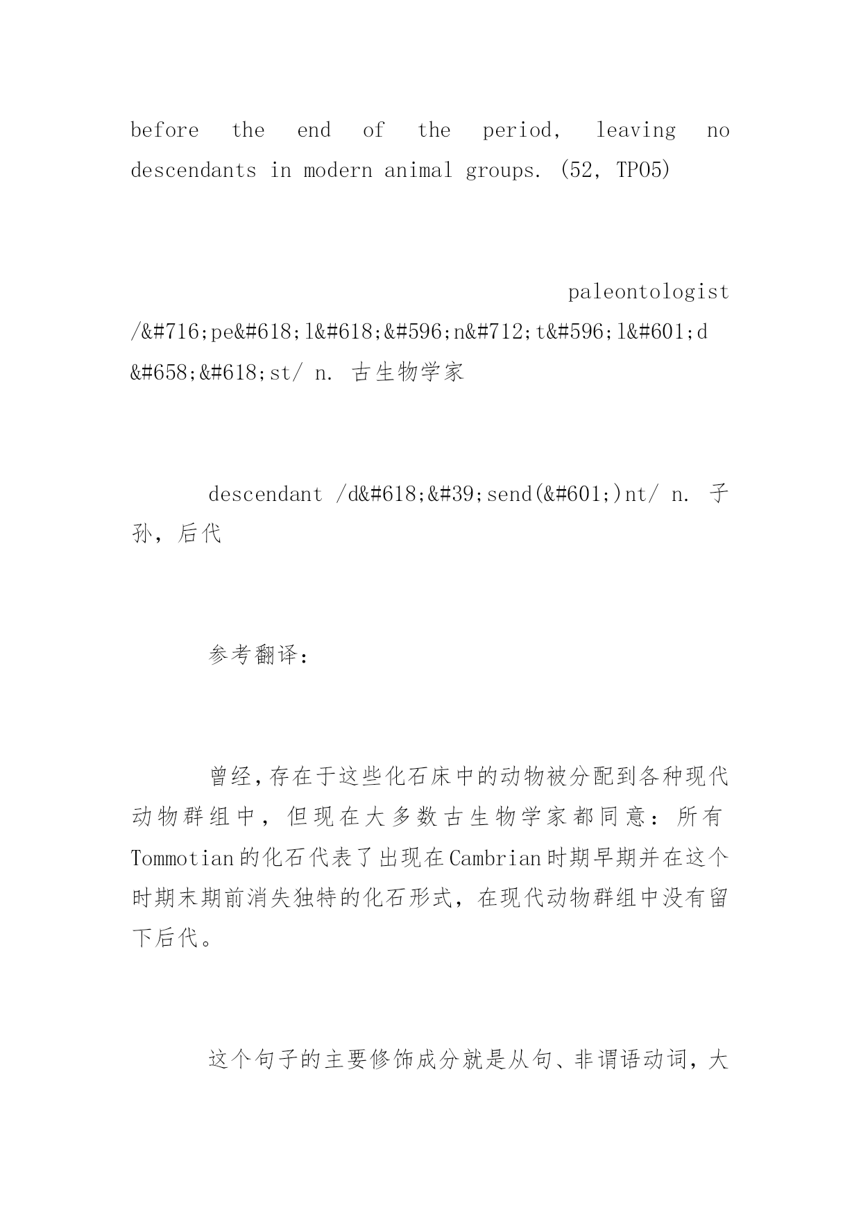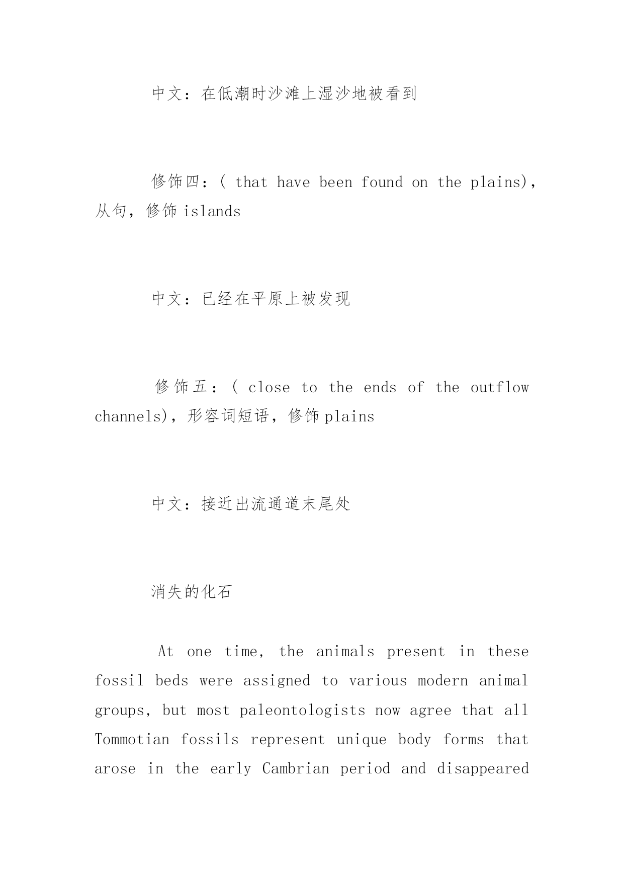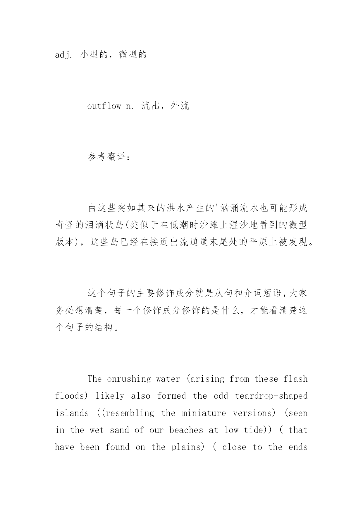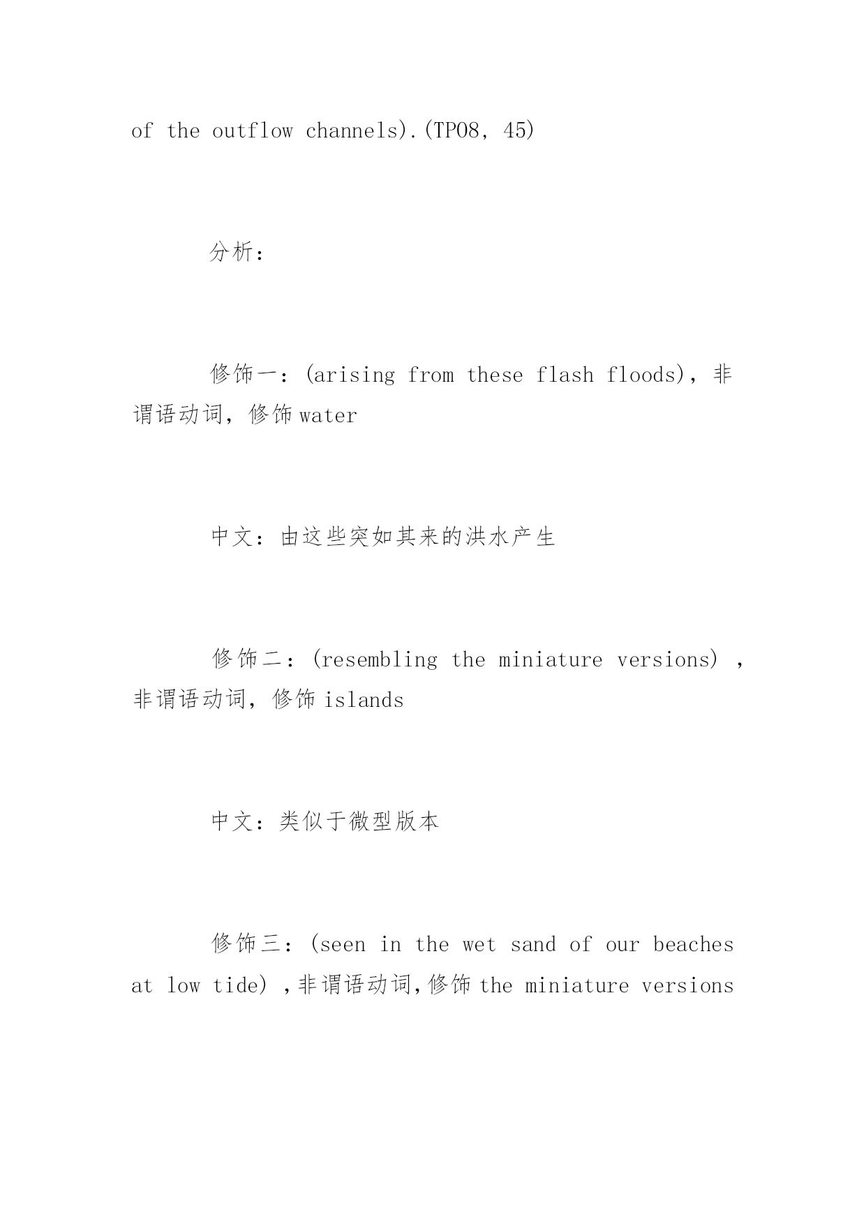 托福阅读长难句理解分析 托福阅读长难句理解分析 托福阅读中大家最烦的就是长难句了,不仅影响理解还浪费不少时间。为了帮助大家,小编整理了一些长难句解析,欢迎阅读! 岛的形成 Theonrushingwaterarisingfromtheseflashfloodslikelyalsoformedtheoddteardrop-shapedislands(resemblingtheminiatureversionsseeninthewetsandofourbeachesatlowtide)thathavebeenfoundontheplainsclosetotheendsoftheoutflowchannels.(TPO8,45) onrushingadj.汹涌的,猛冲的 miniature/'mɪnətʃɚ/adj.小型的,微型的 outflown.流出,外流 参考翻译: 由这些突如其来的洪水产生的'汹涌流水也可能形成奇怪的泪滴状岛(类似于在低潮时沙滩上湿沙地看到的微型版本),这些岛已经在接近出流通道末尾处的平原上被发现。 这个句子的主要修饰成分就是从句和介词短语,大家务必想清楚,每一个修饰成分修饰的是什么,才能看清楚这个句子的结构。 Theonrushingwater(arisingfromtheseflashfloods)likelyalsoformedtheoddteardrop-shapedislands((resemblingtheminiatureversions)(seeninthewetsandofourbeachesatlowtide))(thathavebeenfoundontheplains)(closetotheendsoftheoutflowchannels).(TPO8,45) 分析: 修饰一:(arisingfromtheseflashfloods),非谓语动词,修饰water 中文:由这些突如其来的洪水产生 修饰二:(resemblingtheminiatureversions),非谓语动词,修饰islands 中文:类似于微型版本 修饰三:(seeninthewetsandofourbeachesatlowtide),非谓语动词,修饰theminiatureversions 中文:在低潮时沙滩上湿沙地被看到 修饰四:(thathavebeenfoundontheplains),从句,修饰islands 中文:已经在平原上被发现 修饰五:(closetotheendsoftheoutflowchannels),形容词短语,修饰plains 中文:接近出流通道末尾处 消失的化石 Atonetime,theanimalspresentinthesefossilbedswereassignedtovariousmodernanimalgroups,butmostpaleontologistsnowagreethatallTommotianfossilsrepresentuniquebodyformsthataroseintheearlyCambrianperiodanddisappearedbeforetheendoftheperiod,leavingnodescendantsinmodernanimalgroups.(52,TPO5) paleontologist/ˌpeɪlɪɔnˈtɔlədʒɪst/n.古生物学家 descendant/dɪ'send(ə)nt/n.子孙,后代 参考翻译: 曾经,存在于这些化石床中的动物被分配到各种现代动物群组中,但现在大多数古生物学家都同意:所有Tommotian的化石代表了出现在Cambrian时期早期并在这个时期末期前消失独特的化石形式,在现代动物群组中没有留下后代。 这个句子的主要修饰成分就是从句、非谓语动词,大家务必想清楚,每一个修饰成分修饰的是什么,才能看清楚这个句子的结构。 Atonetime,theanimals(presentinthesefossilbeds)wereassignedtovariousmodernanimalgroups,butmostpaleontologistsnowagreethatallTommotianfossilsrepresentuniquebodyforms(thataroseintheearlyCambrianperiodanddisappearedbeforetheendoftheperiod),(leavingnodescendantsinmode
