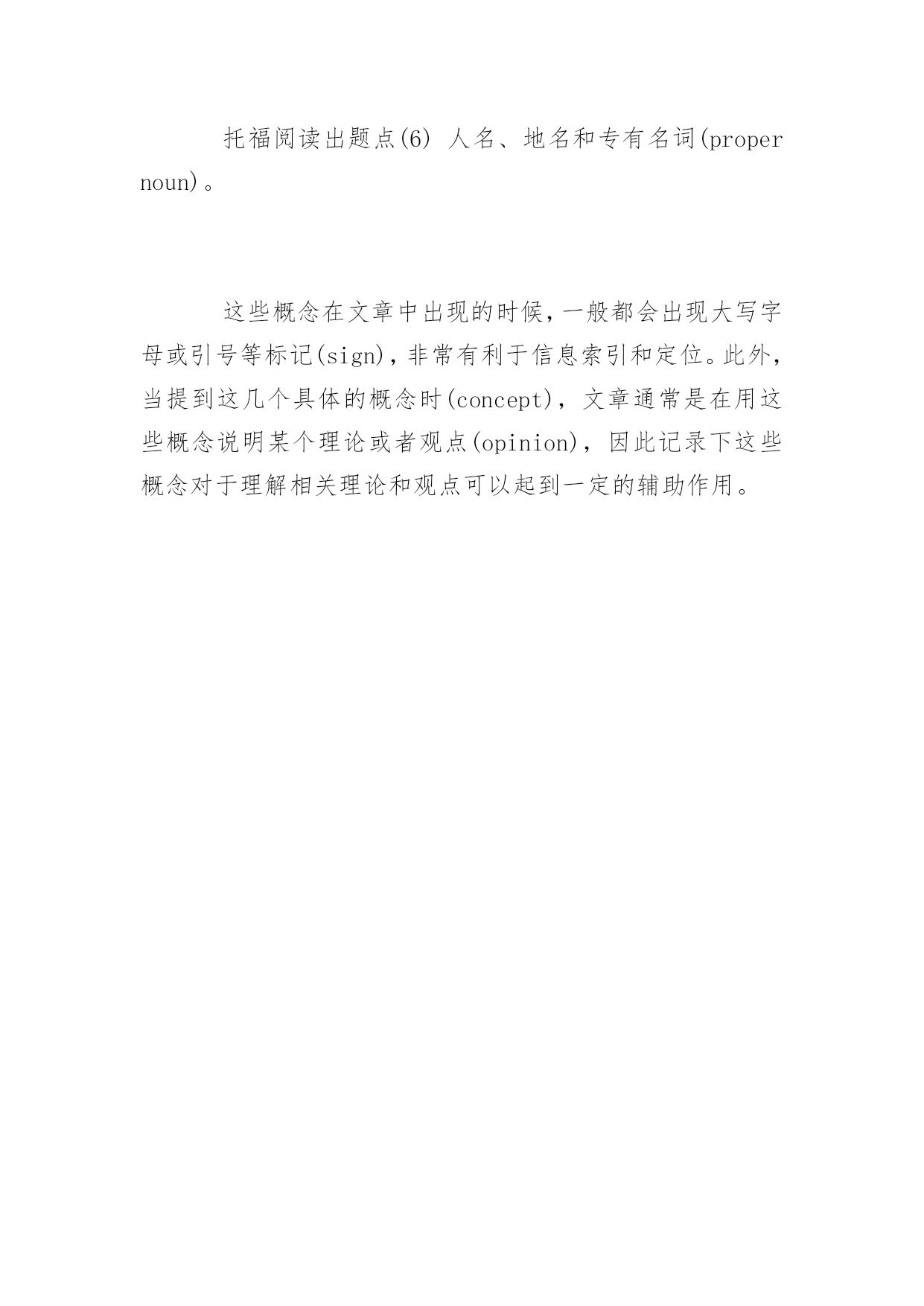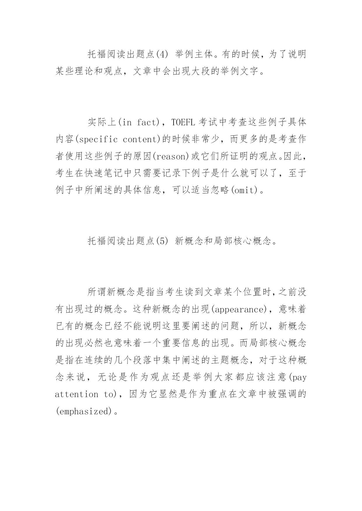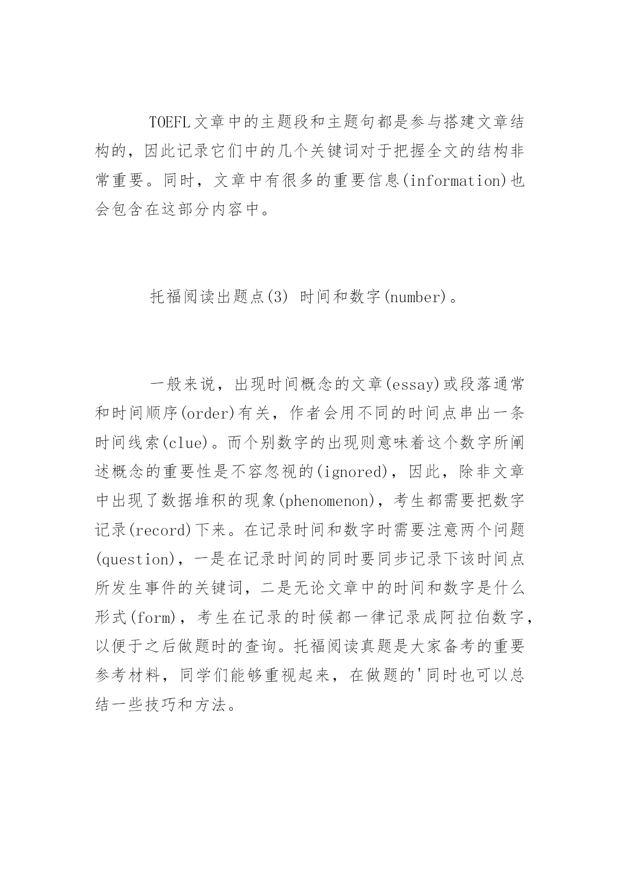 托福阅读出题点总结 2016托福阅读出题点总结 TOEFL的阅读量非常大,一般的中国考生根本无法把文章全部读完,所谓的扫读法、跳读法和略读法也只能适用于少数类型的文章,根本不能解决本质(essence)问题。那么,文章到底应该怎么读法呢?以下是yjbys网小编整理的关于托福阅读出题点总结,供大家参考。 托福阅读出题点(1)重要的逻辑关系(relation)。 很多考生在阅读文章的时候只注意到了文章所阐述的重要内容,但是忽略了信息之间的逻辑关系,因而对信息关联理解不准确(incorrect),这也是一种严重的错误(mistake)。因此,在阅读过程中记录下信息之间所产生的逻辑关系可以避免(avoid)考生丢失信息之间的关联信息。 托福阅读出题点(2)主题段和主题句的关键词(keywords)。 TOEFL文章中的主题段和主题句都是参与搭建文章结构的,因此记录它们中的几个关键词对于把握全文的结构非常重要。同时,文章中有很多的重要信息(information)也会包含在这部分内容中。 托福阅读出题点(3)时间和数字(number)。 一般来说,出现时间概念的文章(essay)或段落通常和时间顺序(order)有关,作者会用不同的时间点串出一条时间线索(clue)。而个别数字的出现则意味着这个数字所阐述概念的重要性是不容忽视的(ignored),因此,除非文章中出现了数据堆积的现象(phenomenon),考生都需要把数字记录(record)下来。在记录时间和数字时需要注意两个问题(question),一是在记录时间的同时要同步记录下该时间点所发生事件的关键词,二是无论文章中的时间和数字是什么形式(form),考生在记录的时候都一律记录成阿拉伯数字,以便于之后做题时的查询。托福阅读真题是大家备考的重要参考材料,同学们能够重视起来,在做题的'同时也可以总结一些技巧和方法。 托福阅读出题点(4)举例主体。有的时候,为了说明某些理论和观点,文章中会出现大段的举例文字。 实际上(infact),TOEFL考试中考查这些例子具体内容(specificcontent)的时候非常少,而更多的是考查作者使用这些例子的原因(reason)或它们所证明的观点。因此,考生在快速笔记中只需要记录下例子是什么就可以了,至于例子中所阐述的具体信息,可以适当忽略(omit)。 托福阅读出题点(5)新概念和局部核心概念。 所谓新概念是指当考生读到文章某个位置时,之前没有出现过的概念。这种新概念的出现(appearance),意味着已有的概念已经不能说明这里要阐述的问题,所以,新概念的出现必然也意味着一个重要信息的出现。而局部核心概念是指在连续的几个段落中集中阐述的主题概念,对于这种概念来说,无论是作为观点还是举例大家都应该注意(payattentionto),因为它显然是作为重点在文章中被强调的(emphasized)。 托福阅读出题点(6)人名、地名和专有名词(propernoun)。 这些概念在文章中出现的时候,一般都会出现大写字母或引号等标记(sign),非常有利于信息索引和定位。此外,当提到这几个具体的概念时(concept),文章通常是在用这些概念说明某个理论或者观点(opinion),因此记录下这些概念对于理解相关理论和观点可以起到一定的辅助作用。
