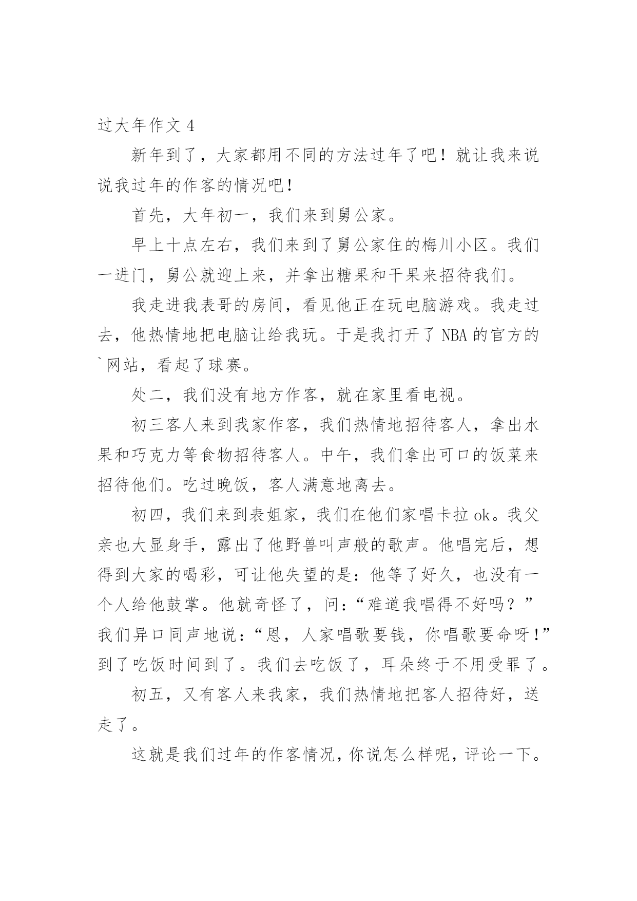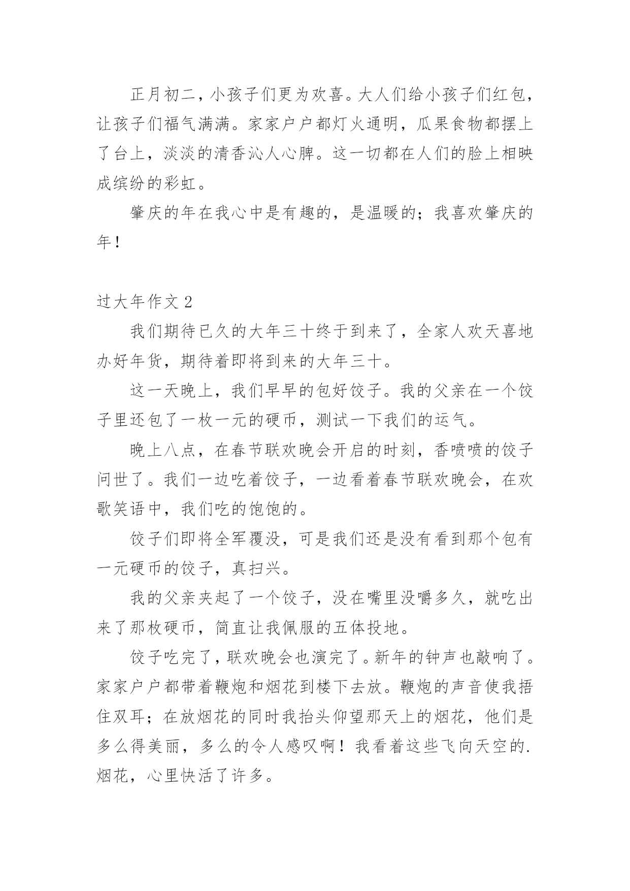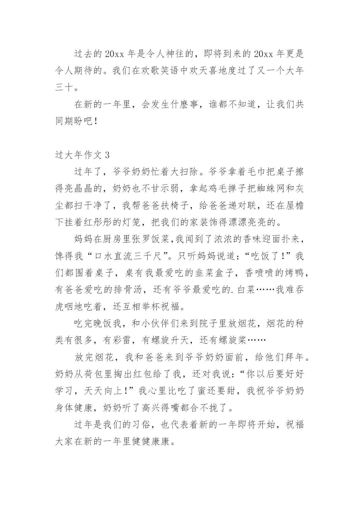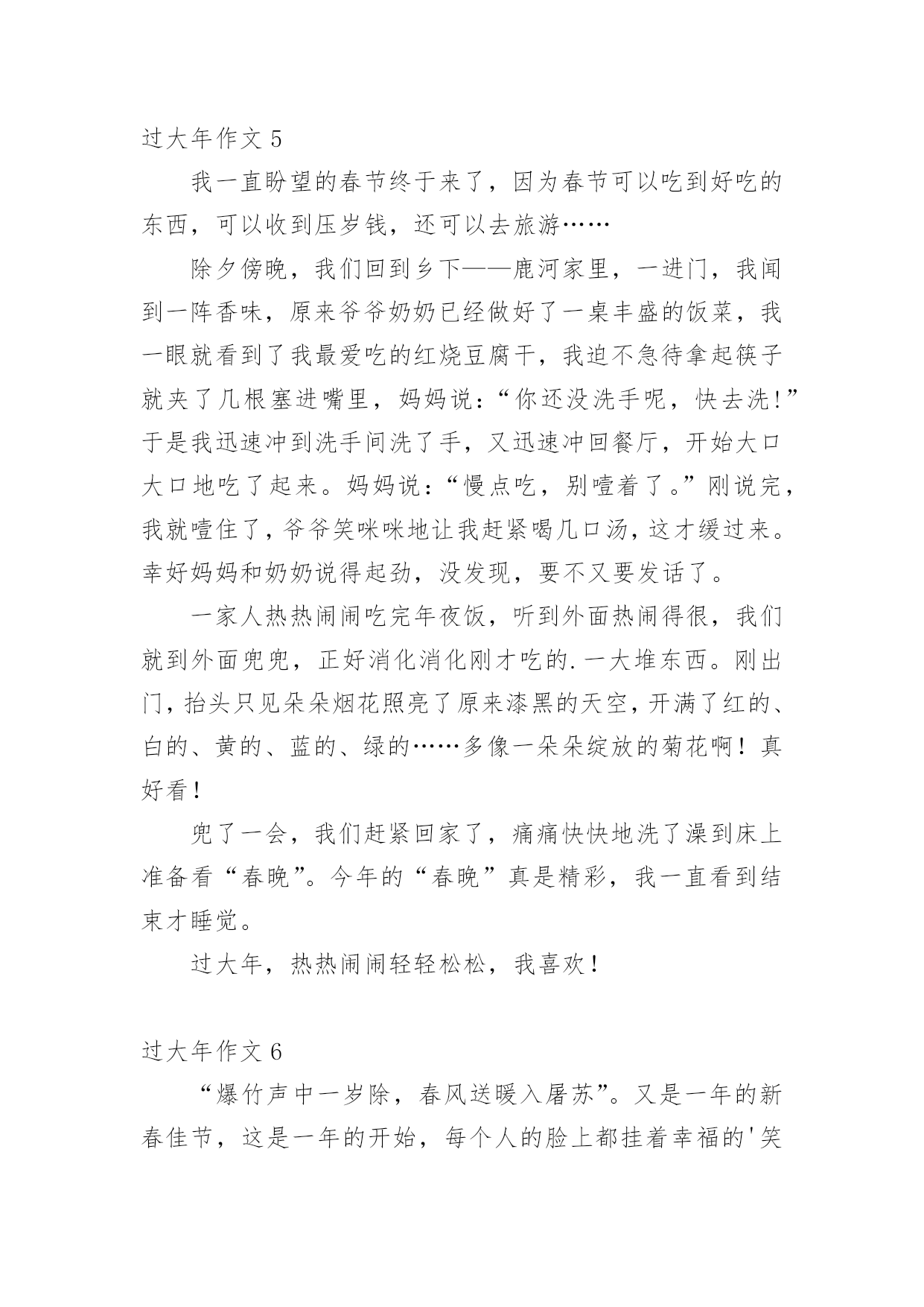 过大年作文 过大年作文(15篇)在现实生活或工作学习中,大家都跟作文打过交道吧,借助作文人们可以实现文化交流的目的。你所见过的作文是什么样的呢?以下是小编为大家收集的过大年作文,仅供参考,大家一起来看看吧。过大年作文1肇庆虽然小,但是它有一种独特的魅力。肇庆是我的家乡,这里在我的心中,就是那么的与众不同;肇庆过大年同往常一样热热闹闹。正月初一,大人小孩都换上了漂亮的新衣,寓意着除旧迎新。红色的灯笼挂满了店铺的上方,让人目不转睛。“新年好,恭喜发财,万事如意呀!”人们的祝福在我耳边萦绕;人们的脸上都挂着一个微笑,绽放成一朵美丽的鲜花。在乡下,“噼里啪啦——噼里啪啦——”的鞭炮声索绕在整个村庄里;就连诗人王安石也石禁感叹道:“爆竹声中一岁除,春风送暖入屠苏。”到了夜晚,孩子们的笑声越来越大了,三五成群地围在一起嬉戏,做游戏。大人们在忙碌,准备一顿美味的年夜饭。在村庄里,入们对烟花还是情有独钟的`;烟花在天空中绽放,只听“砰”的一声,那美丽的烟花就像是月光下令人叹息的是花,转瞬即逝;“昙花一现”虽短暂但在人们的心中都刻下了最美的模样。正月初二,小孩子们更为欢喜。大人们给小孩子们红包,让孩子们福气满满。家家户户都灯火通明,瓜果食物都摆上了台上,淡淡的清香沁人心脾。这一切都在人们的脸上相映成缤纷的彩虹。肇庆的年在我心中是有趣的,是温暖的;我喜欢肇庆的年!过大年作文2我们期待已久的大年三十终于到来了,全家人欢天喜地办好年货,期待着即将到来的大年三十。这一天晚上,我们早早的包好饺子。我的父亲在一个饺子里还包了一枚一元的硬币,测试一下我们的运气。晚上八点,在春节联欢晚会开启的时刻,香喷喷的饺子问世了。我们一边吃着饺子,一边看着春节联欢晚会,在欢歌笑语中,我们吃的饱饱的。饺子们即将全军覆没,可是我们还是没有看到那个包有一元硬币的饺子,真扫兴。我的父亲夹起了一个饺子,没在嘴里没嚼多久,就吃出来了那枚硬币,简直让我佩服的五体投地。饺子吃完了,联欢晚会也演完了。新年的钟声也敲响了。家家户户都带着鞭炮和烟花到楼下去放。鞭炮的声音使我捂住双耳;在放烟花的同时我抬头仰望那天上的烟花,他们是多么得美丽,多么的令人感叹啊!我看着这些飞向天空的.烟花,心里快活了许多。过去的20xx年是令人神往的,即将到来的20xx年更是令人期待的。我们在欢歌笑语中欢天喜地度过了又一个大年三十。在新的一年里,会发生什麽事,谁都不知道,让我们共同期盼吧!过大年作文3过年了,爷爷奶奶忙着大扫除。爷爷拿着毛巾把桌子擦得亮晶晶的,奶奶也不甘示弱,拿起鸡毛掸子把蜘蛛网和灰尘都扫干净了,我帮爸爸扶椅子,给爸爸递对联,还在屋檐下挂着红彤彤的灯笼,把我们的家装饰得漂漂亮亮的。妈妈在厨房里张罗饭菜,我闻到了浓浓的香味迎面扑来,馋得我“口水直流三千尺”。只听妈妈说道:“吃饭了!”我们都围着桌子,桌有我最爱吃的韭菜盒子,香喷喷的烤鸭,有爸爸爱吃的排骨汤,还有爷爷最爱吃的.白菜……我难吞虎咽地吃着,还互相举杯祝福。吃完晚饭我,和小伙伴们来到院子里放烟花,烟花的种类有很多,有彩雷,有螺旋升天,还有螺旋桨……放完烟花,我和爸爸来到爷爷奶奶面前,给他们拜年。奶奶从荷包里掏出红包给了我,还对我说:“你以后要好好学习,天天向上!”我心里比吃了蜜还要甜,我祝爷爷奶奶身体健康,奶奶听了高兴得嘴都合不拢了。过年是我们的习俗,也代表着新的一年即将开始,祝福大家在新的一年里健健康康。过大年作文4新年到了,大家都用不同的方法过年了吧!就让我来说说我过年的作客的情况吧!首先,大年初一,我们来到舅公家。早上十点左右,我们来到了舅公家住的梅川小区。我们一进门,舅公就迎上来,并拿出糖果和干果来招待我们。我走进我表哥的房间,看见他正在玩电脑游戏。我走过去,他热情地把电脑让给我玩。于是我打开了NBA的官方的`网站,看起了球赛。处二,我们没有地方作客,就在家里看电视。初三客人来到我家作客,我们热情地招待客人,拿出水果和巧克力等食物招待客人。中午,我们拿出可口的饭菜来招待他们。吃过晚饭,客人满意地离去。初四,我们来到表姐家,我们在他们家唱卡拉ok。我父亲也大显身手,露出了他野兽叫声般的歌声。他唱完后,想得到大家的喝彩,可让他失望的是:他等了好久,也没有一个人给他鼓掌。他就奇怪了,问:“难道我唱得不好吗?”我们异口同声地说:“恩,人家唱歌要钱,你唱歌要命呀!”到了吃饭时间到了。我们去吃饭了,耳朵终于不用受罪了。初五,又有客人来我家,我们热情地把客人招待好,送走了。这就是我们过年的作客情况,你说怎么样呢,评论一下。过大年作文5我一直盼望的春节终于来了,因为春节可以吃到好吃的东西,可以收到压岁钱,还可以去旅游……除夕傍晚,我们回到乡下——鹿河家里,一进门,我闻到一阵香味,原来爷爷奶奶已经做好了一桌丰盛的饭菜,我一眼就看到了我最爱吃的红烧豆腐干,