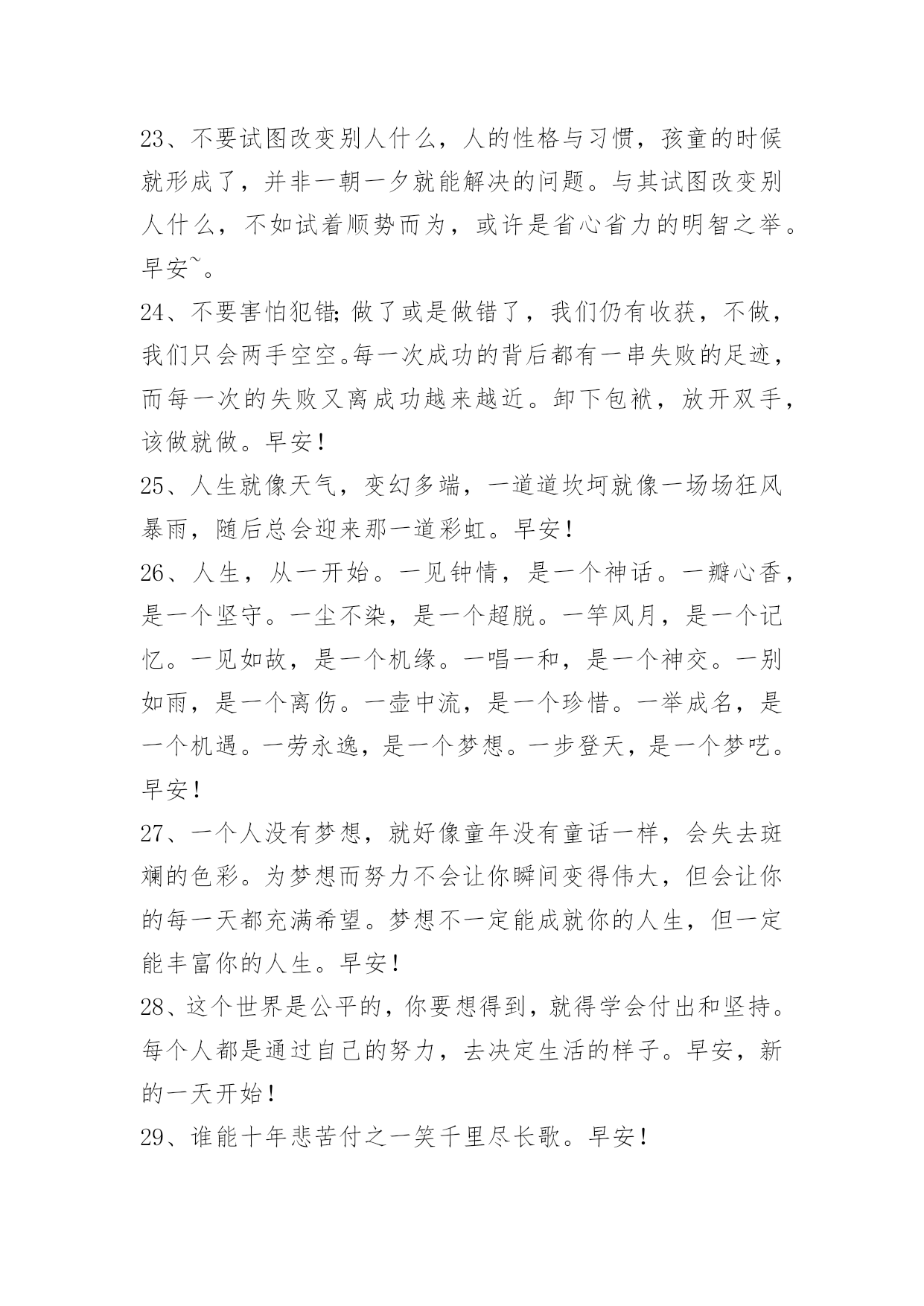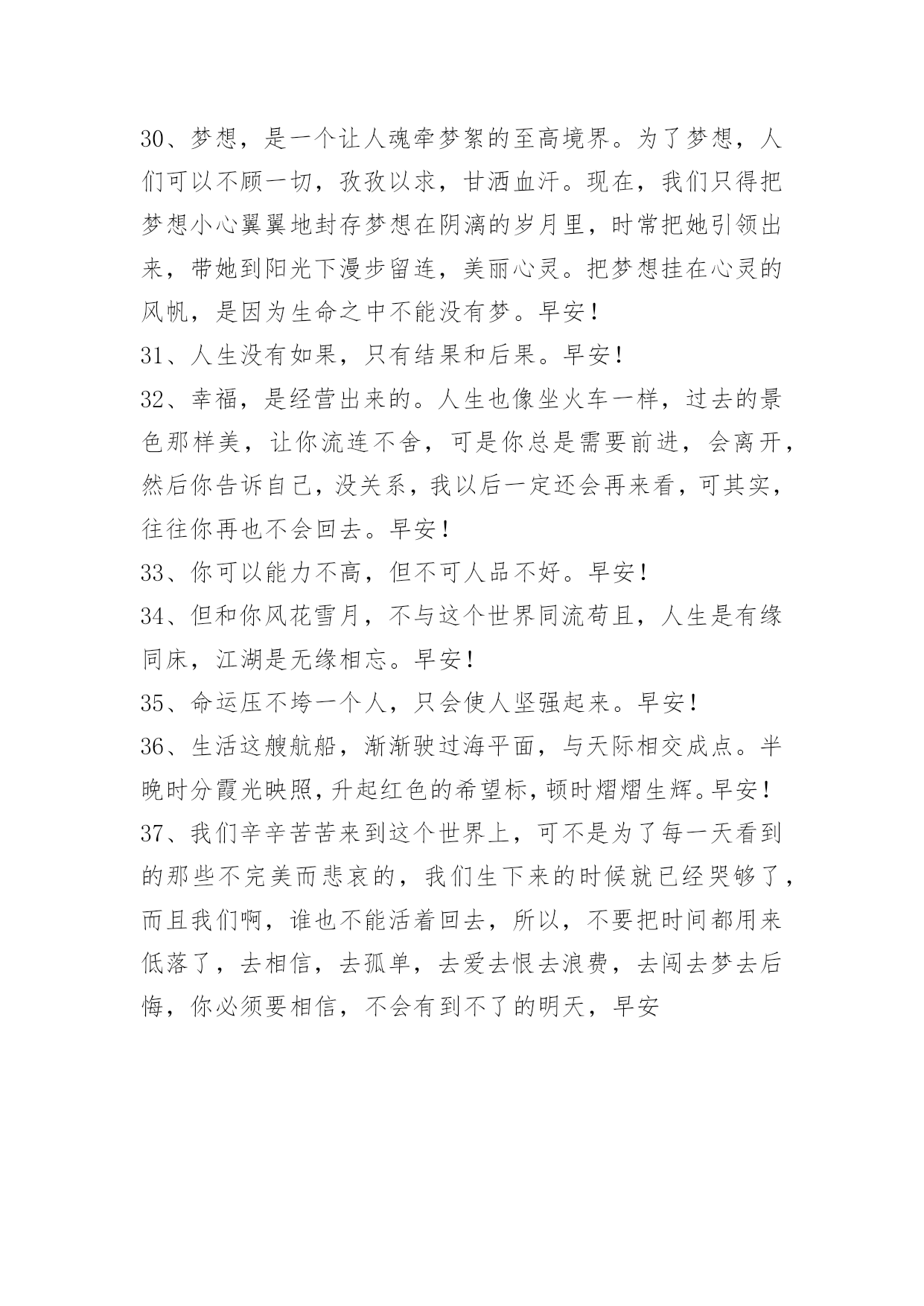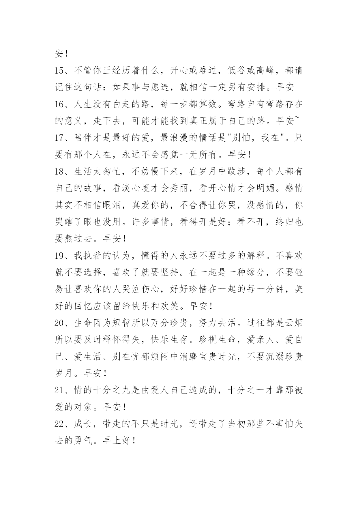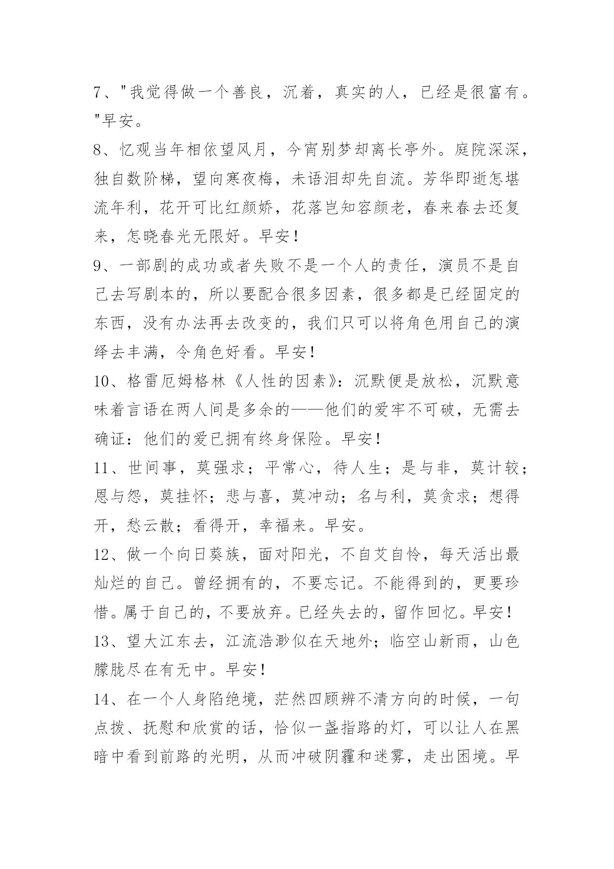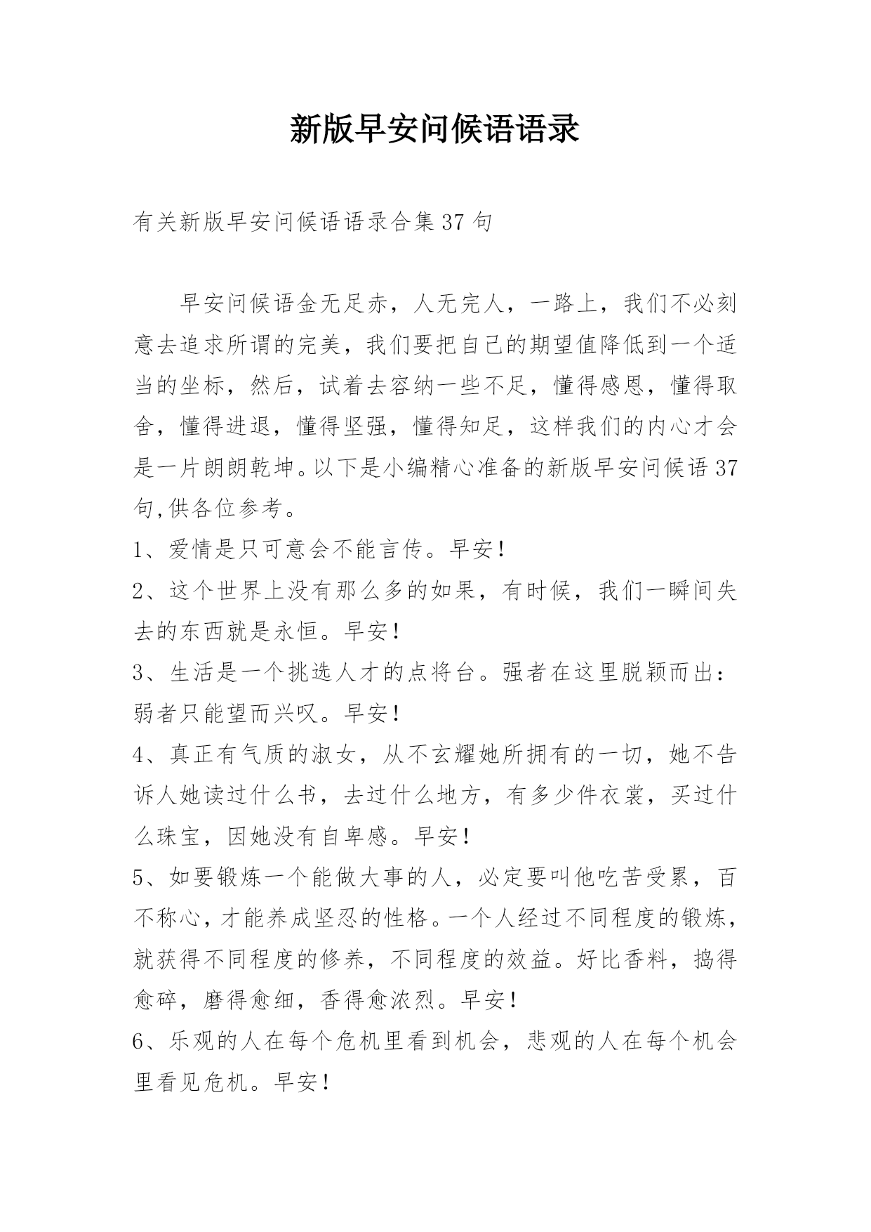 新版早安问候语语录 有关新版早安问候语语录合集37句早安问候语金无足赤,人无完人,一路上,我们不必刻意去追求所谓的完美,我们要把自己的期望值降低到一个适当的坐标,然后,试着去容纳一些不足,懂得感恩,懂得取舍,懂得进退,懂得坚强,懂得知足,这样我们的内心才会是一片朗朗乾坤。以下是小编精心准备的新版早安问候语37句,供各位参考。1、爱情是只可意会不能言传。早安!2、这个世界上没有那么多的如果,有时候,我们一瞬间失去的东西就是永恒。早安!3、生活是一个挑选人才的点将台。强者在这里脱颖而出:弱者只能望而兴叹。早安!4、真正有气质的淑女,从不玄耀她所拥有的一切,她不告诉人她读过什么书,去过什么地方,有多少件衣裳,买过什么珠宝,因她没有自卑感。早安!5、如要锻炼一个能做大事的人,必定要叫他吃苦受累,百不称心,才能养成坚忍的性格。一个人经过不同程度的锻炼,就获得不同程度的修养,不同程度的效益。好比香料,捣得愈碎,磨得愈细,香得愈浓烈。早安!6、乐观的人在每个危机里看到机会,悲观的人在每个机会里看见危机。早安!7、"我觉得做一个善良,沉着,真实的人,已经是很富有。"早安。8、忆观当年相依望风月,今宵别梦却离长亭外。庭院深深,独自数阶梯,望向寒夜梅,未语泪却先自流。芳华即逝怎堪流年利,花开可比红颜娇,花落岂知容颜老,春来春去还复来,怎晓春光无限好。早安!9、一部剧的成功或者失败不是一个人的责任,演员不是自己去写剧本的,所以要配合很多因素,很多都是已经固定的东西,没有办法再去改变的,我们只可以将角色用自己的演绎去丰满,令角色好看。早安!10、格雷厄姆格林《人性的因素》:沉默便是放松,沉默意味着言语在两人间是多余的——他们的爱牢不可破,无需去确证:他们的爱已拥有终身保险。早安!11、世间事,莫强求;平常心,待人生;是与非,莫计较;恩与怨,莫挂怀;悲与喜,莫冲动;名与利,莫贪求;想得开,愁云散;看得开,幸福来。早安。12、做一个向日葵族,面对阳光,不自艾自怜,每天活出最灿烂的自己。曾经拥有的,不要忘记。不能得到的,更要珍惜。属于自己的,不要放弃。已经失去的,留作回忆。早安!13、望大江东去,江流浩渺似在天地外;临空山新雨,山色朦胧尽在有无中。早安!14、在一个人身陷绝境,茫然四顾辨不清方向的时候,一句点拨、抚慰和欣赏的话,恰似一盏指路的灯,可以让人在黑暗中看到前路的光明,从而冲破阴霾和迷雾,走出困境。早安!15、不管你正经历着什么,开心或难过,低谷或高峰,都请记住这句话:如果事与愿违,就相信一定另有安排。早安16、人生没有白走的路,每一步都算数。弯路自有弯路存在的意义,走下去,可能才能找到真正属于自己的路。早安~17、陪伴才是最好的爱,最浪漫的情话是"别怕,我在"。只要有那个人在,永远不会感觉一无所有。早安!18、生活太匆忙,不妨慢下来,在岁月中跋涉,每个人都有自己的故事,看淡心境才会秀丽,看开心情才会明媚。感情其实不相信眼泪,真爱你的,不舍得让你哭,没感情的,你哭瞎了眼也没用。许多事情,看得开是好;看不开,终归也要熬过去。早安!19、我执着的认为,懂得的人永远不要过多的解释。不喜欢就不要选择,喜欢了就要坚持。在一起是一种缘分,不要轻易让喜欢你的人哭泣伤心,好好珍惜在一起的每一分钟,美好的回忆应该留给快乐和欢笑。早安!20、生命因为短暂所以万分珍贵,努力去活。过往都是云烟所以要及时释怀得失,快乐生存。珍视生命,爱亲人、爱自己、爱生活、别在忧郁烦闷中消磨宝贵时光,不要沉溺珍贵岁月。早安!21、情的十分之九是由爱人自己造成的,十分之一才靠那被爱的对象。早安!22、成长,带走的不只是时光,还带走了当初那些不害怕失去的勇气。早上好!23、不要试图改变别人什么,人的性格与习惯,孩童的时候就形成了,并非一朝一夕就能解决的问题。与其试图改变别人什么,不如试着顺势而为,或许是省心省力的明智之举。早安~。24、不要害怕犯错;做了或是做错了,我们仍有收获,不做,我们只会两手空空。每一次成功的背后都有一串失败的足迹,而每一次的失败又离成功越来越近。卸下包袱,放开双手,该做就做。早安!25、人生就像天气,变幻多端,一道道坎坷就像一场场狂风暴雨,随后总会迎来那一道彩虹。早安!26、人生,从一开始。一见钟情,是一个神话。一瓣心香,是一个坚守。一尘不染,是一个超脱。一竿风月,是一个记忆。一见如故,是一个机缘。一唱一和,是一个神交。一别如雨,是一个离伤。一壶中流,是一个珍惜。一举成名,是一个机遇。一劳永逸,是一个梦想。一步登天,是一个梦呓。早安!27、一个人没有梦想,就好像童年没有童话一样,会失去斑斓的色彩。为梦想而努力不会让你瞬间变得伟大,但会让你的每一天都充满希望。梦想不一定能成就你的人生,但一定能丰富你的人生。早安!28、这个世界是公平的,你要想得到,就得学会付出和坚持。每