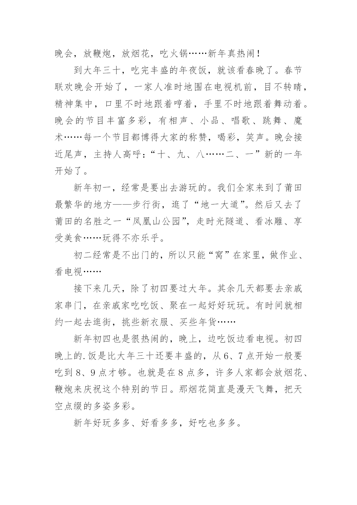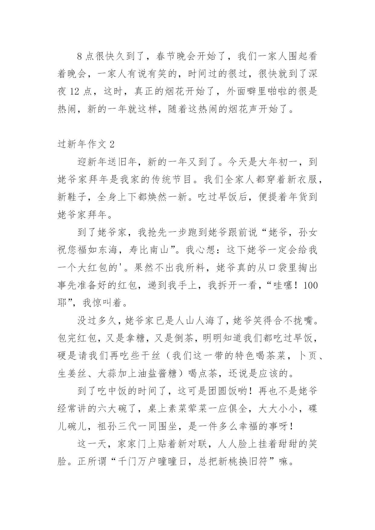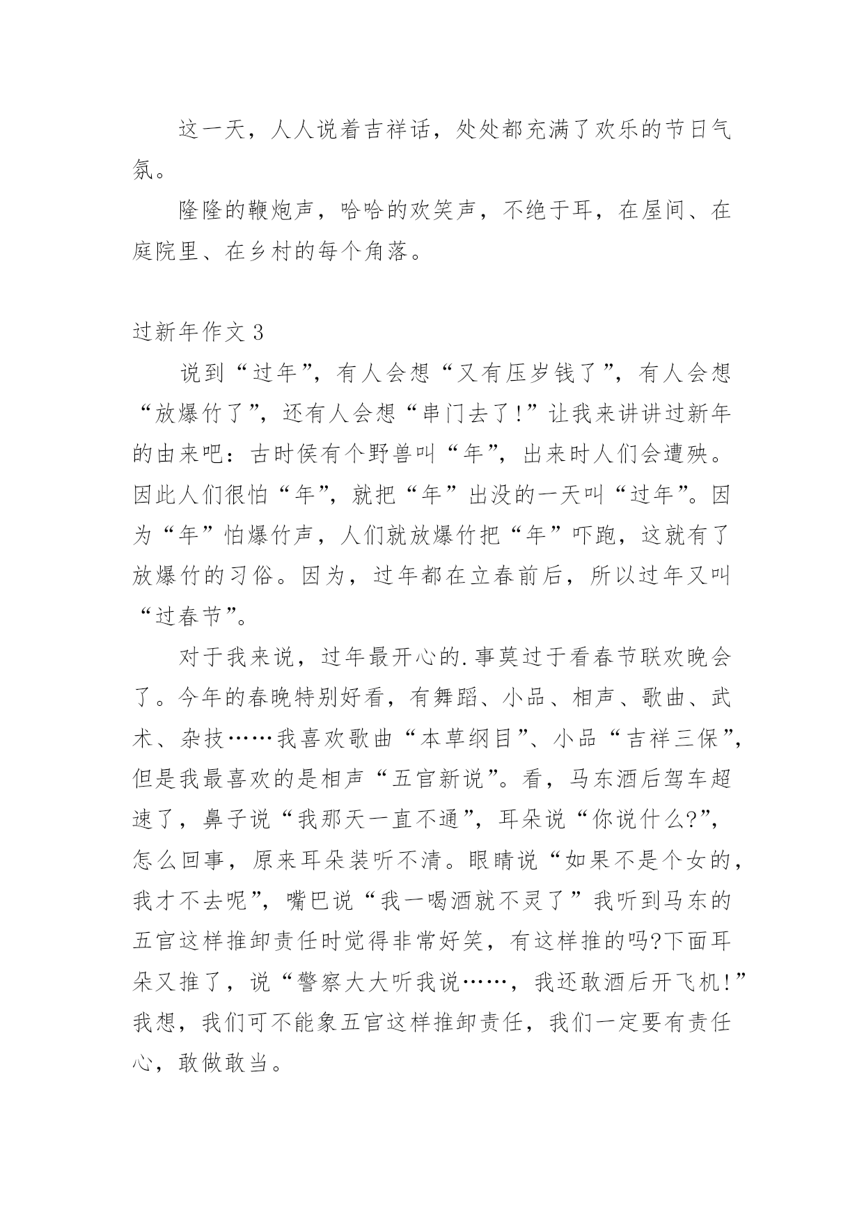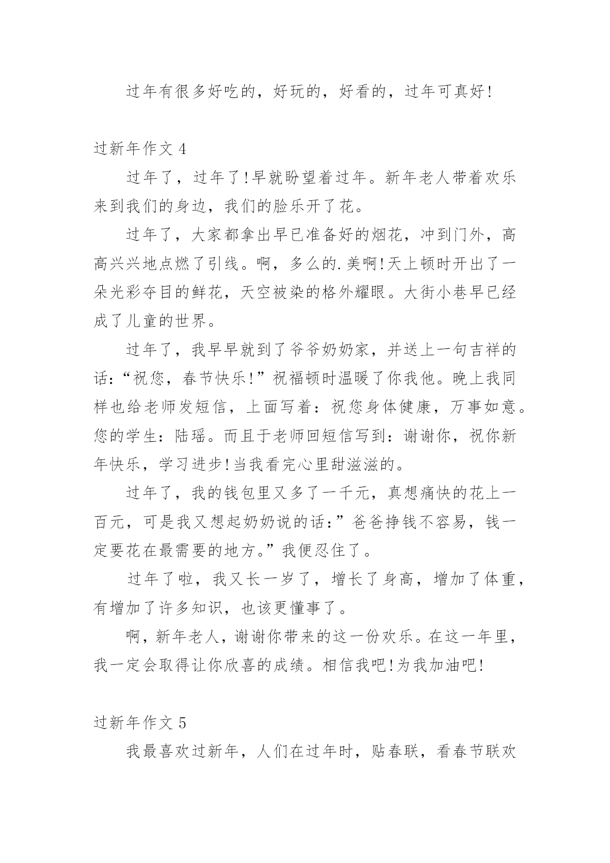 过新年作文 【精选】过新年作文在日常生活或是工作学习中,大家都经常接触到作文吧,作文是从内部言语向外部言语的过渡,即从经过压缩的简要的、自己能明白的语言,向开展的、具有规范语法结构的、能为他人所理解的外部语言形式的转化。还是对作文一筹莫展吗?以下是小编收集整理的过新年作文,仅供参考,希望能够帮助到大家。过新年作文1叭叭叭!叭叭叭!一年一度的新年到了!一大早就有人放鞭炮,我们都穿上新衣服,走出家门,看见家家户户都贴上了春联,家里变的热热闹闹的。站在大门口,好朋友金子羽就来找我玩耍,我们开开心心的玩着,一会吃瓜子,一会喝王老吉,感觉世界都是那么的美好。时间过的飞快,中午刚过,感觉没过多久久到了晚上,可能是我们玩的太忘我了吧。7点左右的时候,久开始陆陆续续的有人放烟花了,邻居家的小孩,还拿着棒形烟花在那四处乱放,不够她这样的方式是不对的,我奶奶他们也说了他,过了一会,我走到了离家不远的地方,看着五颜六色的烟花,美极了。有黄的,像一朵菊花;有绿的,像美丽的仙子;还有红色的`,仿佛整个天空地上红色的。8点很快久到了,春节晚会开始了,我们一家人围起看着晚会,一家人有说有笑的,时间过的很过,很快就到了深夜12点,这时,真正的烟花开始了,外面噼里啪啦的很是热闹,新的一年就这样,随着这热闹的烟花声开始了。过新年作文2迎新年送旧年,新的一年又到了。今天是大年初一,到姥爷家拜年是我家的传统节目。我们全家人都穿着新衣服,新鞋子,全身上下都焕然一新。吃过早饭后,便提着年货到姥爷家拜年。到了姥爷家,我抢先一步跑到姥爷跟前说“姥爷,孙女祝您福如东海,寿比南山”。我心想:这下姥爷一定会给我一个大红包的'。果然不出我所料,姥爷真的从口袋里掏出事先准备好的红包,递到我手上,我拆开一看,“哇噻!100耶”,我惊叫着。没过多久,姥爷家已是人山人海了,姥爷笑得合不拢嘴。包完红包,又是拿糖,又是倒茶,明明知道我们都吃过早饭,硬是请我们再吃些干丝(我们这一带的特色喝茶菜,卜页、生姜丝、大蒜加上油盐酱糖)喝点茶,还说是应该的。到了吃中饭的时间了,这可是团圆饭哟!再也不是姥爷经常讲的六大碗了,桌上素菜荤菜一应俱全,大大小小,碟儿碗儿,祖孙三代一同围坐,是一件多么幸福的事呀!这一天,家家门上贴着新对联,人人脸上挂着甜甜的笑脸。正所谓“千门万户曈曈日,总把新桃换旧符”嘛。这一天,人人说着吉祥话,处处都充满了欢乐的节日气氛。隆隆的鞭炮声,哈哈的欢笑声,不绝于耳,在屋间、在庭院里、在乡村的每个角落。过新年作文3说到“过年”,有人会想“又有压岁钱了”,有人会想“放爆竹了”,还有人会想“串门去了!”让我来讲讲过新年的由来吧:古时侯有个野兽叫“年”,出来时人们会遭殃。因此人们很怕“年”,就把“年”出没的一天叫“过年”。因为“年”怕爆竹声,人们就放爆竹把“年”吓跑,这就有了放爆竹的习俗。因为,过年都在立春前后,所以过年又叫“过春节”。对于我来说,过年最开心的.事莫过于看春节联欢晚会了。今年的春晚特别好看,有舞蹈、小品、相声、歌曲、武术、杂技……我喜欢歌曲“本草纲目”、小品“吉祥三保”,但是我最喜欢的是相声“五官新说”。看,马东酒后驾车超速了,鼻子说“我那天一直不通”,耳朵说“你说什么?”,怎么回事,原来耳朵装听不清。眼睛说“如果不是个女的,我才不去呢”,嘴巴说“我一喝酒就不灵了”我听到马东的五官这样推卸责任时觉得非常好笑,有这样推的吗?下面耳朵又推了,说“警察大大听我说……,我还敢酒后开飞机!”我想,我们可不能象五官这样推卸责任,我们一定要有责任心,敢做敢当。过年有很多好吃的,好玩的,好看的,过年可真好!过新年作文4过年了,过年了!早就盼望着过年。新年老人带着欢乐来到我们的身边,我们的脸乐开了花。过年了,大家都拿出早已准备好的烟花,冲到门外,高高兴兴地点燃了引线。啊,多么的.美啊!天上顿时开出了一朵光彩夺目的鲜花,天空被染的格外耀眼。大街小巷早已经成了儿童的世界。过年了,我早早就到了爷爷奶奶家,并送上一句吉祥的话:“祝您,春节快乐!”祝福顿时温暖了你我他。晚上我同样也给老师发短信,上面写着:祝您身体健康,万事如意。您的学生:陆瑶。而且于老师回短信写到:谢谢你,祝你新年快乐,学习进步!当我看完心里甜滋滋的。过年了,我的钱包里又多了一千元,真想痛快的花上一百元,可是我又想起奶奶说的话:”爸爸挣钱不容易,钱一定要花在最需要的地方。”我便忍住了。过年了啦,我又长一岁了,增长了身高,增加了体重,有增加了许多知识,也该更懂事了。啊,新年老人,谢谢你带来的这一份欢乐。在这一年里,我一定会取得让你欣喜的成绩。相信我吧!为我加油吧!过新年作文5我最喜欢过新年,人们在过年时,贴春联,看春节联欢晚会,放鞭炮,放烟花,吃火锅……新年真热闹!到大年三十,吃完丰盛的年夜饭,就该看春晚了。春节联欢晚会开始了,一家人准时