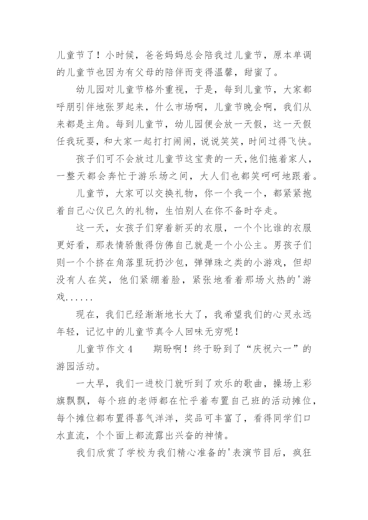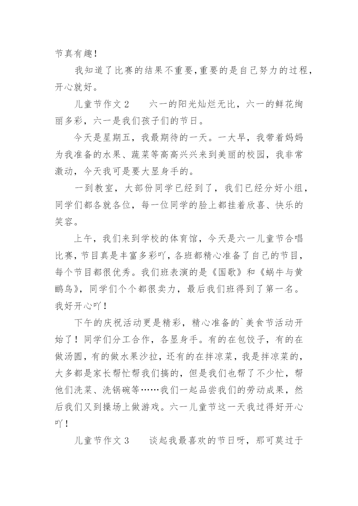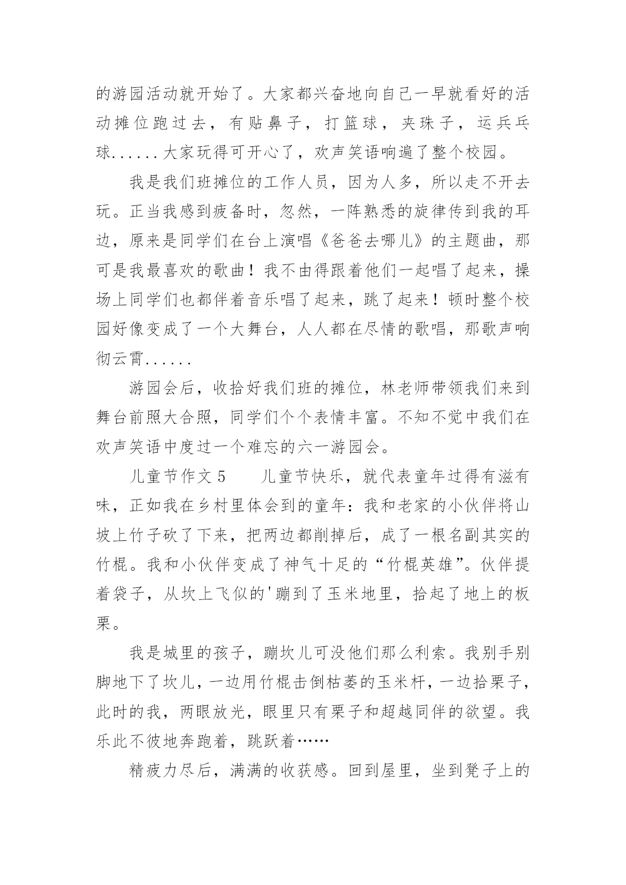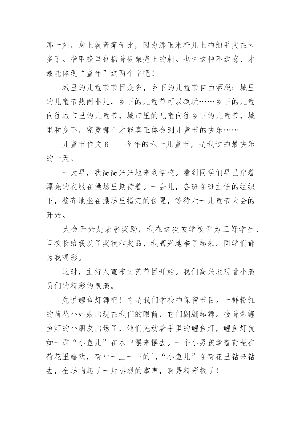 儿童节作文 儿童节作文400字(通用7篇)无论是身处学校还是步入社会,大家总少不了接触作文吧,作文是人们以书面形式表情达意的言语活动。如何写一篇有思想、有文采的作文呢?以下是小编为大家收集的儿童节作文400字(通用7篇),欢迎阅读,希望大家能够喜欢。儿童节作文1一年一度的儿童节到了,我们的校园里到处充满了欢声笑语。我们学校正在举行一种非常有趣的游戏——水中投篮。规则是这样的,全班分成两组,第一组投,第二组接。休息后攻守互换。我是第一组,所以我们这组先投,没想到第二组的人非常轻视我们,我们生气极了。我们的成员拿到球就开始投,可是一个球都没有投进,我告诉他们:“不要那么生气,要心平气和的面对,看我把他们打得措手不及!”我转过身来,看见对付我的是全年级最好的后位小亮,我最后没有投进去,同学们说:“吹牛也要有个度。”就这样,我们一颗球都没有进,准备着下一场的比赛。比赛开始了,我们没想到第二组不仅防守力强,攻击力也非常强。一组在二组的面前,就像一只弱不禁风的`小鸡啊!我们左抵右挡,还是难以招架他们的进攻。最后我们输了,0比22。虽然我们输了,但友谊第一,比赛第二。今天这次儿童节真有趣!我知道了比赛的结果不重要,重要的是自己努力的过程,开心就好。儿童节作文2六一的阳光灿烂无比,六一的鲜花绚丽多彩,六一是我们孩子们的节日。今天是星期五,我最期待的一天。一大早,我带着妈妈为我准备的水果、蔬菜等高高兴兴来到美丽的校园,我非常激动,今天我可是要大显身手的。一到教室,大部份同学已经到了,我们已经分好小组,同学们都各就各位,每一位同学的脸上都挂着欣喜、快乐的笑容。上午,我们来到学校的体育馆,今天是六一儿童节合唱比赛,节目真是丰富多彩吖,各班都精心准备了自己的节目,每个节目都很优秀。我们班表演的是《国歌》和《蜗牛与黄鹂鸟》,同学们个个都很卖力,最后我们班得到了第一名。我好开心吖!下午的庆祝活动更是精彩,精心准备的`美食节活动开始了!同学们分工合作,各显身手。有的在包饺子,有的在做汤圆,有的做水果沙拉,还有的在拌凉菜,我是拌凉菜的,大多都是家长帮忙帮我们搞的,但是我们也帮了不少忙,帮他们洗菜、洗锅碗等……我们一起品尝我们的劳动成果,然后我们又到操场上做游戏。六一儿童节这一天我过得好开心吖!儿童节作文3谈起我最喜欢的节日呀,那可莫过于儿童节了!小时候,爸爸妈妈总会陪我过儿童节,原本单调的儿童节也因为有父母的陪伴而变得温馨,甜蜜了。幼儿园对儿童节格外重视,于是,每到儿童节,大家都呼朋引伴地张罗起来,什么市场啊,儿童节晚会啊,我们从来都是主角。每到儿童节,幼儿园便会放一天假,这一天假任我玩耍,和大家一起打打闹闹,说说笑笑,时间过得飞快。孩子们可不会放过儿童节这宝贵的一天,他们拖着家人,一整天都会奔忙于游乐场之间,大人们也都笑呵呵地跟着。儿童节,大家可以交换礼物,你一个我一个,都紧紧抱着自己心仪已久的礼物,生怕别人在你不备时夺走。这一天,女孩子们穿着新买的衣服,一个个比谁的衣服更好看,那表情骄傲得仿佛自己就是一个小公主。男孩子们则一个个挤在角落里玩扔沙包,弹弹珠之类的小游戏,但却没有人在笑,他们紧绷着脸,紧张地看着那场火热的'游戏......现在,我们已经渐渐地长大了,我希望我们的心灵永远年轻,记忆中的儿童节真令人回味无穷呢!儿童节作文4期盼啊!终于盼到了“庆祝六一”的游园活动。一大早,我们一进校门就听到了欢乐的歌曲,操场上彩旗飘飘,每个班的老师都在忙乎着布置自己班的活动摊位,每个摊位都布置得喜气洋洋,奖品可丰富了,看得同学们口水直流,个个面上都流露出兴奋的神情。我们欣赏了学校为我们精心准备的'表演节目后,疯狂的游园活动就开始了。大家都兴奋地向自己一早就看好的活动摊位跑过去,有贴鼻子,打篮球,夹珠子,运兵乓球......大家玩得可开心了,欢声笑语响遍了整个校园。我是我们班摊位的工作人员,因为人多,所以走不开去玩。正当我感到疲备时,忽然,一阵熟悉的旋律传到我的耳边,原来是同学们在台上演唱《爸爸去哪儿》的主题曲,那可是我最喜欢的歌曲!我不由得跟着他们一起唱了起来,操场上同学们也都伴着音乐唱了起来,跳了起来!顿时整个校园好像变成了一个大舞台,人人都在尽情的歌唱,那歌声响彻云霄......游园会后,收拾好我们班的摊位,林老师带领我们来到舞台前照大合照,同学们个个表情丰富。不知不觉中我们在欢声笑语中度过一个难忘的六一游园会。儿童节作文5儿童节快乐,就代表童年过得有滋有味,正如我在乡村里体会到的童年:我和老家的小伙伴将山坡上竹子砍了下来,把两边都削掉后,成了一根名副其实的竹棍。我和小伙伴变成了神气十足的“竹棍英雄”。伙伴提着袋子,从坎上飞似的'蹦到了玉米地里,拾起了地上的板栗。我是城里的孩子,蹦坎儿可没他们那么利索。我别手别脚地下了坎儿,一边用竹棍击倒枯萎的玉米杆,一边拾
