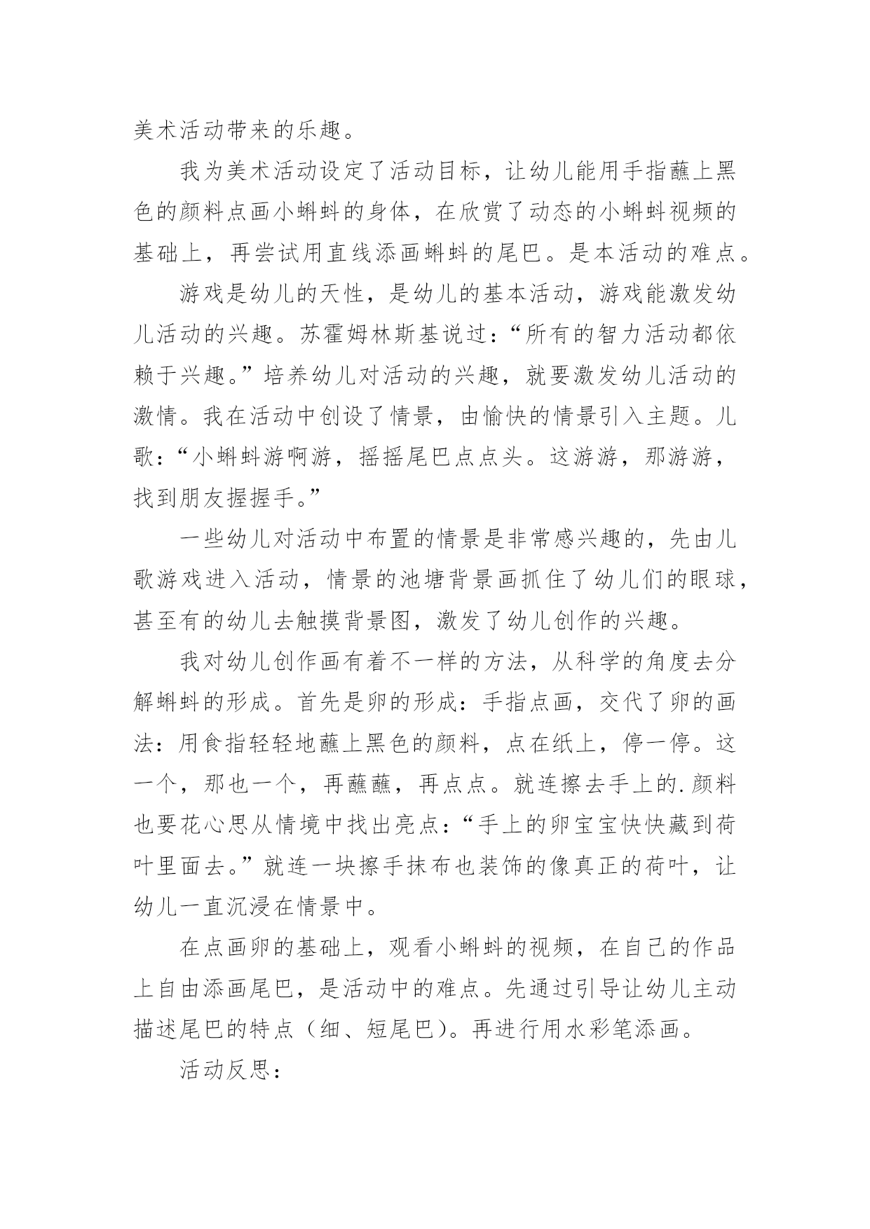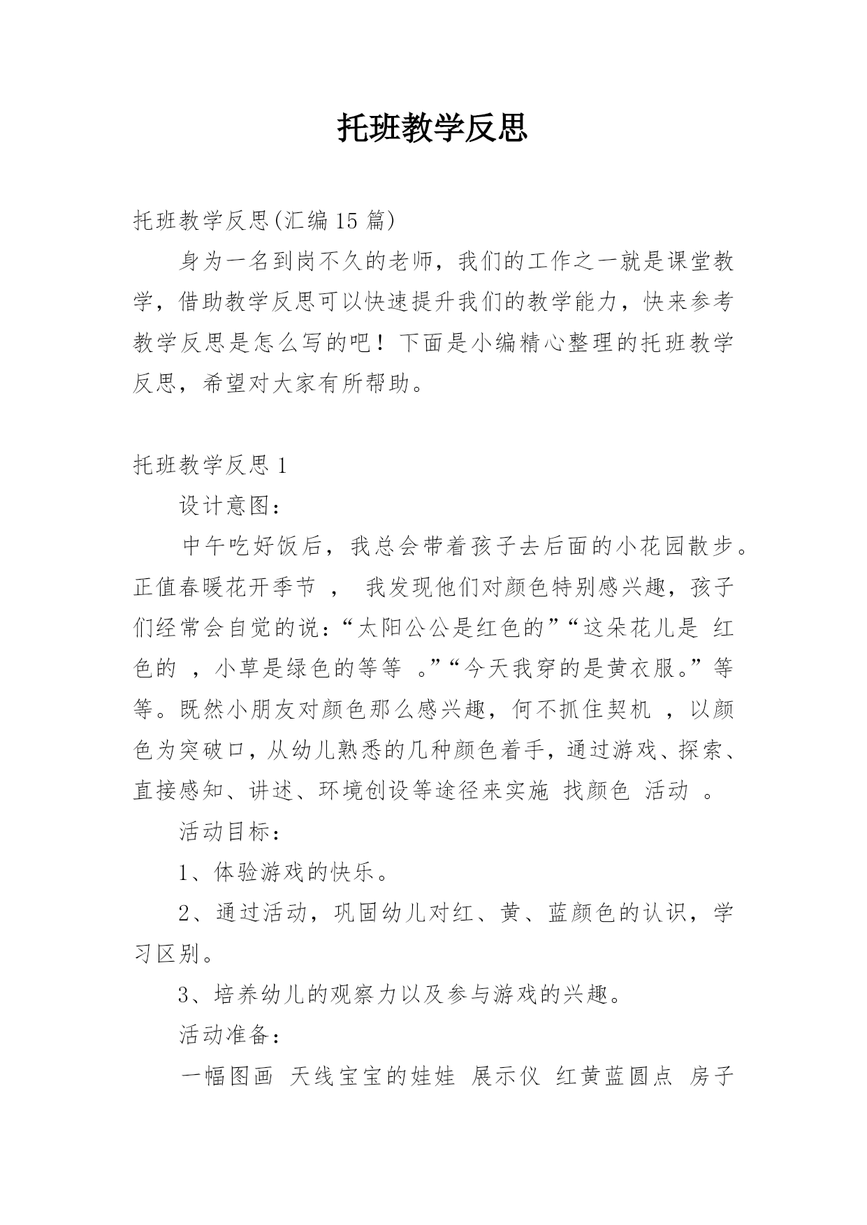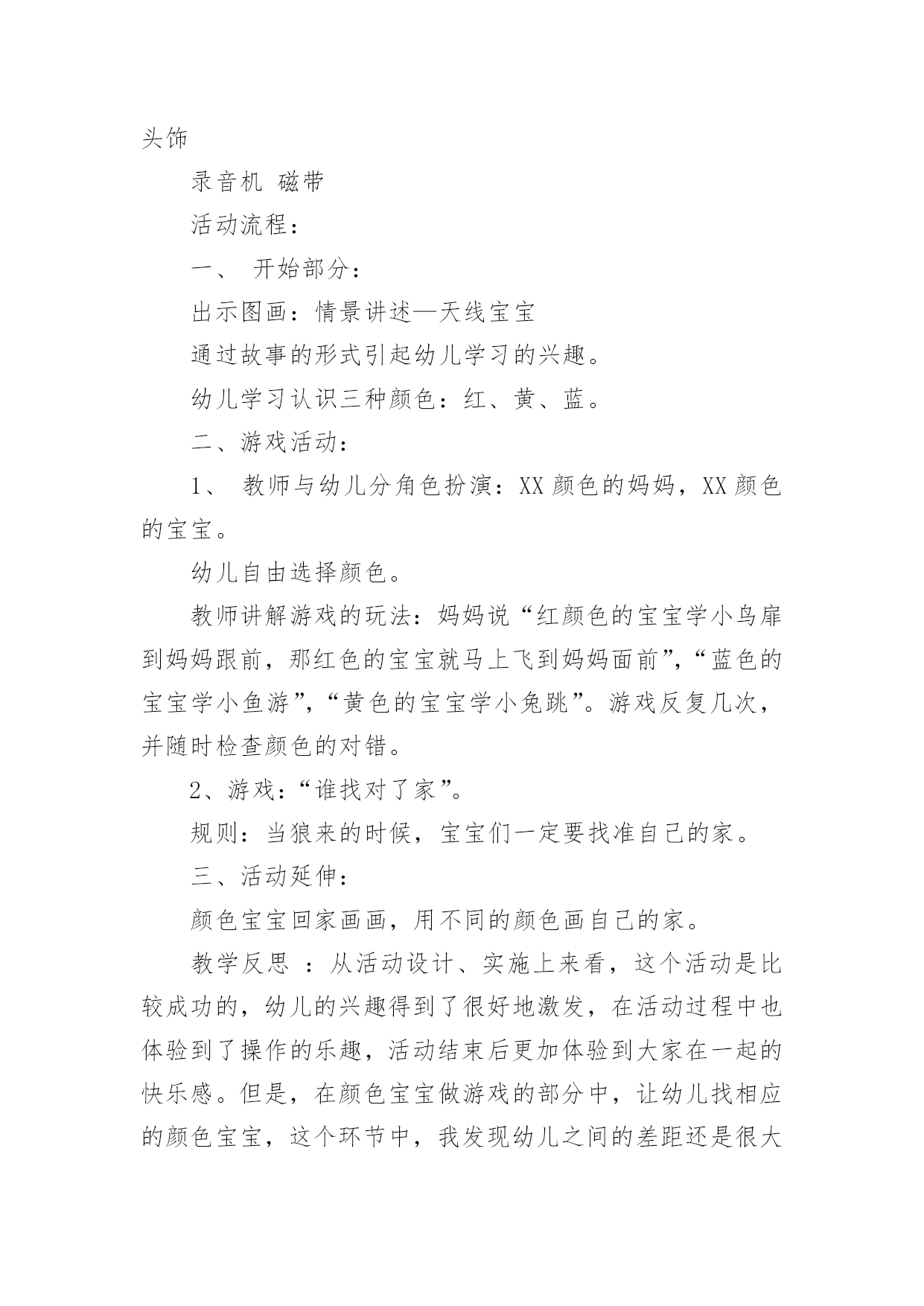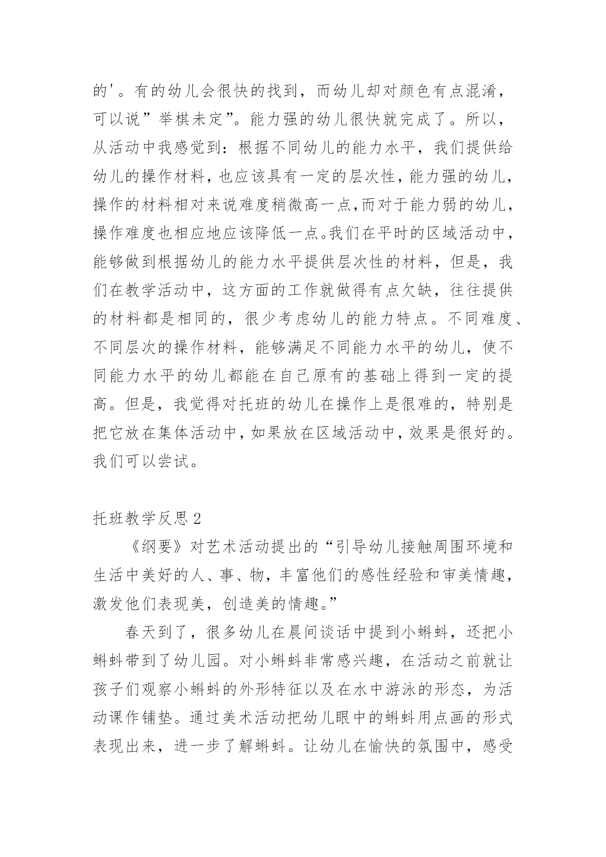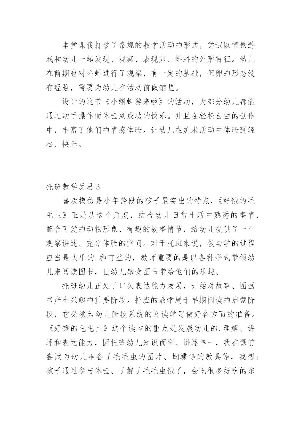 托班教学反思 托班教学反思(汇编15篇)身为一名到岗不久的老师,我们的工作之一就是课堂教学,借助教学反思可以快速提升我们的教学能力,快来参考教学反思是怎么写的吧!下面是小编精心整理的托班教学反思,希望对大家有所帮助。托班教学反思1设计意图:中午吃好饭后,我总会带着孩子去后面的小花园散步。正值春暖花开季节,我发现他们对颜色特别感兴趣,孩子们经常会自觉的说:“太阳公公是红色的”“这朵花儿是红色的,小草是绿色的等等。”“今天我穿的是黄衣服。”等等。既然小朋友对颜色那么感兴趣,何不抓住契机,以颜色为突破口,从幼儿熟悉的几种颜色着手,通过游戏、探索、直接感知、讲述、环境创设等途径来实施找颜色活动。活动目标:1、体验游戏的快乐。2、通过活动,巩固幼儿对红、黄、蓝颜色的认识,学习区别。3、培养幼儿的观察力以及参与游戏的兴趣。活动准备:一幅图画天线宝宝的娃娃展示仪红黄蓝圆点房子头饰录音机磁带活动流程:一、开始部分:出示图画:情景讲述—天线宝宝通过故事的形式引起幼儿学习的兴趣。幼儿学习认识三种颜色:红、黄、蓝。二、游戏活动:1、教师与幼儿分角色扮演:XX颜色的妈妈,XX颜色的宝宝。幼儿自由选择颜色。教师讲解游戏的玩法:妈妈说“红颜色的宝宝学小鸟扉到妈妈跟前,那红色的宝宝就马上飞到妈妈面前”,“蓝色的宝宝学小鱼游”,“黄色的宝宝学小兔跳”。游戏反复几次,并随时检查颜色的对错。2、游戏:“谁找对了家”。规则:当狼来的时候,宝宝们一定要找准自己的家。三、活动延伸:颜色宝宝回家画画,用不同的颜色画自己的家。教学反思:从活动设计、实施上来看,这个活动是比较成功的,幼儿的兴趣得到了很好地激发,在活动过程中也体验到了操作的乐趣,活动结束后更加体验到大家在一起的快乐感。但是,在颜色宝宝做游戏的部分中,让幼儿找相应的颜色宝宝,这个环节中,我发现幼儿之间的差距还是很大的'。有的幼儿会很快的找到,而幼儿却对颜色有点混淆,可以说”举棋未定”。能力强的幼儿很快就完成了。所以,从活动中我感觉到:根据不同幼儿的能力水平,我们提供给幼儿的操作材料,也应该具有一定的层次性,能力强的幼儿,操作的材料相对来说难度稍微高一点,而对于能力弱的幼儿,操作难度也相应地应该降低一点。我们在平时的区域活动中,能够做到根据幼儿的能力水平提供层次性的材料,但是,我们在教学活动中,这方面的工作就做得有点欠缺,往往提供的材料都是相同的,很少考虑幼儿的能力特点。不同难度、不同层次的操作材料,能够满足不同能力水平的幼儿,使不同能力水平的幼儿都能在自己原有的基础上得到一定的提高。但是,我觉得对托班的幼儿在操作上是很难的,特别是把它放在集体活动中,如果放在区域活动中,效果是很好的。我们可以尝试。托班教学反思2《纲要》对艺术活动提出的“引导幼儿接触周围环境和生活中美好的人、事、物,丰富他们的感性经验和审美情趣,激发他们表现美,创造美的情趣。”春天到了,很多幼儿在晨间谈话中提到小蝌蚪,还把小蝌蚪带到了幼儿园。对小蝌蚪非常感兴趣,在活动之前就让孩子们观察小蝌蚪的外形特征以及在水中游泳的形态,为活动课作铺垫。通过美术活动把幼儿眼中的蝌蚪用点画的形式表现出来,进一步了解蝌蚪。让幼儿在愉快的氛围中,感受美术活动带来的乐趣。我为美术活动设定了活动目标,让幼儿能用手指蘸上黑色的颜料点画小蝌蚪的身体,在欣赏了动态的小蝌蚪视频的基础上,再尝试用直线添画蝌蚪的尾巴。是本活动的难点。游戏是幼儿的天性,是幼儿的基本活动,游戏能激发幼儿活动的兴趣。苏霍姆林斯基说过:“所有的智力活动都依赖于兴趣。”培养幼儿对活动的兴趣,就要激发幼儿活动的激情。我在活动中创设了情景,由愉快的情景引入主题。儿歌:“小蝌蚪游啊游,摇摇尾巴点点头。这游游,那游游,找到朋友握握手。”一些幼儿对活动中布置的情景是非常感兴趣的,先由儿歌游戏进入活动,情景的池塘背景画抓住了幼儿们的眼球,甚至有的幼儿去触摸背景图,激发了幼儿创作的兴趣。我对幼儿创作画有着不一样的方法,从科学的角度去分解蝌蚪的形成。首先是卵的形成:手指点画,交代了卵的画法:用食指轻轻地蘸上黑色的颜料,点在纸上,停一停。这一个,那也一个,再蘸蘸,再点点。就连擦去手上的.颜料也要花心思从情境中找出亮点:“手上的卵宝宝快快藏到荷叶里面去。”就连一块擦手抹布也装饰的像真正的荷叶,让幼儿一直沉浸在情景中。在点画卵的基础上,观看小蝌蚪的视频,在自己的作品上自由添画尾巴,是活动中的难点。先通过引导让幼儿主动描述尾巴的特点(细、短尾巴)。再进行用水彩笔添画。活动反思:本堂课我打破了常规的教学活动的形式,尝试以情景游戏和幼儿一起发现、观察、表现卵、蝌蚪的外形特征。幼儿在前期也对蝌蚪进行了观察,有一定的基础,但卵的形态没有经验,需要为幼儿在活动前做铺垫。设计的这节《小蝌蚪游来啦》的活动,大部分幼儿都能通过动手操作而体验到成功