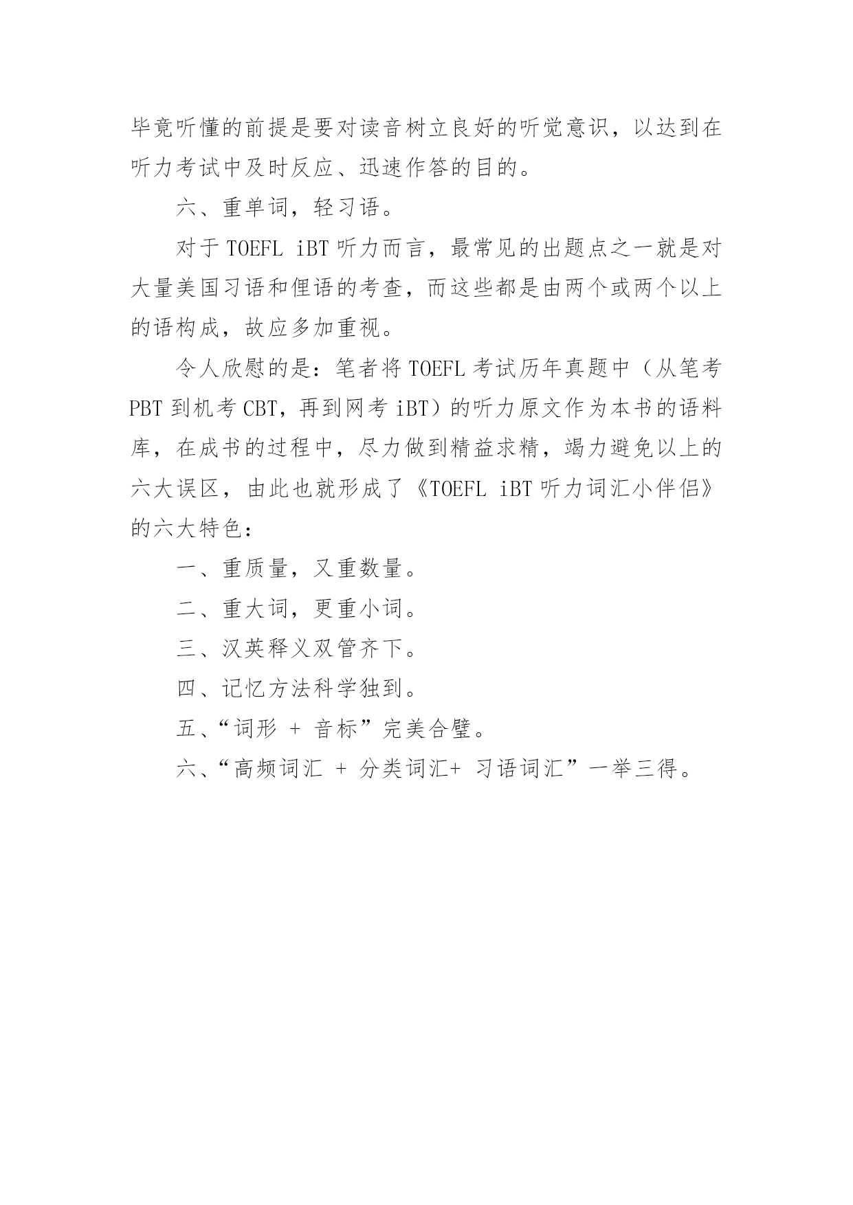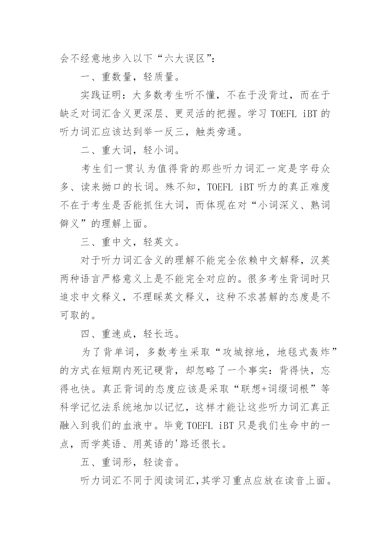 托福听力词汇背诵的误区 托福听力词汇背诵的误区在这两部分的考查中,考生不仅需要听懂指定的整段对话或课堂演讲,而且需要在此基础上理解、归纳整段对话或课堂演讲的中心思想和论证思路,并与所阅读的文章的中心思想和论证思路融会贯通后再回答问题。可想而知,如果考生一开始就听不懂,那么无论是写作题还是口试题都将无从下手。听力已经成为无数考生取得TOEFLiBT高分的拦路虎。其中一个重要的原因应归结为绝大多数考生有意、无意地忽视了对TOEFL听力词汇的学习。无可否认:TOEFL分数的高低与考生词汇量的多少密切相关。对于TOEFLiBT的听力而言,其测试的主要目的是考查考生在自然英语语境中的适应力和理解力,也就是要求考生既能通晓SurvivalEnglish(生存性语言),又能听懂AcademicEnglish(学术性语言),而ETS规定听力考查的学术话题又可细分为1)Arts,2)LifeScience,3)PhysicalScience,4)SocialScience四大类。所谓“万变不离其宗”,当下考生们的当务之急就是迅速熟悉并熟背这些听力高频词汇和分类词汇,培养对听力的敏感度,以达到学以致用。不过,值得考生注意的是:对TOEFLiBT听力词汇的学习绝不同于其他阅读、写作、口语词汇的学习。考生们往往会不经意地步入以下“六大误区”:一、重数量,轻质量。实践证明:大多数考生听不懂,不在于没背过,而在于缺乏对词汇含义更深层、更灵活的把握。学习TOEFLiBT的听力词汇应该达到举一反三,触类旁通。二、重大词,轻小词。考生们一贯认为值得背的那些听力词汇一定是字母众多、读来拗口的长词。殊不知,TOEFLiBT听力的真正难度不在于考生是否能抓住大词,而体现在对“小词深义、熟词僻义”的理解上面。三、重中文,轻英文。对于听力词汇含义的理解不能完全依赖中文解释,汉英两种语言严格意义上是不能完全对应的。很多考生背词时只追求中文释义,不理睬英文释义,这种不求甚解的态度是不可取的。四、重速成,轻长远。为了背单词,多数考生采取“攻城掠地,地毯式轰炸”的方式在短期内死记硬背,却忽略了一个事实:背得快,忘得也快。真正背词的态度应该是采取“联想+词缀词根”等科学记忆法系统地加以记忆,这样才能让这些听力词汇真正融入到我们的血液中。毕竟TOEFLiBT只是我们生命中的一点,而学英语、用英语的'路还很长。五、重词形,轻读音。听力词汇不同于阅读词汇,其学习重点应放在读音上面。毕竟听懂的前提是要对读音树立良好的听觉意识,以达到在听力考试中及时反应、迅速作答的目的。六、重单词,轻习语。对于TOEFLiBT听力而言,最常见的出题点之一就是对大量美国习语和俚语的考查,而这些都是由两个或两个以上的语构成,故应多加重视。令人欣慰的是:笔者将TOEFL考试历年真题中(从笔考PBT到机考CBT,再到网考iBT)的听力原文作为本书的语料库,在成书的过程中,尽力做到精益求精,竭力避免以上的六大误区,由此也就形成了《TOEFLiBT听力词汇小伴侣》的六大特色:一、重质量,又重数量。二、重大词,更重小词。三、汉英释义双管齐下。四、记忆方法科学独到。五、“词形+音标”完美合璧。六、“高频词汇+分类词汇+习语词汇”一举三得。