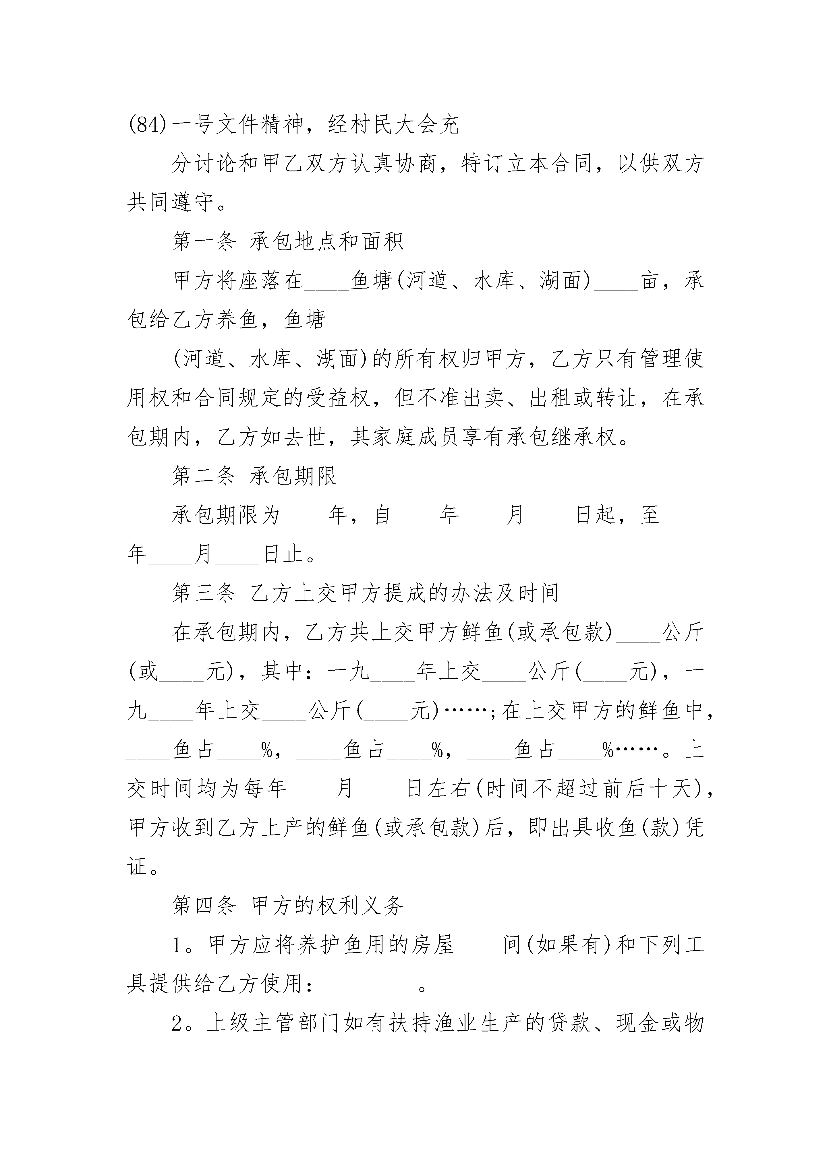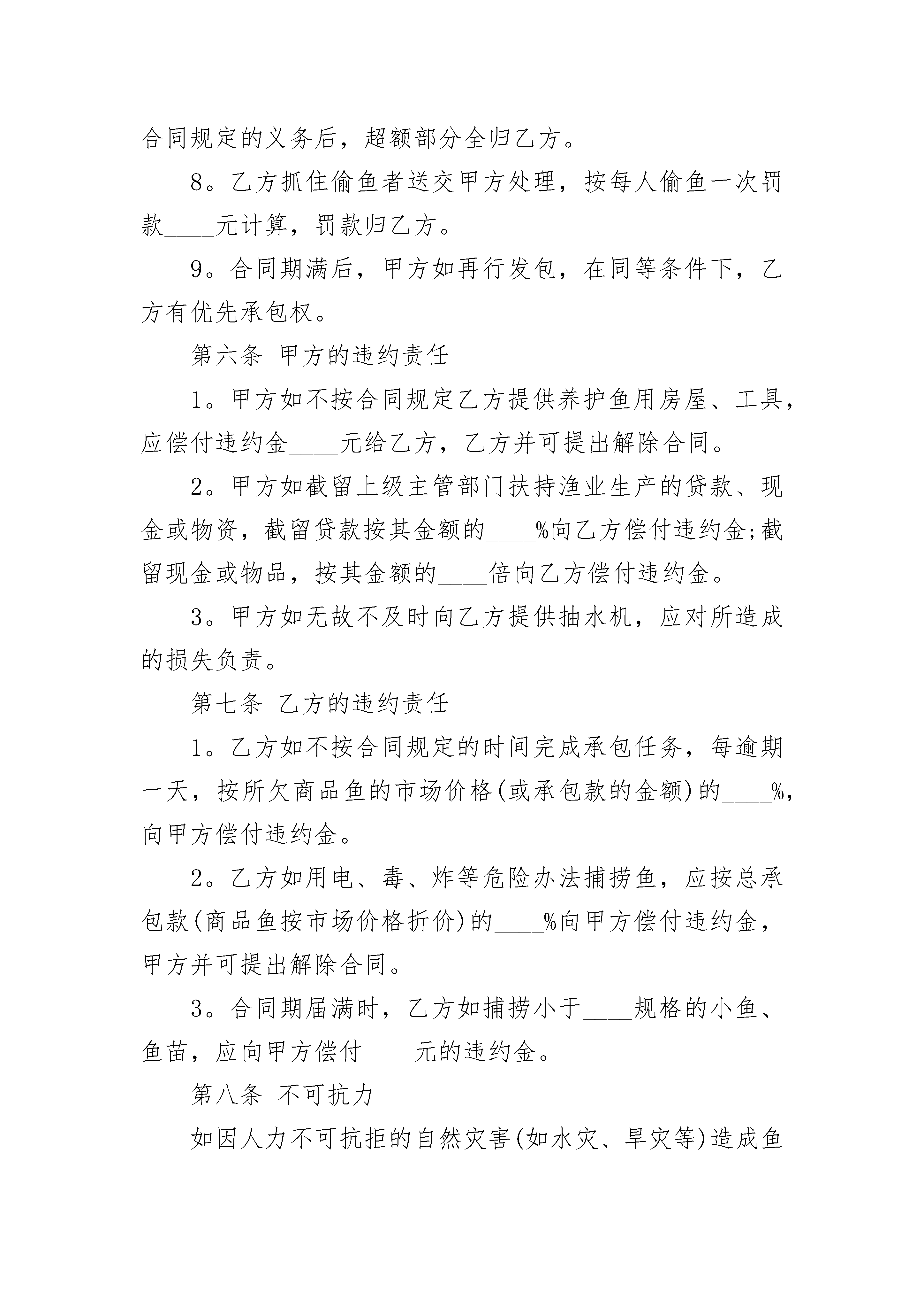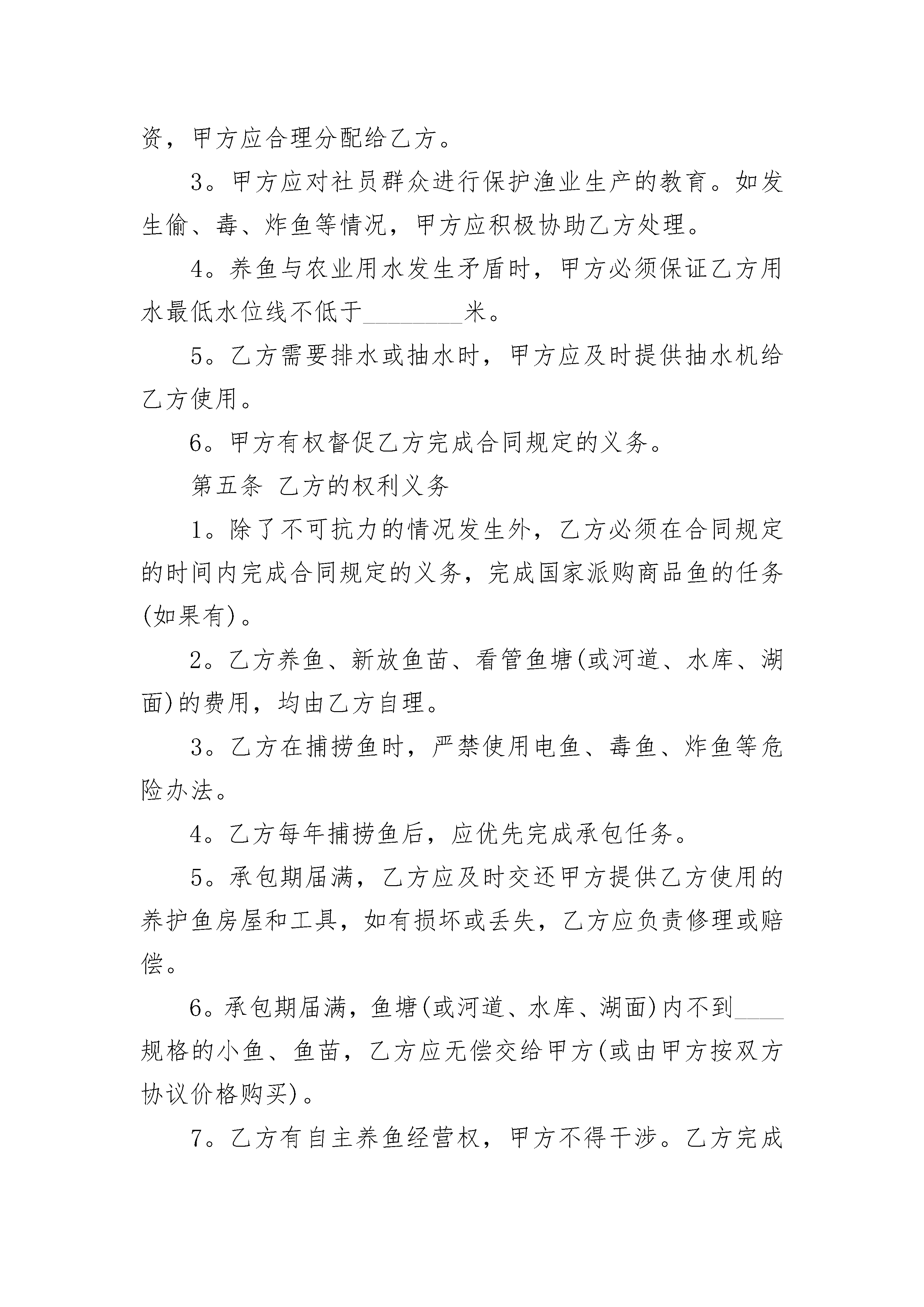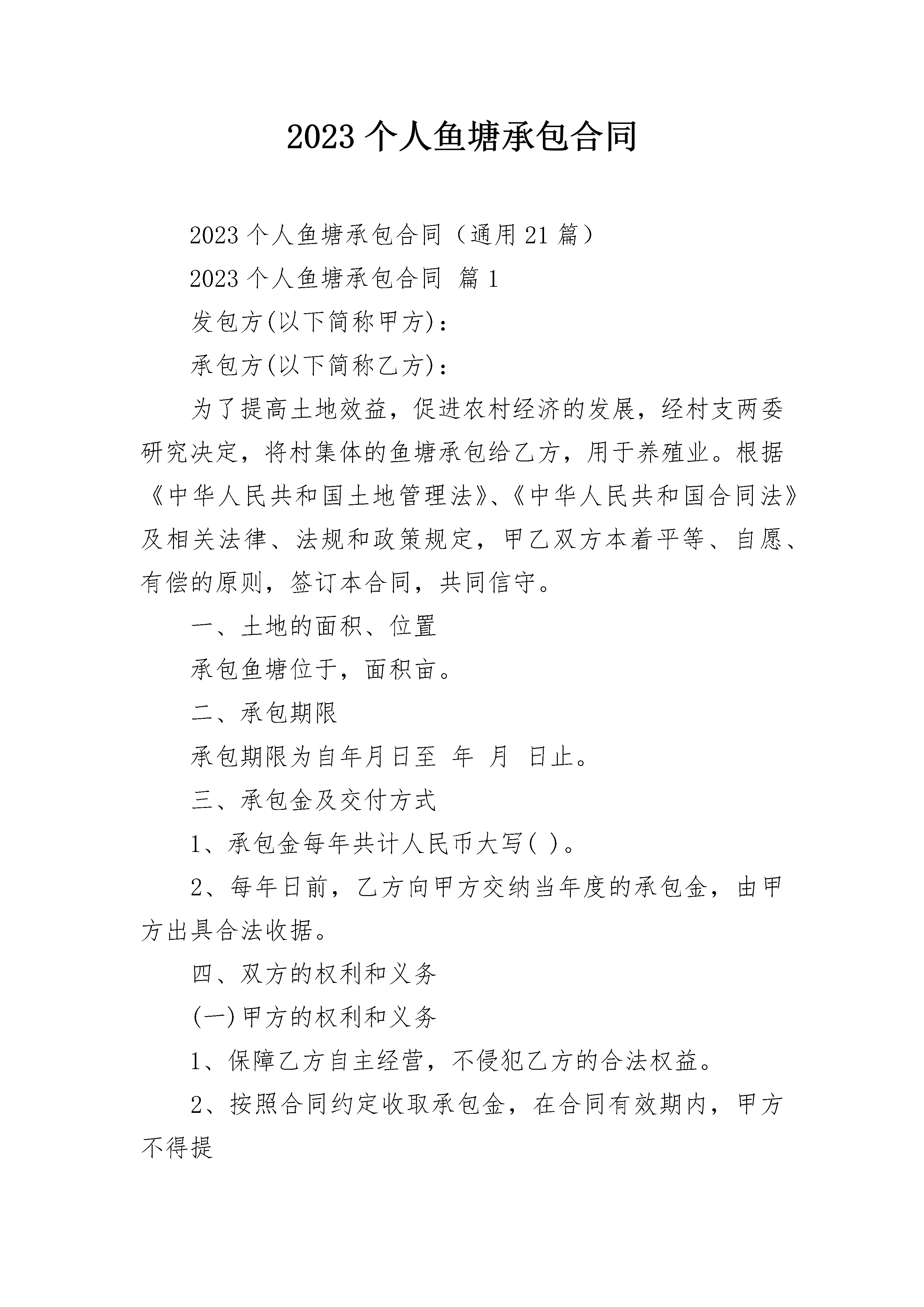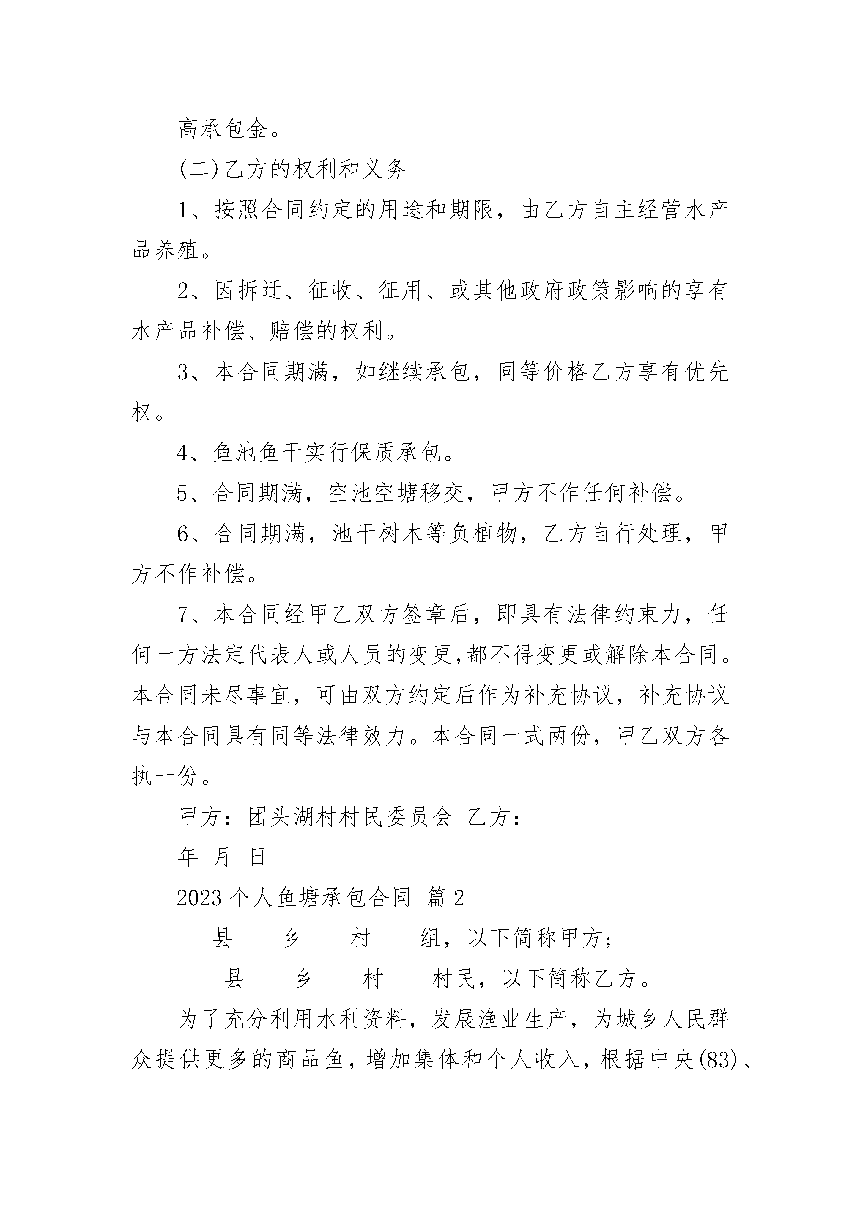 2023个人鱼塘承包合同2023个人鱼塘承包合同(通用21篇)2023个人鱼塘承包合同篇1发包方(以下简称甲方):承包方(以下简称乙方):为了提高土地效益,促进农村经济的发展,经村支两委研究决定,将村集体的鱼塘承包给乙方,用于养殖业。根据《中华人民共和国土地管理法》、《中华人民共和国合同法》及相关法律、法规和政策规定,甲乙双方本着平等、自愿、有偿的原则,签订本合同,共同信守。一、土地的面积、位置承包鱼塘位于,面积亩。二、承包期限承包期限为自年月日至年月日止。三、承包金及交付方式1、承包金每年共计人民币大写()。2、每年日前,乙方向甲方交纳当年度的承包金,由甲方出具合法收据。四、双方的权利和义务(一)甲方的权利和义务1、保障乙方自主经营,不侵犯乙方的合法权益。2、按照合同约定收取承包金,在合同有效期内,甲方不得提高承包金。(二)乙方的权利和义务1、按照合同约定的用途和期限,由乙方自主经营水产品养殖。2、因拆迁、征收、征用、或其他政府政策影响的享有水产品补偿、赔偿的权利。3、本合同期满,如继续承包,同等价格乙方享有优先权。4、鱼池鱼干实行保质承包。5、合同期满,空池空塘移交,甲方不作任何补偿。6、合同期满,池干树木等负植物,乙方自行处理,甲方不作补偿。7、本合同经甲乙双方签章后,即具有法律约束力,任何一方法定代表人或人员的变更,都不得变更或解除本合同。本合同未尽事宜,可由双方约定后作为补充协议,补充协议与本合同具有同等法律效力。本合同一式两份,甲乙双方各执一份。甲方:团头湖村村民委员会乙方:年月日2023个人鱼塘承包合同篇2___县____乡____村____组,以下简称甲方;____县____乡____村____村民,以下简称乙方。为了充分利用水利资料,发展渔业生产,为城乡人民群众提供更多的商品鱼,增加集体和个人收入,根据中央(83)、(84)一号文件精神,经村民大会充分讨论和甲乙双方认真协商,特订立本合同,以供双方共同遵守。第一条承包地点和面积甲方将座落在____鱼塘(河道、水库、湖面)____亩,承包给乙方养鱼,鱼塘(河道、水库、湖面)的所有权归甲方,乙方只有管理使用权和合同规定的受益权,但不准出卖、出租或转让,在承包期内,乙方如去世,其家庭成员享有承包继承权。第二条承包期限承包期限为____年,自____年____月____日起,至____年____月____日止。第三条乙方上交甲方提成的办法及时间在承包期内,乙方共上交甲方鲜鱼(或承包款)____公斤(或____元),其中:一九____年上交____公斤(____元),一九____年上交____公斤(____元)……;在上交甲方的鲜鱼中,____鱼占____%,____鱼占____%,____鱼占____%……。上交时间均为每年____月____日左右(时间不超过前后十天),甲方收到乙方上产的鲜鱼(或承包款)后,即出具收鱼(款)凭证。第四条甲方的权利义务1。甲方应将养护鱼用的房屋____间(如果有)和下列工具提供给乙方使用:________。2。上级主管部门如有扶持渔业生产的贷款、现金或物资,甲方应合理分配给乙方。3。甲方应对社员群众进行保护渔业生产的教育。如发生偷、毒、炸鱼等情况,甲方应积极协助乙方处理。4。养鱼与农业用水发生矛盾时,甲方必须保证乙方用水最低水位线不低于________米。5。乙方需要排水或抽水时,甲方应及时提供抽水机给乙方使用。6。甲方有权督促乙方完成合同规定的义务。第五条乙方的权利义务1。除了不可抗力的情况发生外,乙方必须在合同规定的时间内完成合同规定的义务,完成国家派购商品鱼的任务(如果有)。2。乙方养鱼、新放鱼苗、看管鱼塘(或河道、水库、湖面)的费用,均由乙方自理。3。乙方在捕捞鱼时,严禁使用电鱼、毒鱼、炸鱼等危险办法。4。乙方每年捕捞鱼后,应优先完成承包任务。5。承包期届满,乙方应及时交还甲方提供乙方使用的养护鱼房屋和工具,如有损坏或丢失,乙方应负责修理或赔偿。6。承包期届满,鱼塘(或河道、水库、湖面)内不到____规格的小鱼、鱼苗,乙方应无偿交给甲方(或由甲方按双方协议价格购买)。7。乙方有自主养鱼经营权,甲方不得干涉。乙方完成合同规定的义务后,超额部分全归乙方。8。乙方抓住偷鱼者送交甲方处理,按每人偷鱼一次罚款____元计算,罚款归乙方。9。合同期满后,甲方如再行发包,在同等条件下,乙方有优先承包权。第六条甲方的违约责任1。甲方如不按合同规定乙方提供养护鱼用房屋、工具,应偿付违约金____元给乙方,乙方并可提出解除合同。2。甲方如截留上级主管部门扶持渔业生产的贷款、现金或物资,截留贷款按其金额的____%向乙方偿付违约金;截留现金或物品,按其金额的____倍向乙方偿付违约金。3。甲方如无故不及时向乙方提供抽水机,应对所造成的损失负责。第