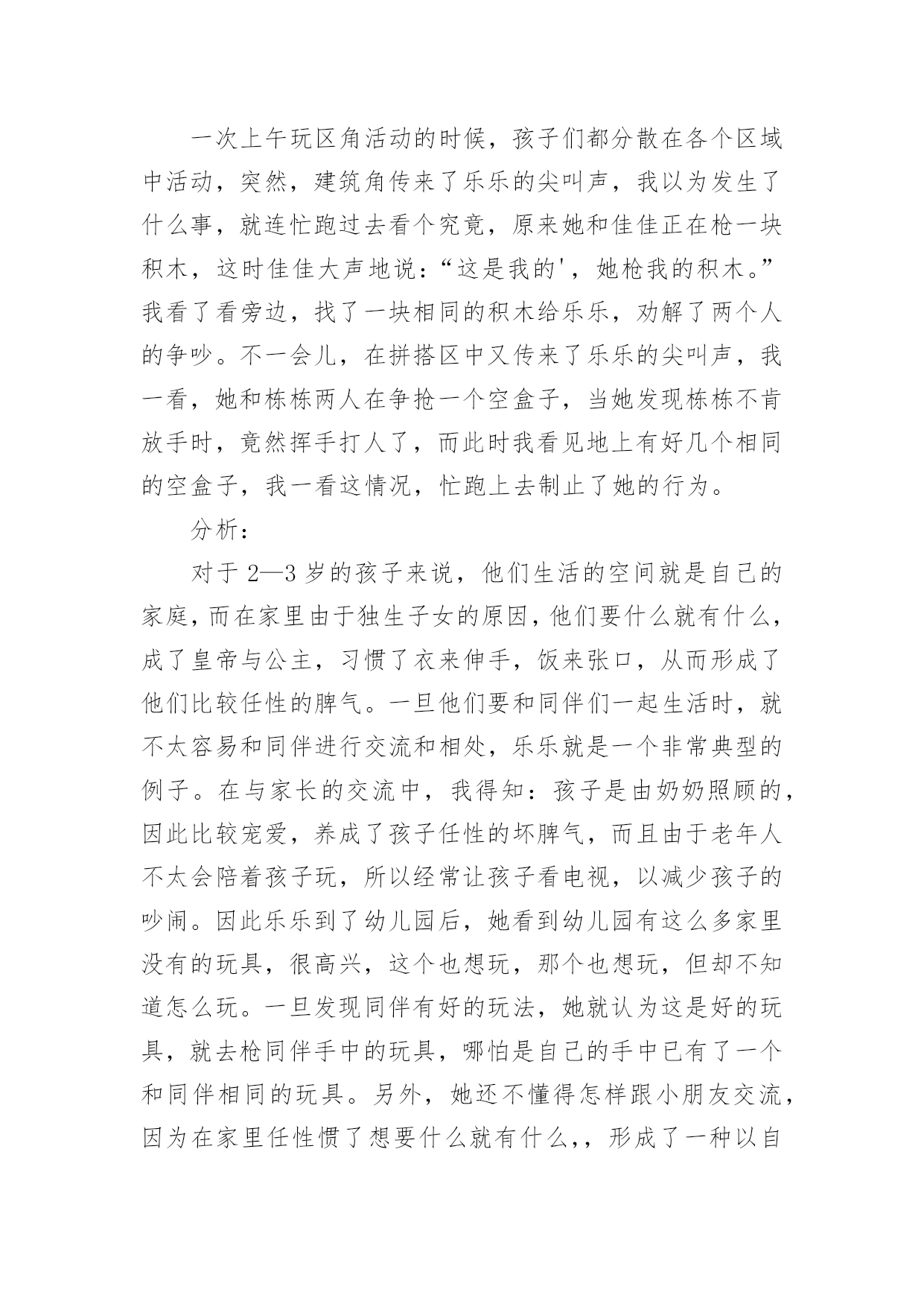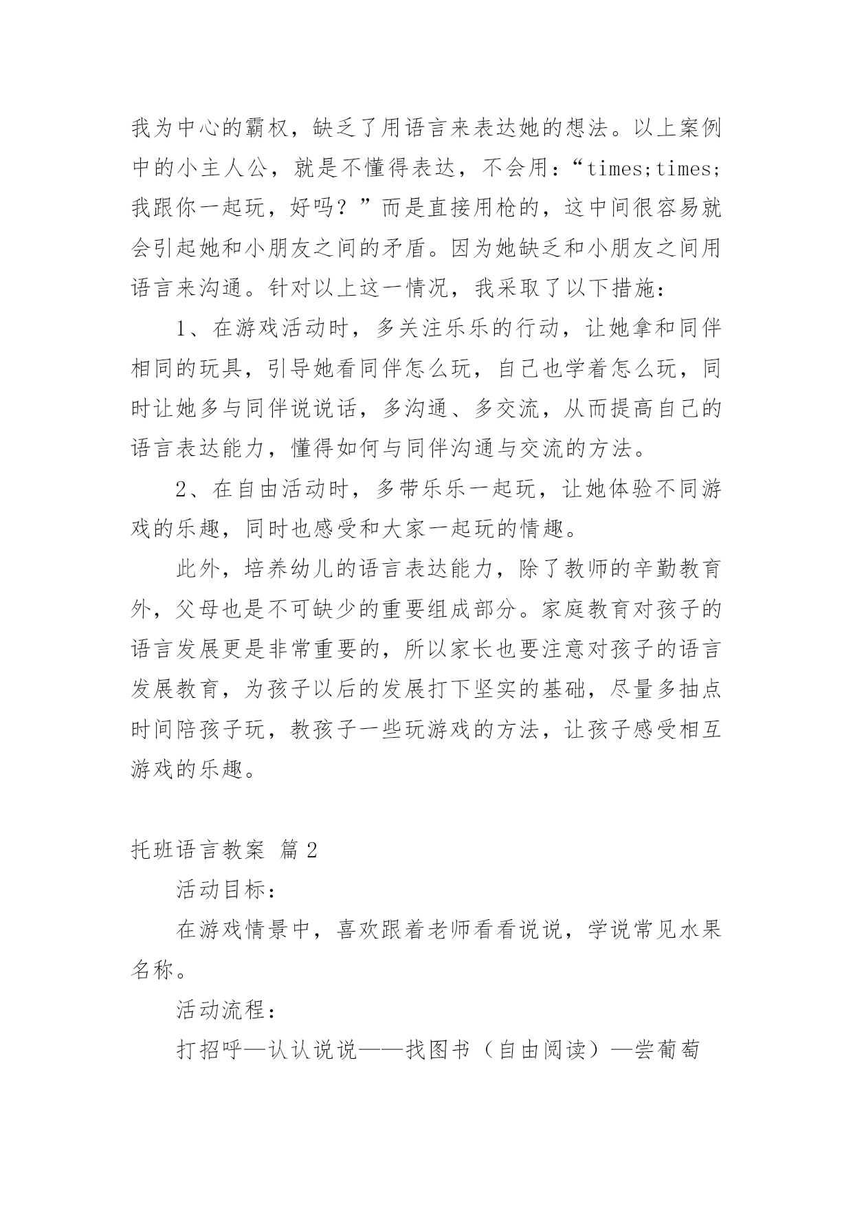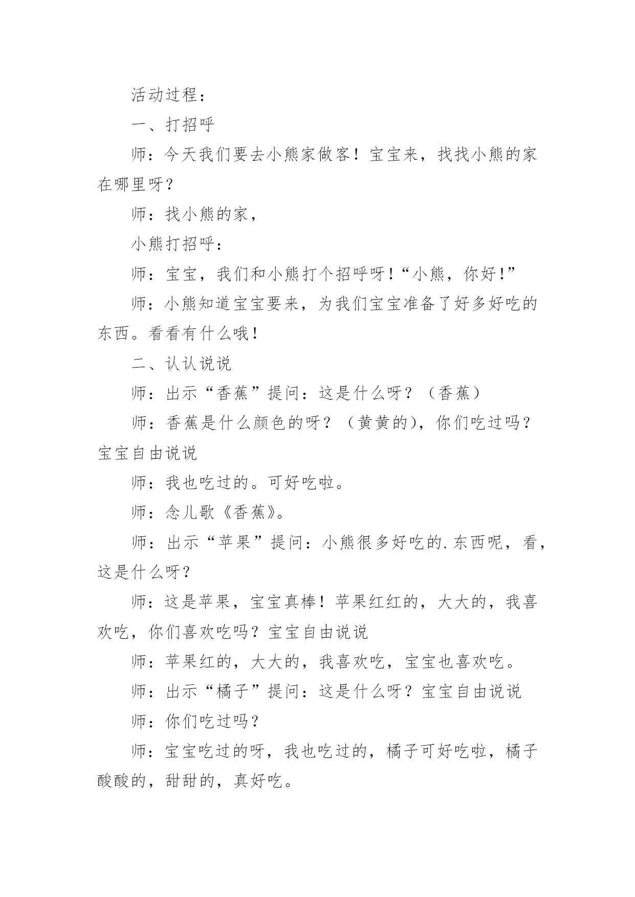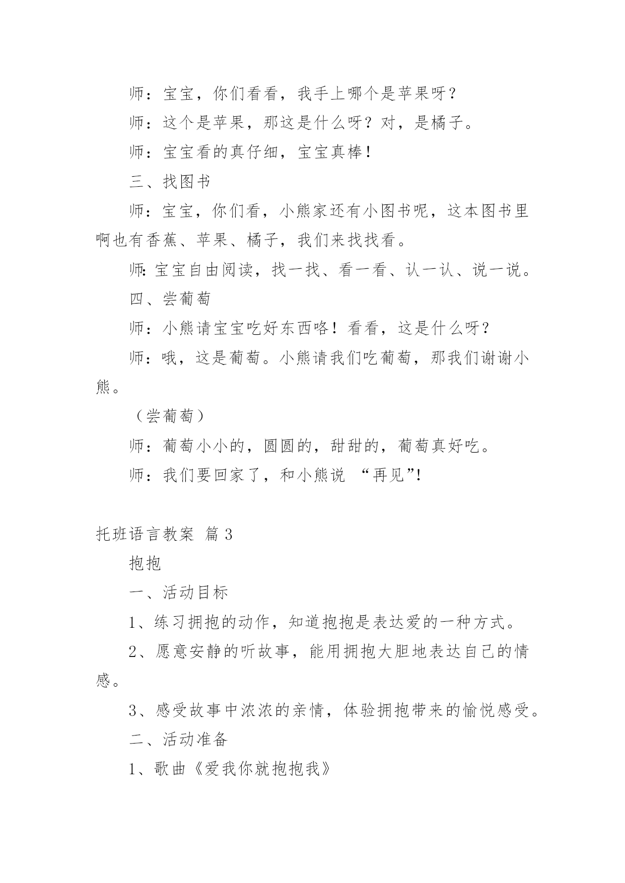 托班语言教案 【精华】托班语言教案4篇在教学工作者实际的教学活动中,就有可能用到教案,编写教案有利于我们准确把握教材的重点与难点,进而选择恰当的教学方法。那么什么样的教案才是好的呢?下面是小编为大家收集的托班语言教案4篇,欢迎大家分享。托班语言教案篇1托班语言案例:大家一起玩背景、缘起:现今社会,独生子女的数量越来越多,随着环境和家庭教育的变化,孩子得到了长辈们的百般疼爱,他们的无理要求总会得到家长的认可,导致现在的孩子养成了自私、孤僻、霸道、不合群等种种不良行为。在家里,他们想要什么就有什么,形成了他们比较任性的脾气。一旦他们要和同伴们一起生活时,就不容易和同伴进行相处。这样的状况如果一直延续下去,就会直接影响孩子将来的社交能力和所从事的事业。就拿本班幼儿来说吧,有几个孩子就非常内向,整天一个人坐着,当然就没有朋友了;有的孩子比较霸道,经常动不动就打小朋友,也没有孩子跟他一起玩。没有了朋友,就会使孩子的童年失去了光彩。下面我就描述一下关于一个小朋友和其他小朋友在一起玩时所发生的情况。案例描述:一次上午玩区角活动的时候,孩子们都分散在各个区域中活动,突然,建筑角传来了乐乐的尖叫声,我以为发生了什么事,就连忙跑过去看个究竟,原来她和佳佳正在枪一块积木,这时佳佳大声地说:“这是我的',她枪我的积木。”我看了看旁边,找了一块相同的积木给乐乐,劝解了两个人的争吵。不一会儿,在拼搭区中又传来了乐乐的尖叫声,我一看,她和栋栋两人在争抢一个空盒子,当她发现栋栋不肯放手时,竟然挥手打人了,而此时我看见地上有好几个相同的空盒子,我一看这情况,忙跑上去制止了她的行为。分析:对于2—3岁的孩子来说,他们生活的空间就是自己的家庭,而在家里由于独生子女的原因,他们要什么就有什么,成了皇帝与公主,习惯了衣来伸手,饭来张口,从而形成了他们比较任性的脾气。一旦他们要和同伴们一起生活时,就不太容易和同伴进行交流和相处,乐乐就是一个非常典型的例子。在与家长的交流中,我得知:孩子是由奶奶照顾的,因此比较宠爱,养成了孩子任性的坏脾气,而且由于老年人不太会陪着孩子玩,所以经常让孩子看电视,以减少孩子的吵闹。因此乐乐到了幼儿园后,她看到幼儿园有这么多家里没有的玩具,很高兴,这个也想玩,那个也想玩,但却不知道怎么玩。一旦发现同伴有好的玩法,她就认为这是好的玩具,就去枪同伴手中的玩具,哪怕是自己的手中已有了一个和同伴相同的玩具。另外,她还不懂得怎样跟小朋友交流,因为在家里任性惯了想要什么就有什么,,形成了一种以自我为中心的霸权,缺乏了用语言来表达她的想法。以上案例中的小主人公,就是不懂得表达,不会用:“times;times;我跟你一起玩,好吗?”而是直接用枪的,这中间很容易就会引起她和小朋友之间的矛盾。因为她缺乏和小朋友之间用语言来沟通。针对以上这一情况,我采取了以下措施:1、在游戏活动时,多关注乐乐的行动,让她拿和同伴相同的玩具,引导她看同伴怎么玩,自己也学着怎么玩,同时让她多与同伴说说话,多沟通、多交流,从而提高自己的语言表达能力,懂得如何与同伴沟通与交流的方法。2、在自由活动时,多带乐乐一起玩,让她体验不同游戏的乐趣,同时也感受和大家一起玩的情趣。此外,培养幼儿的语言表达能力,除了教师的辛勤教育外,父母也是不可缺少的重要组成部分。家庭教育对孩子的语言发展更是非常重要的,所以家长也要注意对孩子的语言发展教育,为孩子以后的发展打下坚实的基础,尽量多抽点时间陪孩子玩,教孩子一些玩游戏的方法,让孩子感受相互游戏的乐趣。托班语言教案篇2活动目标:在游戏情景中,喜欢跟着老师看看说说,学说常见水果名称。活动流程:打招呼—认认说说——找图书(自由阅读)—尝葡萄活动过程:一、打招呼师:今天我们要去小熊家做客!宝宝来,找找小熊的家在哪里呀?师:找小熊的家,小熊打招呼:师:宝宝,我们和小熊打个招呼呀!“小熊,你好!”师:小熊知道宝宝要来,为我们宝宝准备了好多好吃的东西。看看有什么哦!二、认认说说师:出示“香蕉”提问:这是什么呀?(香蕉)师:香蕉是什么颜色的呀?(黄黄的),你们吃过吗?宝宝自由说说师:我也吃过的。可好吃啦。师:念儿歌《香蕉》。师:出示“苹果”提问:小熊很多好吃的.东西呢,看,这是什么呀?师:这是苹果,宝宝真棒!苹果红红的,大大的,我喜欢吃,你们喜欢吃吗?宝宝自由说说师:苹果红的,大大的,我喜欢吃,宝宝也喜欢吃。师:出示“橘子”提问:这是什么呀?宝宝自由说说师:你们吃过吗?师:宝宝吃过的呀,我也吃过的,橘子可好吃啦,橘子酸酸的,甜甜的,真好吃。师:宝宝,你们看看,我手上哪个是苹果呀?师:这个是苹果,那这是什么呀?对,是橘子。师:宝宝看的真仔细,宝宝真棒!三、找图书师:宝宝,你们看,小熊家还有小图书呢,这本图书里啊也有香蕉、苹果、橘子,我们来找找看。师:宝宝自由阅读,找一找、