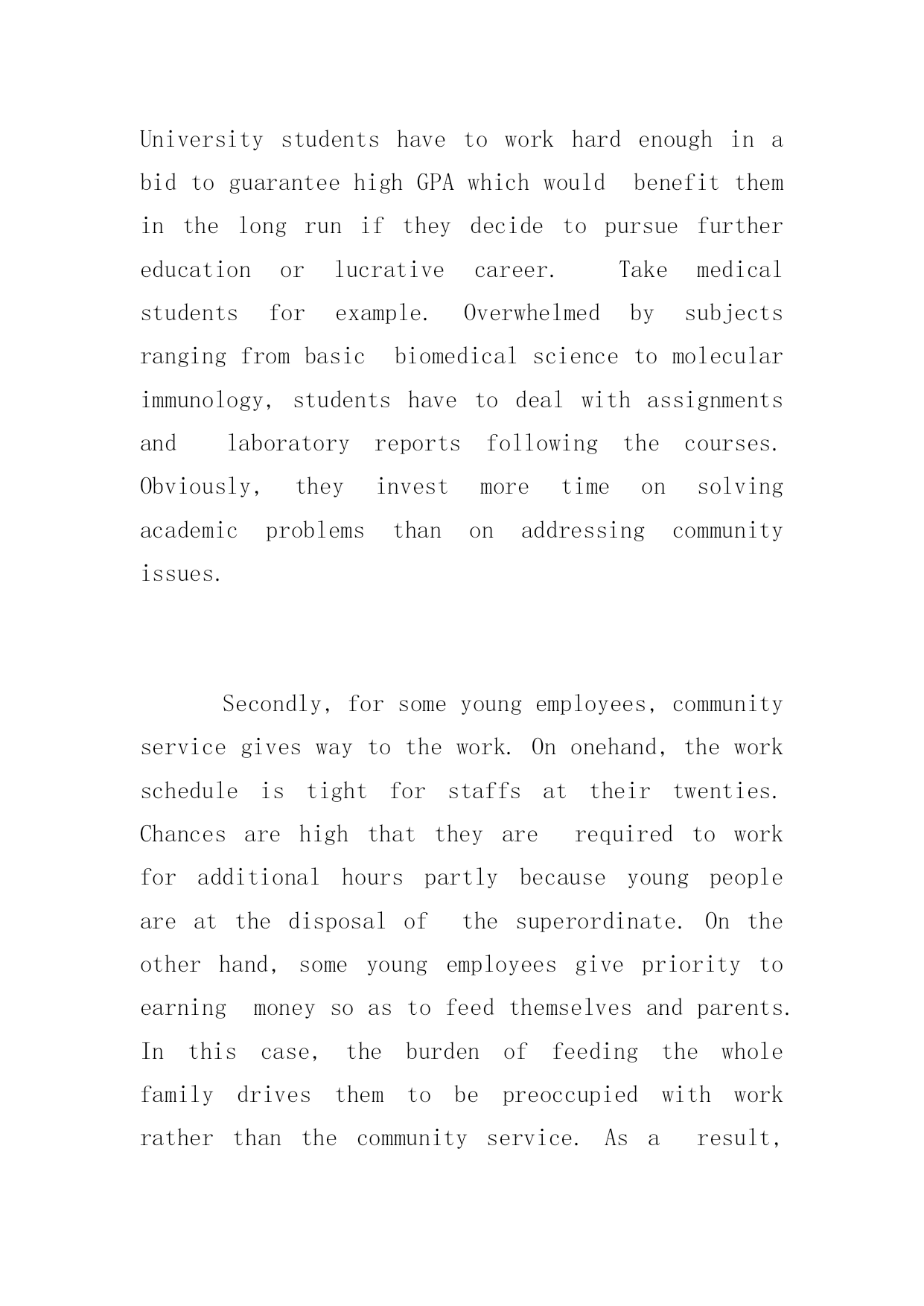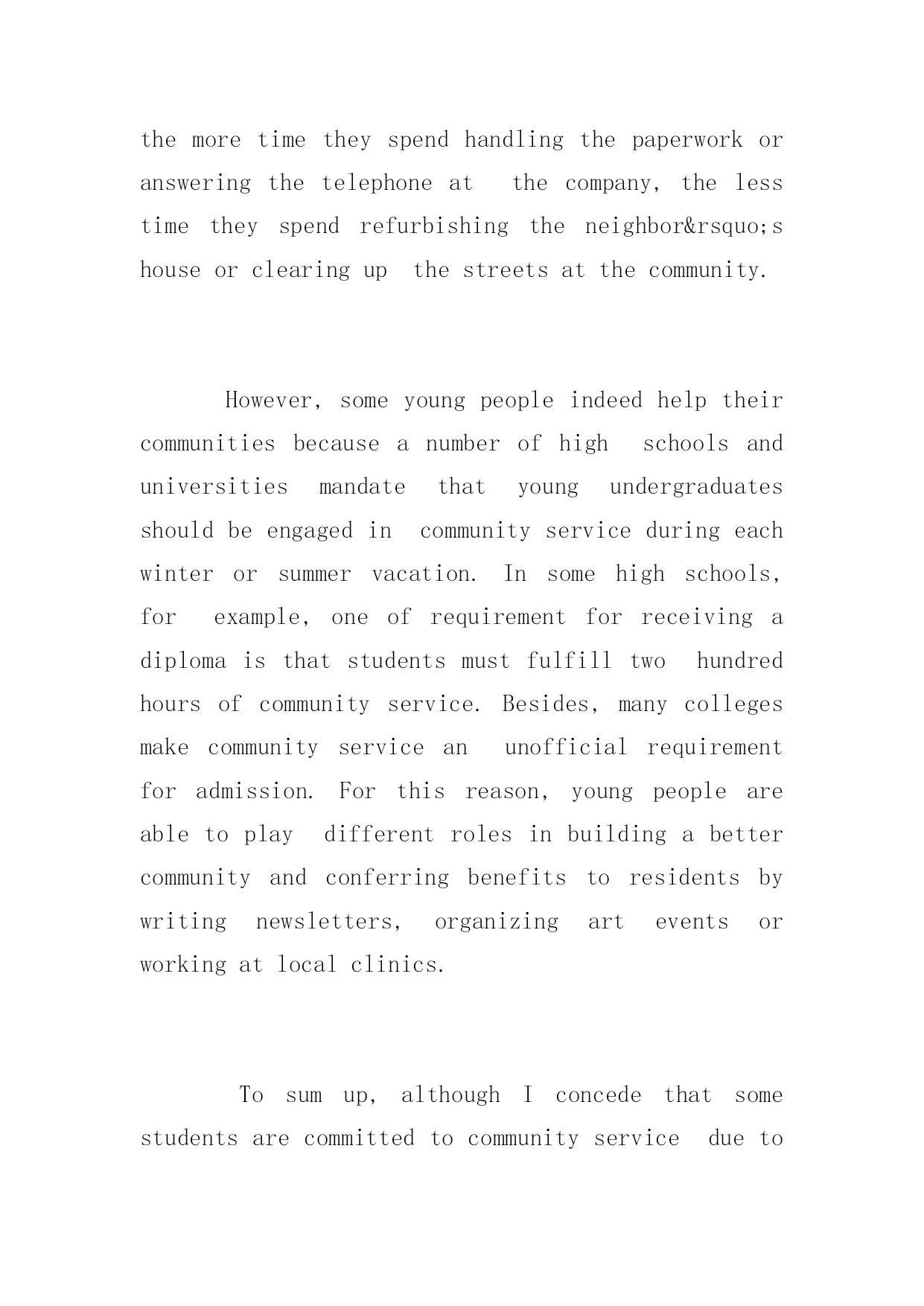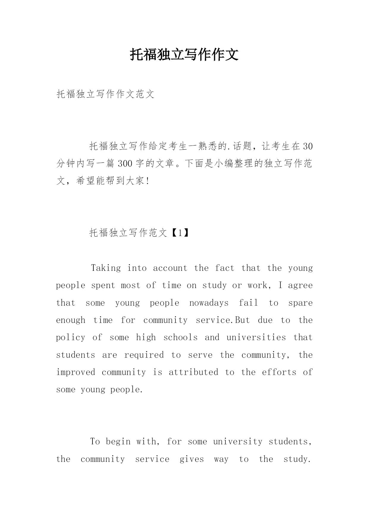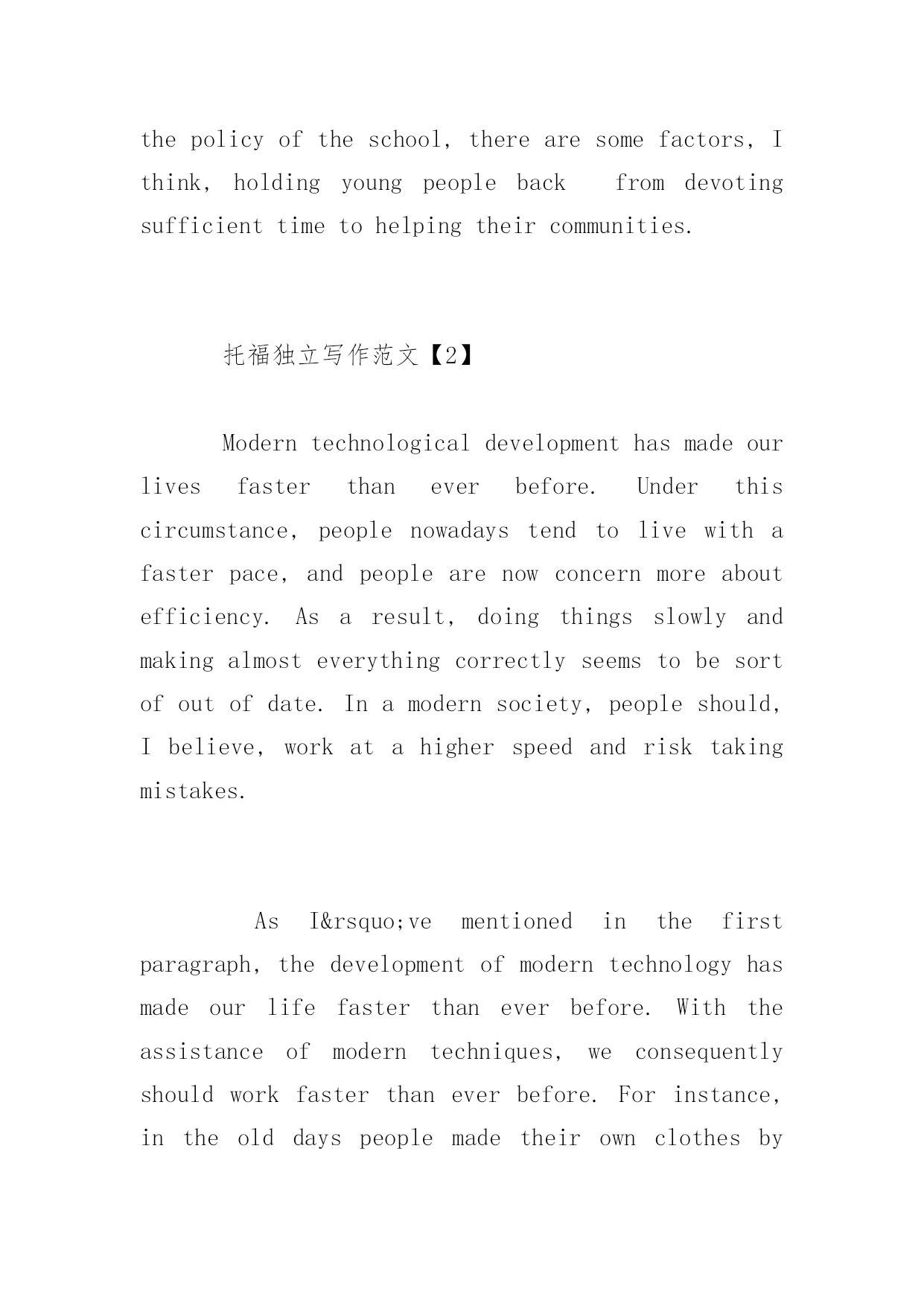 托福独立写作作文 托福独立写作作文范文 托福独立写作给定考生一熟悉的.话题,让考生在30分钟内写一篇300字的文章。下面是小编整理的独立写作范文,希望能帮到大家! 托福独立写作范文【1】 Takingintoaccountthefactthattheyoungpeoplespentmostoftimeonstudyorwork,Iagreethatsomeyoungpeoplenowadaysfailtospareenoughtimeforcommunityservice.Butduetothepolicyofsomehighschoolsanduniversitiesthatstudentsarerequiredtoservethecommunity,theimprovedcommunityisattributedtotheeffortsofsomeyoungpeople. Tobeginwith,forsomeuniversitystudents,thecommunityservicegiveswaytothestudy.UniversitystudentshavetoworkhardenoughinabidtoguaranteehighGPAwhichwouldbenefittheminthelongruniftheydecidetopursuefurthereducationorlucrativecareer.Takemedicalstudentsforexample.Overwhelmedbysubjectsrangingfrombasicbiomedicalsciencetomolecularimmunology,studentshavetodealwithassignmentsandlaboratoryreportsfollowingthecourses.Obviously,theyinvestmoretimeonsolvingacademicproblemsthanonaddressingcommunityissues. Secondly,forsomeyoungemployees,communityservicegiveswaytothework.Ononehand,theworkscheduleistightforstaffsattheirtwenties.Chancesarehighthattheyarerequiredtoworkforadditionalhourspartlybecauseyoungpeopleareatthedisposalofthesuperordinate.Ontheotherhand,someyoungemployeesgiveprioritytoearningmoneysoastofeedthemselvesandparents.Inthiscase,theburdenoffeedingthewholefamilydrivesthemtobepreoccupiedwithworkratherthanthecommunityservice.Asaresult,themoretimetheyspendhandlingthepaperworkoransweringthetelephoneatthecompany,thelesstimetheyspendrefurbishingtheneighbor’shouseorclearingupthestreetsatthecommunity. However,someyoungpeopleindeedhelptheircommunitiesbecauseanumberofhighschoolsanduniversitiesmandatethatyoungundergraduatesshouldbeengagedincommunityserviceduringeachwinterorsummervacation.Insomehighschools,forexample,oneofrequirementforreceivingadiplomaisthatstudentsmustfulfilltwohundredhoursofcommunityservice.Besides,manycollegesmakecommunityserviceanunofficialrequirementforadmission.Forthisreason,youngpeopleareabletoplaydifferentrolesinbuildingabettercommunityandconferringbenefitstoresidentsbywr